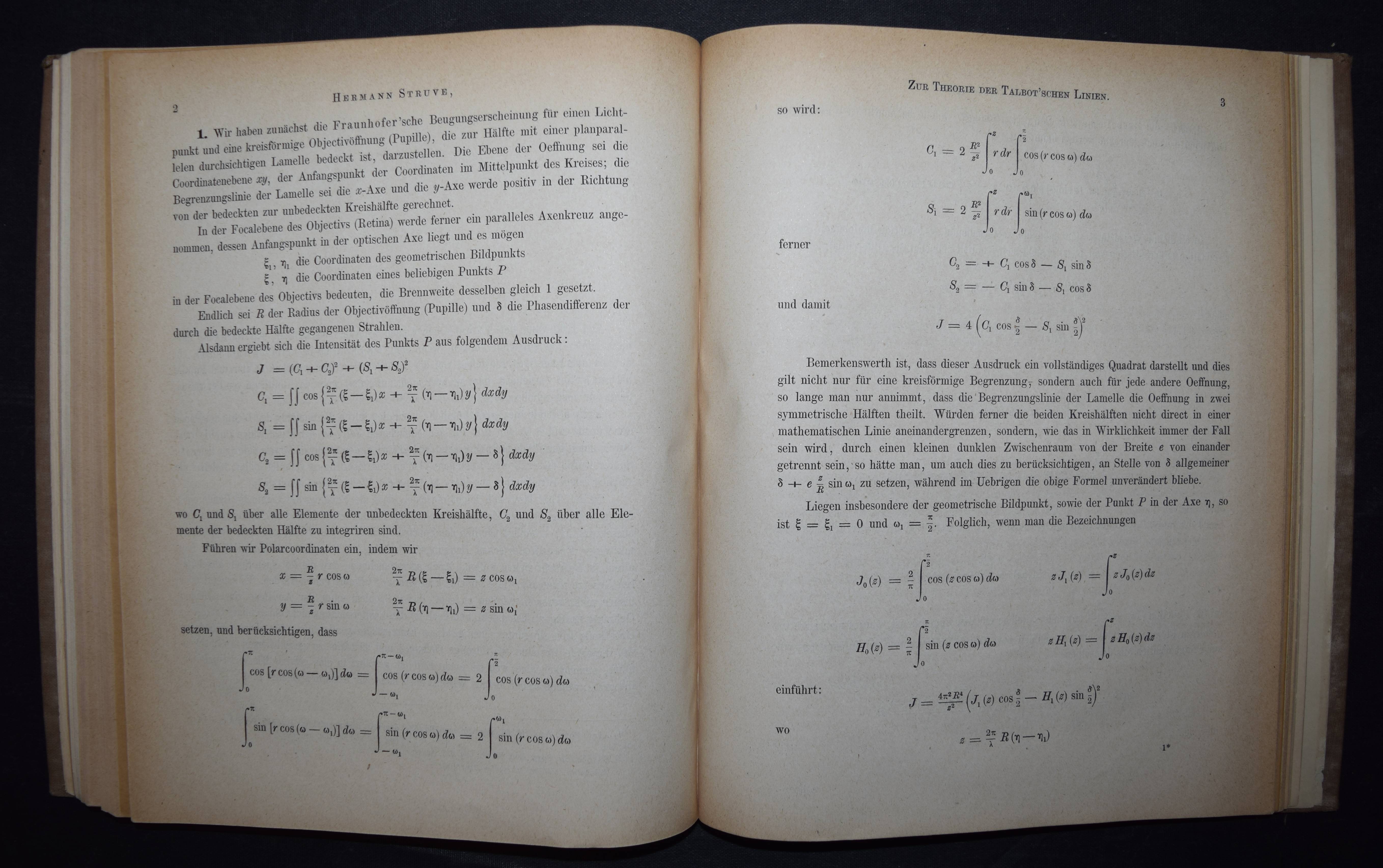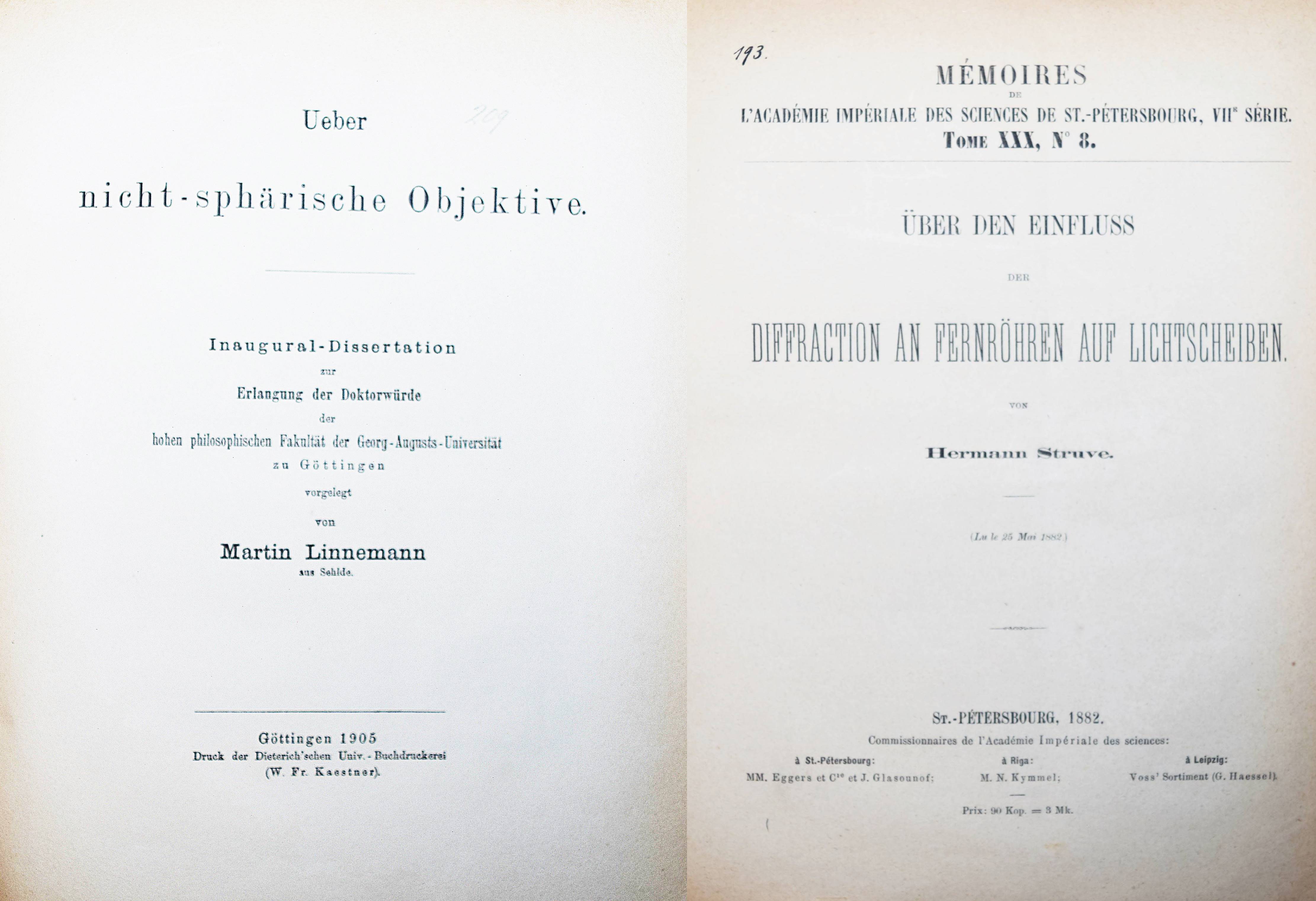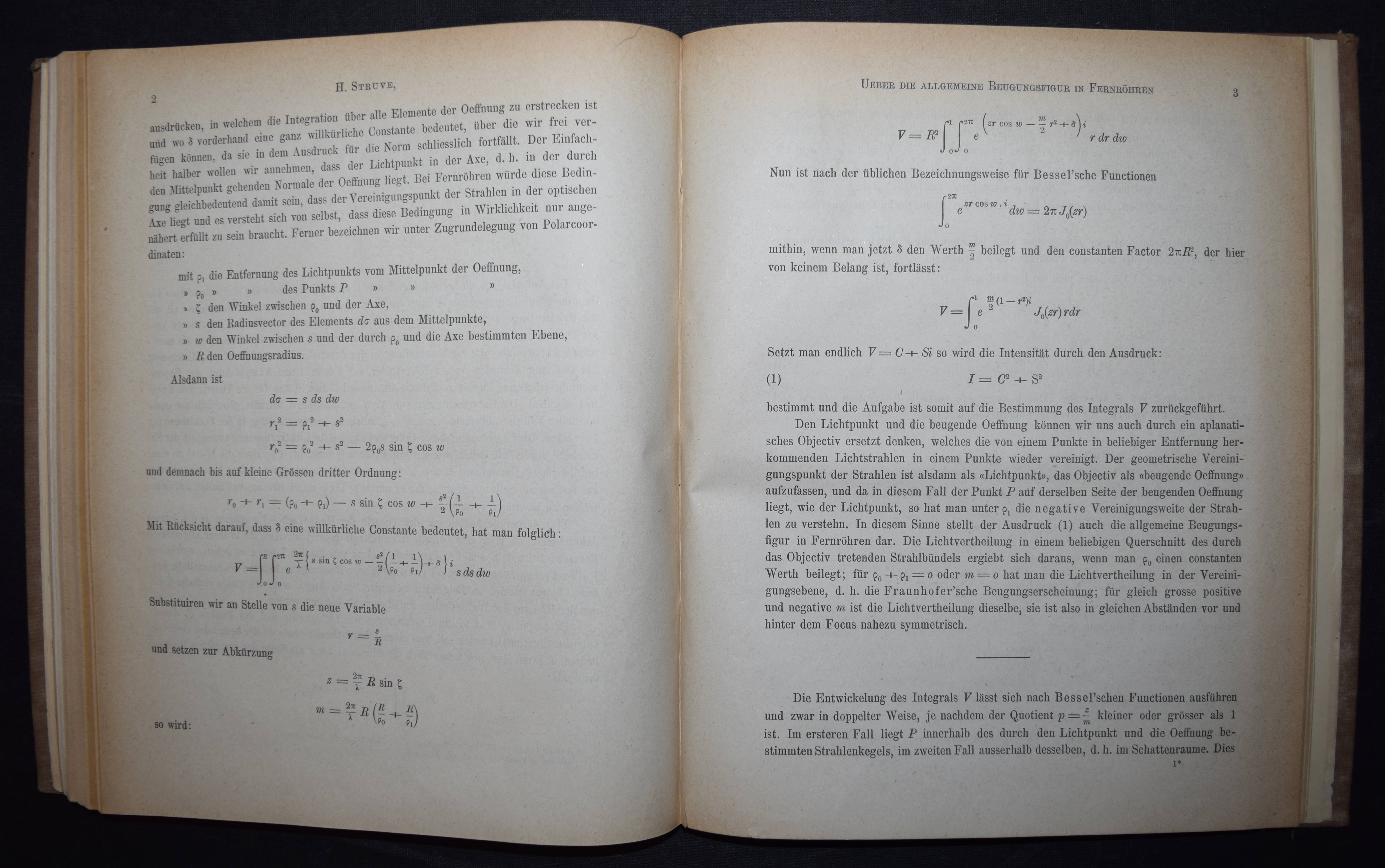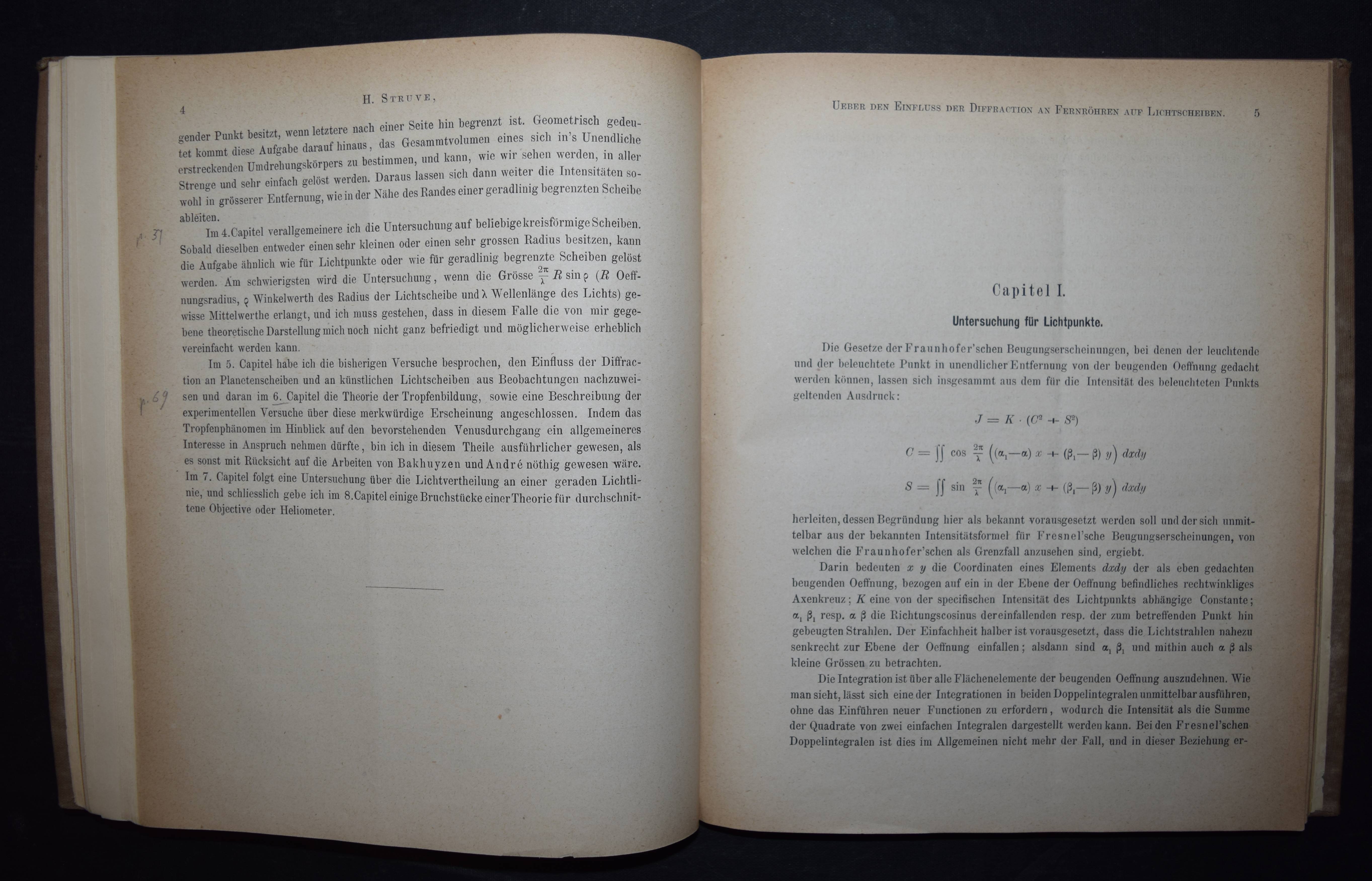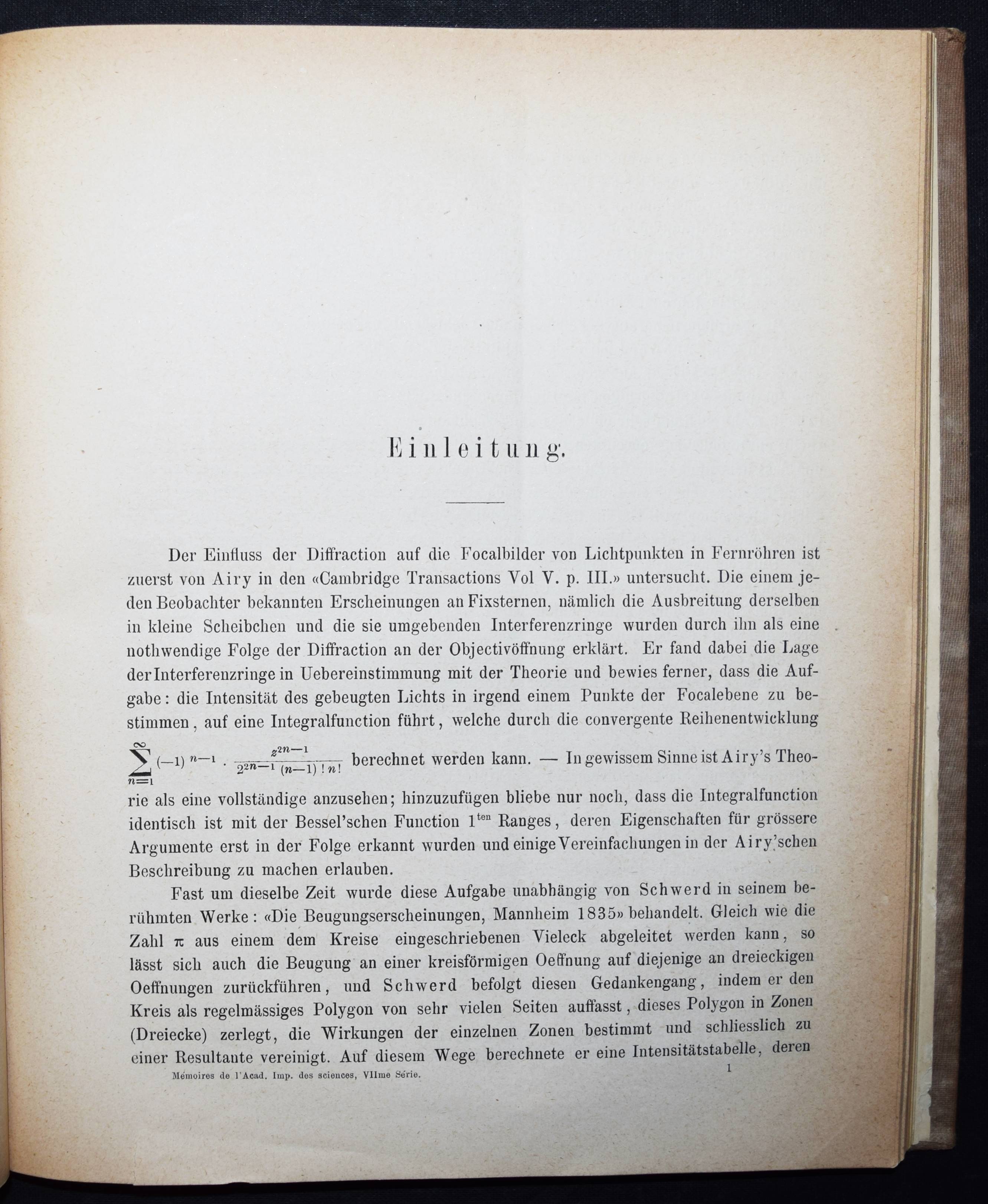 Schwarzschild, K(arl). Untersuchungen zur geometrischen Optik I. u. II (von 3). In: Astronomische Mittheilungen der Königlichen Sternwarte zu Göttingen. 9. u. 10. Theil. Göttingen, Dieterich’sche Univ.-Druckerei 1905. 4°. 31 S.; 28 S. mit zus. 15 Text-Figuren. Ln. d. Zt. DSB XII, 249. NDB XXIV, 33 f. Reinisch / Wittmann, Karl Schwarzfeld S. 83 (mit Abb.) u.104. – Wie alle ersten Ausgaben der Arbeiten des bedeutenden Astrophysikers sehr selten. – „Die Arbeiten Karl Schwarzschilds zur Optik, und hier insbesondere zur Teleskopoptik, sind fundamental, wie so viele seiner astrophysikalischen Arbeiten. Sie bilden bis heute die Grundlage für das Design, das Verständnis und die Optimierung des optischen Strahlengangs großer und bedeutender Teleskope. Selbst die optischen Entwürfe heutiger Teleskopgiganten bis 40 Meter Öffnung fußen mit ihren Drei-Spiegel-Anastigmaten auf seinen Arbeiten… Sein fundamentales Werk zur aberrationsbehafteten optischen Abbildung gliedert sich in drei Abhandlungen: „I. Einleitung in die Fehlertheorie optischer Instrumente auf Grund des Eikonalbegriffs“,”II. Theorie der Spiegelteleskope“,”III. Über die astrophotographischen Objektive“. Alle drei sind 1905 in den Astronomischen Mitteilungen der Königlichen Sternwarte zu Göttingen, Teil 9, 10 und 11 erschienen… ″ (H. E. Nicklas in Reinisch/Wittmann S. 81 ff.). – Der Astronom, Mathematiker und Physiker K. Schwarzschild (1873-1916) „gilt weltweit als einer der begabtesten und bedeutendsten Astronomen aller Zeiten und als Mitbegründer der Astrophysik. Geboren in Frankfurt am Main, wirkte er von 1901 bis 1909 als Professor für Astronomie und Direktor der Sternwarte in Göttingen und von 1909 bis 1916 als Direktor des Astrophysikalischen Observatoriums in Potsdam. Im Laufe seines allzu kurzen Lebens veröffentlichte Schwarzschild etwa 150 wissenschaftliche Arbeiten, viele davon von fundamentaler Bedeutung für die Entwicklung der Astronomie und Astrophysik“ (K. Reinsch u. A. D. Wittmann). – Beigebunden: Linnemann, Martin. Ueber nicht-sphärische Objektive. Inaug.-Dissertation. Göttingen, Ebda. 1905. 40, (2) S. mit 4 Text-Figuren. – „Vorlesungen und Uebungen besuchte ich bei den Herren Professoren und Dozenten: Brendel, Czermak, Hilbert, Klein, Lindemann, Röntgen, Schwarzschild, Seeliger, Voigt“ u.v.a. – Beigebunden: Struve, Hermann. Über den Einfluss der Diffraction an Fernröhren auf Lichtscheiben. – (Und): Ders. Zur Theorie der Talbot’schen Linien. (Und): Ders. Über die allgemeine Beugungsfigur in Fernröhren. In: Mémoires de l’Académie Impériale des Sciences de St. Pétersbourg, VIIe série. Tome XXX, No. 8, tome XXXI, No. 1 u. tome XXXIV, No. 5. St. Petersburg 1882, 1883 u. 1886. 104 S.; 13 S.; 15 S. typogr. Orig.-Umschläge teils beigebunden. – (Und): Astronomische Nachrichten. Band 138, No. 3289, Band 166, No. 3974 u. Band 168, No. 4010. Mit Artikeln von Otto Birck, T. N. ThieleH. E. Timerding u. Alexander Wilkens. – Außerdem sind 3 Prospekte der Firma Carl Zeiss begebunden: Projektionsmikroskop für das Epidiaskop. – Stereo-Komparatoren nach Pulfrich. – Makro-Projektionsapparat und großer Projektionsapparat. Berlin u.a. 1903. – Sammelband mit sehr seltenen und interessanten Arbeiten zur Optik. – Gelenke, Kapital u. Fuß mit Fehlstellen, Innendeckel mit handschr. Inhaltsverz. u. Bibliotheksst., sonst gut erhalten.