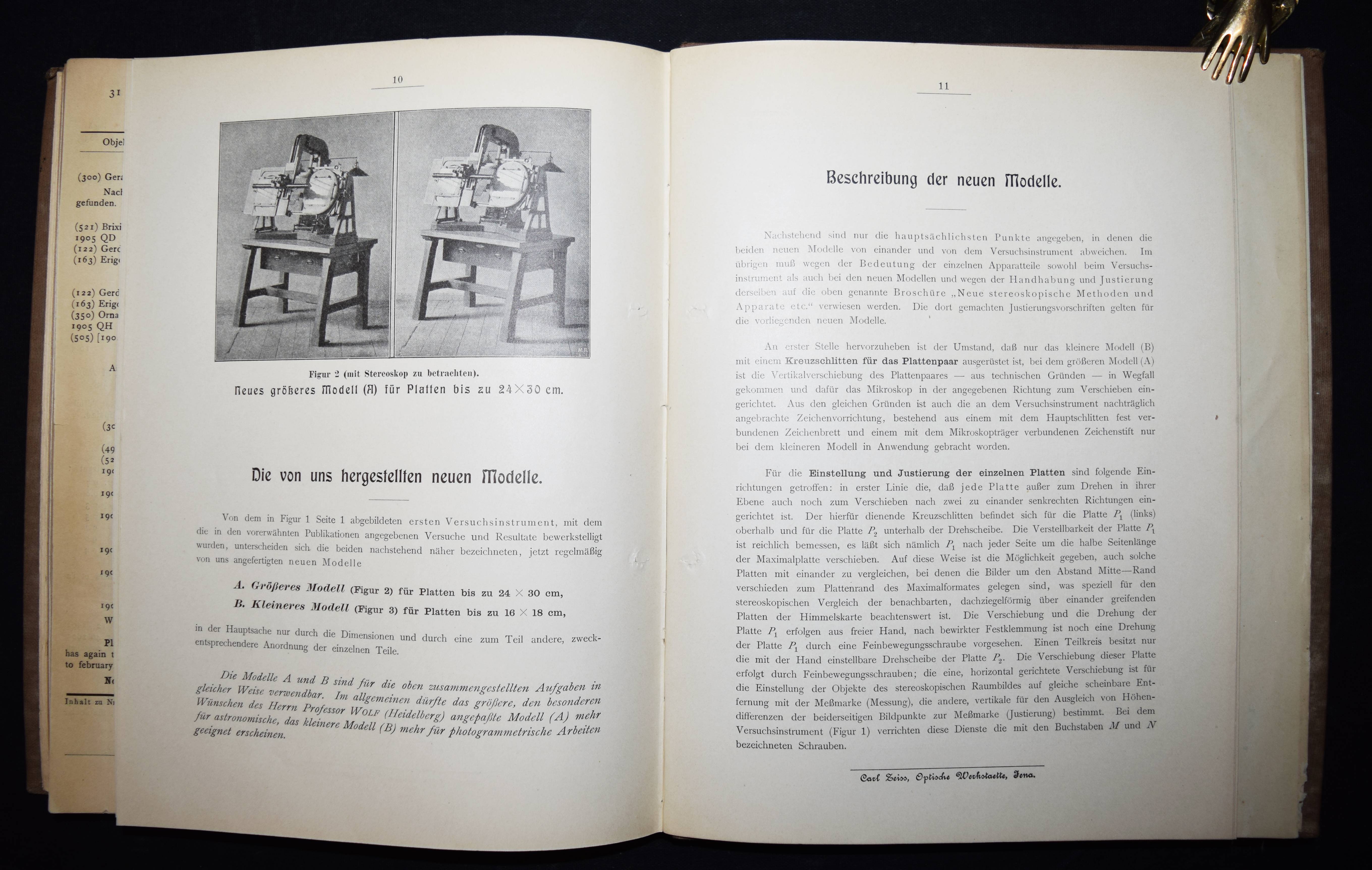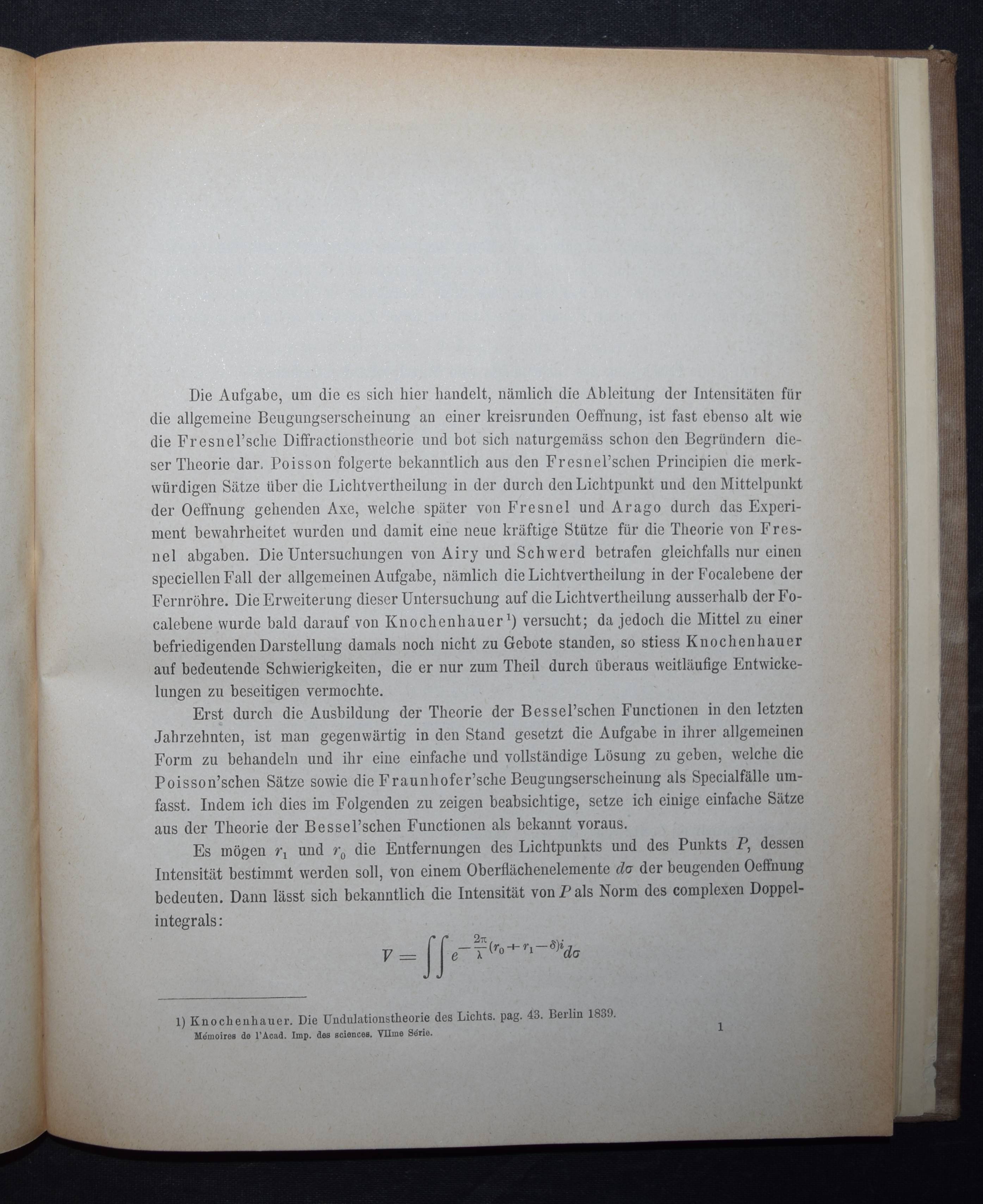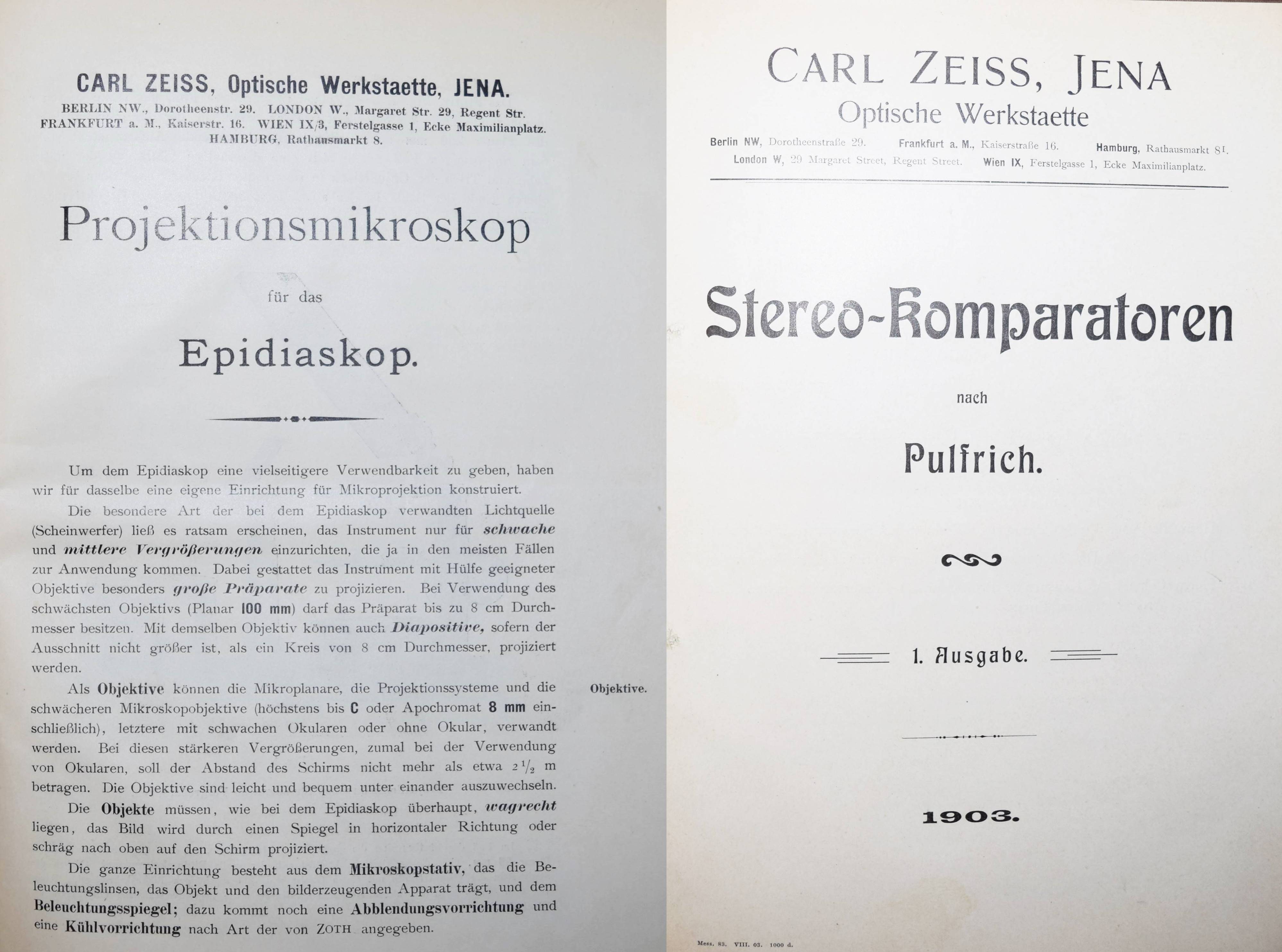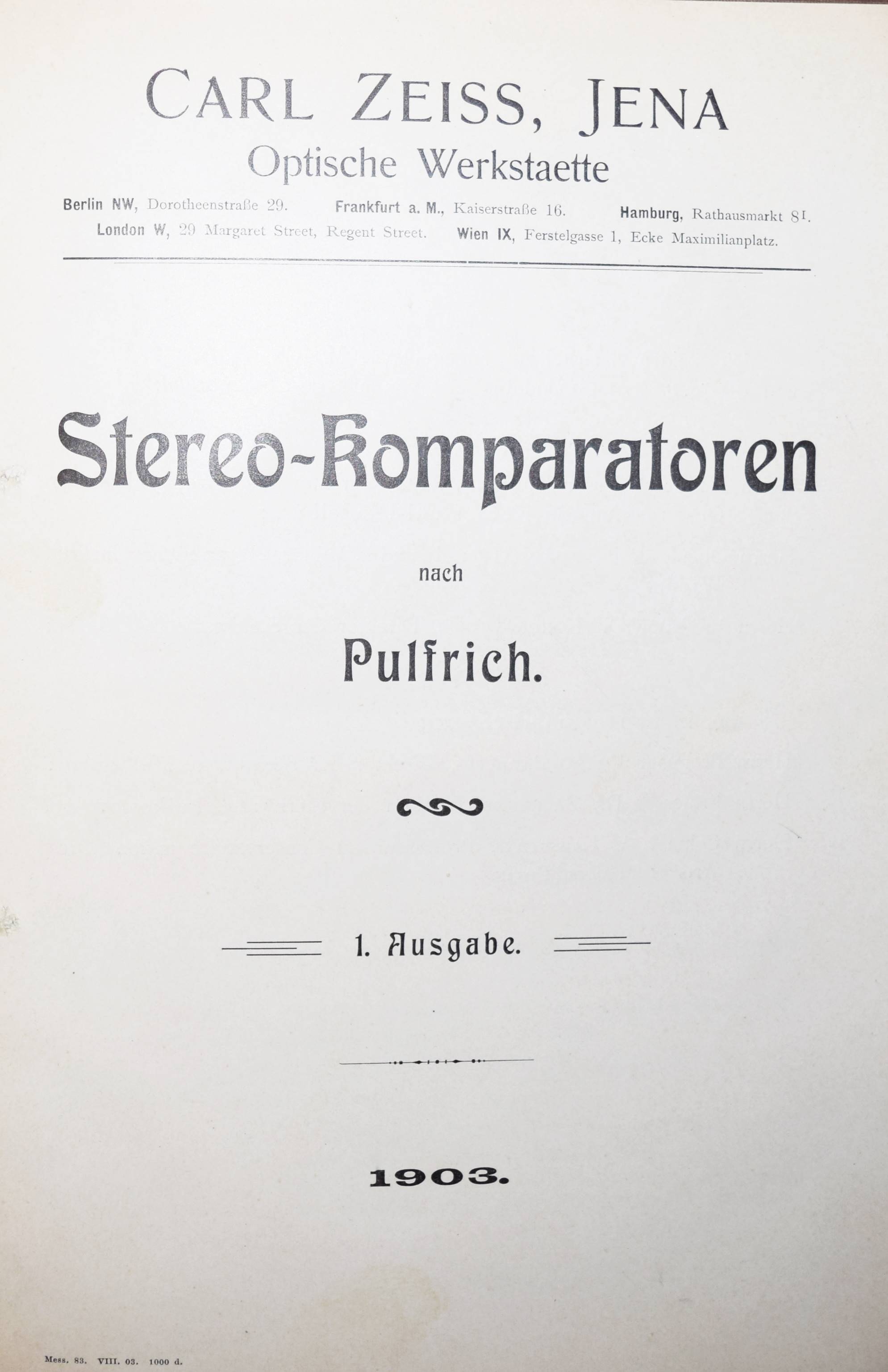 Schwarzschild, K(arl). Untersuchungen zur geometrischen Optik I. u. II (von 3). In: Astronomische Mittheilungen der Königlichen Sternwarte zu Göttingen. 9. u. 10. Theil. Göttingen, Dieterich’sche Univ.-Druckerei 1905. 4°. 31 S.; 28 S. mit zus. 15 Text-Figuren. Ln. d. Zt. DSB XII, 249. NDB XXIV, 33 f. Reinisch / Wittmann, Karl Schwarzfeld S. 83 (mit Abb.) u.104. – Wie alle ersten Ausgaben der Arbeiten des bedeutenden Astrophysikers sehr selten. – „Die Arbeiten Karl Schwarzschilds zur Optik, und hier insbesondere zur Teleskopoptik, sind fundamental, wie so viele seiner astrophysikalischen Arbeiten. Sie bilden bis heute die Grundlage für das Design, das Verständnis und die Optimierung des optischen Strahlengangs großer und bedeutender Teleskope. Selbst die optischen Entwürfe heutiger Teleskopgiganten bis 40 Meter Öffnung fußen mit ihren Drei-Spiegel-Anastigmaten auf seinen Arbeiten… Sein fundamentales Werk zur aberrationsbehafteten optischen Abbildung gliedert sich in drei Abhandlungen: „I. Einleitung in die Fehlertheorie optischer Instrumente auf Grund des Eikonalbegriffs“,”II. Theorie der Spiegelteleskope“,”III. Über die astrophotographischen Objektive“. Alle drei sind 1905 in den Astronomischen Mitteilungen der Königlichen Sternwarte zu Göttingen, Teil 9, 10 und 11 erschienen… ″ (H. E. Nicklas in Reinisch/Wittmann S. 81 ff.). – Der Astronom, Mathematiker und Physiker K. Schwarzschild (1873-1916) „gilt weltweit als einer der begabtesten und bedeutendsten Astronomen aller Zeiten und als Mitbegründer der Astrophysik. Geboren in Frankfurt am Main, wirkte er von 1901 bis 1909 als Professor für Astronomie und Direktor der Sternwarte in Göttingen und von 1909 bis 1916 als Direktor des Astrophysikalischen Observatoriums in Potsdam. Im Laufe seines allzu kurzen Lebens veröffentlichte Schwarzschild etwa 150 wissenschaftliche Arbeiten, viele davon von fundamentaler Bedeutung für die Entwicklung der Astronomie und Astrophysik“ (K. Reinsch u. A. D. Wittmann). – Beigebunden: Linnemann, Martin. Ueber nicht-sphärische Objektive. Inaug.-Dissertation. Göttingen, Ebda. 1905. 40, (2) S. mit 4 Text-Figuren. – „Vorlesungen und Uebungen besuchte ich bei den Herren Professoren und Dozenten: Brendel, Czermak, Hilbert, Klein, Lindemann, Röntgen, Schwarzschild, Seeliger, Voigt“ u.v.a. – Beigebunden: Struve, Hermann. Über den Einfluss der Diffraction an Fernröhren auf Lichtscheiben. – (Und): Ders. Zur Theorie der Talbot’schen Linien. (Und): Ders. Über die allgemeine Beugungsfigur in Fernröhren. In: Mémoires de l’Académie Impériale des Sciences de St. Pétersbourg, VIIe série. Tome XXX, No. 8, tome XXXI, No. 1 u. tome XXXIV, No. 5. St. Petersburg 1882, 1883 u. 1886. 104 S.; 13 S.; 15 S. typogr. Orig.-Umschläge teils beigebunden. – (Und): Astronomische Nachrichten. Band 138, No. 3289, Band 166, No. 3974 u. Band 168, No. 4010. Mit Artikeln von Otto Birck, T. N. ThieleH. E. Timerding u. Alexander Wilkens. – Außerdem sind 3 Prospekte der Firma Carl Zeiss begebunden: Projektionsmikroskop für das Epidiaskop. – Stereo-Komparatoren nach Pulfrich. – Makro-Projektionsapparat und großer Projektionsapparat. Berlin u.a. 1903. – Sammelband mit sehr seltenen und interessanten Arbeiten zur Optik. – Gelenke, Kapital u. Fuß mit Fehlstellen, Innendeckel mit handschr. Inhaltsverz. u. Bibliotheksst., sonst gut erhalten.