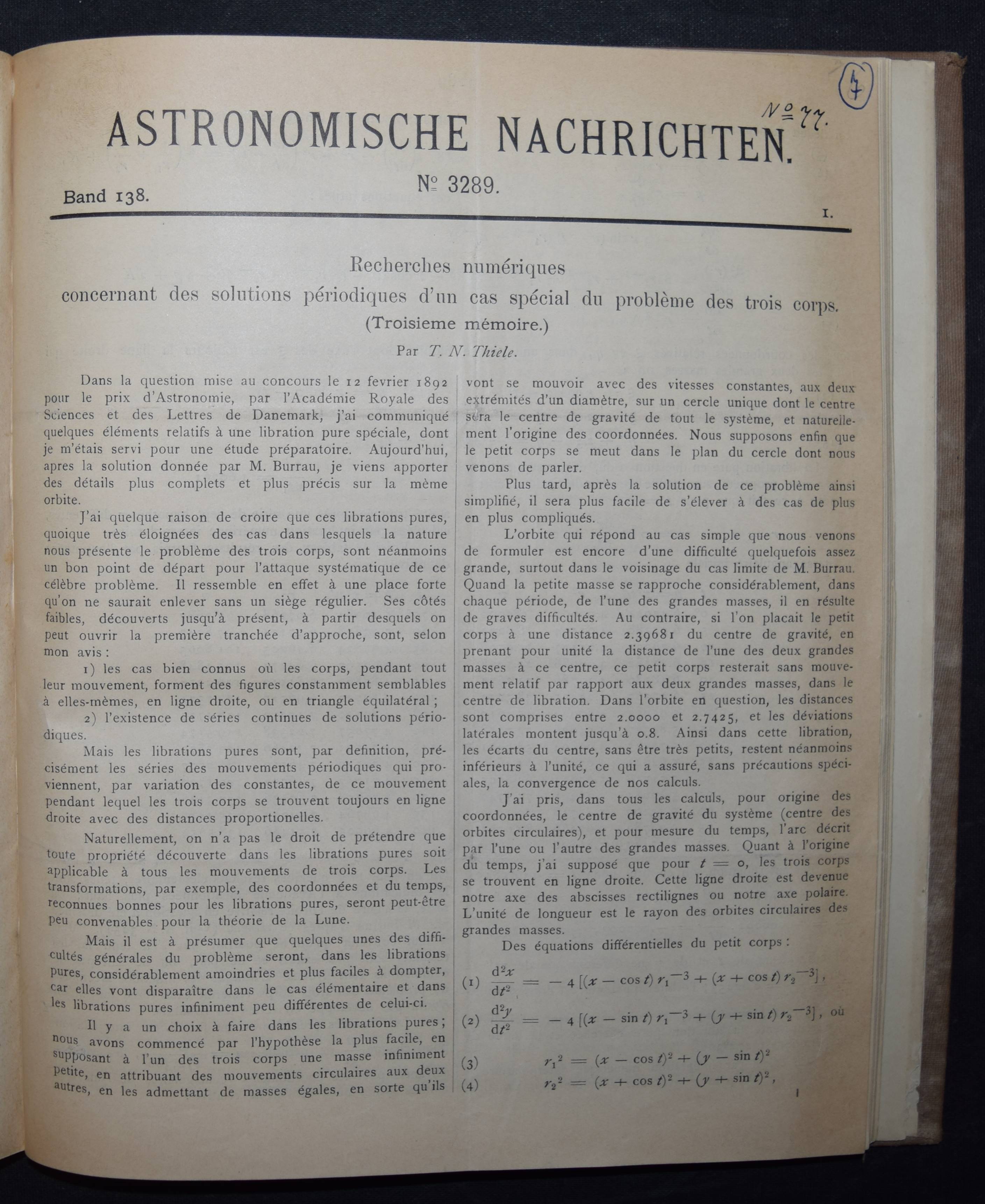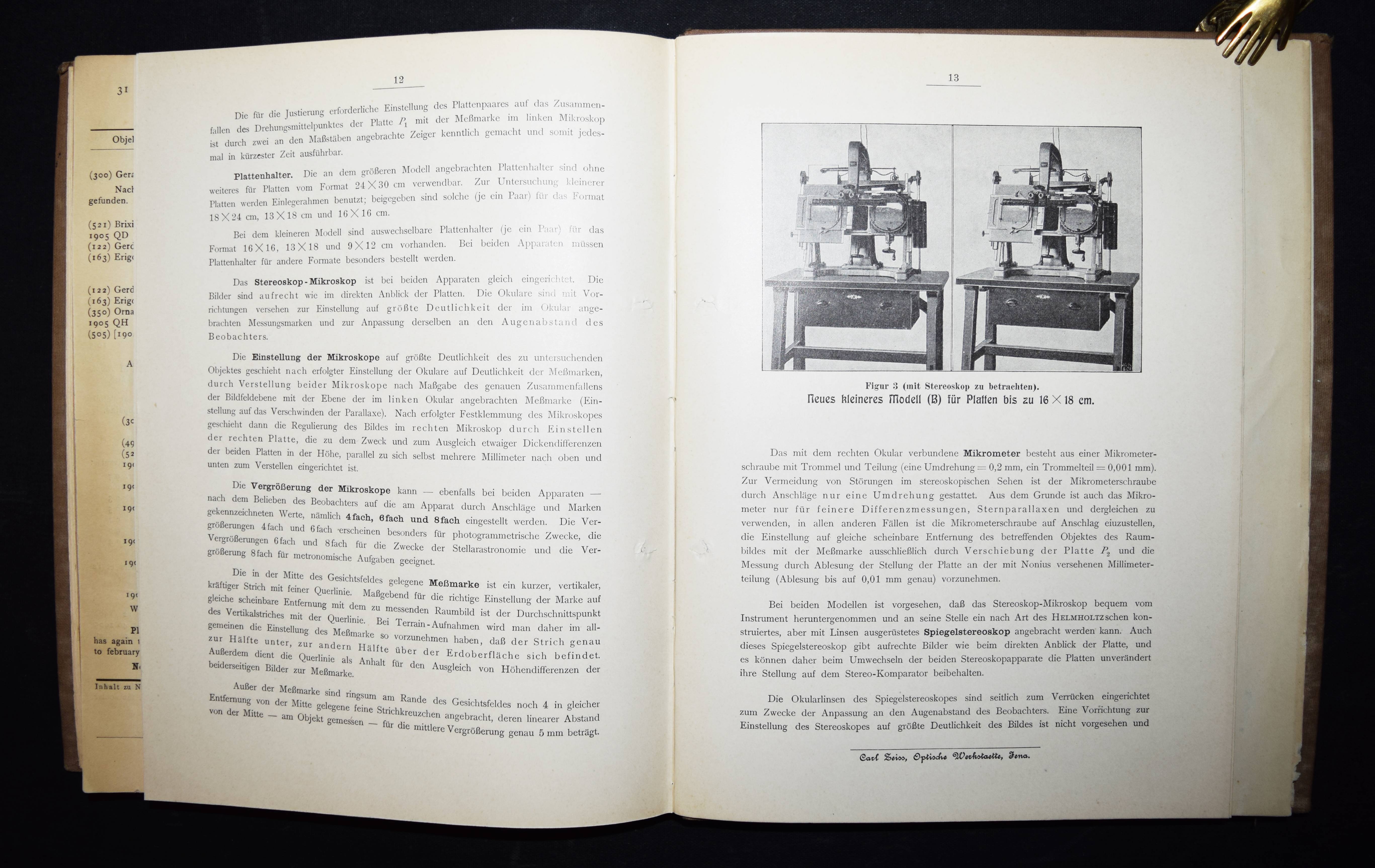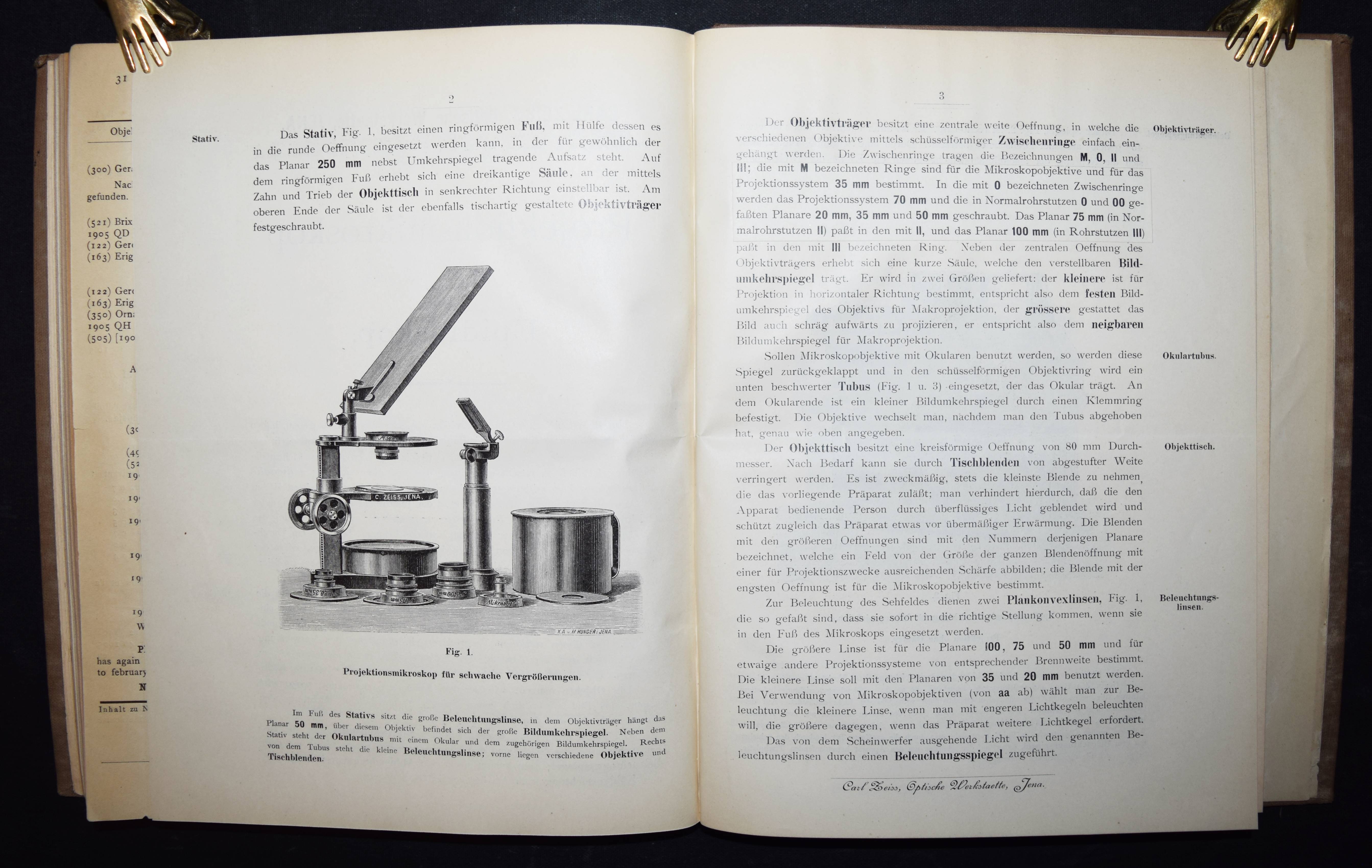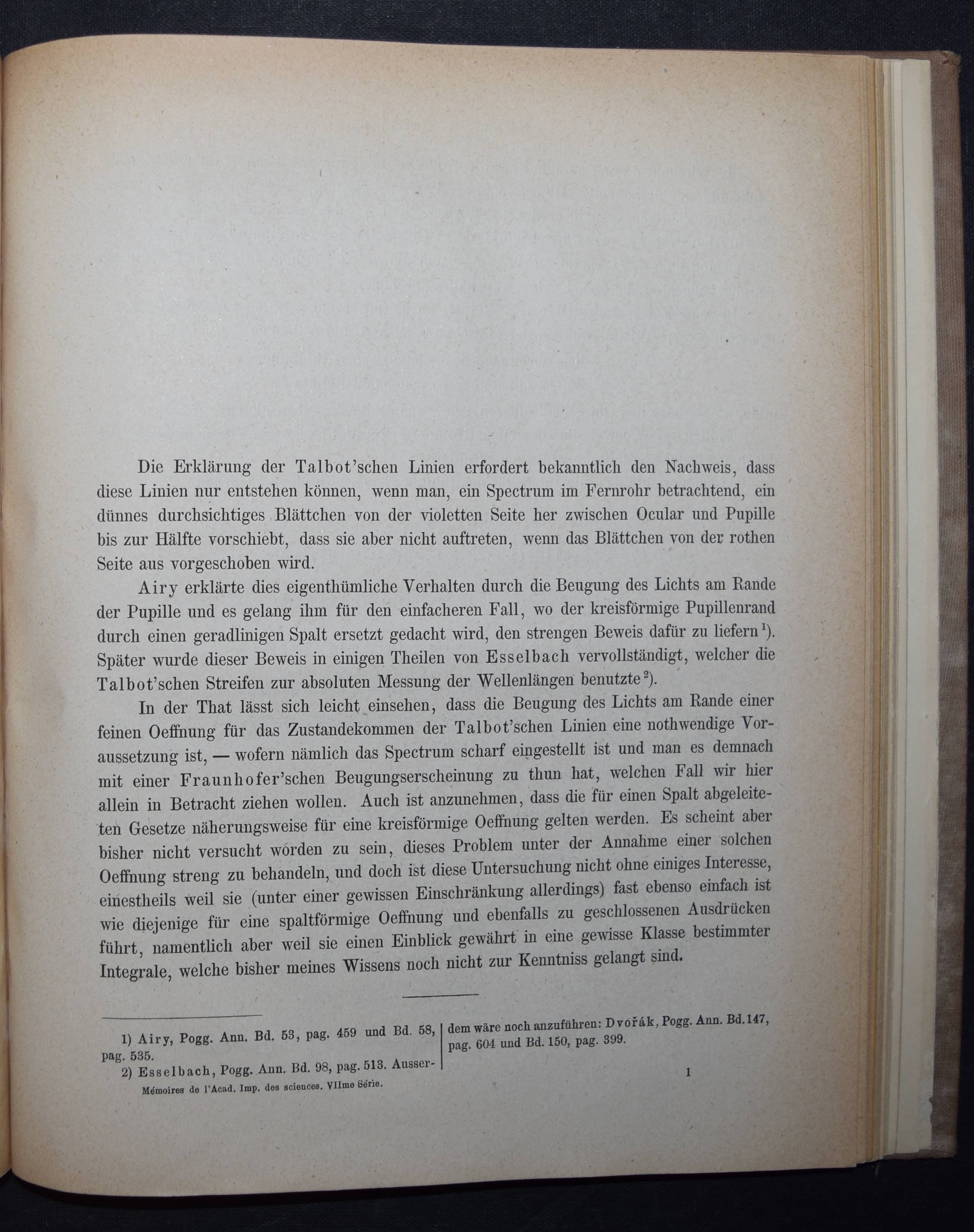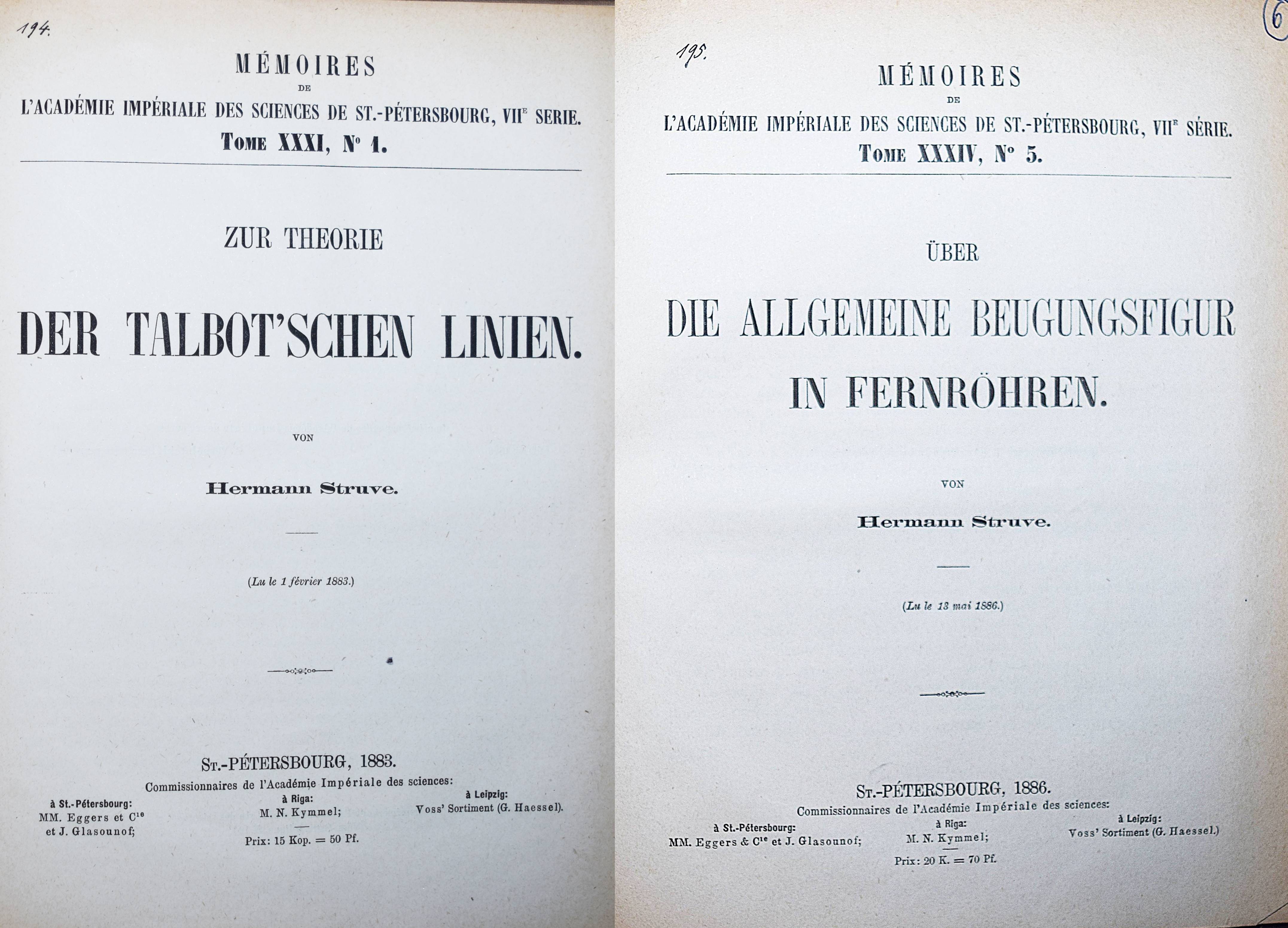 Schwarzschild, K(arl). Untersuchungen zur geometrischen Optik I. u. II (von 3). In: Astronomische Mittheilungen der Königlichen Sternwarte zu Göttingen. 9. u. 10. Theil. Göttingen, Dieterich’sche Univ.-Druckerei 1905. 4°. 31 S.; 28 S. mit zus. 15 Text-Figuren. Ln. d. Zt. DSB XII, 249. NDB XXIV, 33 f. Reinisch / Wittmann, Karl Schwarzfeld S. 83 (mit Abb.) u.104. – Wie alle ersten Ausgaben der Arbeiten des bedeutenden Astrophysikers sehr selten. – „Die Arbeiten Karl Schwarzschilds zur Optik, und hier insbesondere zur Teleskopoptik, sind fundamental, wie so viele seiner astrophysikalischen Arbeiten. Sie bilden bis heute die Grundlage für das Design, das Verständnis und die Optimierung des optischen Strahlengangs großer und bedeutender Teleskope. Selbst die optischen Entwürfe heutiger Teleskopgiganten bis 40 Meter Öffnung fußen mit ihren Drei-Spiegel-Anastigmaten auf seinen Arbeiten… Sein fundamentales Werk zur aberrationsbehafteten optischen Abbildung gliedert sich in drei Abhandlungen: „I. Einleitung in die Fehlertheorie optischer Instrumente auf Grund des Eikonalbegriffs“,”II. Theorie der Spiegelteleskope“,”III. Über die astrophotographischen Objektive“. Alle drei sind 1905 in den Astronomischen Mitteilungen der Königlichen Sternwarte zu Göttingen, Teil 9, 10 und 11 erschienen… ″ (H. E. Nicklas in Reinisch/Wittmann S. 81 ff.). – Der Astronom, Mathematiker und Physiker K. Schwarzschild (1873-1916) „gilt weltweit als einer der begabtesten und bedeutendsten Astronomen aller Zeiten und als Mitbegründer der Astrophysik. Geboren in Frankfurt am Main, wirkte er von 1901 bis 1909 als Professor für Astronomie und Direktor der Sternwarte in Göttingen und von 1909 bis 1916 als Direktor des Astrophysikalischen Observatoriums in Potsdam. Im Laufe seines allzu kurzen Lebens veröffentlichte Schwarzschild etwa 150 wissenschaftliche Arbeiten, viele davon von fundamentaler Bedeutung für die Entwicklung der Astronomie und Astrophysik“ (K. Reinsch u. A. D. Wittmann). – Beigebunden: Linnemann, Martin. Ueber nicht-sphärische Objektive. Inaug.-Dissertation. Göttingen, Ebda. 1905. 40, (2) S. mit 4 Text-Figuren. – „Vorlesungen und Uebungen besuchte ich bei den Herren Professoren und Dozenten: Brendel, Czermak, Hilbert, Klein, Lindemann, Röntgen, Schwarzschild, Seeliger, Voigt“ u.v.a. – Beigebunden: Struve, Hermann. Über den Einfluss der Diffraction an Fernröhren auf Lichtscheiben. – (Und): Ders. Zur Theorie der Talbot’schen Linien. (Und): Ders. Über die allgemeine Beugungsfigur in Fernröhren. In: Mémoires de l’Académie Impériale des Sciences de St. Pétersbourg, VIIe série. Tome XXX, No. 8, tome XXXI, No. 1 u. tome XXXIV, No. 5. St. Petersburg 1882, 1883 u. 1886. 104 S.; 13 S.; 15 S. typogr. Orig.-Umschläge teils beigebunden. – (Und): Astronomische Nachrichten. Band 138, No. 3289, Band 166, No. 3974 u. Band 168, No. 4010. Mit Artikeln von Otto Birck, T. N. ThieleH. E. Timerding u. Alexander Wilkens. – Außerdem sind 3 Prospekte der Firma Carl Zeiss begebunden: Projektionsmikroskop für das Epidiaskop. – Stereo-Komparatoren nach Pulfrich. – Makro-Projektionsapparat und großer Projektionsapparat. Berlin u.a. 1903. – Sammelband mit sehr seltenen und interessanten Arbeiten zur Optik. – Gelenke, Kapital u. Fuß mit Fehlstellen, Innendeckel mit handschr. Inhaltsverz. u. Bibliotheksst., sonst gut erhalten.