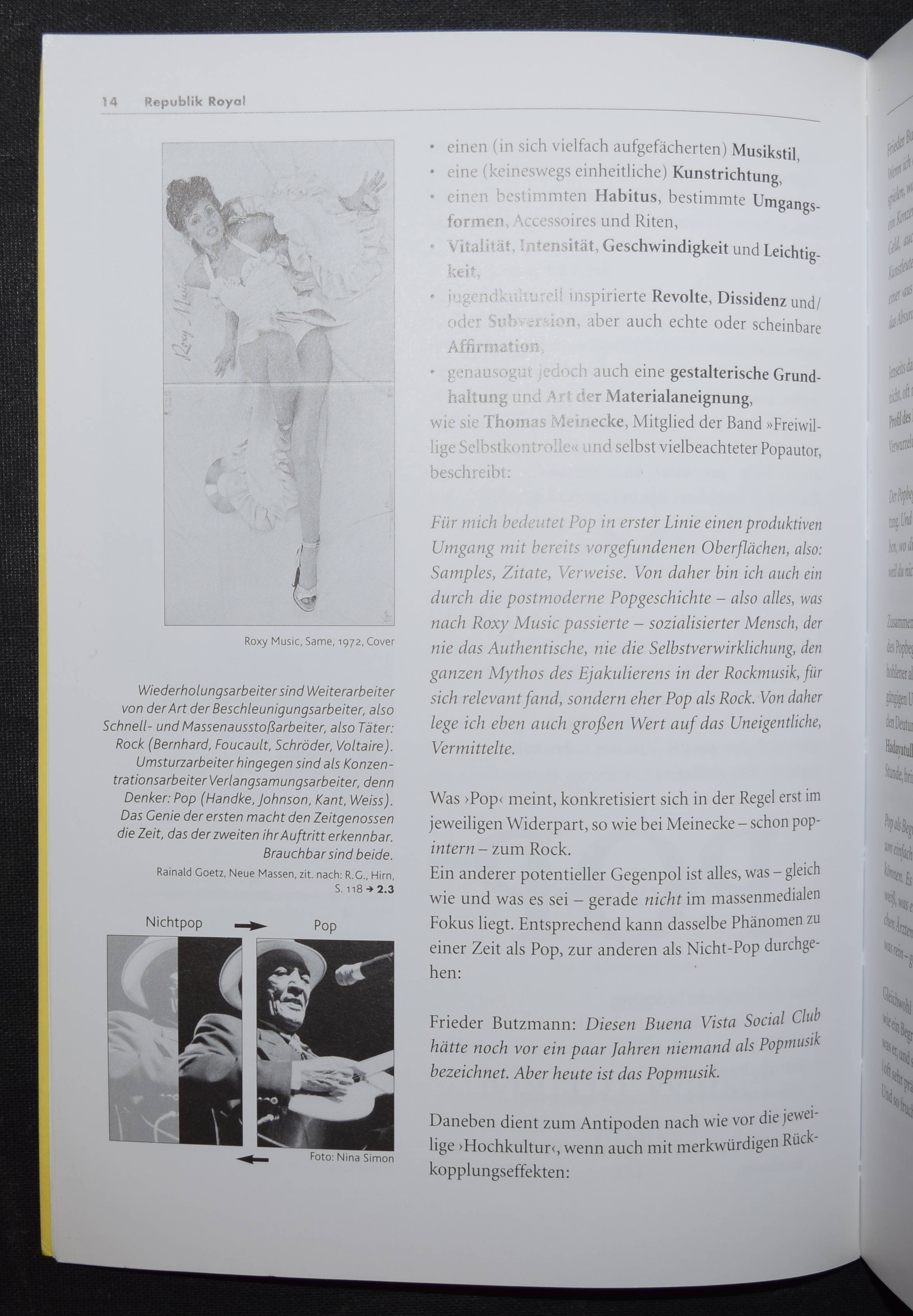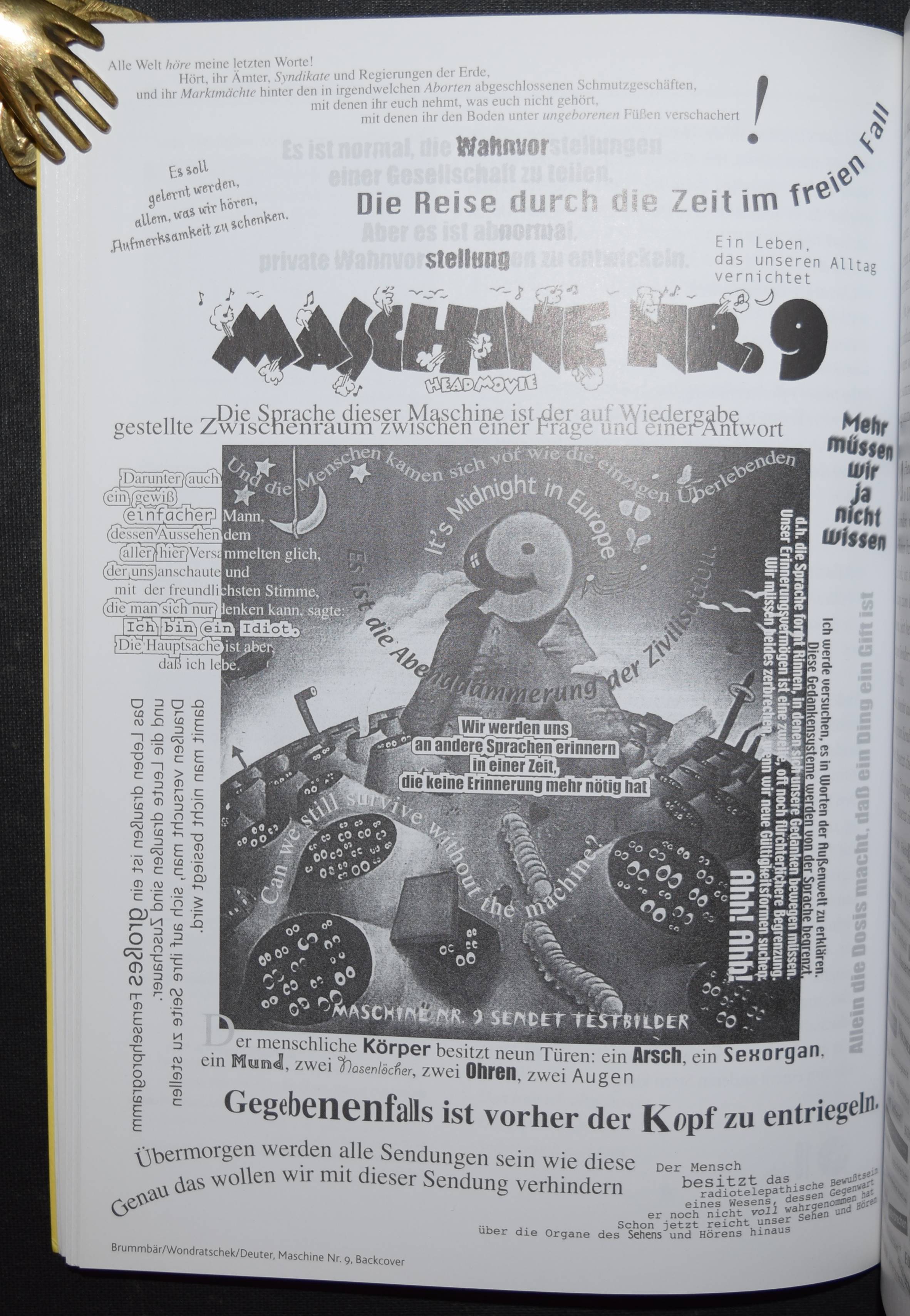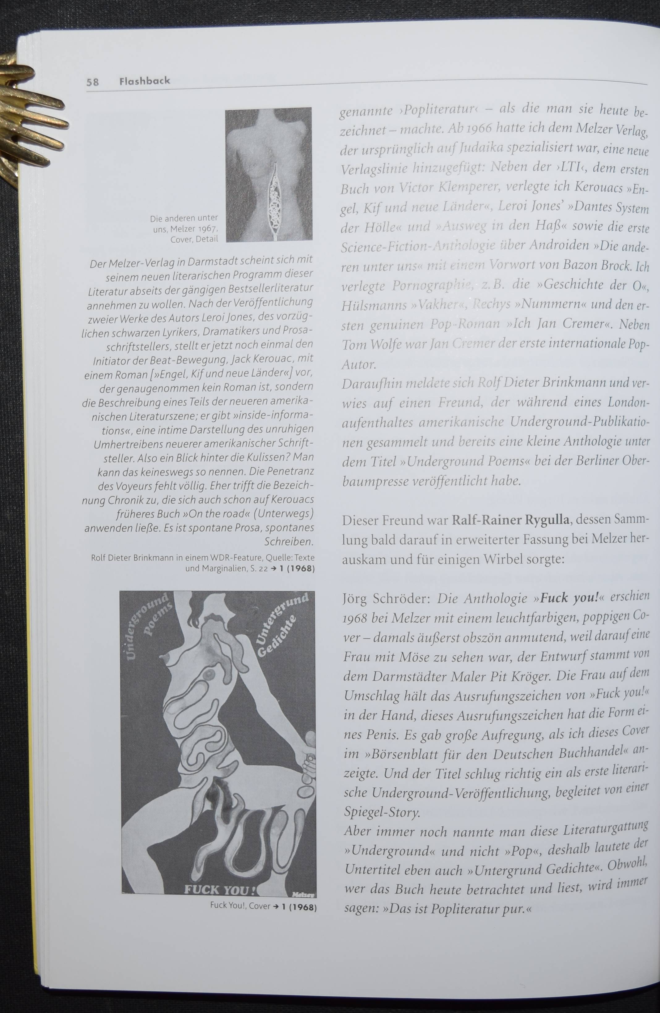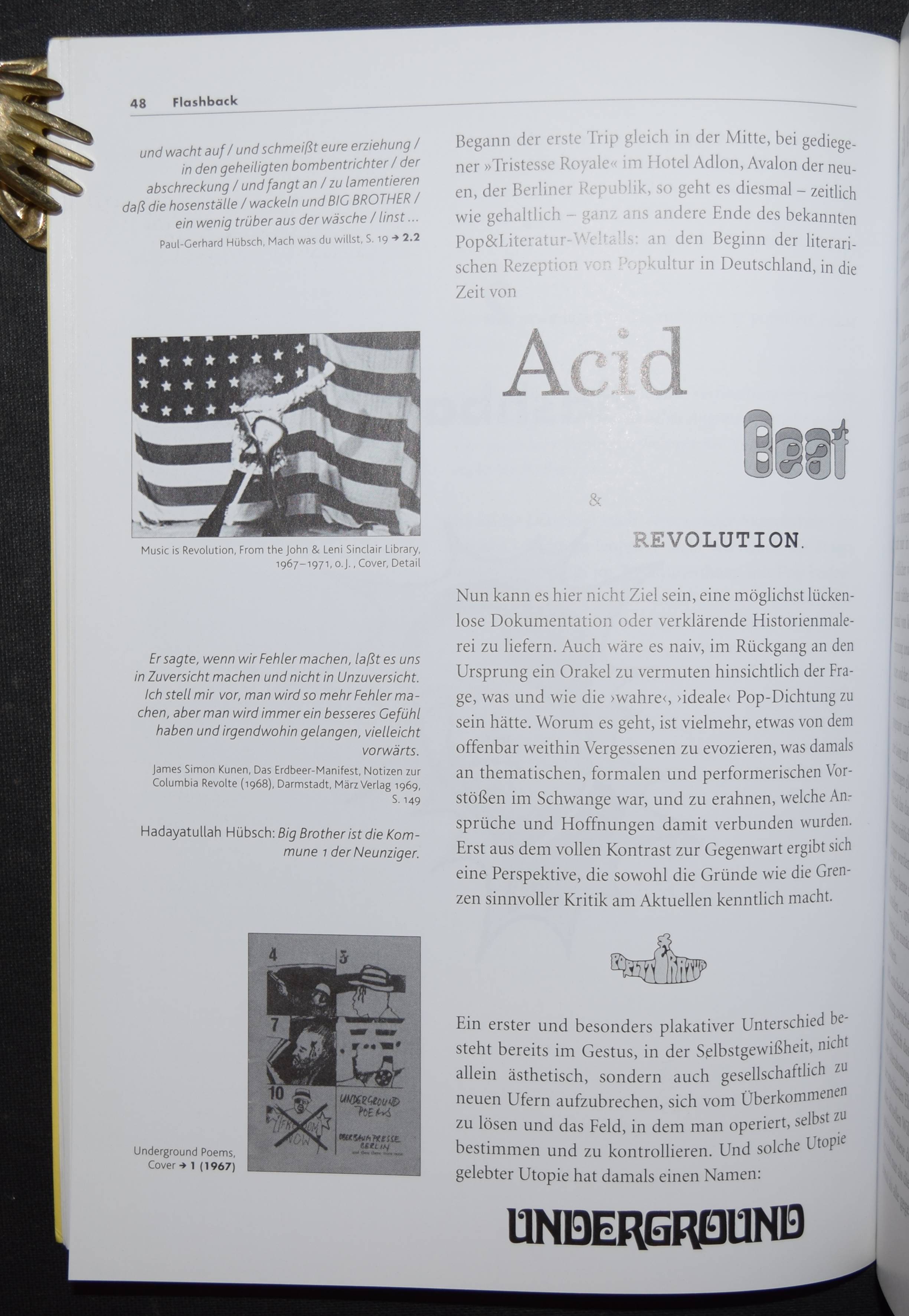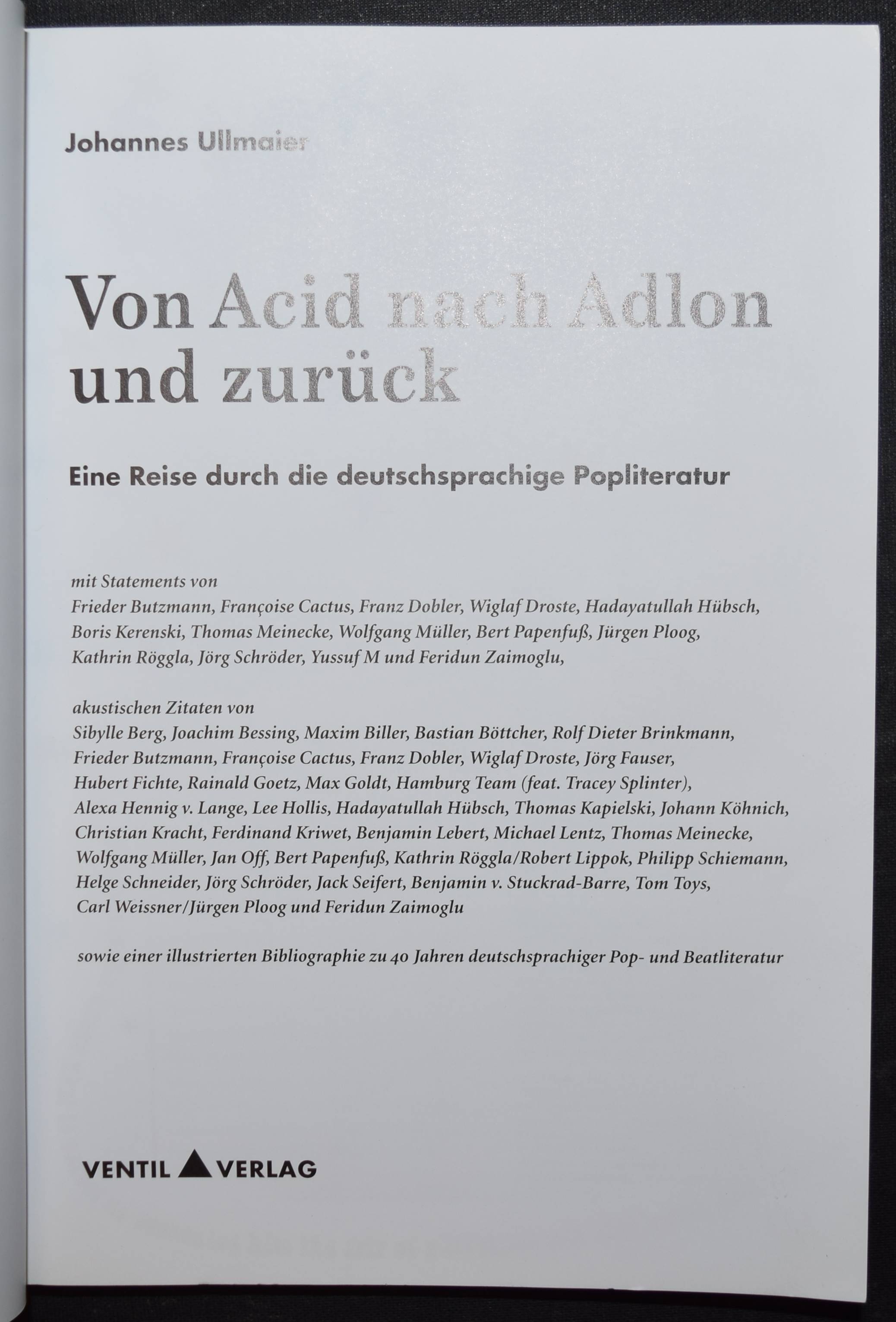 Ullmaier, Johannes. Von Acid nach Adlon und zurück. Eine Reise durch die deutschsprachige Popliteratur. Sowie einer illustrierten Bibliographie zu 40 Jahren deutschsprachiger Pop- und Beatliteratur. Mit Statements von Frieder Butzmann, Francois Cactus, Franz Dobler u.v.a. Akustischen Zitaten von Sibylle Berg , Joachim Bessing, Maxim Biller u.v.a. Mainz, Ventil Verlag 2001. 8°. 216 S. mit zahlr. Abb. sowie einer Audio-CD. Farbig illustr. OKart. mit Gitter-Ausstanzung im Vorderdeckel. Erste Ausgabe. – Sehr gutes Exemplar.
