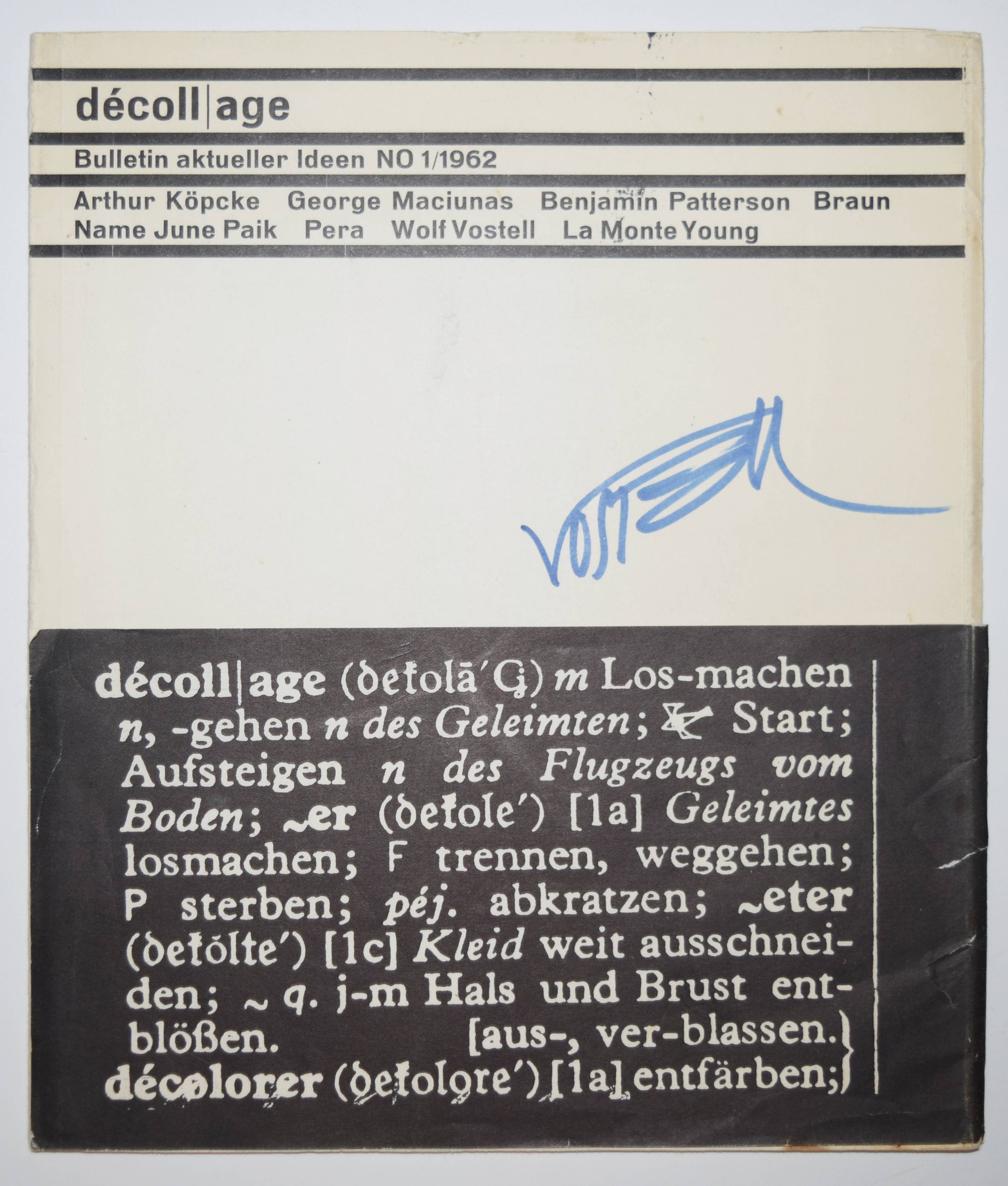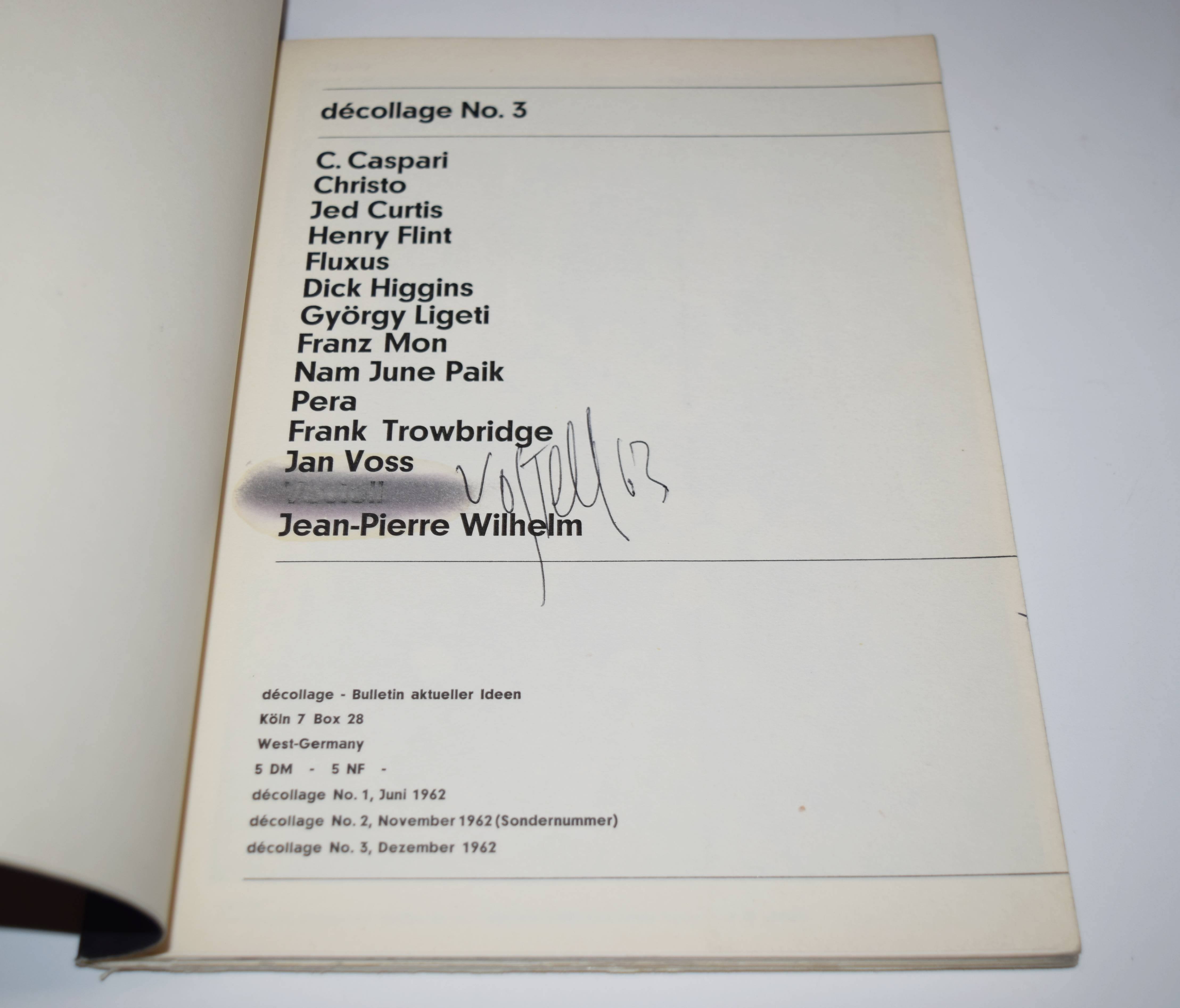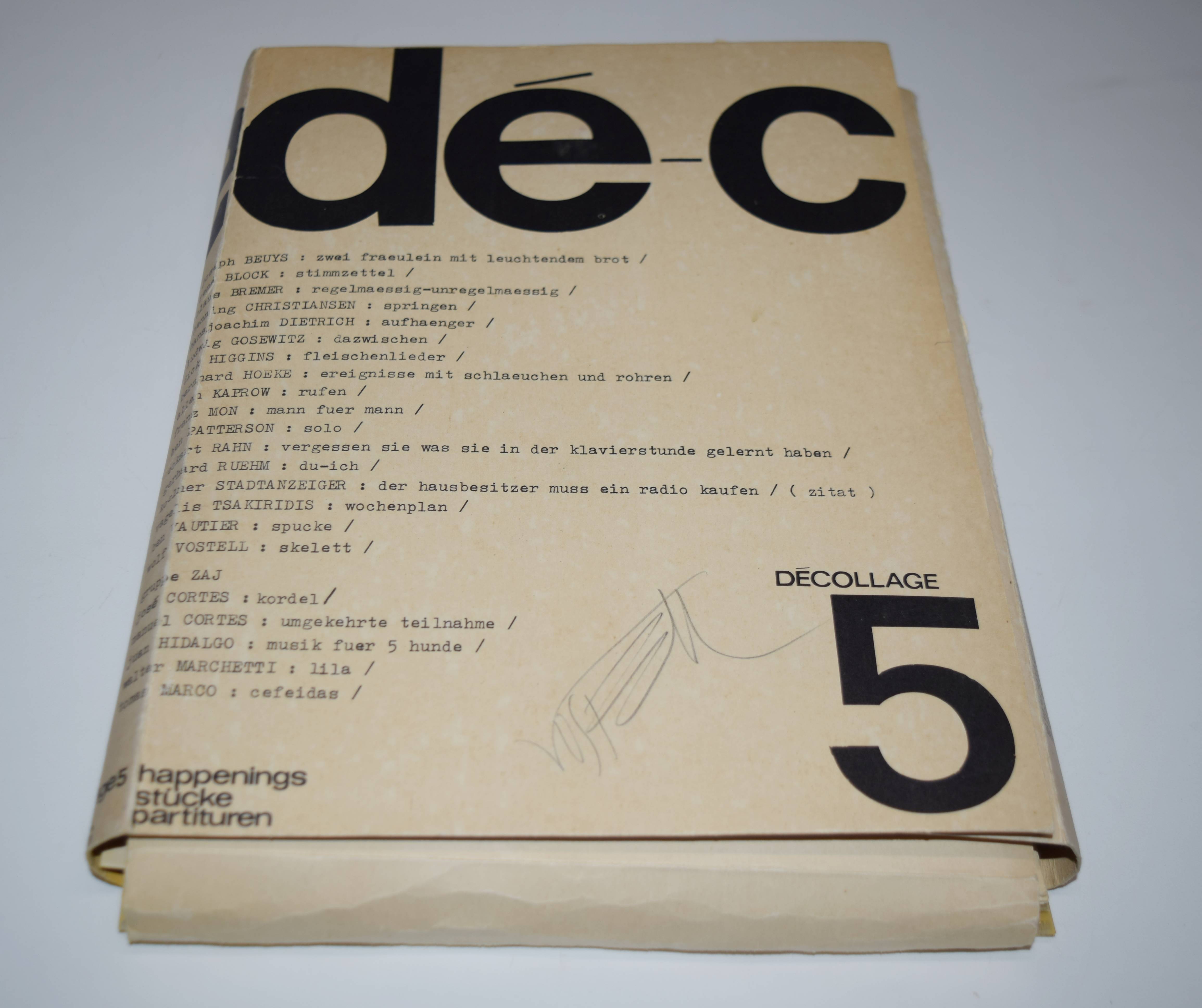 Vostell, Wolf (Hrsg.). Decollage. Bulletin aktueller Ideen. Dé-Coll/age No 1/1962 – Dé-Coll/age No. 7/1969. 7 Bände. Köln, Selbstverlag und Typos Verlag 1962-1969. 4°. Mit zahlr. Abbildungen und Tafeln. Orig.-Broschuren und Orig.-Kartonumschläge, teils mit Bauchbinde. Vollständige Folge des legendären Fluxus Periodikums. – Abgesehen von Heft 2, das ausschließlich Dick Higgins vorbehalten war, sind alle Hefte von Wolf Vostell signiert. – Mit Arbeiten unter anderen von Joseph Beuys, Rene Block, Claus Bremer, Henning Christiansen, Hans Joachim Dietrich, Ludwig Gosewitz, Dick Higgins, Berhard Hoeke, Allen Kaprow, Franz Mon, Ben Patterson, Eckart Rahn, Gerhard Rühm, Vagelis Tsakiridis, Ben Vautier und W. Vostell. – Nr. 1: Bauchbinde geöffnet und mit kl. Ausschnitt, Nr. 2: Schnitt mit leichten Feuchtigkeitsspuren und eine Kante mit kl. Fehlstelle, Bauchbinde in Kopie, Nr. 4: Umschlag am Rücken perforiert und sauber hinterlegt, ein hinterlegter kleiner Einriss, etwas gebräunt, ohne die montierte braune Tüte „use this Brouwn“ (Stanley Brouwn; liegt als originalgetreue Kopie bei), Nr. 5 ohne das Multiple von Joseph Beuys „Zwei Fraeulein…“, Nr. 7: Rücken und Kanten etwas berieben, sonst alle Hefte gut erhalten. – Dazu: W. Vostell. 4 Orig.-Portraitphotographien von Sandro Becchetti (1935-2013). Rom 1973. Jeweils 40 x 30 cm. (ein Porträt im Quer-Format). – Der bedeutende Konzeptkünstler hält seinen Katalog „happening & fluxus“ (zur Ausstellung im Kölner Kunstverein 1970) in die Höhe und drei Halbporträts. Die Aufnahmen entstanden anlässlich der Ausstellung „Contemporanea“ in der Villa Borghese in Rom. Rückseitig mit Stempel des Fotografen, vintage. – Dazu: 10 eigenhändige und unterschriebene Briefe von W. Vostell an den Wuppertaler Kunsthistoriker und Publizisten Georg F. Schwarzbauer sowie einigen maschinenschr. Antwortbriefen Schwarzbauers und umfangreiches Material zum Thema Fluxus (Kopien, Typoskripte etc.) in Sammelordner.