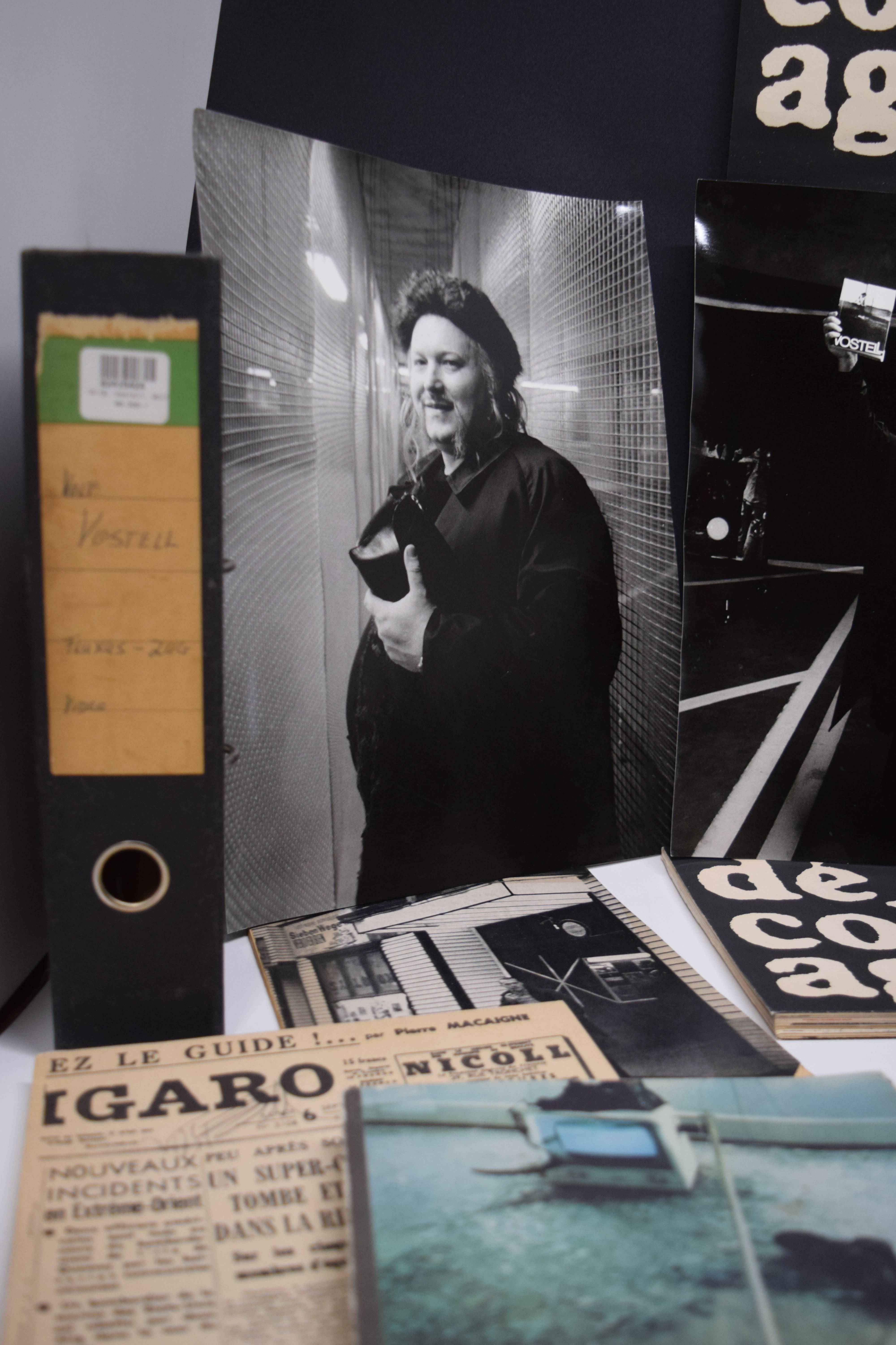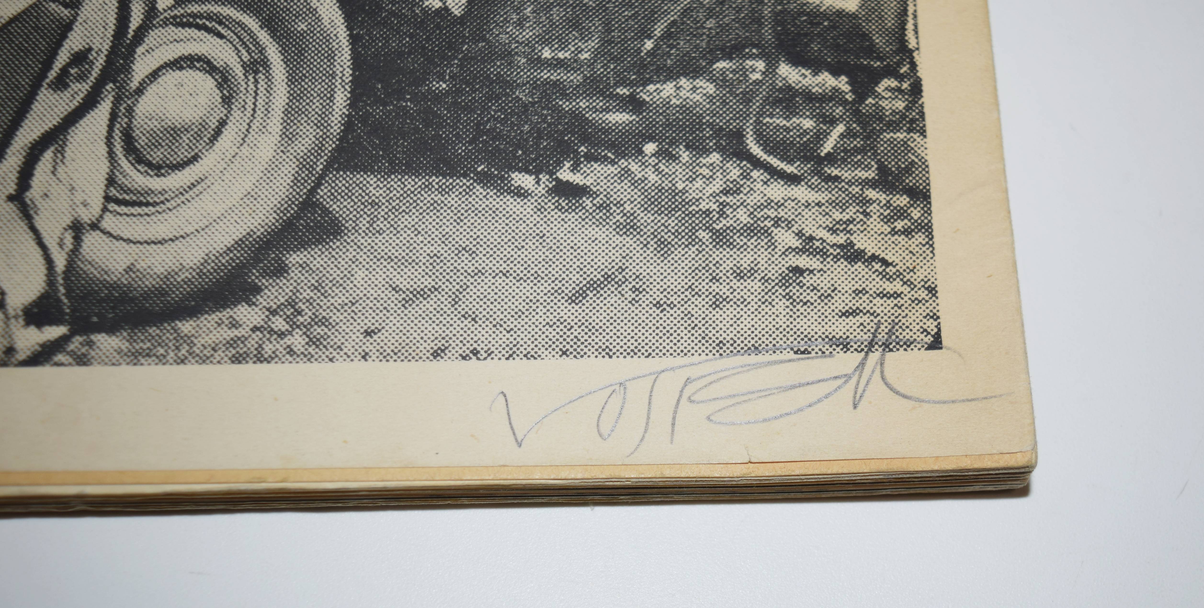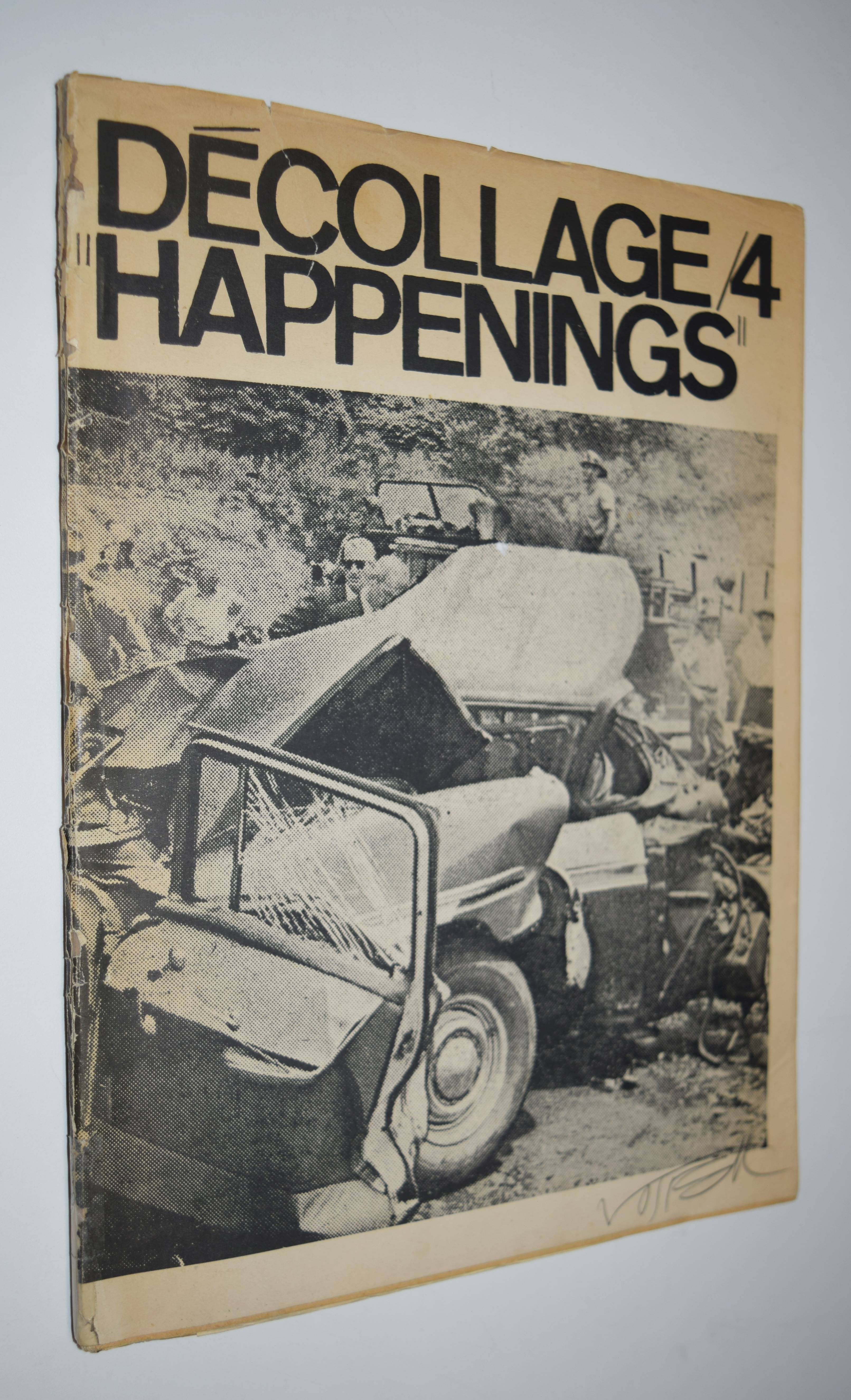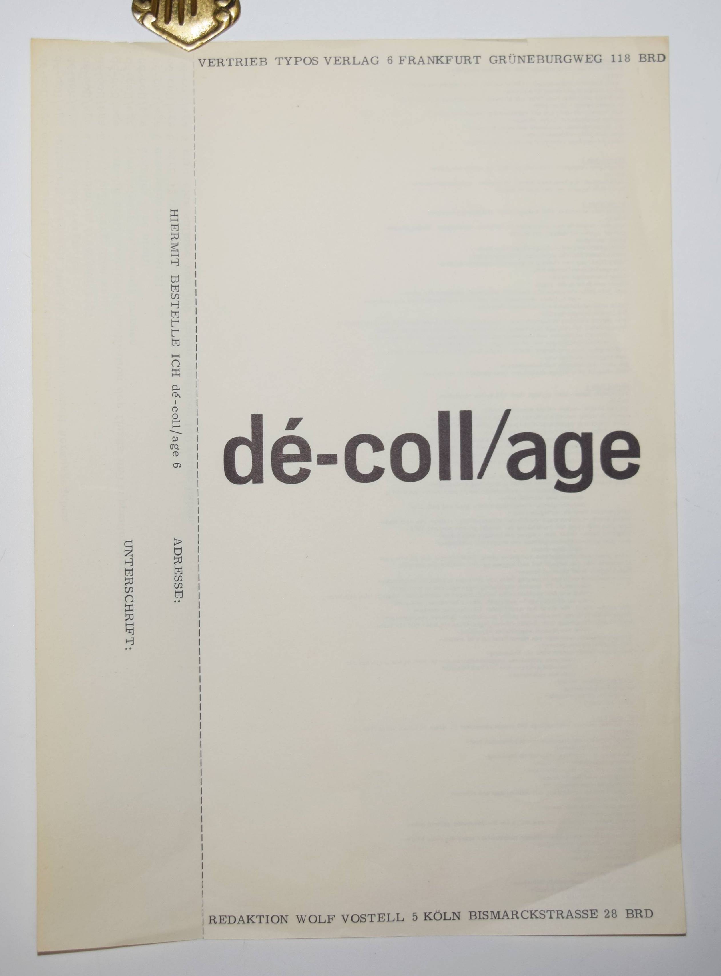 Vostell, Wolf (Hrsg.). Decollage. Bulletin aktueller Ideen. Dé-Coll/age No 1/1962 – Dé-Coll/age No. 7/1969. 7 Bände. Köln, Selbstverlag und Typos Verlag 1962-1969. 4°. Mit zahlr. Abbildungen und Tafeln. Orig.-Broschuren und Orig.-Kartonumschläge, teils mit Bauchbinde. Vollständige Folge des legendären Fluxus Periodikums. – Abgesehen von Heft 2, das ausschließlich Dick Higgins vorbehalten war, sind alle Hefte von Wolf Vostell signiert. – Mit Arbeiten unter anderen von Joseph Beuys, Rene Block, Claus Bremer, Henning Christiansen, Hans Joachim Dietrich, Ludwig Gosewitz, Dick Higgins, Berhard Hoeke, Allen Kaprow, Franz Mon, Ben Patterson, Eckart Rahn, Gerhard Rühm, Vagelis Tsakiridis, Ben Vautier und W. Vostell. – Nr. 1: Bauchbinde geöffnet und mit kl. Ausschnitt, Nr. 2: Schnitt mit leichten Feuchtigkeitsspuren und eine Kante mit kl. Fehlstelle, Bauchbinde in Kopie, Nr. 4: Umschlag am Rücken perforiert und sauber hinterlegt, ein hinterlegter kleiner Einriss, etwas gebräunt, ohne die montierte braune Tüte „use this Brouwn“ (Stanley Brouwn; liegt als originalgetreue Kopie bei), Nr. 5 ohne das Multiple von Joseph Beuys „Zwei Fraeulein…“, Nr. 7: Rücken und Kanten etwas berieben, sonst alle Hefte gut erhalten. – Dazu: W. Vostell. 4 Orig.-Portraitphotographien von Sandro Becchetti (1935-2013). Rom 1973. Jeweils 40 x 30 cm. (ein Porträt im Quer-Format). – Der bedeutende Konzeptkünstler hält seinen Katalog „happening & fluxus“ (zur Ausstellung im Kölner Kunstverein 1970) in die Höhe und drei Halbporträts. Die Aufnahmen entstanden anlässlich der Ausstellung „Contemporanea“ in der Villa Borghese in Rom. Rückseitig mit Stempel des Fotografen, vintage. – Dazu: 10 eigenhändige und unterschriebene Briefe von W. Vostell an den Wuppertaler Kunsthistoriker und Publizisten Georg F. Schwarzbauer sowie einigen maschinenschr. Antwortbriefen Schwarzbauers und umfangreiches Material zum Thema Fluxus (Kopien, Typoskripte etc.) in Sammelordner.