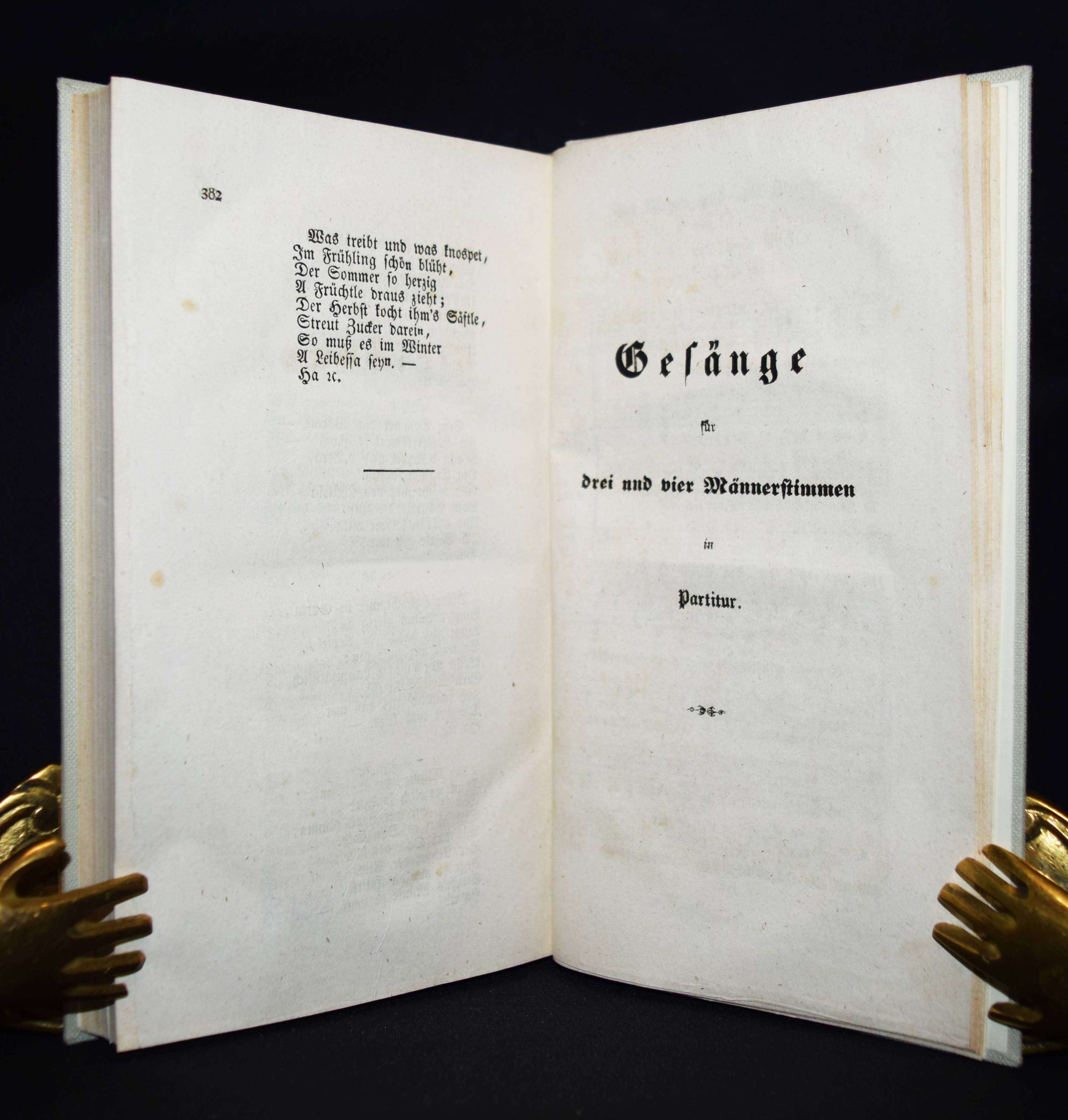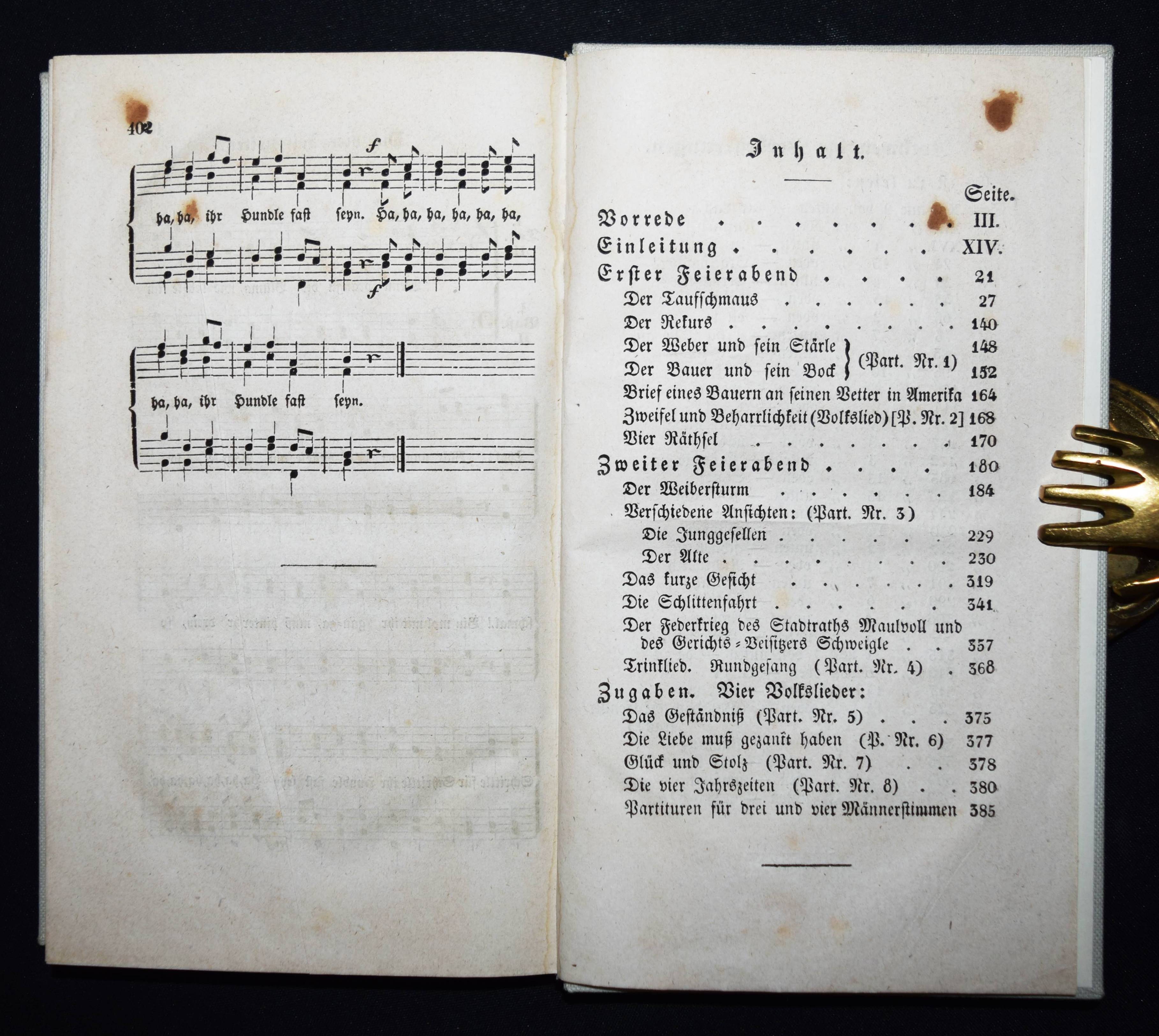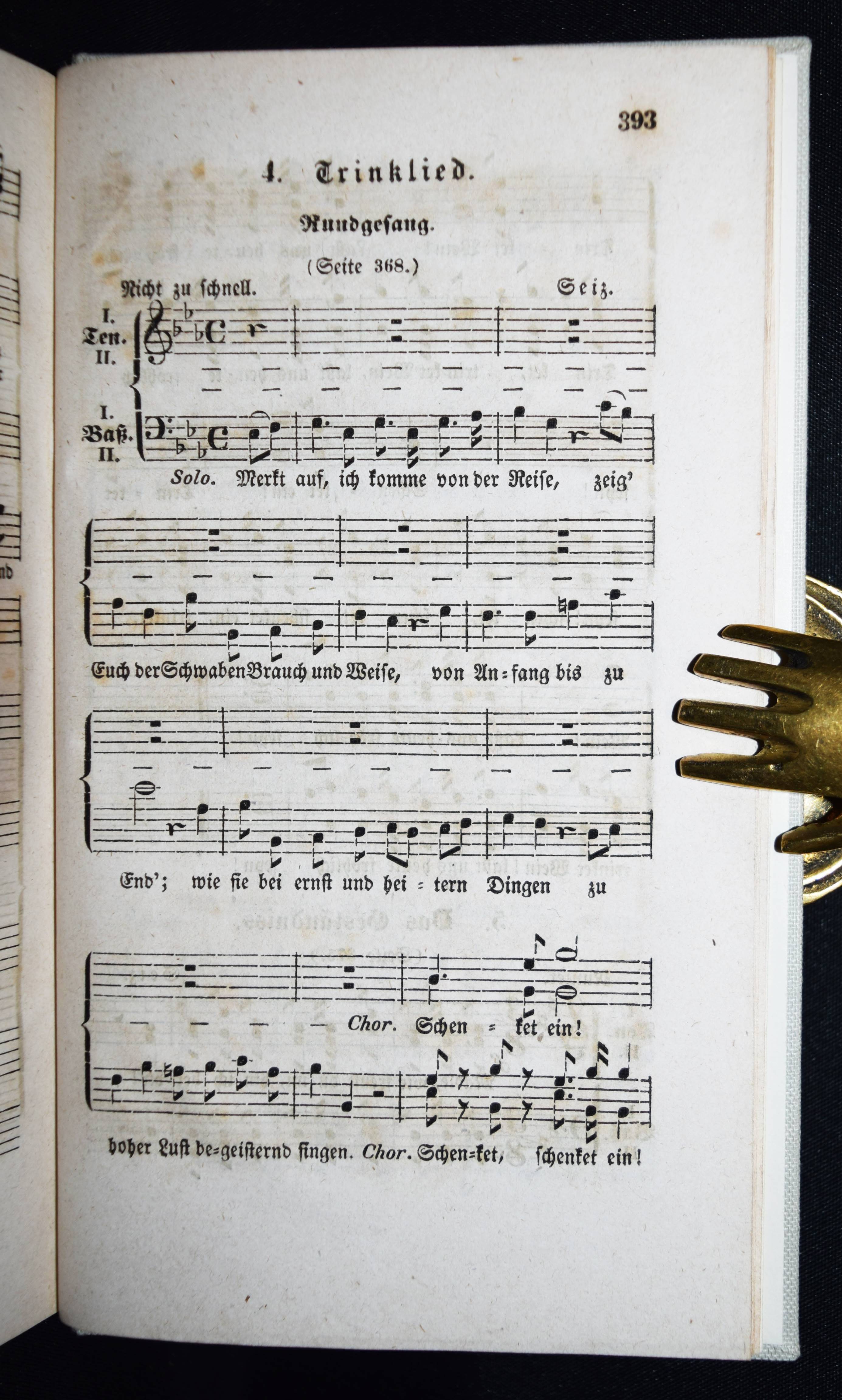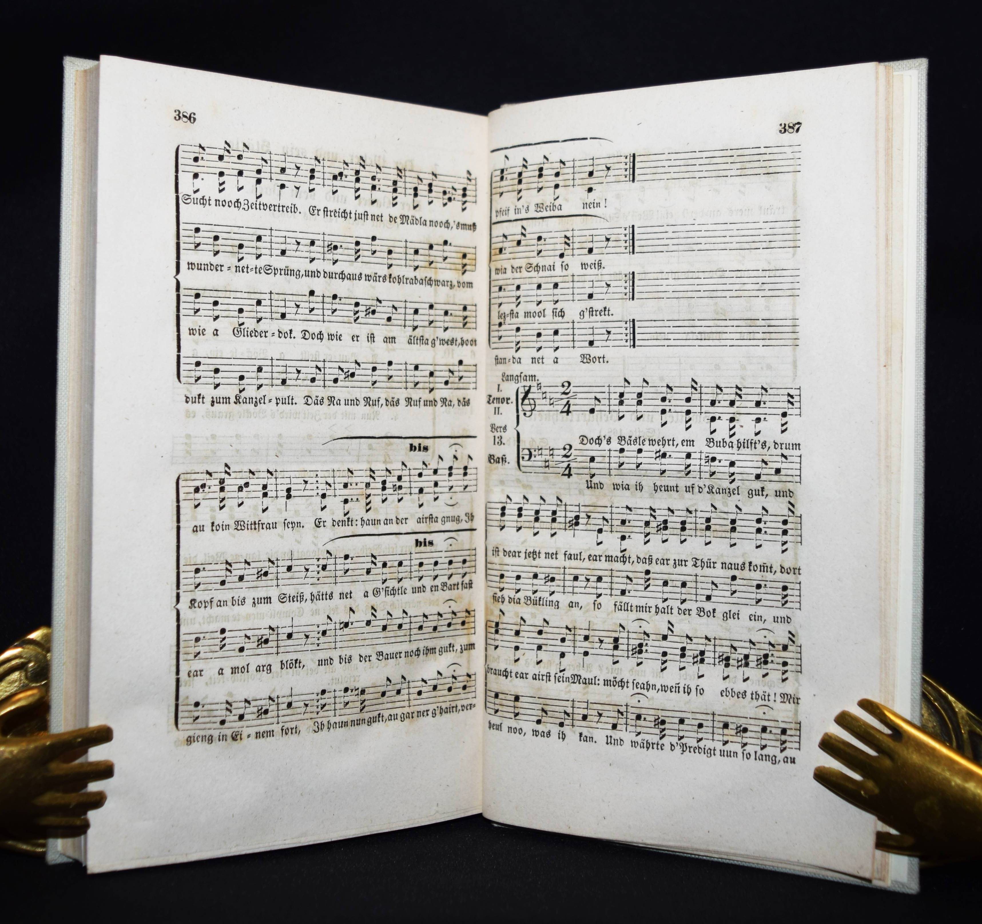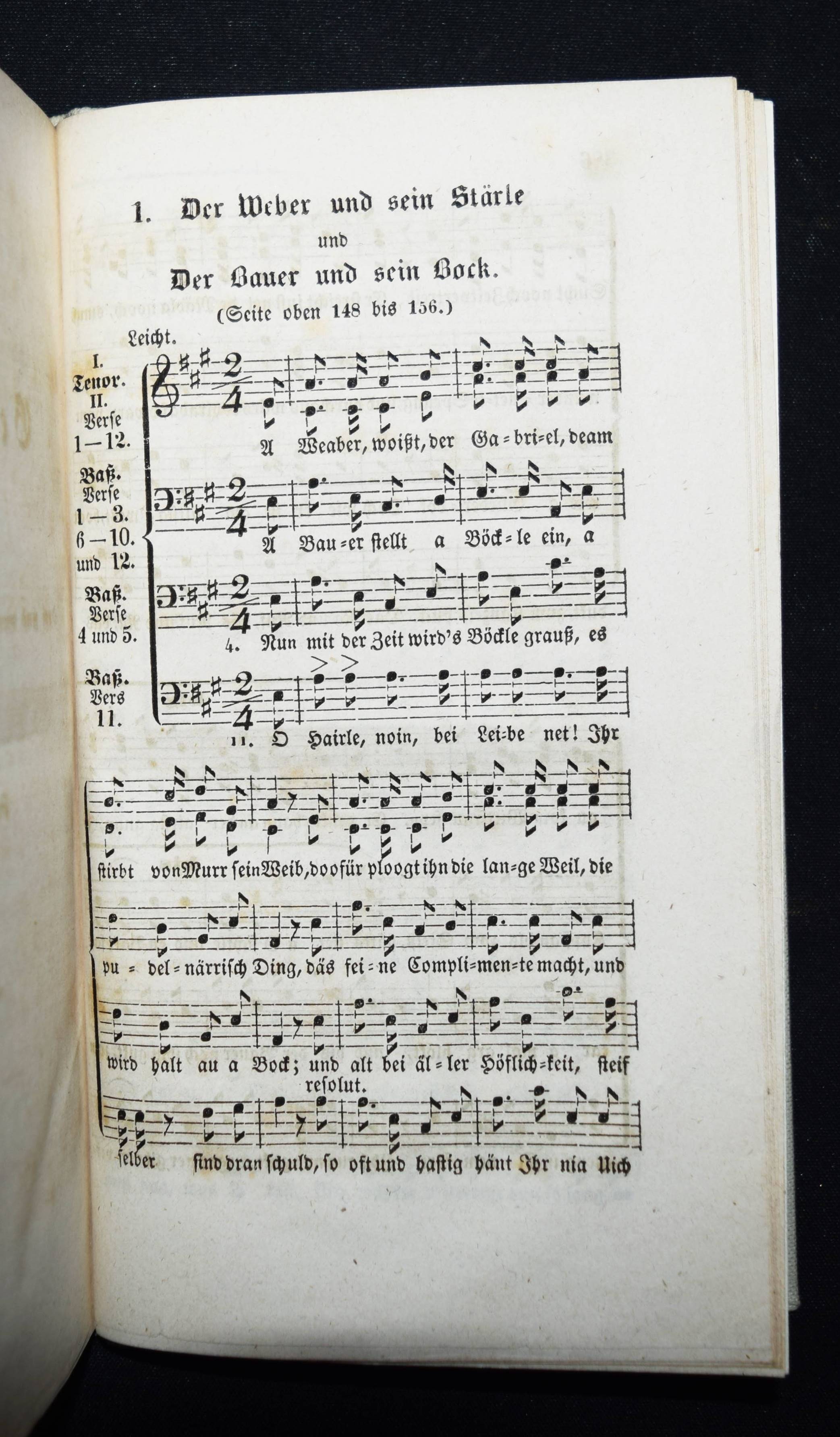 Nefflen, J(ohannes). Der Orgelmacher aus Freudenthal in seiner guten Kameradschaft mit dem Vetter aus Schwaben. Mit musikalischen Zugaben. Nördlingen, Beck 1845. Kl.-8°. 402 S., 1 Bl. mit Musiknoten (S.385-402). Moderner Leinenband. Slg. Borst 2173. Holder 120. Kosch III, 1851. Krauß II, 310. – Seltene erste Ausgabe. – Hauptwerk der schwäbischen Mundartdichtung. – „Nefflen war ohne Zweifel die bekannteste und einflußreichste Persönlichkeit im Kreise der politischen Dialektschriftsteller unserer Heimat, als leibhaftiger Vetter aus Schwaben gleichsam der Typus jener gärenden Zeit, auch im Gebrauch der Mundart im besten Sinn der Mann des Volkes“ (Holder 114). Vorliegende erste Auflage enthält im Anhang 8 Lieder für drei und vier Männerstimmen in Partitur. – Einband fachgerecht erneuert, stellenweise etwas braunfleckig, gutes Exemplar aus der Bibliothek von Wilhelm Nefflen, Enkel des Verfassers, mit dessen Namenszug auf dem Titelblatt.