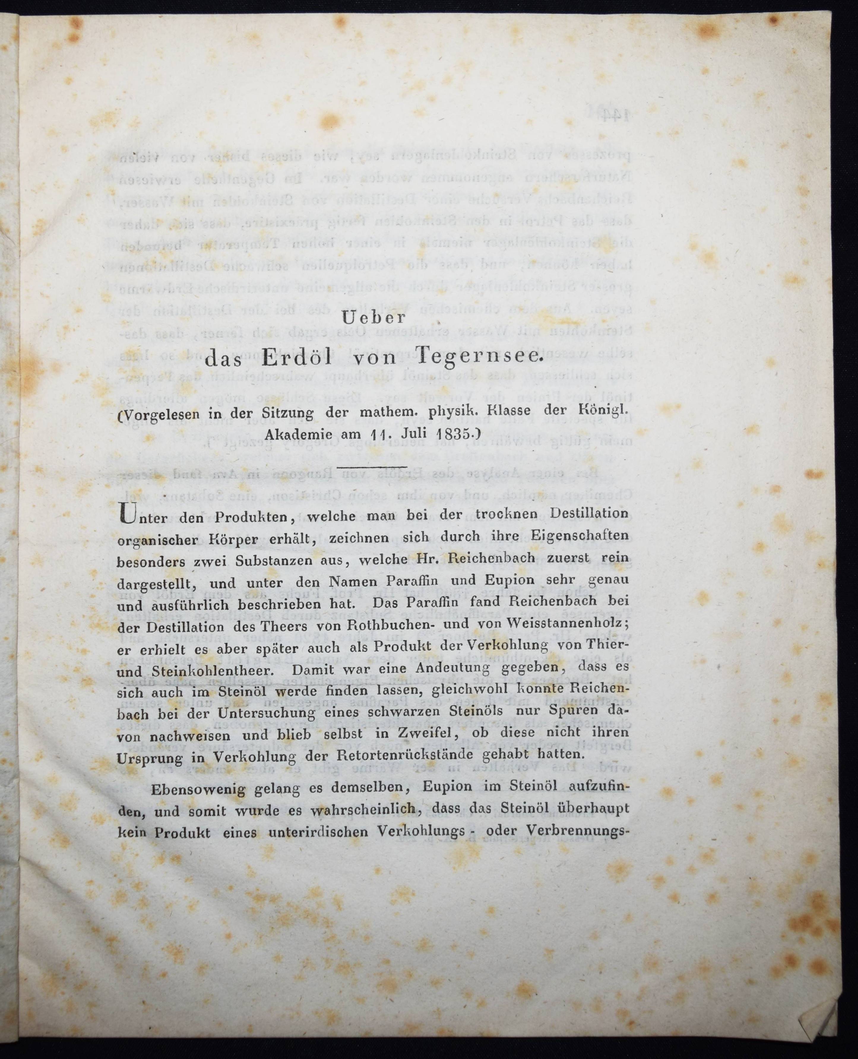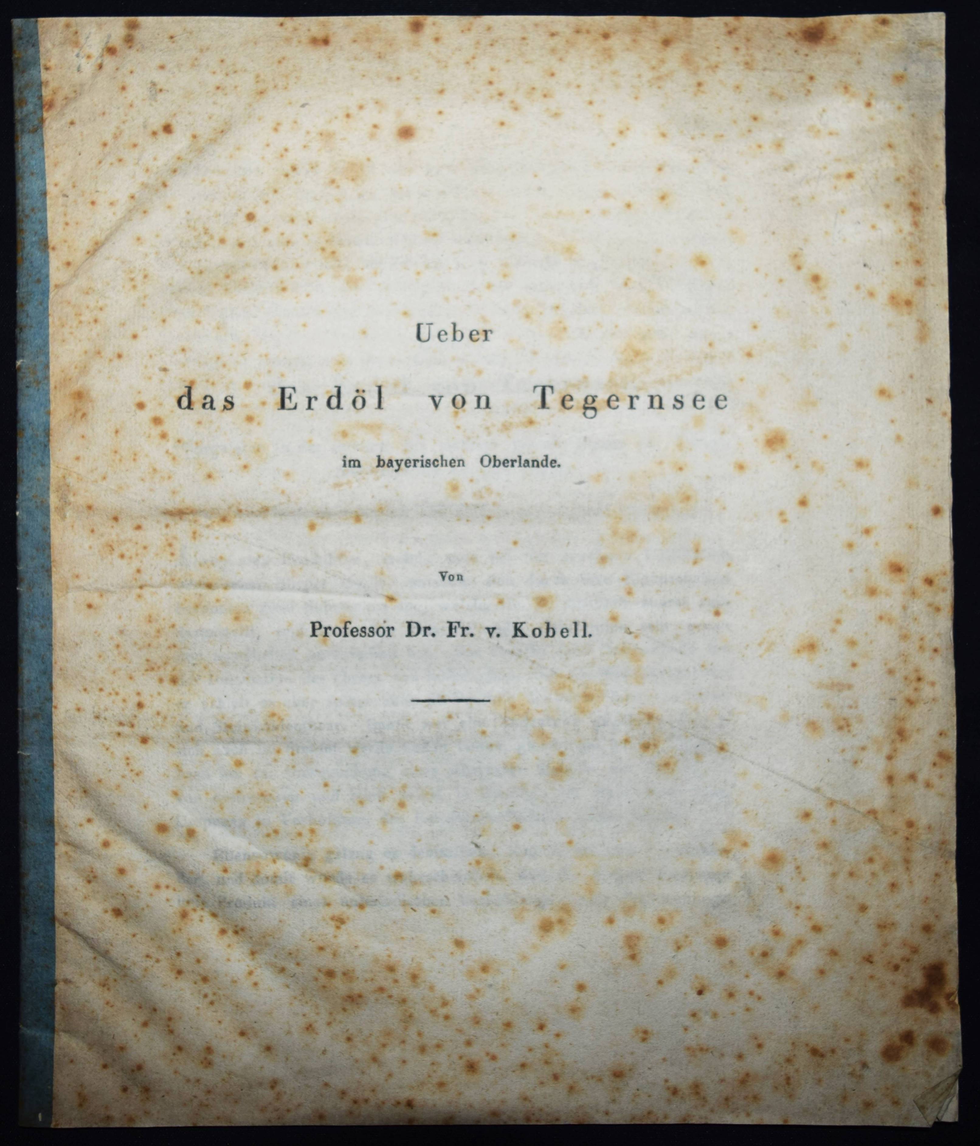 Kobell, Franz Ritter v. Über das Erdöl von Tegernsee im bayerischen Oberlande. München, Bayerischen Akademie der Wissenschaften (1837). 4°. S. [141] – 162. Heftstreifen. (Abhandlungen der Bayerischen Akademie der Wissenschaften, Mathematisch-Physikalische Klasse 2,2). Poggend. I, 1286. – Äußerst seltene Arbeit des berühmten bayr. Geologen, Mundartdichters und Volksschriftstellers F. v. Kobell (1803-1882). – „Auf der Basis gründlicher chemischer Untersuchungen veröffentlichte K. 1830/31 eine „Charakteristik der Mineralien“ (2 Bände), 1833 folgten „Tafeln zur Bestimmung der Mineralien mittels chemischer Versuche“ (bis 1901 14 Auflagen; englische, französische, russische, italienische, spanische, holländische und ungarische Übersetzungen). Daneben erschienen zahlreiche Spezialarbeiten, die ihn rasch zu einem der führenden Mineralogen seiner Zeit machten; er entdeckte zahlreiche Gesteinsarten und erarbeitete für viele Arten genauere Definitionen. 1838 erschien sein Lehrbuch „Grundzüge der Mineralogie“, in dem er sich bemühte, das Thema „auf eine einfache und möglichst populäre Weise darzustellen“. 1847 veröffentlichte er als Zusammenfassung seiner bisherigen Forschungen „Die Mineralogie“ (als „Lehrbuch der Mineralogie“ 61899 herausgegeben von K. Oebbeke und E. Weinschenk), 1864 publizierte er eine „Geschichte der Mineralogie“. Alle naturwissenschaftlichen Veröffentlichungen zeigen K.s besondere Fähigkeit zur anschaulichen, lebendigen Beschreibung und sein Bemühen, komplizierte Zusammenhänge durch klare Darstellung verständlich zu machen. Diesem Anliegen dienten auch Schriften wie „Skizzen aus dem Steinreiche. Geschrieben für die gebildete Gesellschaft“ (1850) oder „Über Pflanzensagen und Pflanzensymbolik“ (1875)“ (K. Pörnbacher in NDB XII, 238 ff.). – Die ersten und letzten Seiten teils stärker braunfleckig, sonst gut erhalten.