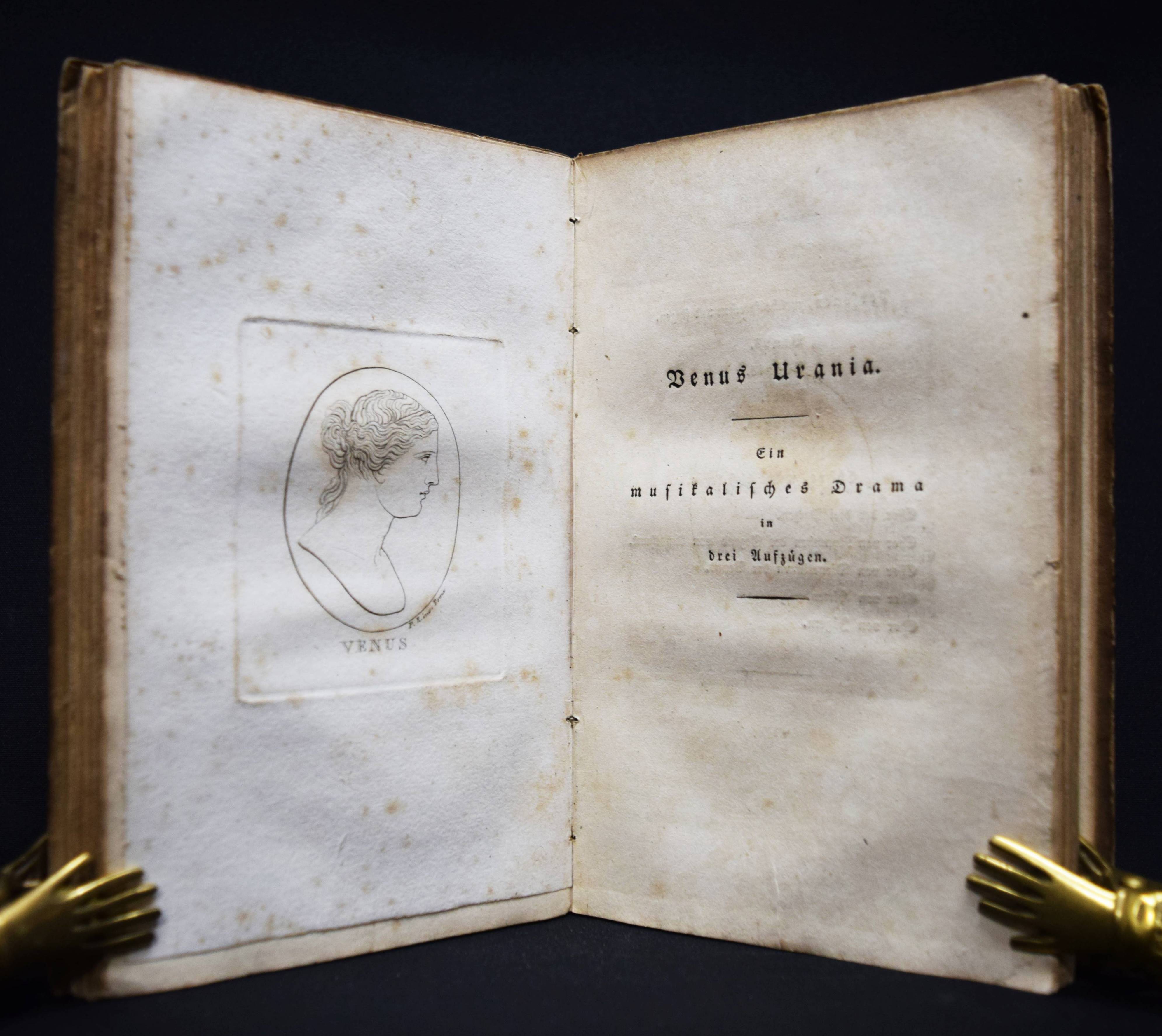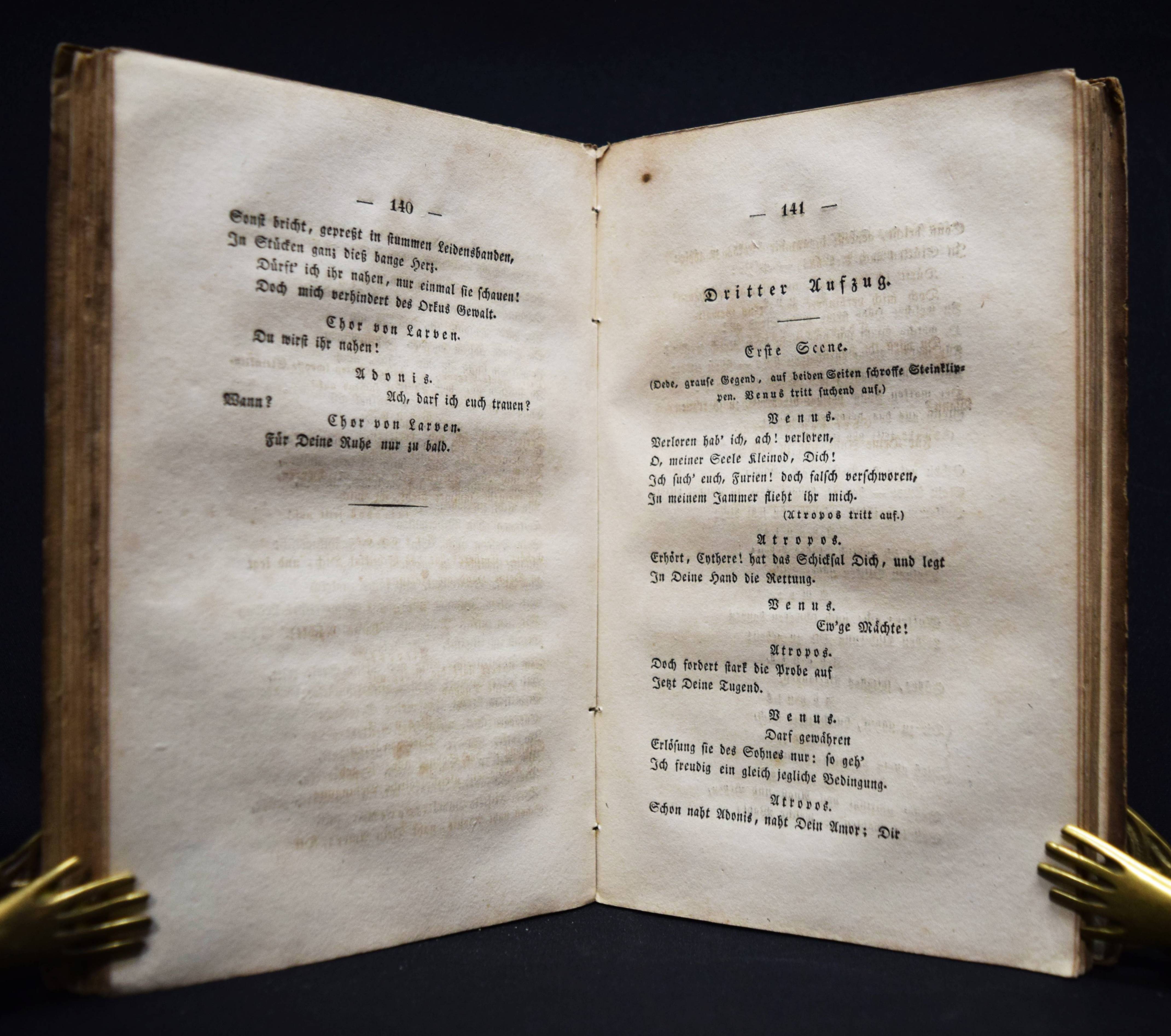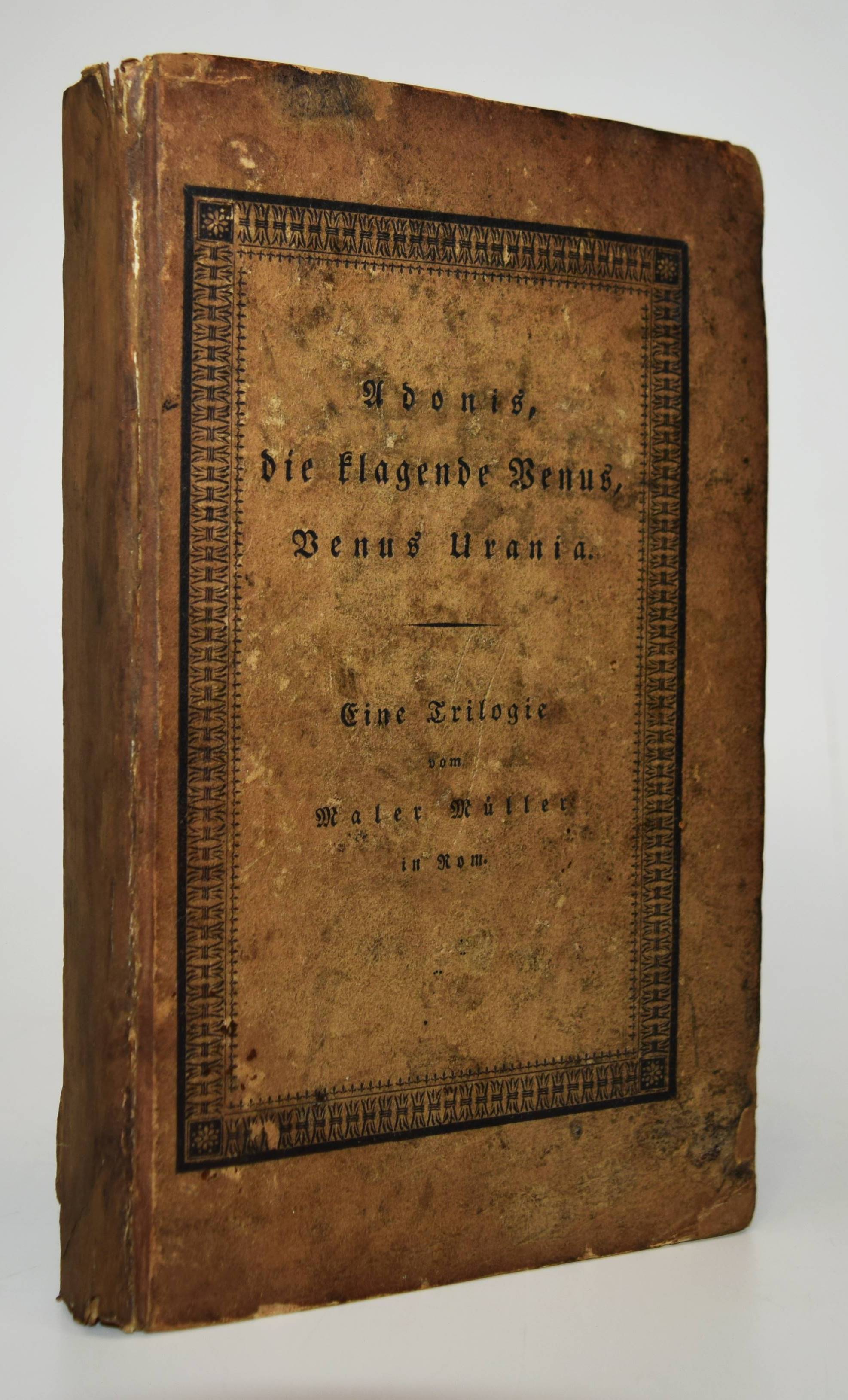 Müller, (Friedrich, genannt) Maler Müller. Adonis, die klagende Venus, Venus Urania. Eine Trilogie. Leipzig, Gerhard Fleischer 1825. 8°. [2] Bl., S. 6 – 288 mit 4 Umriss-Radierungen von F(riedrich) Ruscheweyh nach Müller. Typogr. OPbd. Slg. Borst 1469. Goedeke IV/1, 902, 35. Schulze/Strathaus 236, 14. – Sehr seltene erste Ausgabe. Müller (1749-1825) pflegte Kontakte zu vielen bedeutenden Schriftstellern seiner Zeit, darunter Lessing, Schiller und Wieland. Insbesondere mit Goethe verband ihn zunächst eine Freundschaft mit regem Briefwechsel. Im Jahr 1778 – Müller war inzwischen nach Rom gereist und schickte regelmäßig Bilder nach Weimar, die bei Goethe kein Gefallen fanden – kam es allerdings zum Bruch. Müller versuchte sich in der Gelegenheitslyrik, hatte jedoch nur wenig Erfolg und lebte meist in ärmlichen Verhältnissen. „Bedeutender ist die 1825 erschienene Trilogie Adonis, Die klagende Venus, Venus Urania, schon vor 1785 begonnen und im ersten Theil vor 1811 fertig. Der Adonisstoff hatte Müller früh und oft beschäftigt. Ein opernhaftes Drama mit großen typischen Figuren sollte durch ‚griechischen Geist‘ Goethe’s ‚Iphigenie‘ ausstechen. Aber Müller, der während des langen italienischen Aufenthaltes auch das Gefühl für deutsche Sprachrichtigkeit mehr und mehr einbüßte, brachte es nur zu einem undramatischen, verschwommenen, schwülstigen Wust willkürlicher Mythenumbildung“ (ADB XXII, 530ff). – Rücken erneuert, Deckel stärker angestaubt, stellenweise etwas braunfleckig, gutes Exemplar.
