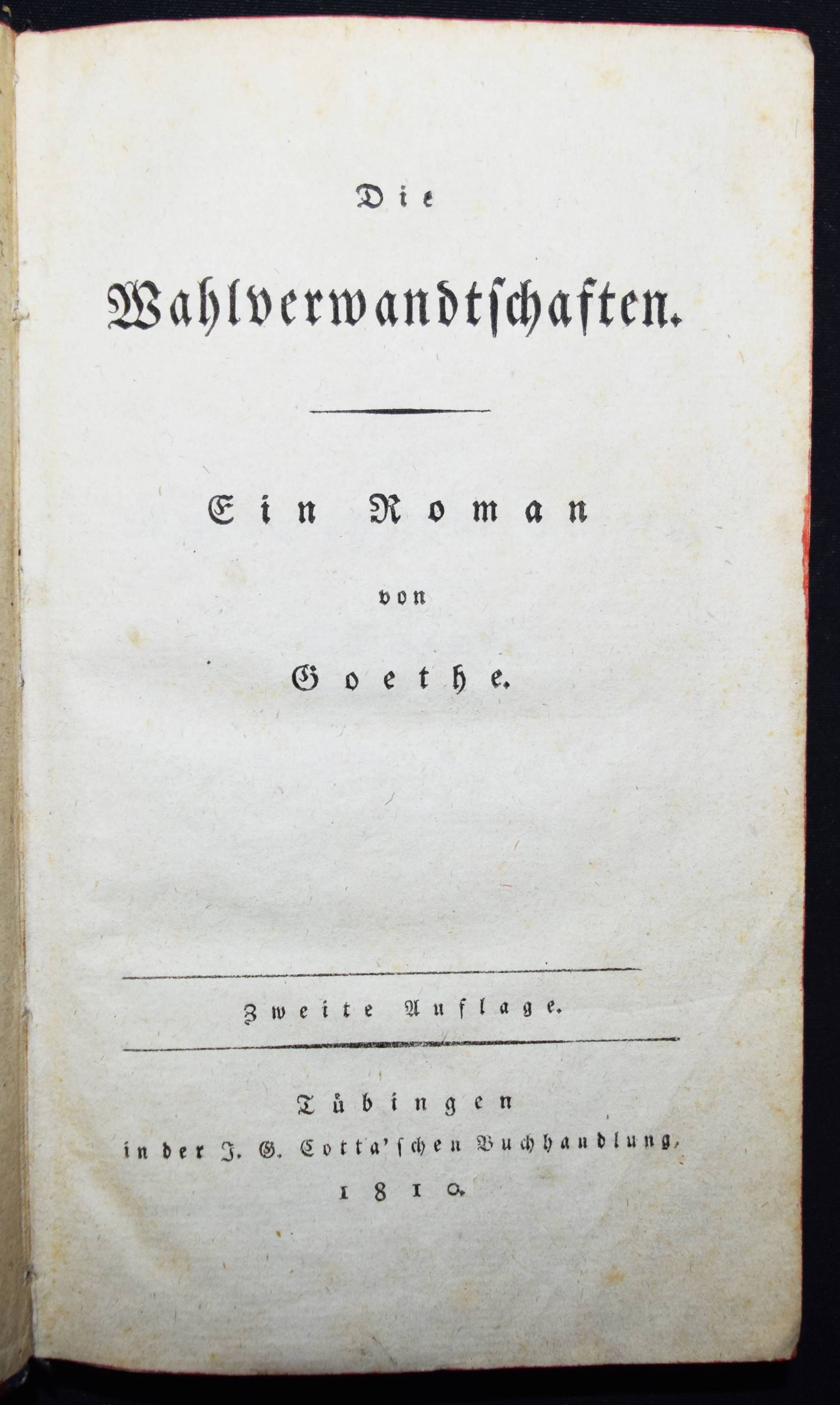 Goethe, Johann Wolfgang v. Die Wahlverwandtschaften. Ein Roman. 2. Auflage. 2 Teile in 1 Band. Stuttgart, J. G. Cotta 1810. 8°. Titel, 414 S. Pbd. d. Zt. (Werke, Band XIII). Slg. Borst 1089. Fischer, Cotta Bibliographie 704. Goedeke IV/3, 388, 181. Hagen 328. Vgl. Kippenberg I, 384. – Titelauflage der ersten Ausgabe von 1809. – Darstellung „sozialer Verhältnisse“ und die symbolische Erfassung ihrer Konflikte. Die Problemstellung des Romans bedeutet aber auch eine Auseinandersetzung mit der Romantik durch die scheinbar unbekümmerte Schilderung stürmischer Diagonalverhältnisse. Goethe plante den Text zunächst als novellistische Einlage für Wilhelm Meisters Wanderjahre. Der Stoff wuchs sich während der Bearbeitung zu einem eigenständigen Roman aus. Der Begriff „Wahlverwandtschaft“ ist der zeitgenössischen Chemie entlehnt und zeigt Goethes in diesen Jahren intensive Betätigung auf naturwissenschaftlichem Gebiet. – Rücken restauriert, Deckel etwas berieben, vorderer freier Vorsatz fehlt, nur vereinzelt minimal braunfleckig, gutes Exemplar.