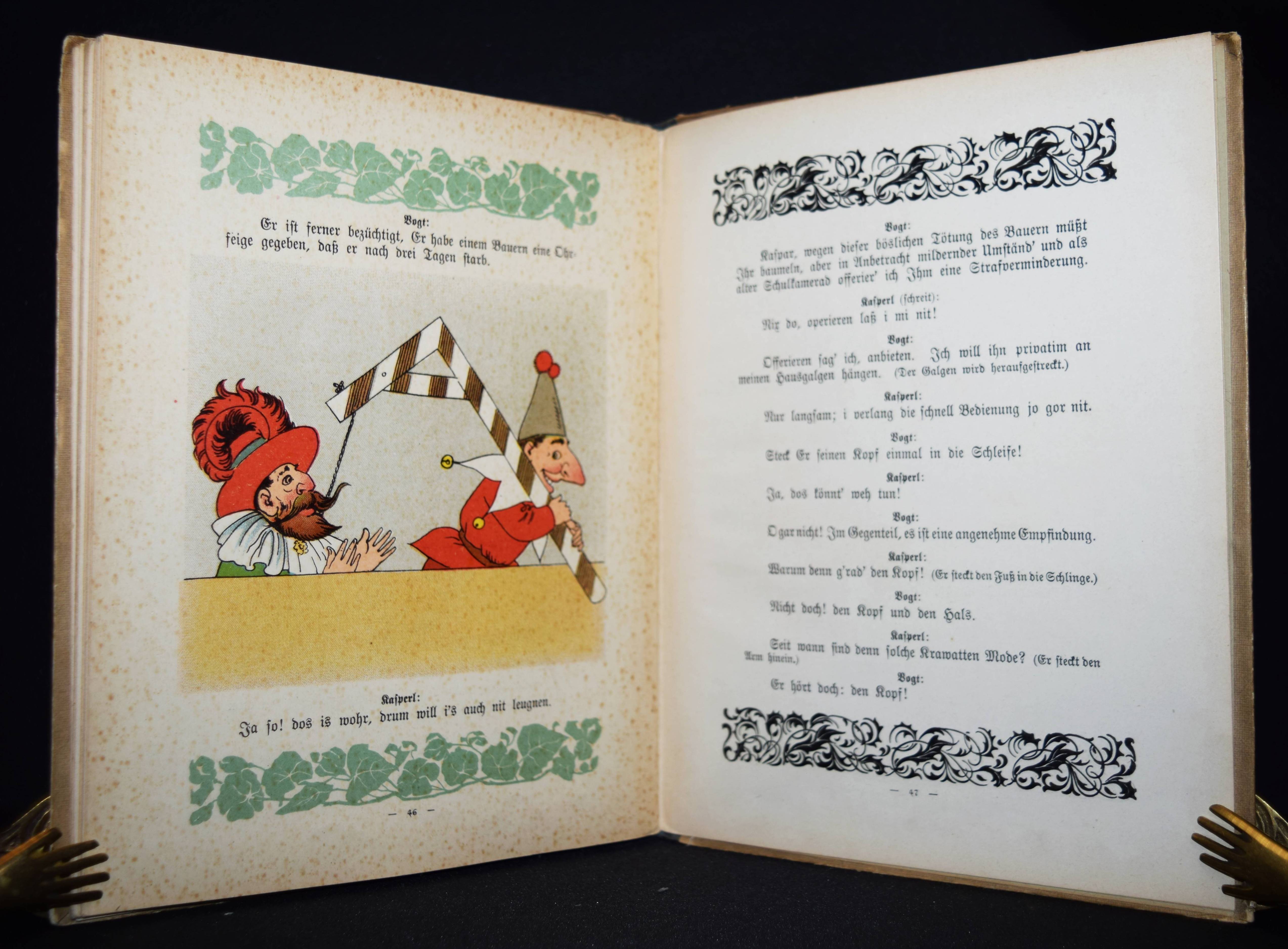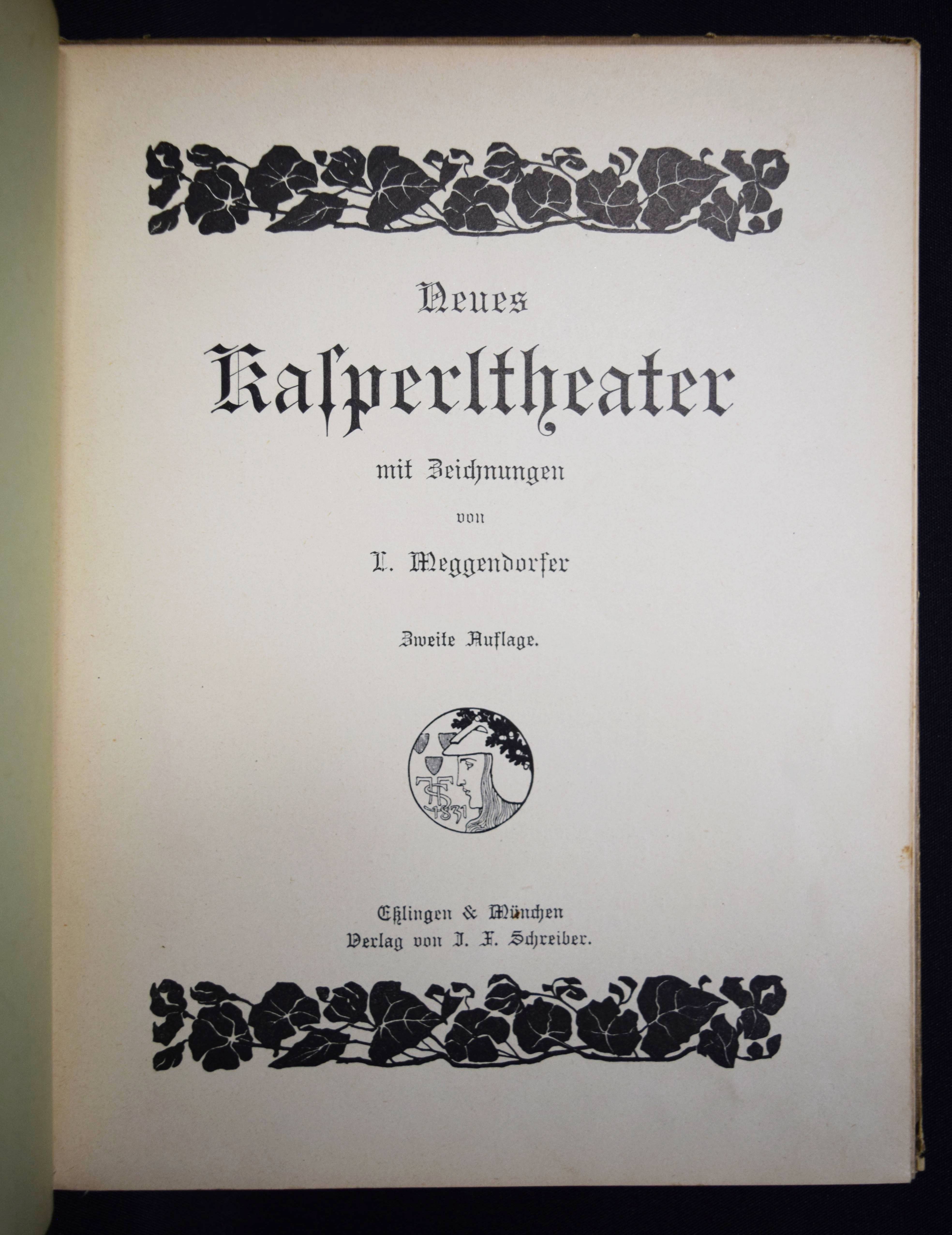 Meggendorfer, Lothar. Neues Kasperltheater. 2. Aufl. Eßlingen, München, Schreiber (ca. 1905). Gr.-8°. 47 S. mit 19 (12 farblithogr.) Illustrationen. Farbig illustr. OPbd. (Verlags-Nr. 288). Slg. Breitschwerdt 130. Katzenheim 259. Krahé 106. Ries 715, 128. (Alle EA von 1904). – „Meggendorfer hatte von Jugend an eine intensive Beziehung zu der Figur des Kasperl, seit er als 11jähriger in der Eröffnung des Schmidschen Marionettentheaters saß, zu dem Franz Pocci das Eröffungsstück geschrieben hatte“ (W. Geisenheyner). – „Wie gebannt folgte er dem teils spaßigen, teils zauberischen Geschehen. Er erlebte den Kasperl als Knappen, der nur Hunger und Durst kennt und nichts von den Idealen eines wahren Helden weiß“ (Krahé S. 48 ausführlich zu Meggendorfers Kasperlfiguren). – Deckel etwas berieben und fleckig, N. a. V., Blattränder teils etwas fingerfleckig, gutes Exemplar.