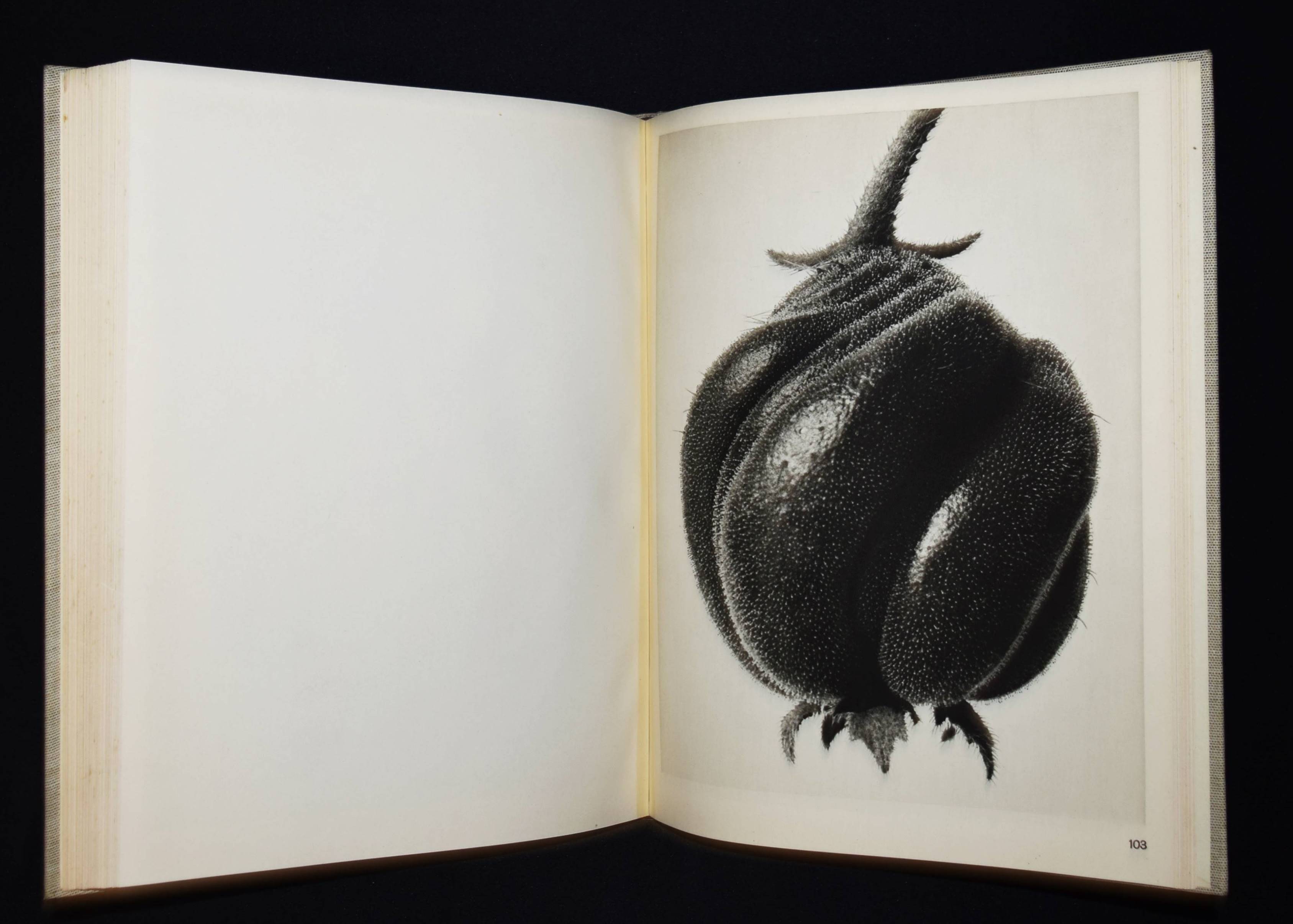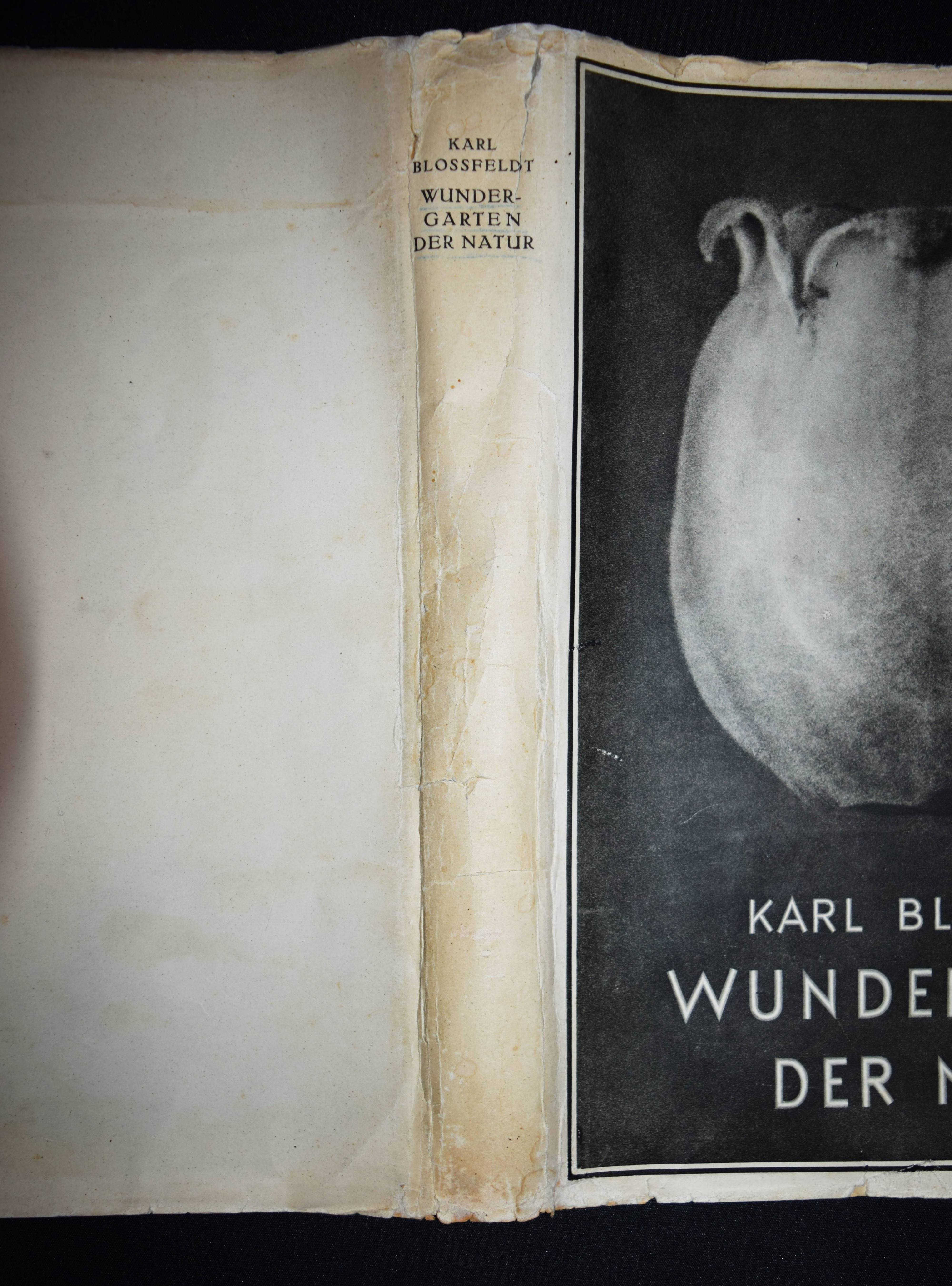 Blossfeldt, Karl. Wundergarten der Natur. Neue Bilddokumentation schöner Pflanzenformen. Berlin, Verlag für Kunstwissenschaft o. J. (1932). 4°. XIII, (3) S. u. 137 Abb. auf 120 num. Bildtafeln in Kupfertiefdruck. Hellgrauer OLn. mit Rücken- u. Deckeltitel u. Deckelvignette (Entwurf: Curt Siebert) u. illustr. Orig.-Schutzumschlag. Heidtmann 14481. Heiting/Jaeger I, 194 ff. (mit mehreren Abb.). The Open Book 106 f. – Erste Ausgabe. – „Dass hier die hohe Qualität des ersten Bandes beibehalten werden konnte, liegt daran, dass trotz des Verlagswechsels erneut die Graphische Anstalt Ganymed in Berlin mit der Druckherstellung beauftragt wurde… Gleich zu Beginn des Abbildungsteils fallen erste Unterschiede zu ‚Urformen der Kunst‘ ins Auge. Die Pflanzen bilden fast immer einen stärkeren Kontrast zum Hintergrund, was daran liegt, dass dieser, im Gegensatz zum vorherrschenden Grau des ersten Bildbandes häufig schwarz oder weiß gehalten ist. Dadurch geraten die Licht-Schatten-Kontraste insgesamt wesentlich eindrücklicher, die Pflanzen wirken folglich noch plastischer… Überhaupt tauchen nur wenige Seiten mit zwei oder drei Fotografien auf… Abgesehen davon, dass diese neue Form der Anordnung sich mehr den botanischen Gegebenheiten anpasst, entspricht sie in ihrer Klarheit und Strenge auch wesentlich deutlicher dem Stil der Neuen Sachlichkeit. Diese Feststellung darf im Übrigen für den gesamten zweiten Bildband gelten“ (B. Hammers in Heiting/Jaeger). – „Blossfeldts Aufnahmen zeigen in starker Vergrösserung pflanzliche Details und organische Formbildungen, die Bezüge zu dekorativen Elementen und ornamentalen Formen der Kunstgeschichte deutlich machen. Diese fotografischen Arbeiten beeinflussten Renger-Patzsch und Finsler“ (R. Mißelbeck S. 25). – Schutzumschlag etwas berieben, leicht angestaubt und am Vorderdeckel mit unauffällig restaurierter Fehlstelle und restaur. Randläsuren, sonst sehr gutes sauberes Exemplar. – First edition. – „The fact that the high quality of the first volume could be maintained here is due to the fact that, despite the change of publisher, the Graphische Anstalt Ganymed in Berlin was again commissioned with the printing… Right at the beginning of the illustration section, the first differences to ‚Urformen der Kunst‘ are noticeable. The plants almost always form a stronger contrast to the background, which is due to the fact that this is often black or white, in contrast to the predominant gray of the first illustrated volume. As a result, the contrasts between light and shadow are much more impressive overall, making the plants appear even more vivid… In fact, there are only a few pages with two or three photographs… Apart from the fact that this new form of arrangement is more in keeping with the botanical conditions, it also corresponds much more clearly to the New Objectivity style in its clarity and austerity. Incidentally, this statement can be applied to the entire second illustrated book“ (B. Hammers in Heiting/Jaeger). – „Blossfeldt’s photographs show highly enlarged plant details and organic formations that make clear references to decorative elements and ornamental forms from art history. These photographic works influenced Renger-Patzsch and Finsler“ (R. Misselbeck p. 25). – Dust jacket somewhat rubbed, slightly dusty and on front cover with inconspicuously restored loss and restor. marginal tears, otherwise very good and clean copy.