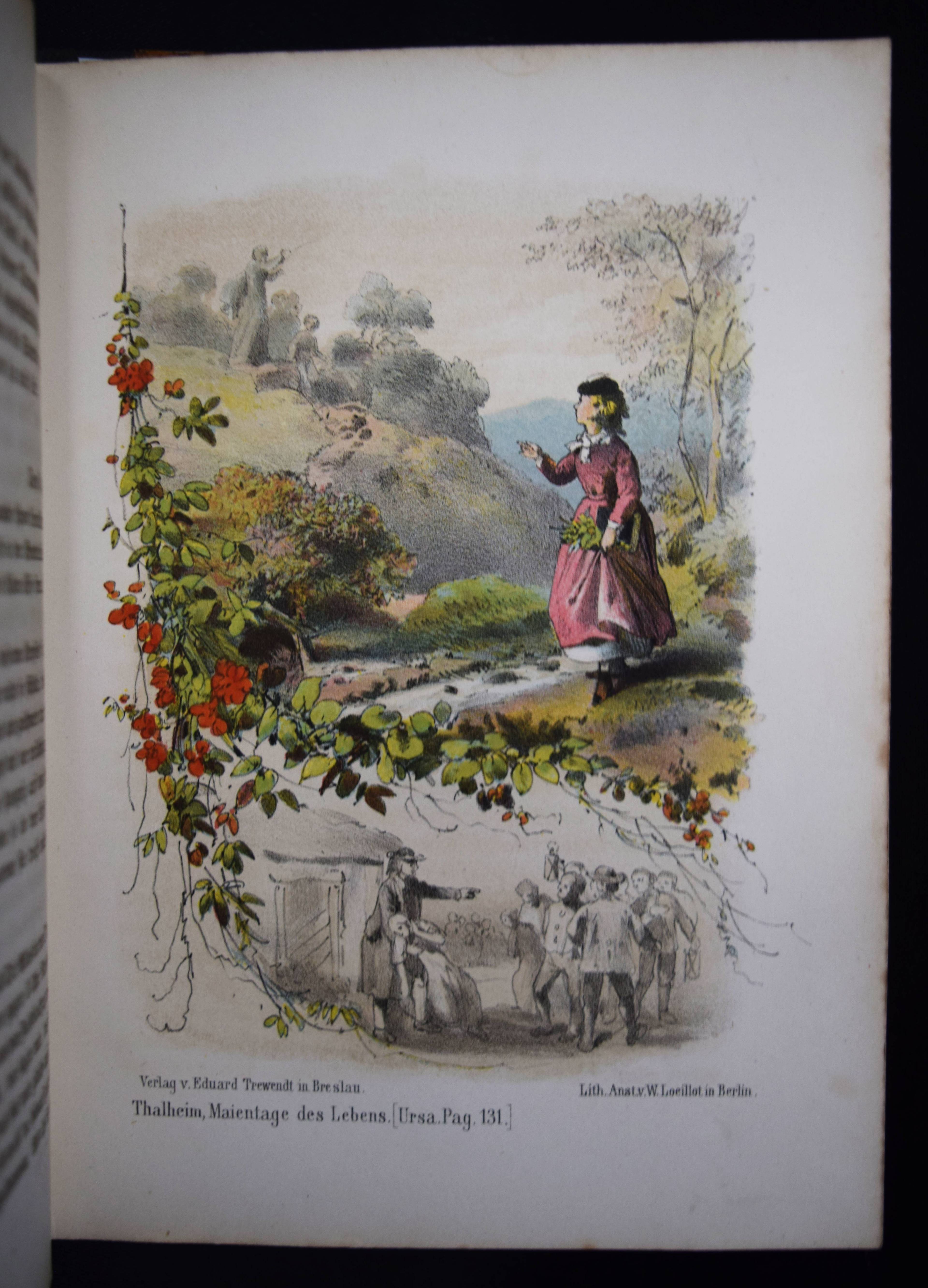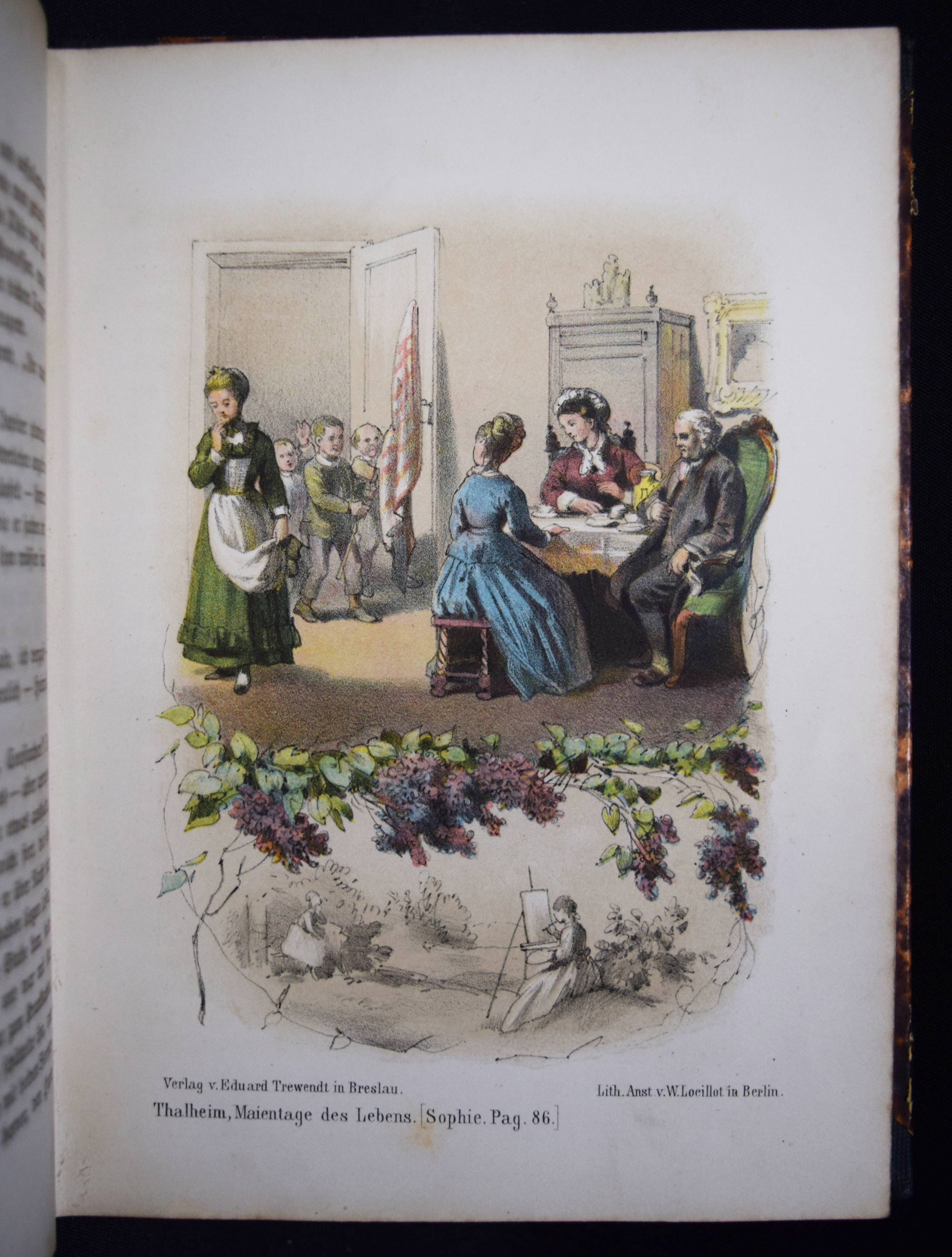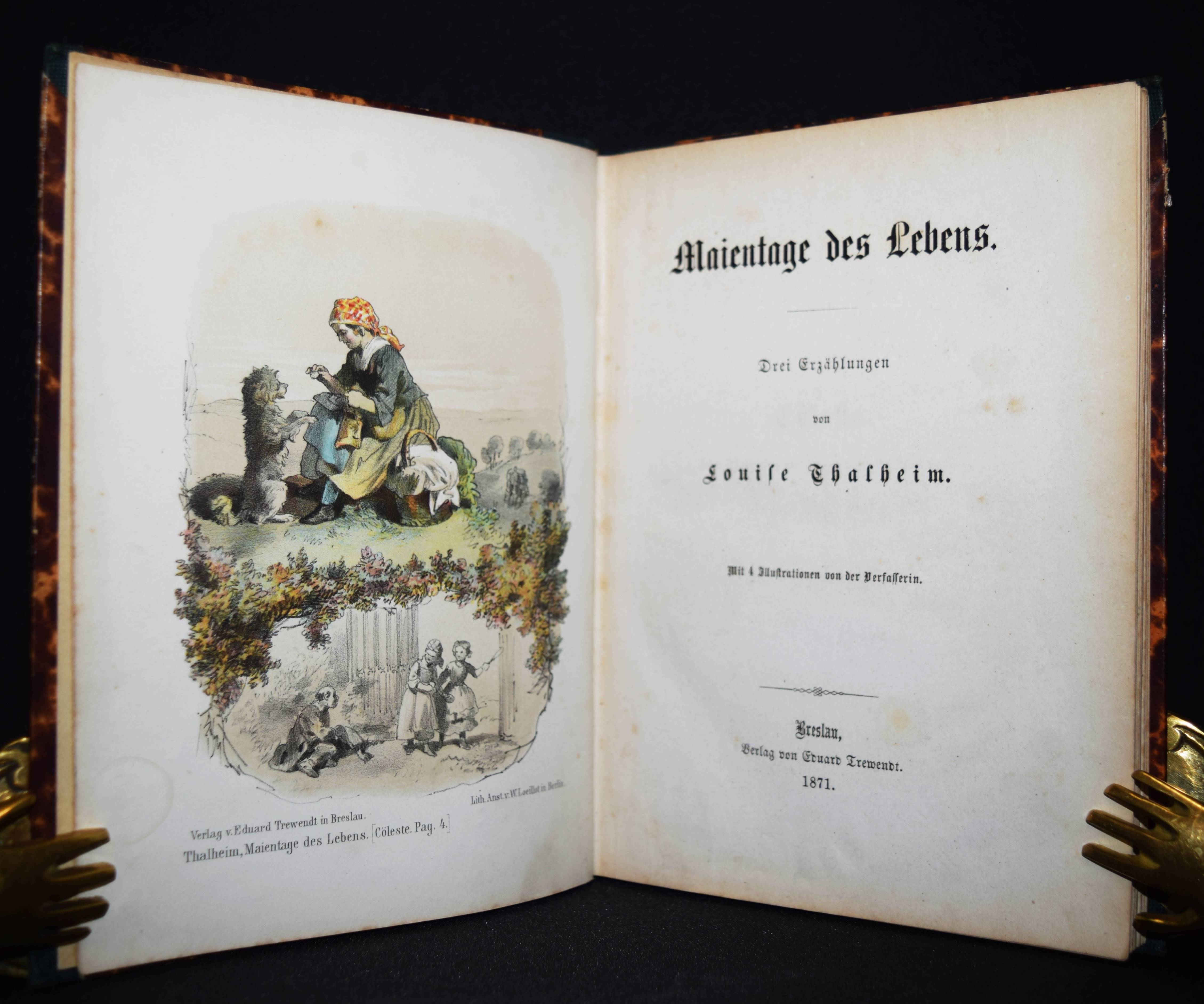 Thalheim, Louise. Maientage des Lebens. Drei Erzählungen. Breslau, Eduard Trewendt 1871. 8°. 151 S. mit 4 lithogr. handkol. Illustrationen der Verfasserin. OHln. mit dekorativer figürlicher Rückenvergoldung. Daube, Katalog Benjamin 174. LKJ III, 526. Ries 920, 3. Semrau, Thalheim 34. Seebaß II, 2036. Wegehaupt II, 3389. – Erste Ausgabe, selten. – Die hübschen Tafeln zeigen jeweils eine größere kolorierte und eine kleinere getönte Darstellung. – „Eine hübsch illustrierte Jungmädchengeschichte” (A. Seebaß). – „Charakteristisch für Thalheims Stil ist die Verbindung eines größeren Hauptbildes mit mehreren kleineren vignettenartigen Bildchen. das Graziöse und Anmutige dieser Komposition und deren zarte und geschmackvolle Kolorierung heben sie aus ähnlichen Illustrationen der Zeit heraus“ (E. Semrau in LKJ). – Nur vereinzelt im Blattrand etwas fingerfleckig, sehr gutes Exemplar im dekorativen Verlagseinband.