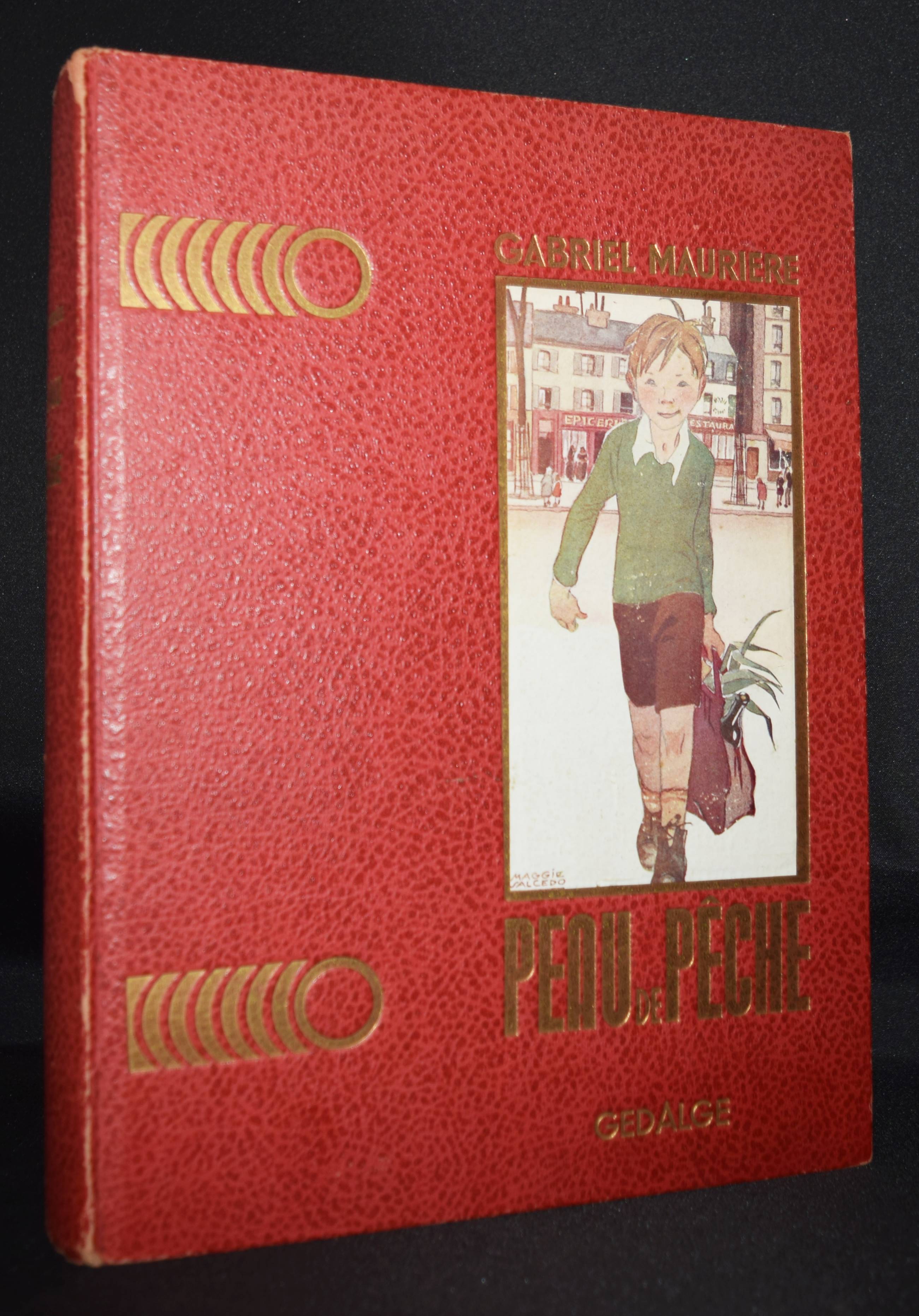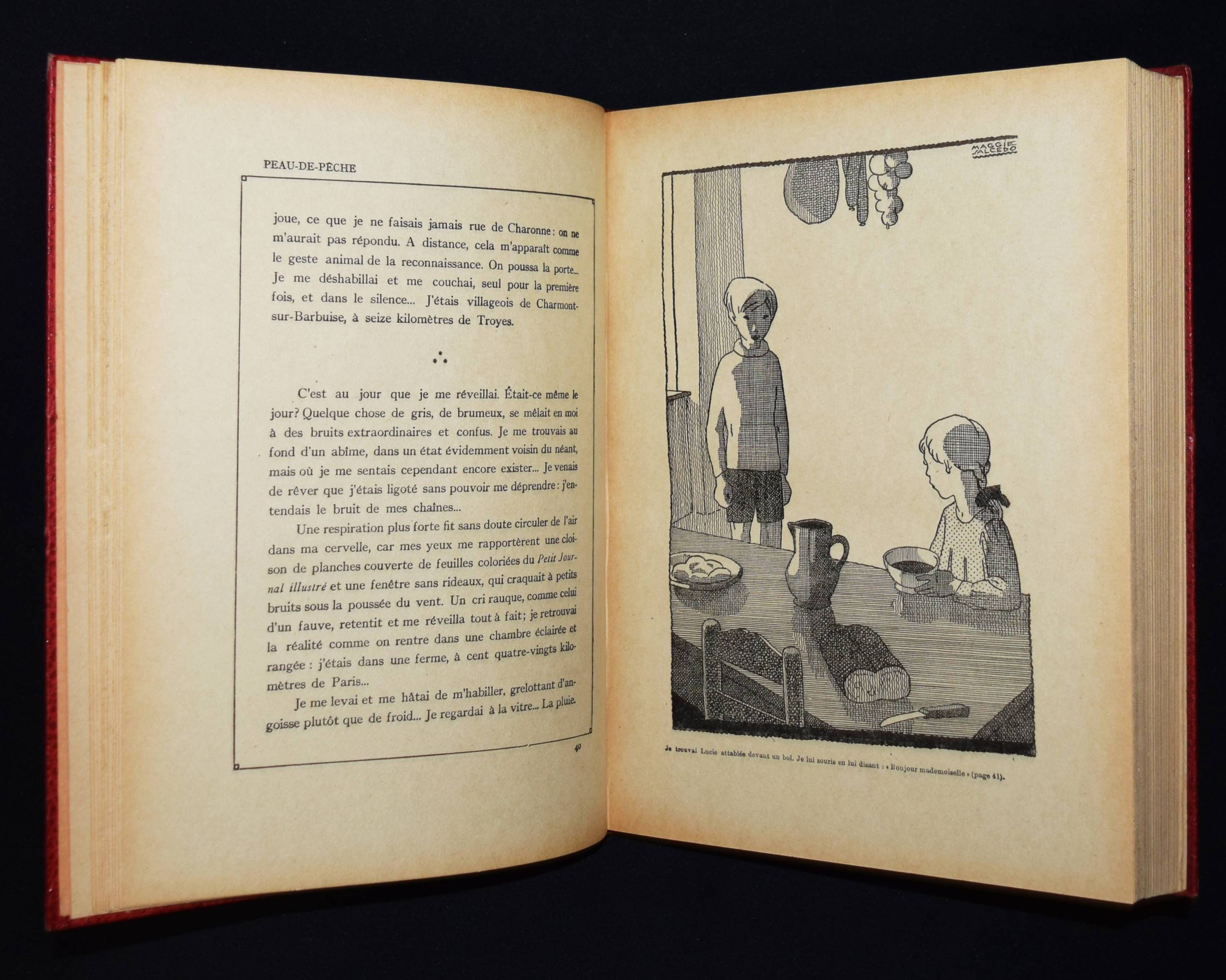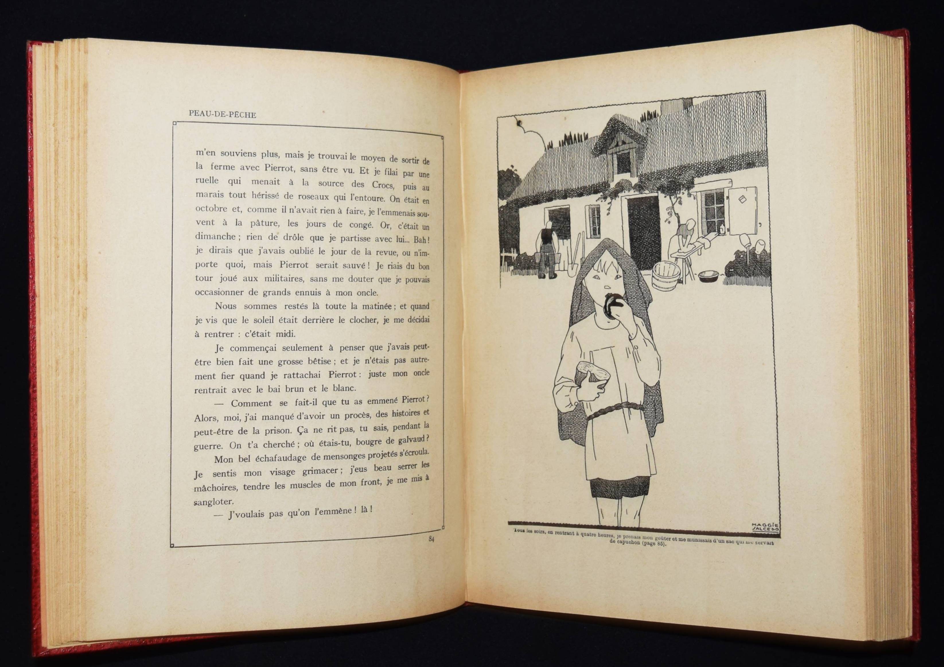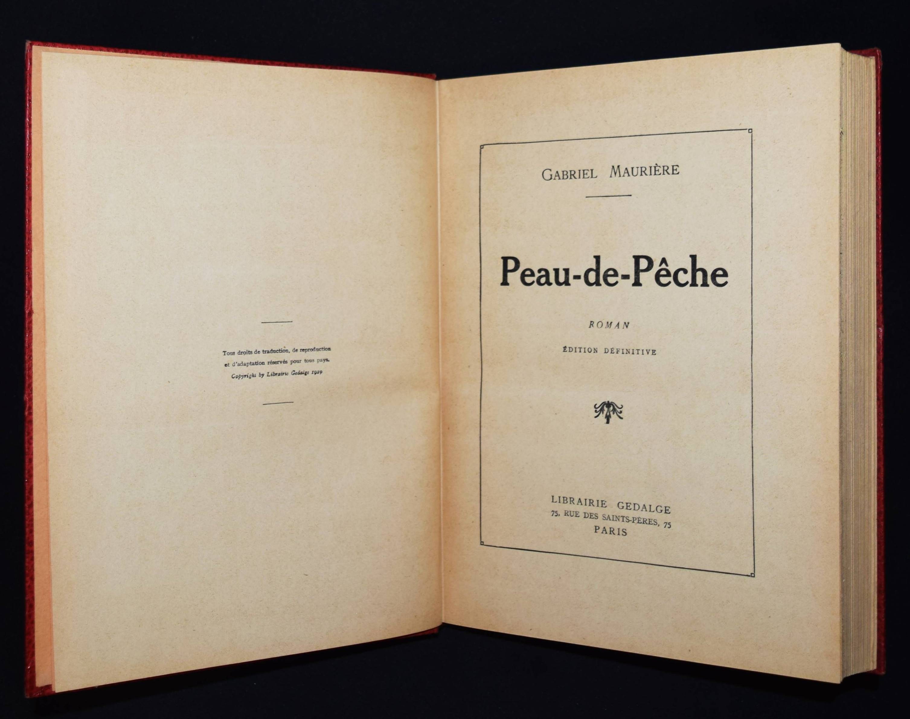 Maurière, Gabriel. Peau-de-pêche. Roman. Èdition définitive. Paris, Librairie Gedalge (1949). 4°. 399, (1) S. mit ganzs. Illustrationen von Maggie Salcedo. OPbd. mit farb. Deckelbild. Schön ausgestattete Ausgabe des bis heute aufgelegten Jugendromans mit Illustrationen der Art-Déco Künstlerin Maggie Salcedo (1890-1959). Die erste Ausgabe erschien 1929 und wurde im selben Jahr auch verfilmt von Jean Benoît-Lévy und Marie Epstein. – „Voici l’histoire très simple d’un jeune enfant. Elevé à Paris dans un milieu où il ne pouvait acquérir que de mauvaises habitudes, il s’en échappe dans de dramatiques circonstances. Recueilli par un de ses oncles, fermier champenois, il prend peu à peu goût aux travaux des champs. La guerre vient brutalement frapper la maisonnée et la mort du fils désespère les pauvres parents qui reportent sur l’enfant adopté le trop plein de leur affection. La vie saine de la campagne et l’amitié désintéressée d’une excellente protectrice développent chez le jeune enfant les bons sentiments qui germaient en lui et en font un brave père de famille. Puisse ce modeste récit donner à chacun de vous le désir d’être, comme les principaux héros de ce livre, de braves gens !“ (zu einer Neuausgabe von 2013). – Papierbedingt etwas gebräunt, gutes Exemplar.