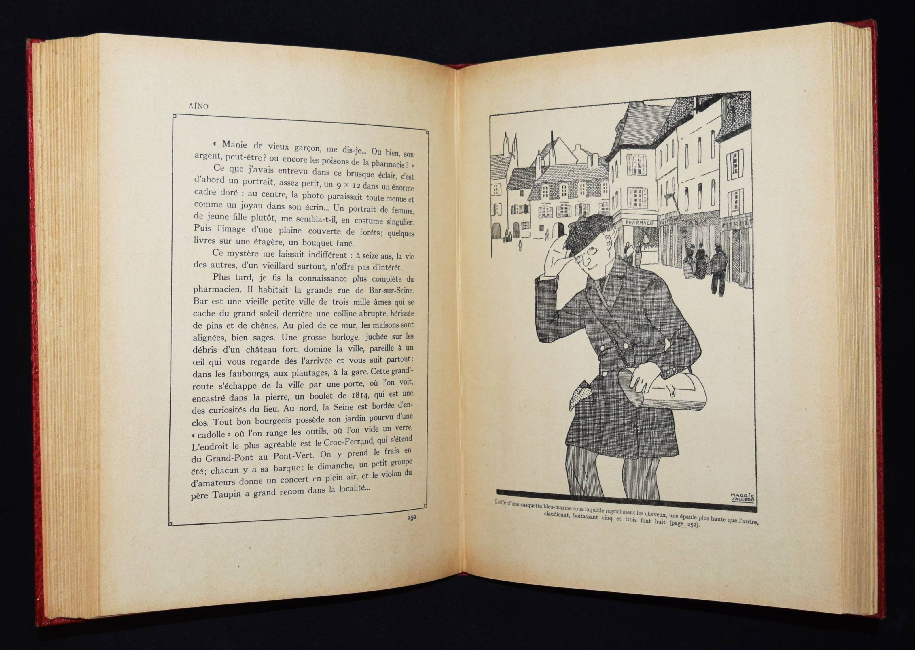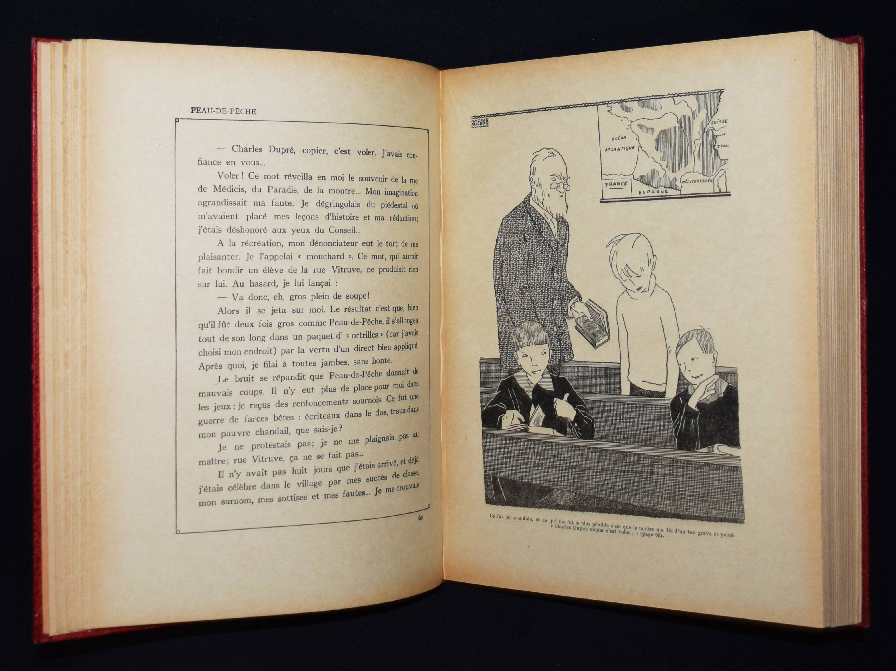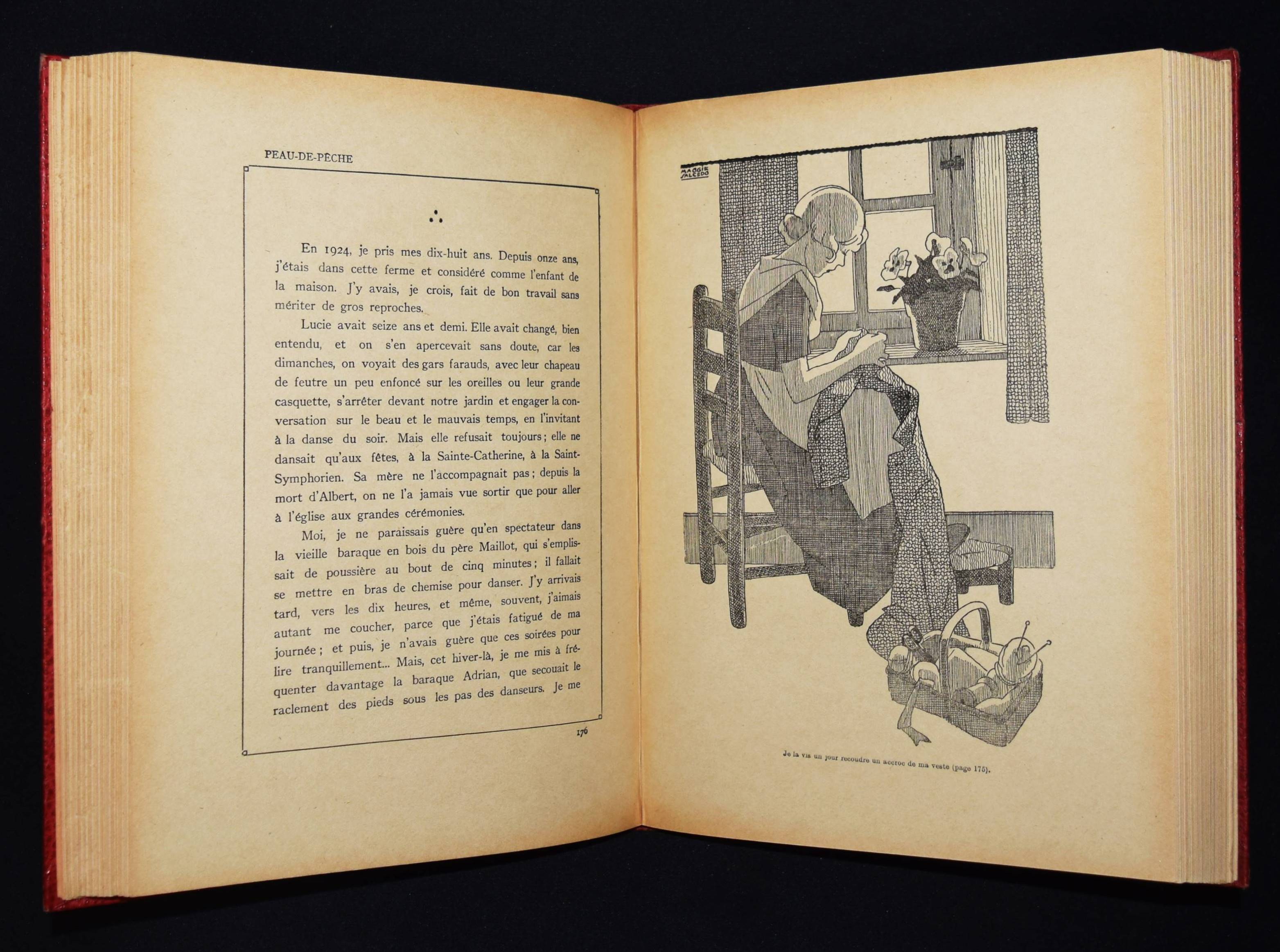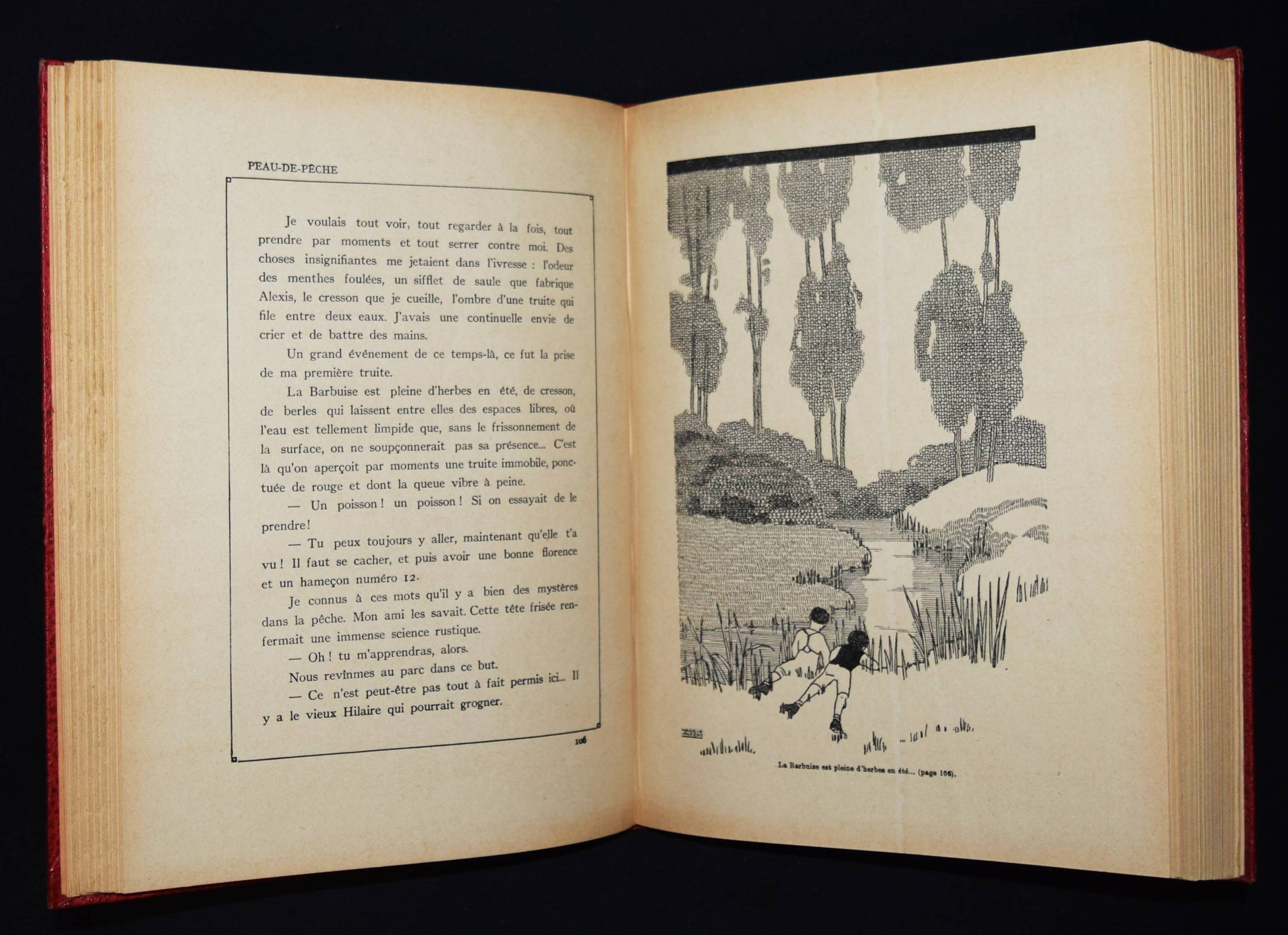 Maurière, Gabriel. Peau-de-pêche. Roman. Èdition définitive. Paris, Librairie Gedalge (1949). 4°. 399, (1) S. mit ganzs. Illustrationen von Maggie Salcedo. OPbd. mit farb. Deckelbild. Schön ausgestattete Ausgabe des bis heute aufgelegten Jugendromans mit Illustrationen der Art-Déco Künstlerin Maggie Salcedo (1890-1959). Die erste Ausgabe erschien 1929 und wurde im selben Jahr auch verfilmt von Jean Benoît-Lévy und Marie Epstein. – „Voici l’histoire très simple d’un jeune enfant. Elevé à Paris dans un milieu où il ne pouvait acquérir que de mauvaises habitudes, il s’en échappe dans de dramatiques circonstances. Recueilli par un de ses oncles, fermier champenois, il prend peu à peu goût aux travaux des champs. La guerre vient brutalement frapper la maisonnée et la mort du fils désespère les pauvres parents qui reportent sur l’enfant adopté le trop plein de leur affection. La vie saine de la campagne et l’amitié désintéressée d’une excellente protectrice développent chez le jeune enfant les bons sentiments qui germaient en lui et en font un brave père de famille. Puisse ce modeste récit donner à chacun de vous le désir d’être, comme les principaux héros de ce livre, de braves gens !“ (zu einer Neuausgabe von 2013). – Papierbedingt etwas gebräunt, gutes Exemplar.
