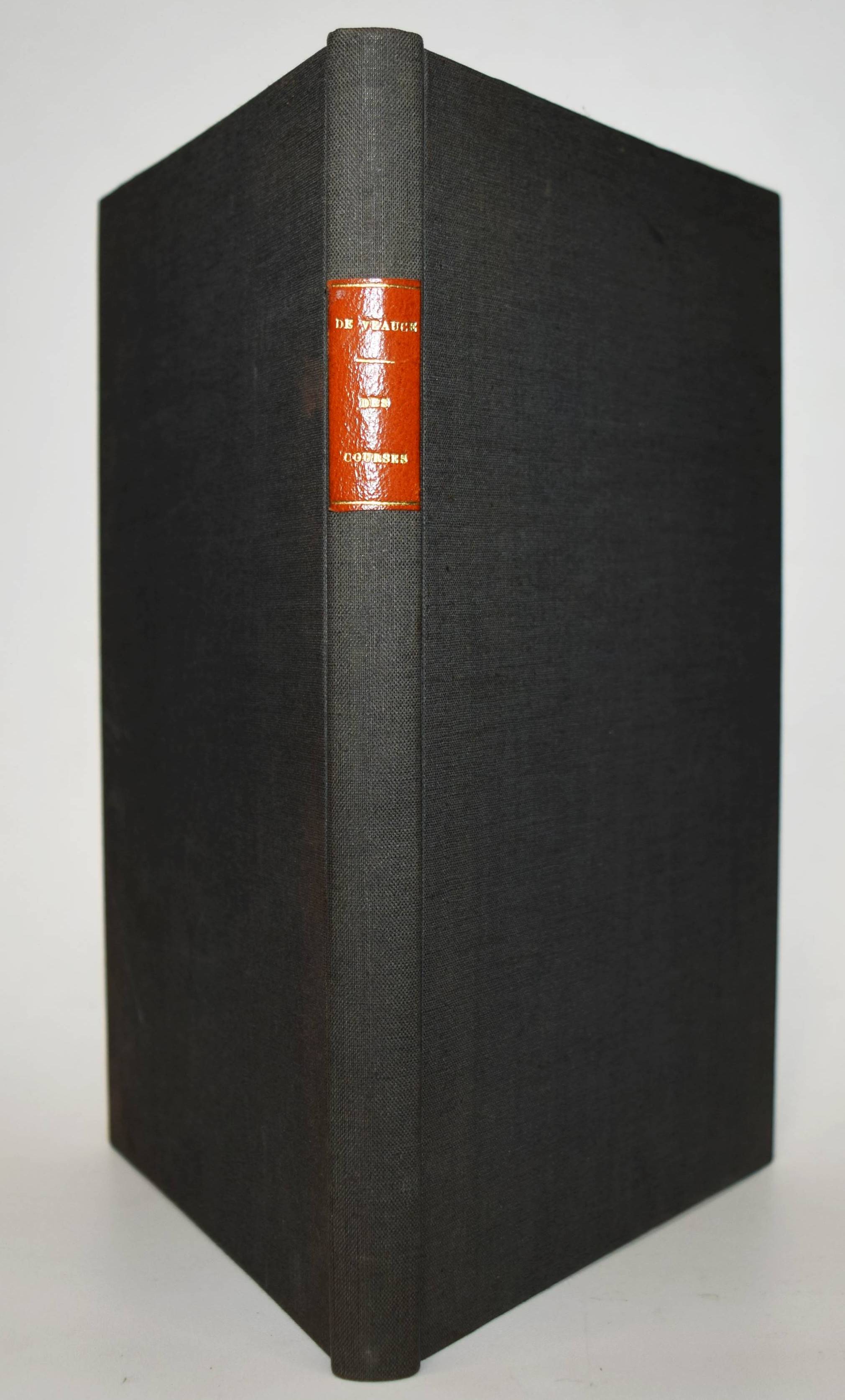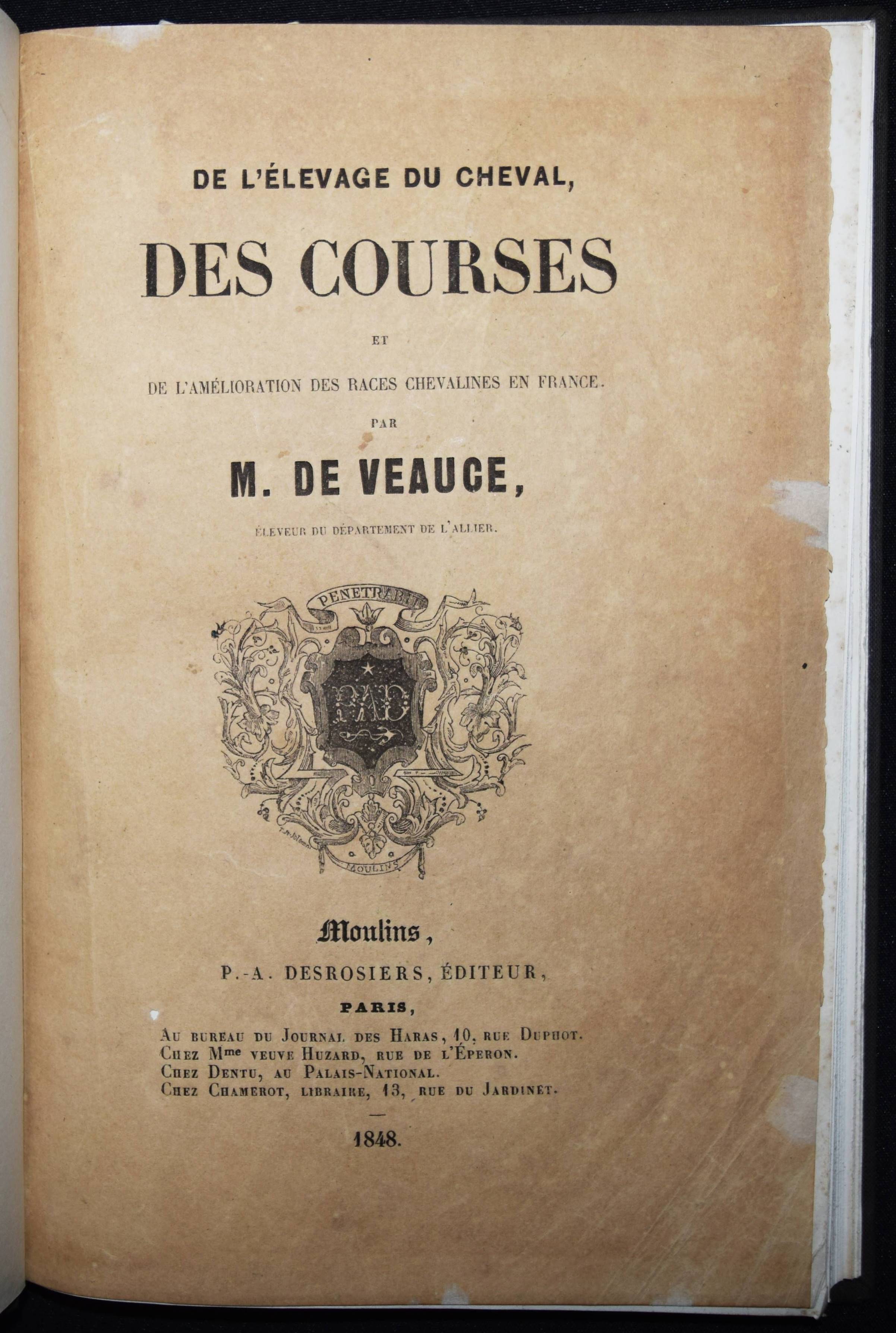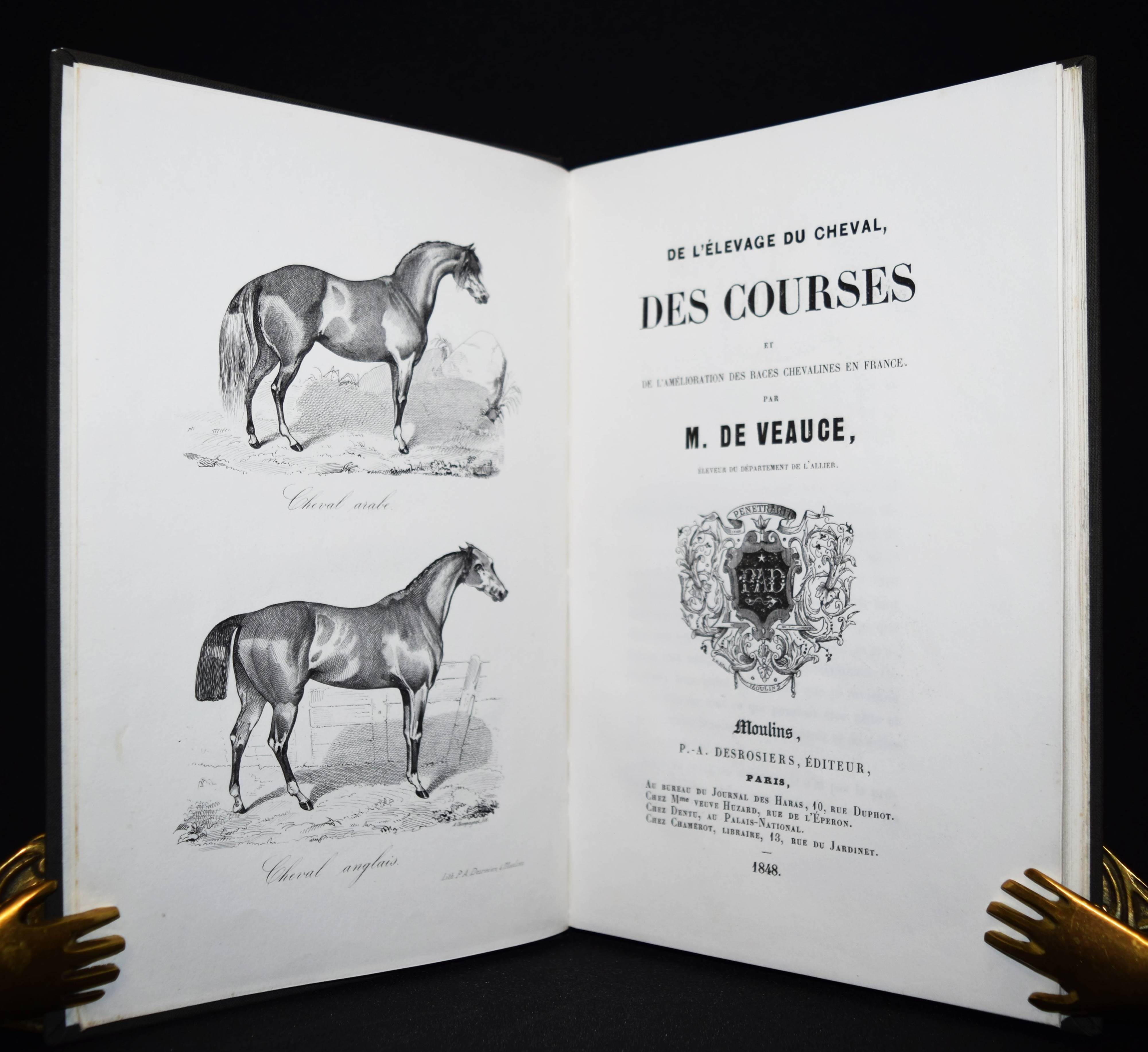 Veauce, (Charles Eugène) de (Cadier). De l’élevage du cheval, des courses et de l’amélioration des races chevalines en France. Moulins, Paris, P.-A. Desrosiers u. a. 1848. Gr.-8°. Titel, 118 S., [1] Bl. mit lithogr. Frontispiz und 2 lithogr. Grundrisse. Moderner Ln. mit goldgepr. Rückenschild (Orig.-Umschlag beigebunden). Erste Ausgabe. – Das Frontispiz zeigt zwei Rennpferde (″Cheval arabe“ u. „Cheval anglais“) die beiden Tafeln Gebäude mit Reitplätzen. – Charles-Eugène Amable de Cadier de Veauce (1868-1934) war Teilnehmer der Olympischen Sommerspiele (Jeux olympiques d’été) 1900 in Paris. – Sehr gutes sauberes Exemplar.