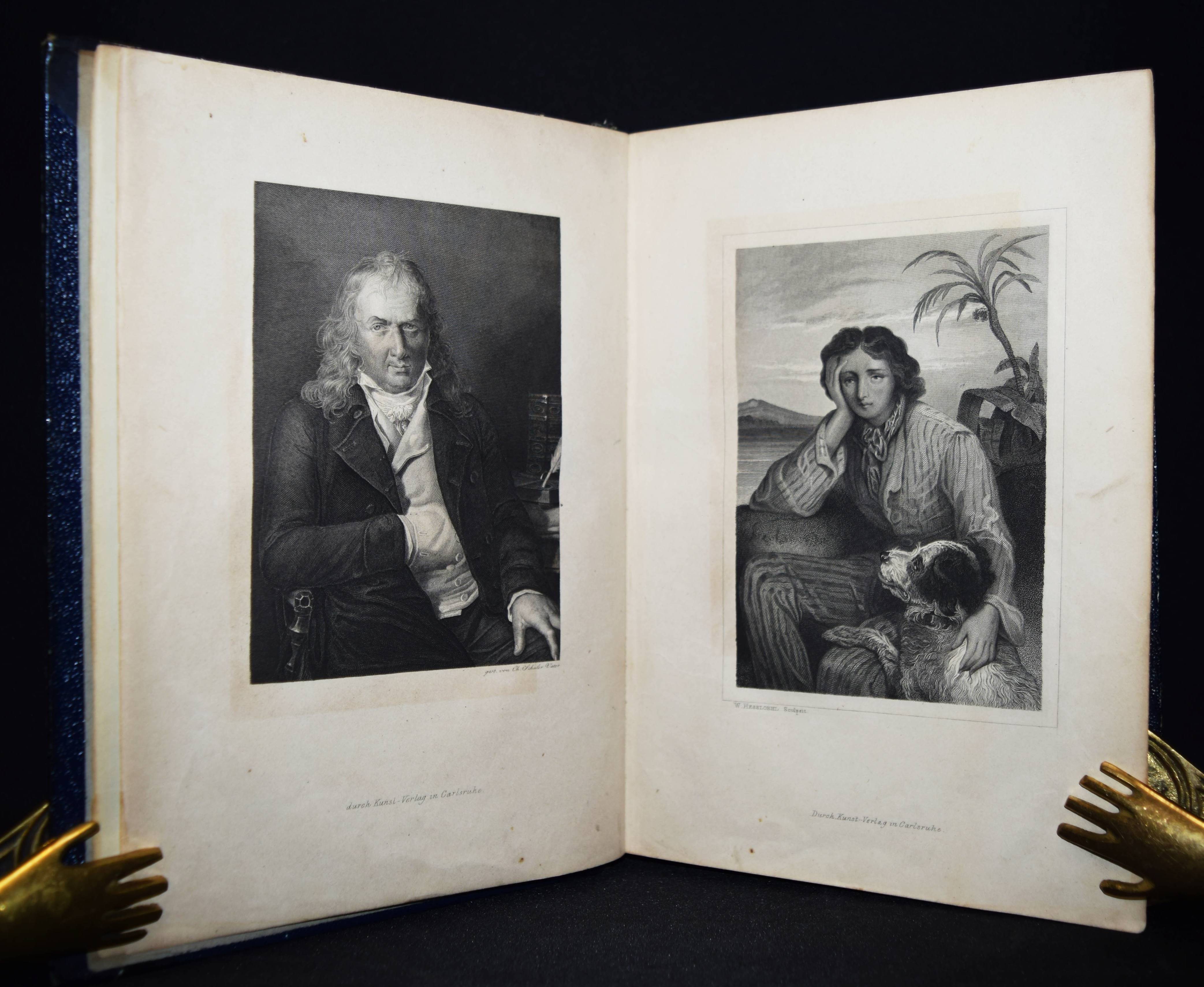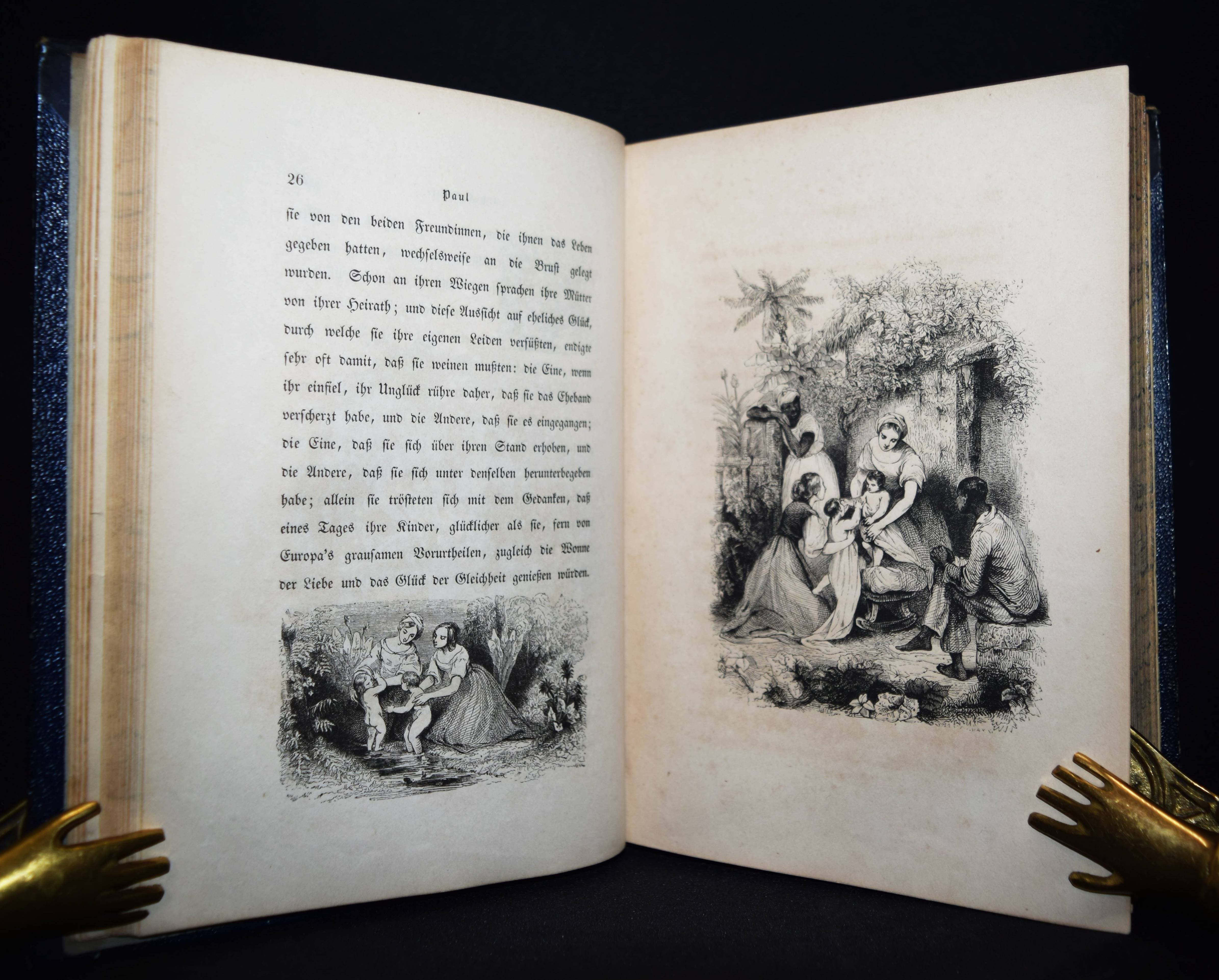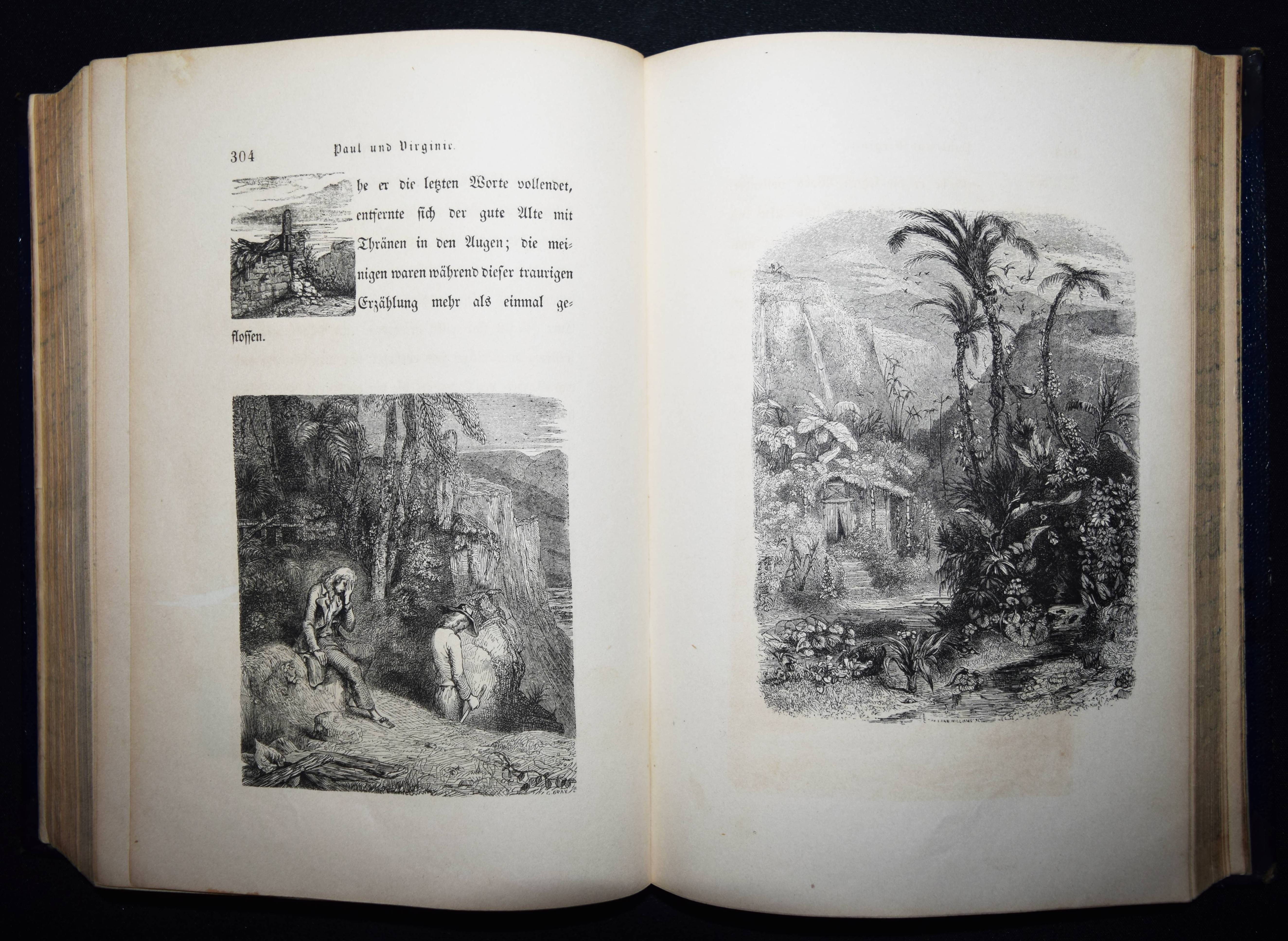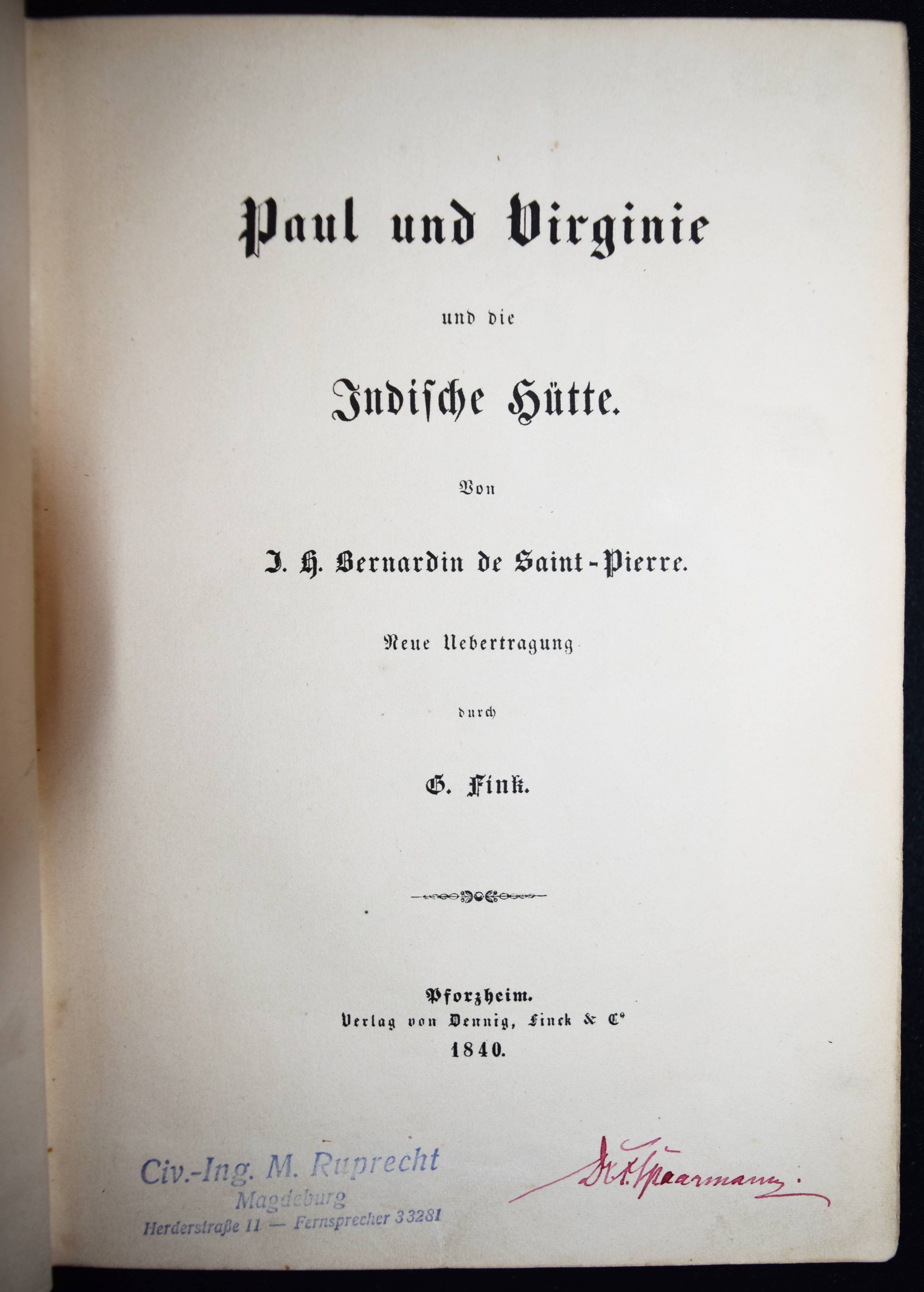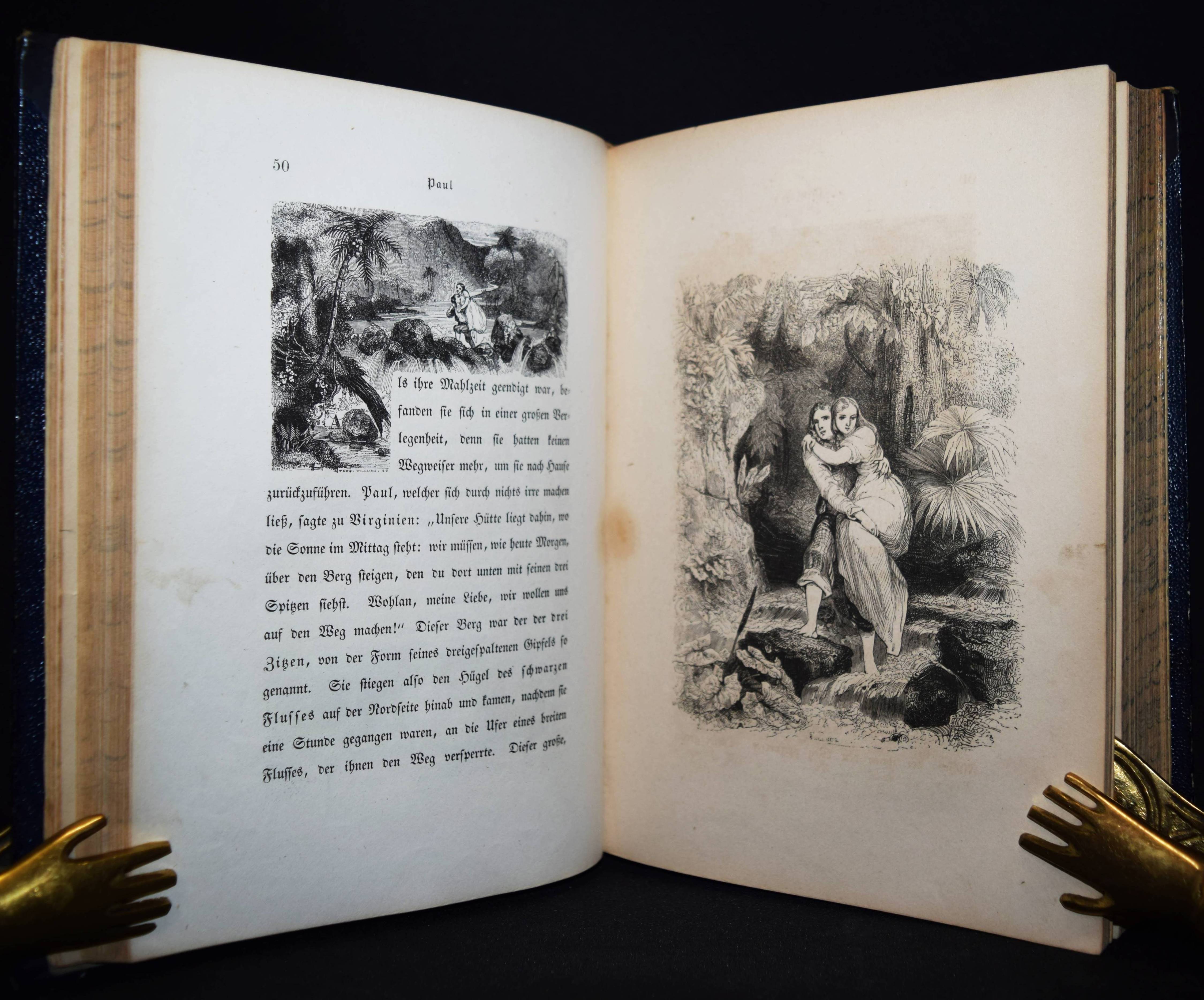 Robinsonade – Bernardin de Saint-Pierre, J(acques) H(enri). Paul und Virginie und die indische Hütte. Neue Uebertragung durch G(ottlob) Fink. Pforzheim, Denning, Fink & Co. 1840. Gr.-8°. XXXII, 458 S., 1 Bl. mit illustr. Titel, 3 Stahlstich-Porträts, 447 (28 ganzs.) Holzstich-Illustrationen u. 1 lithogr. Karte. Schwarzer Maroquin-Halblederband der Zeit mit goldgepr. Rückentitel und dekorativer Romantikervergoldung. Fromm 23176. Klotz 6115/6. LKJ III, 248. Rümann 130. Sander 605. Wegehaupt I,1837. – Erste Ausgabe dieser Übersetzung. – Die Illustrationen wurden aus der franz. Ausgabe übernommen und stammen u.a. von Johannot, Francais, Huet, Isabey, Marville und Meissonier. – „Die minuziösen und anschaulichen Schilderungen der subtropischen Natur – Bernardin de Saint-Pierre hielt sich von 1768 bis 1770 auf der Ile de France (heute Mauritius) als technischer Offizier auf – machen den Roman zum ersten Dokument des ‚exotisme‘ in Frankreich“ (KNLL II,582 ff.). – „Die Erzählung von ‚Paul et Virginie‘ wurde ein internationaler Erfolg. … ‚Paul et Virginie‘ fand in veränderten Fassungen und Übersetzungen schon bald Eingang in die Jugendliteratur. Vor allem die unter dem Titel ‚Paul et Virginie et la chaumièr indienne‘ 1838 herausgekommene Ausgabe wurde zum Modell für zahlreiche Jugendausgaben“ (LKJ). – St.u.N.a.T., stellenweise etwas gebräunt, sehr gutes sauberes und dekorativ gebundenes Exemplar.