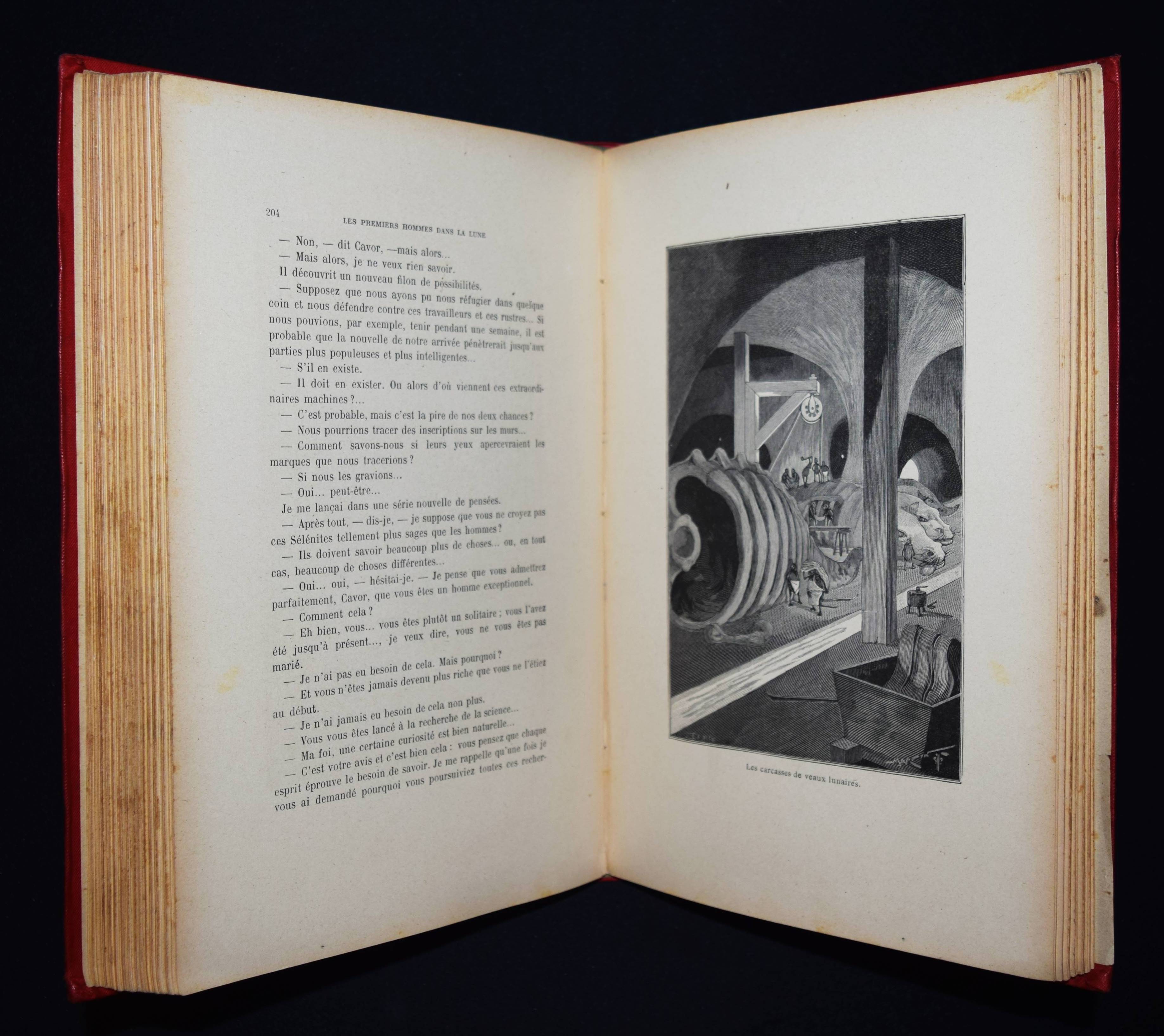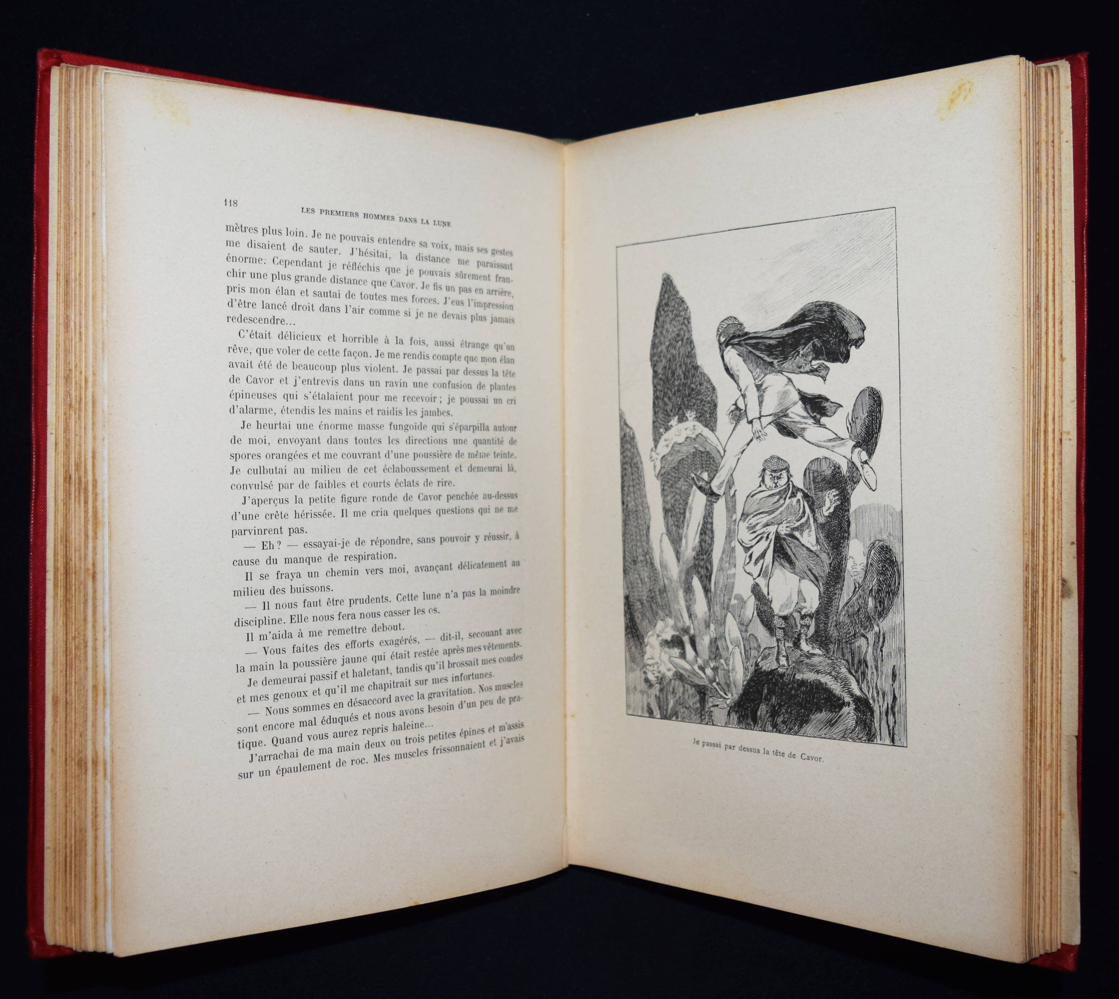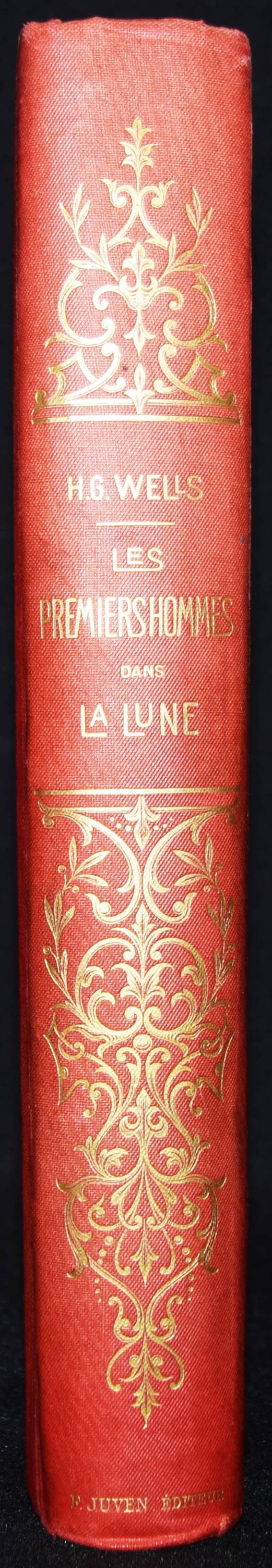 Wells, H(erbert) G(eorge). Les premiers hommes dans la lune. Traduit de l’anglais par Henry-D(urand) Davray. Illustrations de Martin van Maële (d. i. Maurice François Alfred Martin van Miële). Paris, Félix Juven o. J. (1901). 4° (27,5 x 20 cm.). 296 S., [2] Bl. mit 16 (4 farb.) Tafeln in Holzstich, zahlr. Illustrationen im Text und Jugendstil-Buchschmuck. Weinroter Orig.-Leinenband mit goldgepr. Rücken- und Deckeltitel und goldgepr. Deckelillustration (″Selenite“) sowie Goldschnitt. Crossly, H. G. Wells S. 50 ff. McLean, The Early Fiction of H.G. Wells: Fantasies of Science S. 117 ff. Nicholls, The Encyclopedia of Science Fiction 360 ff. Perry, Van Maele 63. – Erste französische Ausgabe und erste Ausgabe mit den Illustrationen von M. van Maele. – Die englische Originalausgabe des berühmten Mondromans von G. G. Wells erschien zuerst im Strand Magazine und The Cosmopolitan von November 1900 bis Juni 1901 mit dem Titel „The First Men in the Moon“. Die erste Buchausgabe erschien 1901 bei George Newnes in London. Felix Juven veröffentlichte 1901 drei Ausgaben, die vorliegende Luxusausgabe mit farb- und schwarzweiß Illustrationen, eine billigere Ausgabe nur mit schwarzweiß Illustrationen und eine „Volksausgabe“ ohne Illustrationen. – Die Darstellung des Mondbewohners (″Selenite“) auf dem Einband wurde in späteren Auflagen gegen eine Rakete ersetzt. – Der franz. Zeichner und Illustrator M. van Maele (1863-1926) arbeitete in Brüssel und Paris und war vor allem für seine erotischen Illustrationen berühmt. Für F. Juven hat Van Maele auch „Aventures Extraordinaires“ (Sherlock Holmes) von Conan Doyle ausgestattet (1902). – „The inspiration seems to come from the famous 1865 book by Jules Verne, From the Earth to the Moon, and the opera by Jacques Offenbach from 1875. Verne’s novel also uses the word „Selenites“ to describe inhabitants of the Moon. … Soon after the publication of The First Men in the Moon, Wells was accused by the Irish writer Robert Cromie of having stolen from his novel A Plunge into Space (1890), which used an antigravity device similar to that in Chrysostom Trueman’s The History of a Voyage to the Moon (1864). Both novels had certain elements in common, such as a globular spaceship built in secret after inventing a way to overcome Earth’s gravity. Wells simply replied: „I have never heard of Mr Cromie nor of the book he attempts to advertise by insinuations of plagiarism on my part.“ Jules Verne was publicly hostile to Wells’s novel, mainly due to Wells having his characters go to the Moon via a totally fictional creation of an anti-gravitational material rather than the actual use of technology“ (Wikipedia). – Rücken etwas aufgehellt, Vorderdeckel im unteren Drittel mit schwachem Fleck, vereinzelt etwas braun- und fingerfleckig, sehr gutes Exemplar. – Première édition française et première édition avec les illustrations de M. van Maele. – L’édition originale anglaise du célèbre roman lunaire de G. G. Wells a d’abord été publiée dans Strand Magazine et The Cosmopolitan de novembre 1900 à juin 1901 sous le titre « The First Men in the Moon ». La première édition en livre est parue en 1901 chez George Newnes à Londres. Felix Juven publia trois éditions en 1901, la présente édition de luxe avec des illustrations en couleur et en noir et blanc, une édition moins chère avec uniquement des illustrations en noir et blanc et une édition « populaire » sans illustrations. – La représentation de l’habitant de la lune (« sélénite ») sur la couverture a été remplacée par une fusée dans les éditions ultérieures. – Le dessinateur français. Le dessinateur et illustrateur M. van Maele (1863-1926) travailla à Bruxelles et à Paris et fut surtout célèbre pour ses illustrations érotiques. Pour f. Juven, Van Maele a également décoré « Aventures Extraordinaires » (Sherlock Holmes) de Conan Doyle (1902). – L’inspiration semble venir du célèbre livre de Jules Verne de 1865, De la Terre à la Lune, et de l’opéra de Jacques Offenbach de 1875. Le roman de Jules Verne utilise également le mot « Sélénites » pour décrire les habitants de la Lune. … Peu après la publication des Premiers hommes sur la Lune, Wells a été accusé par l’écrivain irlandais Robert Cromie d’avoir volé son roman A Plunge into Space (1890), qui utilisait un dispositif antigravitationnel similaire à celui de The History of a Voyage to the Moon (1864) de Chrysostom Trueman. Les deux romans avaient certains éléments en commun, comme un vaisseau spatial globulaire construit en secret après avoir inventé un moyen de vaincre la gravité terrestre. Wells a simplement répondu : « Je n’ai jamais entendu parler de M. Cromie ni du livre dont il tente de faire la publicité en insinuant que je l’ai plagié ». Jules Verne s’est montré publiquement hostile au roman de Wells, principalement parce que ce dernier a envoyé ses personnages sur la Lune par le biais d’une création totalement fictive d’un matériau antigravitationnel plutôt que par l’utilisation réelle d’une technologie » (Wikipedia). – Dos un peu éclairci, première de couverture avec une faible tache dans le tiers inférieur, quelques rousseurs et taches de doigts éparses, très bon exemplaire.