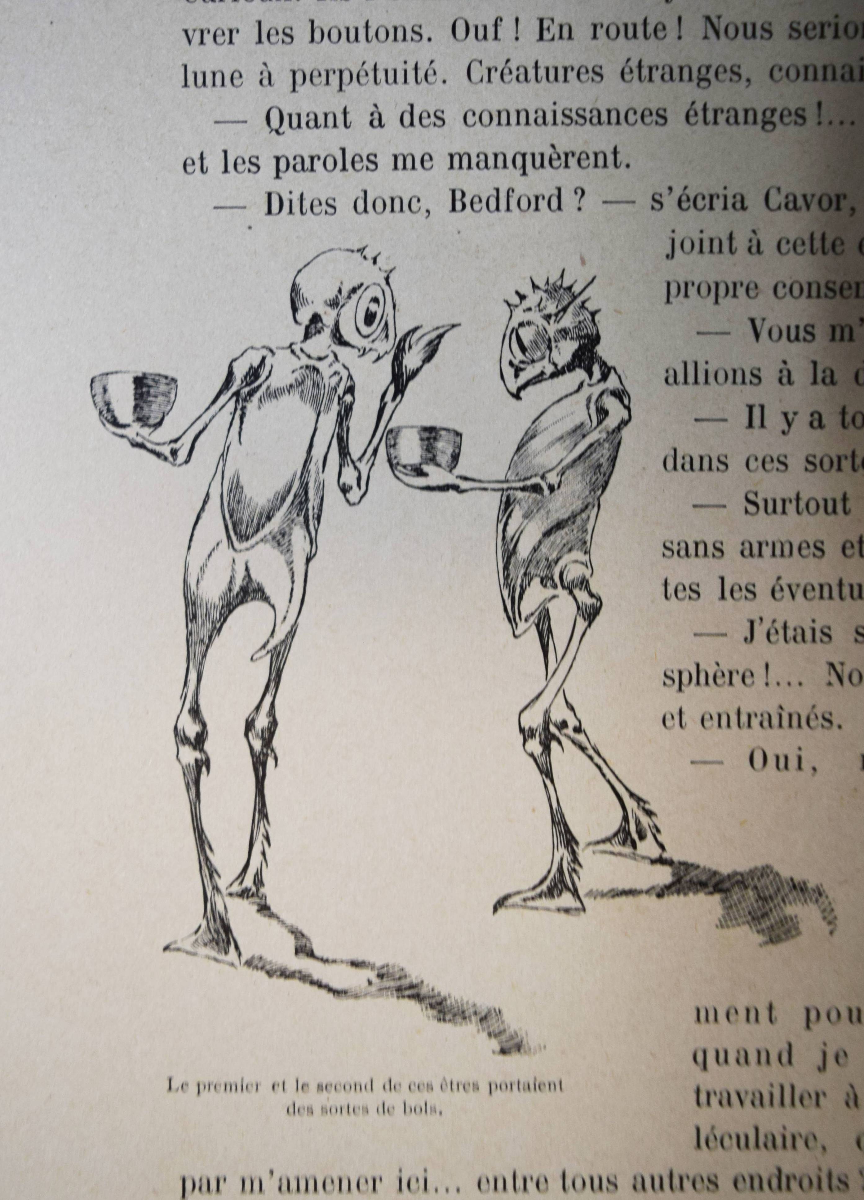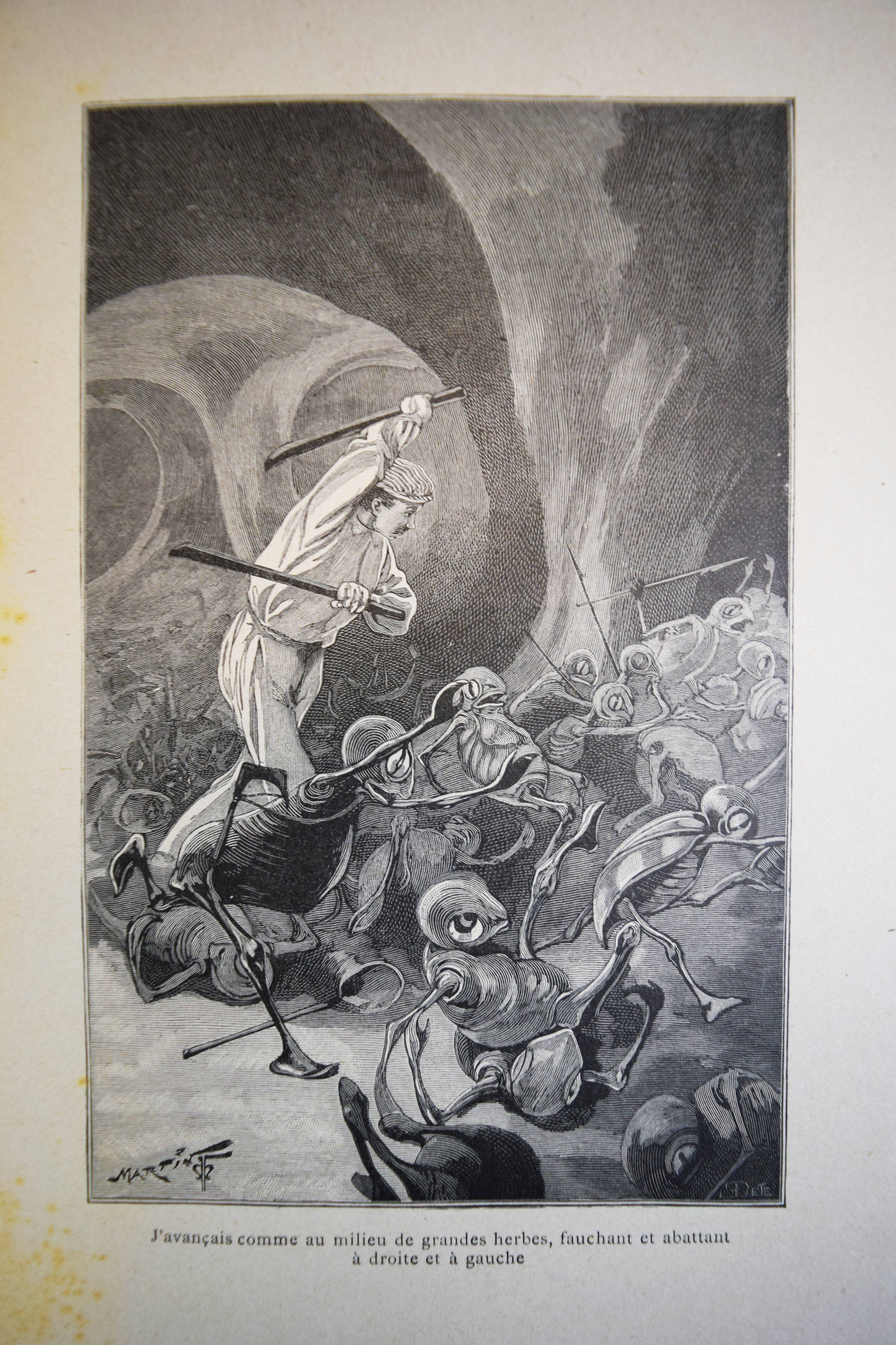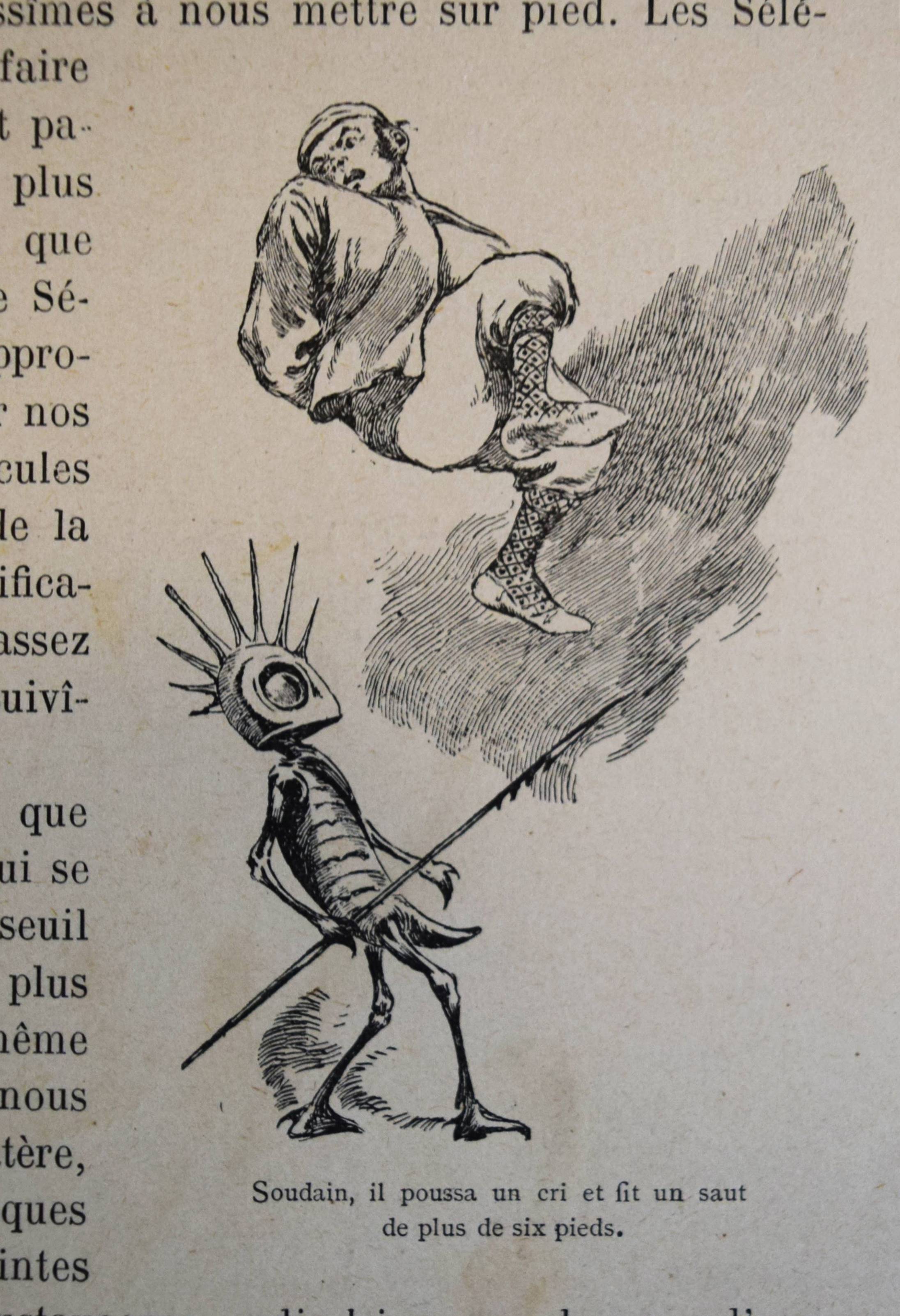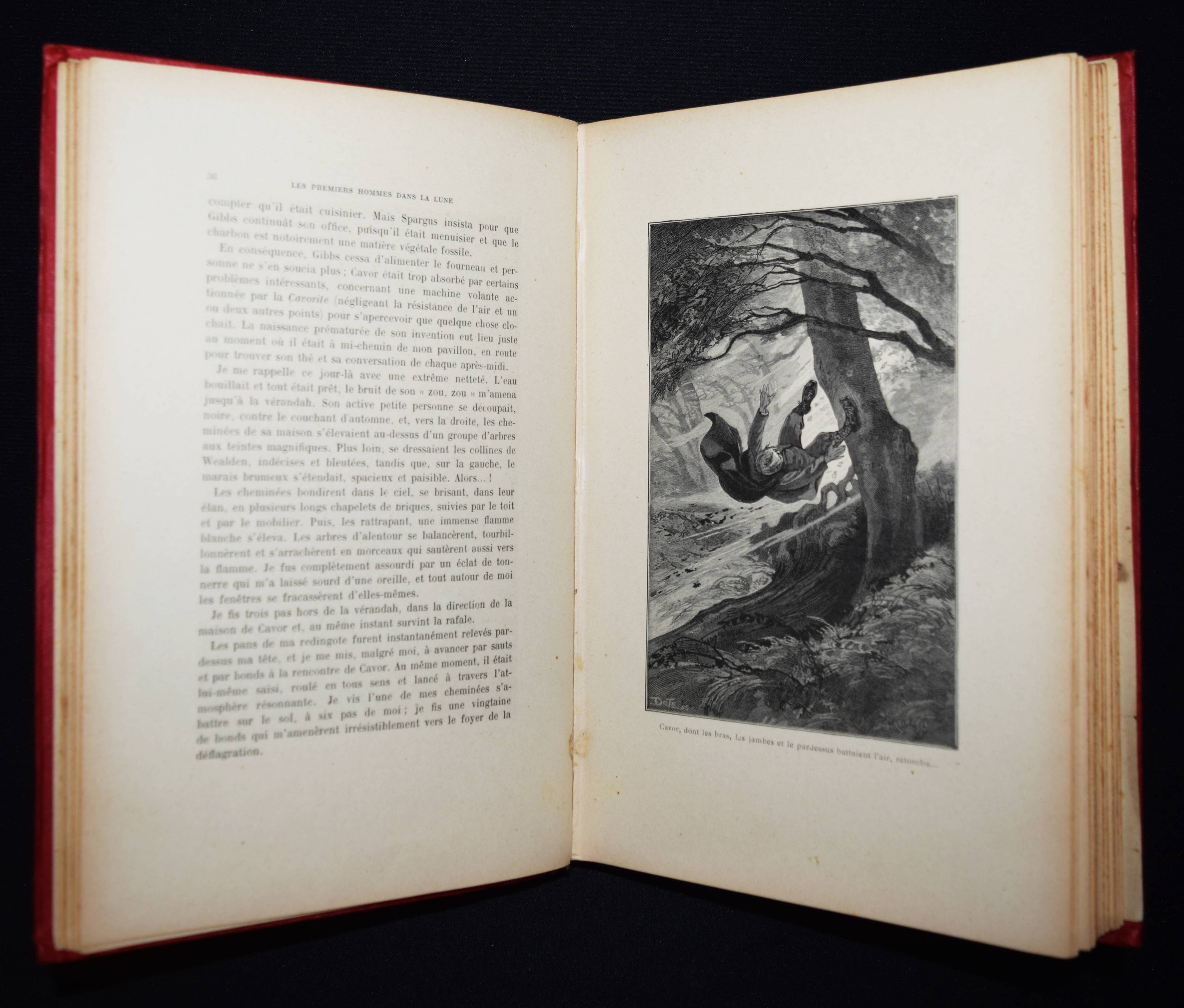 Wells, H(erbert) G(eorge). Les premiers hommes dans la lune. Traduit de l’anglais par Henry-D(urand) Davray. Illustrations de Martin van Maële (d. i. Maurice François Alfred Martin van Miële). Paris, Félix Juven o. J. (1901). 4° (27,5 x 20 cm.). 296 S., [2] Bl. mit 16 (4 farb.) Tafeln in Holzstich, zahlr. Illustrationen im Text und Jugendstil-Buchschmuck. Weinroter Orig.-Leinenband mit goldgepr. Rücken- und Deckeltitel und goldgepr. Deckelillustration (″Selenite“) sowie Goldschnitt. Crossly, H. G. Wells S. 50 ff. McLean, The Early Fiction of H.G. Wells: Fantasies of Science S. 117 ff. Nicholls, The Encyclopedia of Science Fiction 360 ff. Perry, Van Maele 63. – Erste französische Ausgabe und erste Ausgabe mit den Illustrationen von M. van Maele. – Die englische Originalausgabe des berühmten Mondromans von G. G. Wells erschien zuerst im Strand Magazine und The Cosmopolitan von November 1900 bis Juni 1901 mit dem Titel „The First Men in the Moon“. Die erste Buchausgabe erschien 1901 bei George Newnes in London. Felix Juven veröffentlichte 1901 drei Ausgaben, die vorliegende Luxusausgabe mit farb- und schwarzweiß Illustrationen, eine billigere Ausgabe nur mit schwarzweiß Illustrationen und eine „Volksausgabe“ ohne Illustrationen. – Die Darstellung des Mondbewohners (″Selenite“) auf dem Einband wurde in späteren Auflagen gegen eine Rakete ersetzt. – Der franz. Zeichner und Illustrator M. van Maele (1863-1926) arbeitete in Brüssel und Paris und war vor allem für seine erotischen Illustrationen berühmt. Für F. Juven hat Van Maele auch „Aventures Extraordinaires“ (Sherlock Holmes) von Conan Doyle ausgestattet (1902). – „The inspiration seems to come from the famous 1865 book by Jules Verne, From the Earth to the Moon, and the opera by Jacques Offenbach from 1875. Verne’s novel also uses the word „Selenites“ to describe inhabitants of the Moon. … Soon after the publication of The First Men in the Moon, Wells was accused by the Irish writer Robert Cromie of having stolen from his novel A Plunge into Space (1890), which used an antigravity device similar to that in Chrysostom Trueman’s The History of a Voyage to the Moon (1864). Both novels had certain elements in common, such as a globular spaceship built in secret after inventing a way to overcome Earth’s gravity. Wells simply replied: „I have never heard of Mr Cromie nor of the book he attempts to advertise by insinuations of plagiarism on my part.“ Jules Verne was publicly hostile to Wells’s novel, mainly due to Wells having his characters go to the Moon via a totally fictional creation of an anti-gravitational material rather than the actual use of technology“ (Wikipedia). – Rücken etwas aufgehellt, Vorderdeckel im unteren Drittel mit schwachem Fleck, vereinzelt etwas braun- und fingerfleckig, sehr gutes Exemplar. – Première édition française et première édition avec les illustrations de M. van Maele. – L’édition originale anglaise du célèbre roman lunaire de G. G. Wells a d’abord été publiée dans Strand Magazine et The Cosmopolitan de novembre 1900 à juin 1901 sous le titre « The First Men in the Moon ». La première édition en livre est parue en 1901 chez George Newnes à Londres. Felix Juven publia trois éditions en 1901, la présente édition de luxe avec des illustrations en couleur et en noir et blanc, une édition moins chère avec uniquement des illustrations en noir et blanc et une édition « populaire » sans illustrations. – La représentation de l’habitant de la lune (« sélénite ») sur la couverture a été remplacée par une fusée dans les éditions ultérieures. – Le dessinateur français. Le dessinateur et illustrateur M. van Maele (1863-1926) travailla à Bruxelles et à Paris et fut surtout célèbre pour ses illustrations érotiques. Pour f. Juven, Van Maele a également décoré « Aventures Extraordinaires » (Sherlock Holmes) de Conan Doyle (1902). – L’inspiration semble venir du célèbre livre de Jules Verne de 1865, De la Terre à la Lune, et de l’opéra de Jacques Offenbach de 1875. Le roman de Jules Verne utilise également le mot « Sélénites » pour décrire les habitants de la Lune. … Peu après la publication des Premiers hommes sur la Lune, Wells a été accusé par l’écrivain irlandais Robert Cromie d’avoir volé son roman A Plunge into Space (1890), qui utilisait un dispositif antigravitationnel similaire à celui de The History of a Voyage to the Moon (1864) de Chrysostom Trueman. Les deux romans avaient certains éléments en commun, comme un vaisseau spatial globulaire construit en secret après avoir inventé un moyen de vaincre la gravité terrestre. Wells a simplement répondu : « Je n’ai jamais entendu parler de M. Cromie ni du livre dont il tente de faire la publicité en insinuant que je l’ai plagié ». Jules Verne s’est montré publiquement hostile au roman de Wells, principalement parce que ce dernier a envoyé ses personnages sur la Lune par le biais d’une création totalement fictive d’un matériau antigravitationnel plutôt que par l’utilisation réelle d’une technologie » (Wikipedia). – Dos un peu éclairci, première de couverture avec une faible tache dans le tiers inférieur, quelques rousseurs et taches de doigts éparses, très bon exemplaire.