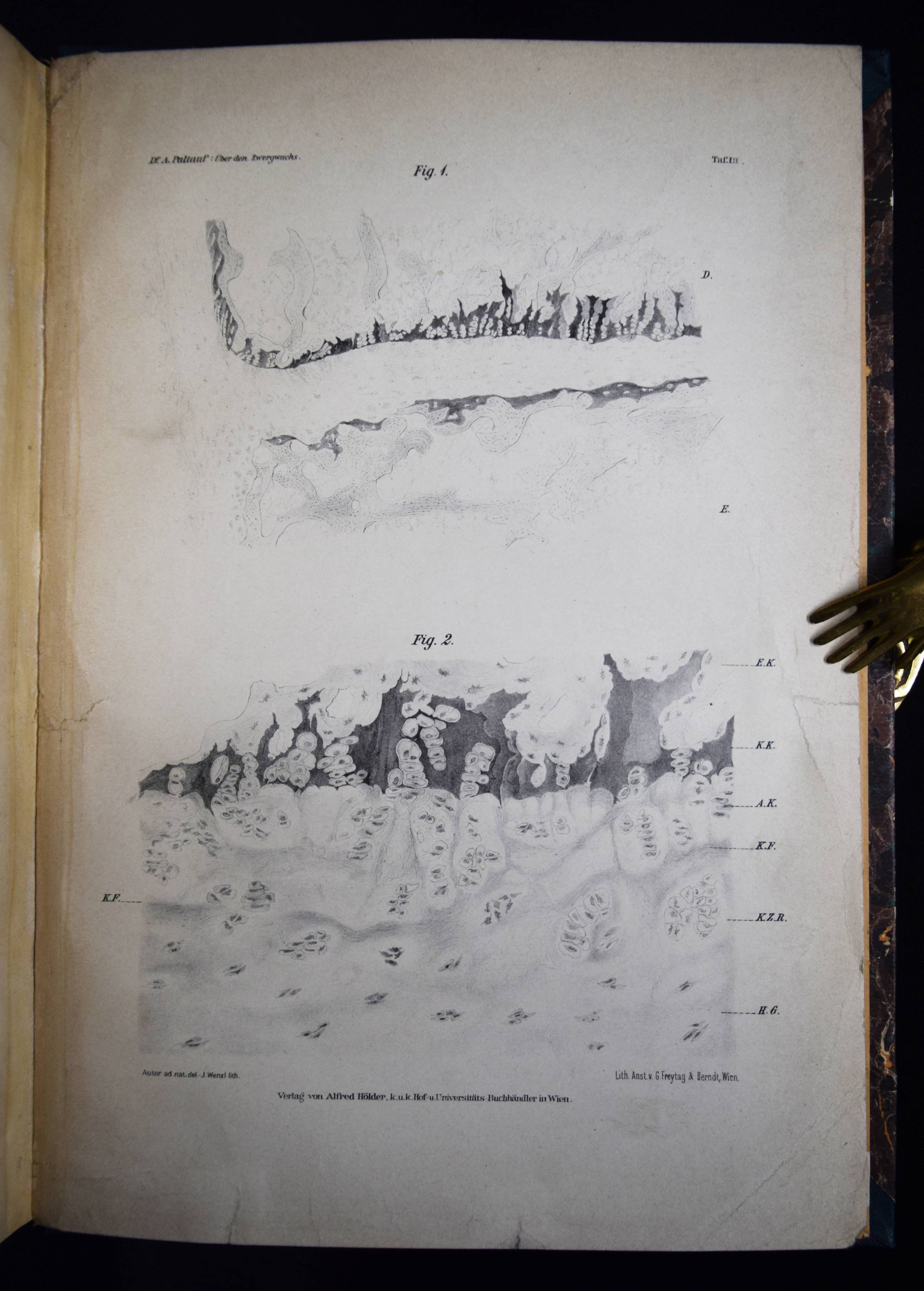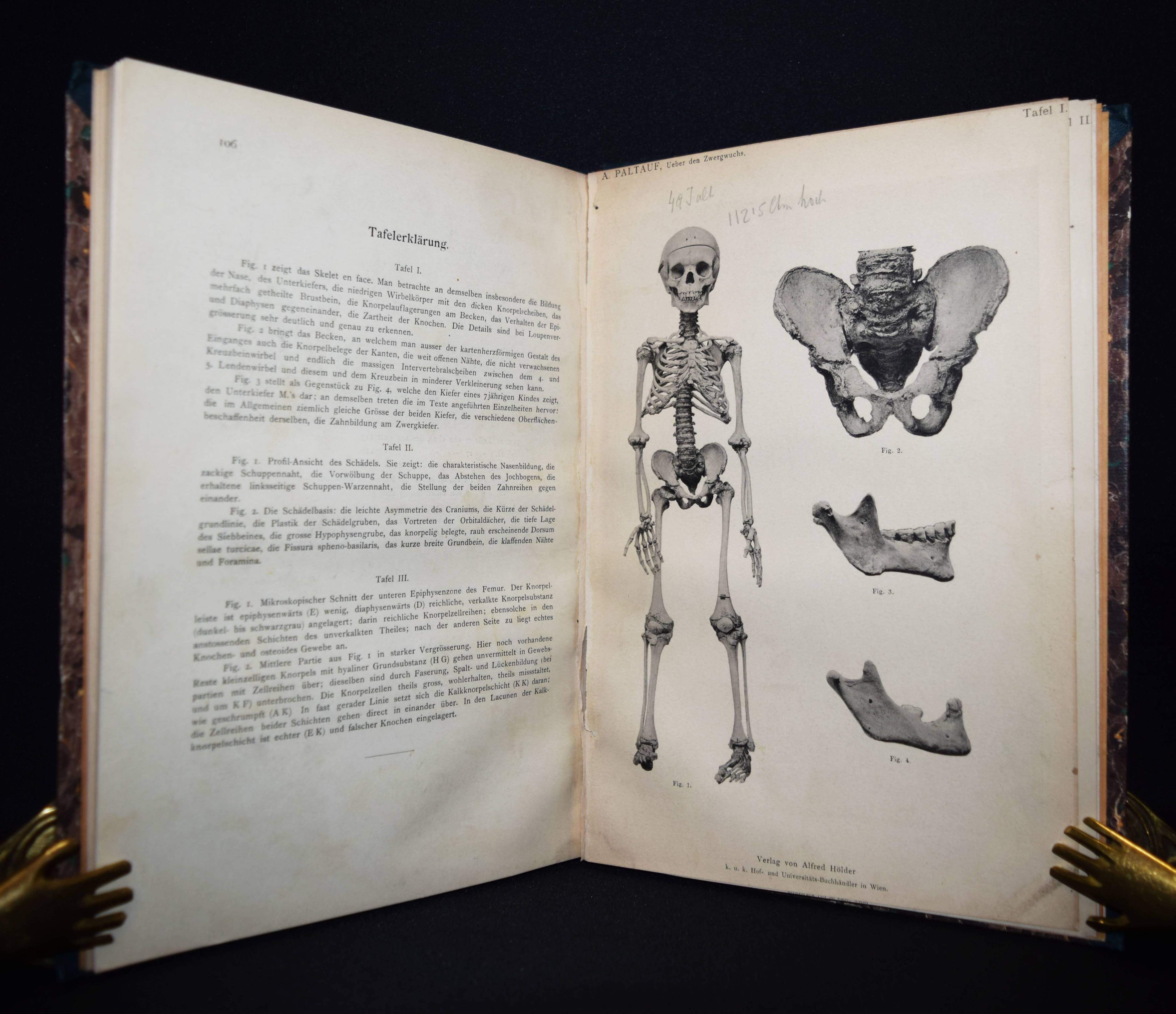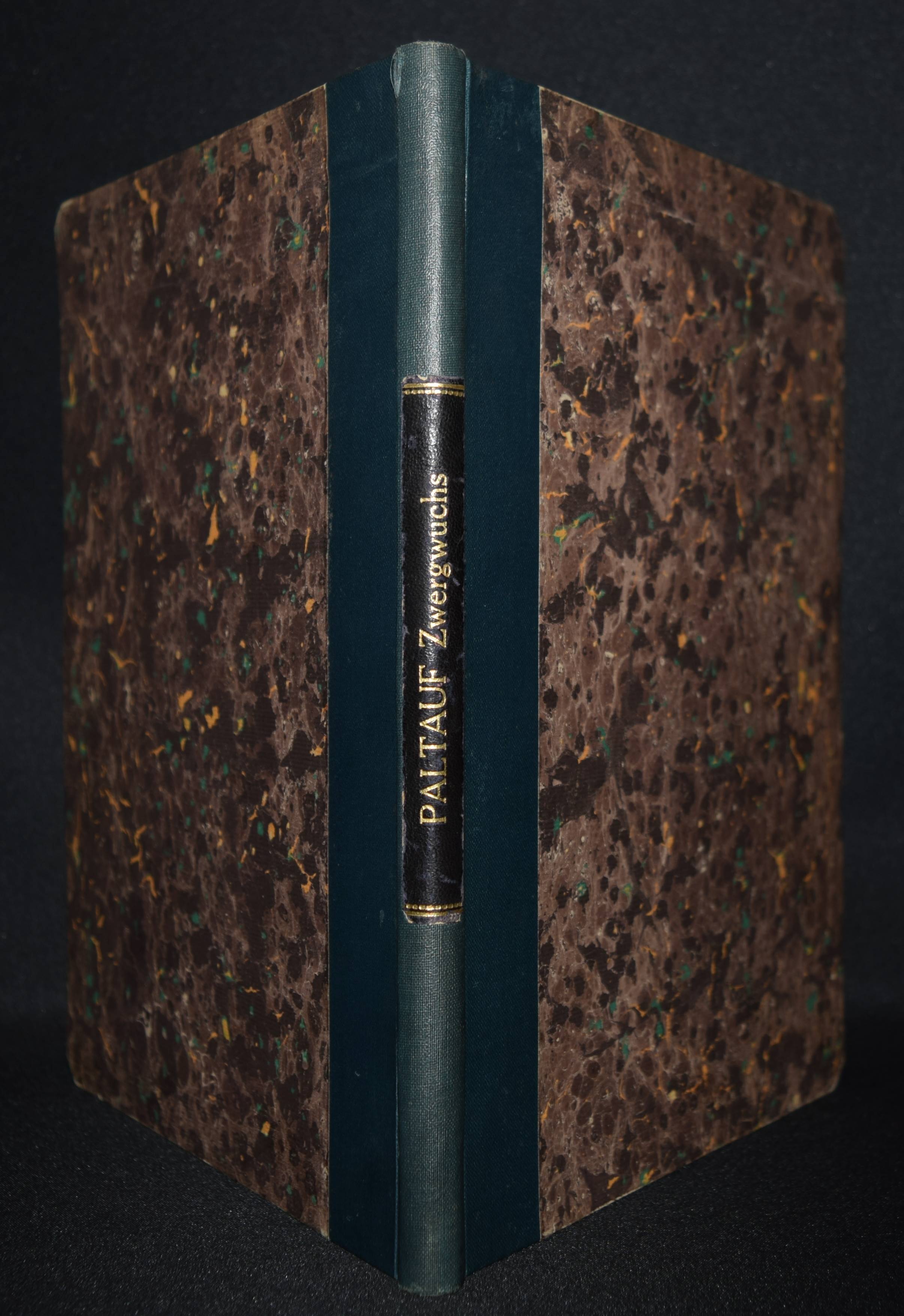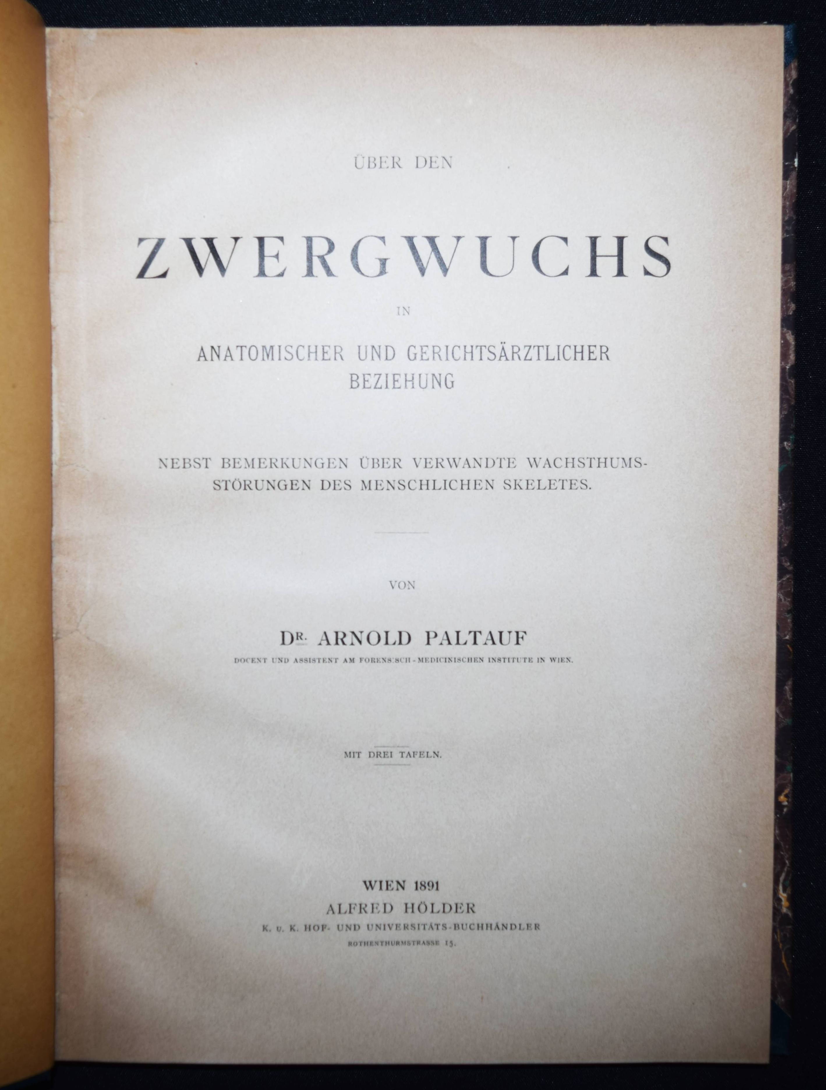 Paltauf, Arnold. Über den Zwergwuchs in anatomischer und gerichtsärztlicher Beziehung. Nebst Bemerkungen über verwandte Wachstumsstörungen des menschlichen Skeletes. Wien, Alfred Hölder 1891. 4°. 106 S. mit 2 Tafeln nach Fotografien und 1 lithogr. Tafel. Hln. der Zeit mit goldgepr. Rückenschild. Lesky 608 ff. ÖBL VII, 307. – Erste und einzige Ausgabe der ersten „grundlegenden Untersuchungen über Zwergwuchs und Kretinismus. Er gab dem Nanismus infantilis seinen Namen: A. Paltaufsche Form. Seine Stud. über die Beziehungen der Thymus zum Exitus subitus ließen ihn den Status thymico-lymphaticus beschreiben, bei dem er eine Persistenz oder eine Vergrößerung der Drüse und des ganzen lymphat. Gewebes sowie Milztumor als Ursache sonst nicht erklärbarer Todesfälle als eine patholog., konstitutionelle Veranlagung deutete, eine heute umstrittene These aus dem Formenkreis der exsudativen Diathese. Das Phänomen der Ballonierung der Lunge konnte P. durch den Nachweis klären, daß schon während des Ertrinkens Ertränkungsflüssigkeit aus den Lungenbläschen in das Zwischengewebe gelangt. P. bewies mit Hilfe des von Fleischl angegebenen Hämometers, daß die Flüssigkeit zur Blutverdünnung führt“ (M. Jantsch in ÖBL). – Die Tafeln zeigen ein menschliches Skelett, einen Hüft- und Kieferknochen, einen Schädel und Gewebeproben. – Der Wiener Gerichtsmediziner Arnold Paltauf (1860-1893) war der Bruder des bedeutenden Pathologen und Histologen Richard Paltauf (1858-1924), Gründer des Serotherapeutische Instituts in Wien und einer Impfstation gegen Tollwut. – Papierbedingt etwas gebräunt, gutes Exemplar.