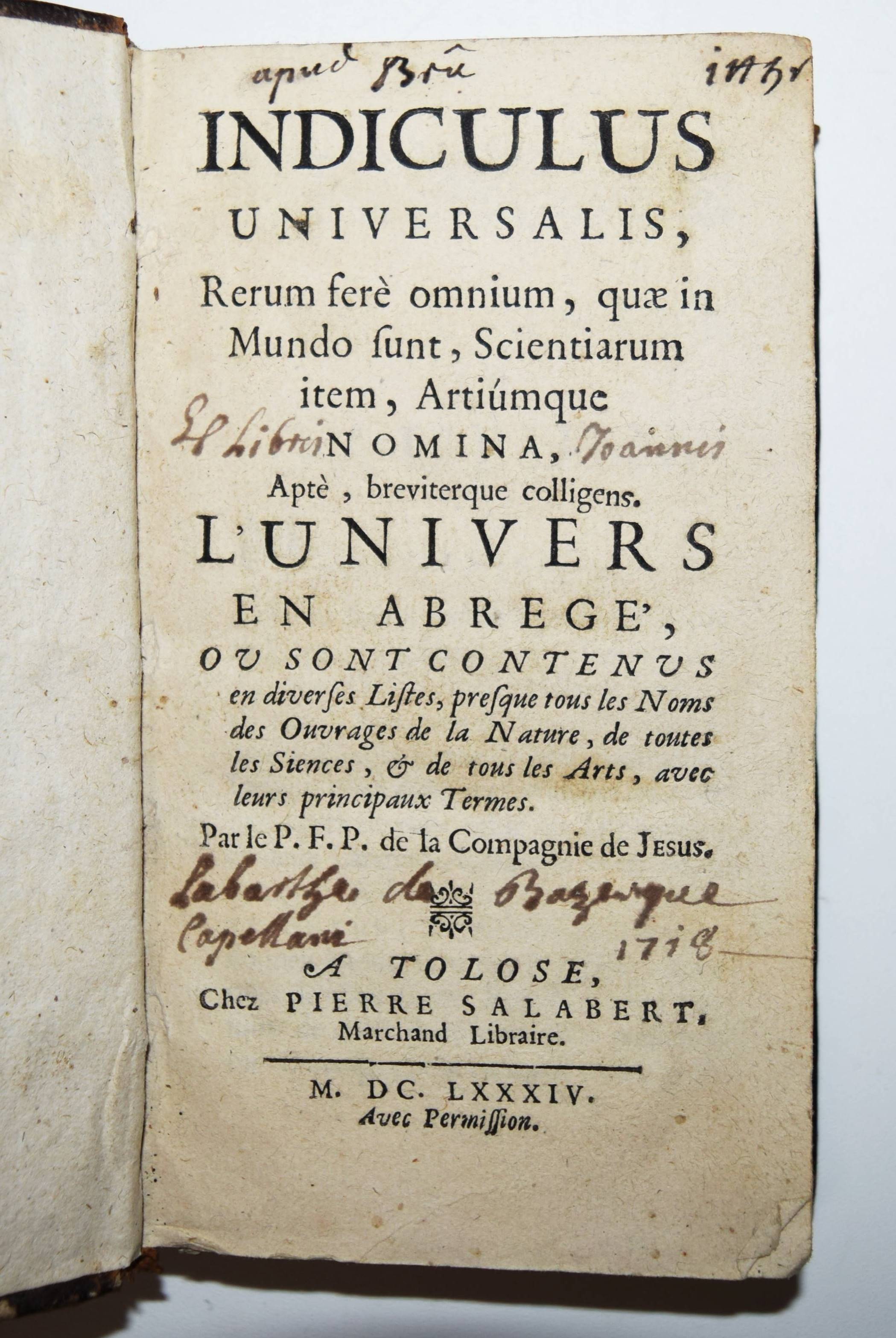P(omey), F(rançois) (Antoine). Indiculus universalis rerum fere omnium, quae in mundo sunt, scientiarum item, artiumque nomina apte breviterque colligens. L’ univers en abrégé, où sont contenus en diverses listes presque tous les noms des ouvrages de la nature, de toutes les sciences & de tous les arts, avec leurs principaux termes. Toulouse, Pierre Salabert 1684. Kl.-8° (15 x 8 cm.). [12] Bl., 288 S. Kalbsledereinband der Zeit mit goldgepr. Rückenschild und floraler Rückenvergoldung. De Backer-Sommervogel VI, 971 ff. – Noch frühe und seltene Ausgabe des erfolgreichen polygloten Fach-Wörterbuchs. Die erste Ausgabe erschien 1659. – Noch bis Mitte des 18. Jahrhunderts erschienen auch Übersetzungen in Deutsch (1698), Englisch, Italienisch, Niederländisch und Französisch. – Das akademische Fachwörterbuch zur Astronomie, Geographie, Mathematik, Militaria, Wappenkunde u.a. war eine Vorarbeit zu Pomeys „Le grand dictionaire royal“ (vgl. Zaunmüller S. 150, 3. Ausgabe, Frankfurt am Main 1700). – Deckel berieben und mit geringf. Wurmspuren, zeitgenöss. Besitzvermerk auf dem Titel, gutes dekorativ gebundenes Exemplar.