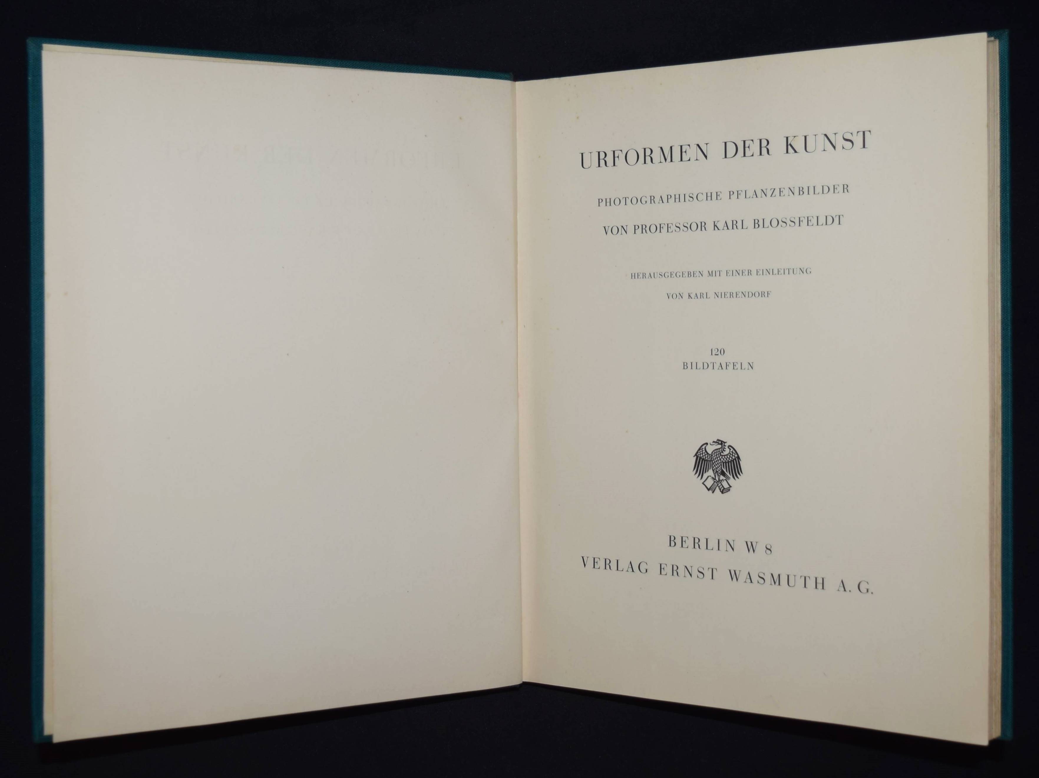 Blossfeldt, Karl. Urformen der Kunst. Photographische Pflanzenbilder. Hrsg. mit einer Einleitung von Karl Nierendorf. Berlin, Wasmuth o. J. (1928). 4°. XVII, (1) S., 1 Bl. u. 120 num. Bildtafeln in Kupfertiefdruck. OLn. mit goldgepr. Rücken- und Deckeltitel und Deckelvignette (Entwurf: Lucian Zabel) u. illustr. Orig.-Schutzumschlag. Auer 133. Heidtmann 14471. Heiting/Jaeger I, 188 ff. (mit mehreren Abb.). Parr/Badger I, 96. Roth, The open book S. 66 f. – Erste Ausgabe. – „Die deutsche Erstausgabe von ‚Urformen der Kunst‘ erschien sowohl gebunden wie auch als Mappe, in welche die Drucke als Einzelblätter eingelegt sind… In seiner äußerst pathetisch formulierten Einleitung unterstellt Nierendorf zunächst eine enge Verbindung von Kunst und Natur über die Jahrhunderte hinweg, um dann schließlich Blossfeldt zu attestieren, dass noch niemand zuvor diese Beziehung „mit gleich packender Unmittelbarkeit“ dargestellt habe und dies ganz „ohne Effekte, lediglich durch vielfache Vergrößerung“ sichtbar gemacht durch „sachliche Mittel der photographischen Technik“… Die Einleitung spricht daher möglichst viele Zielgruppen an: „Kunstexperten und Naturfreunde, Esoteriker neuer Weltanschauungen und schließlich auch noch Fotofreunde.“ Bei der Betrachtung der nun folgenden 120 Tafeln lässt sich Nierendorfs Euphorie, was die Wirkung der Fotografie anbelangt, jedoch uneingeschränkt nachvollziehen. Dies ist nicht zuletzt der exzellenten Bildwiedergabe mittels perfekter Anwendung des Kupfertiefdruckverfahrens geschuldet. Die Pflanzen wirken so plastisch, dass man sie anfassen möchte… Walter Benjamin… lobt… in der „Literarischen Welt“ (1928) vor allem das ‚Können‘ Blossfeldts, das sich unabhängig vom ‚Wissen‘, also der dahinterstehenden Intention, in seinen Fotografien manifestiert. Dass diese Bilder „im Pflanzendasein einen ganzen unvermuteten Schatz von Analogien und Formen“ auftun, ist laut Benjamin nur der Fotografie zu verdanken, welche durch ihre technischen Möglichkeiten, wie der starken Vergrößerung, die Erschaffung dieser neuen Bilderwelten erst ermöglicht“ (B. Hammers in Heiting/Jaeger). – Schutzumschlag am Rücken geringfügig berieben und im unteren Rand mit minimalen Läsuren, sehr gutes sauberes Exemplar. – First edition. – “The German first edition of ‘Urformen der Kunst’ appeared both bound and as a portfolio, in which the prints are inserted as individual sheets… In his extremely pathetically formulated introduction, Nierendorf first assumes a close connection between art and nature over the centuries, before finally attesting to Blossfeldt that no one had ever before depicted this relationship “with equally gripping immediacy” and that this was made visible entirely “without effects, merely through multiple magnification” using “objective means of photographic technique”… The introduction therefore appeals to as many target groups as possible: “art experts and nature lovers, esotericists of new world views and, finally, photography enthusiasts.” When looking at the 120 plates that follow, however, Nierendorf’s euphoria about the effect of photography can be fully understood. The plants look so vivid that you want to touch them… Walter Benjamin…praises…in the “Literarische Welt” (1928) especially Blossfeldt’s ‚skill‘, which manifests itself in his photographs independently of the ‚knowledge‘, i.e. the intention behind them.According to Benjamin, the fact that these images “reveal a whole unsuspected treasure trove of analogies and forms in the existence of plants” is only thanks to photography, which, through its technical possibilities, such as high magnification, makes the creation of these new pictorial worlds possible in the first place” (B. Hammers in Heiting/Jaeger).– Dust jacket slightly rubbed on the spine and with minimal wear to the lower edge, a very good clean copy.