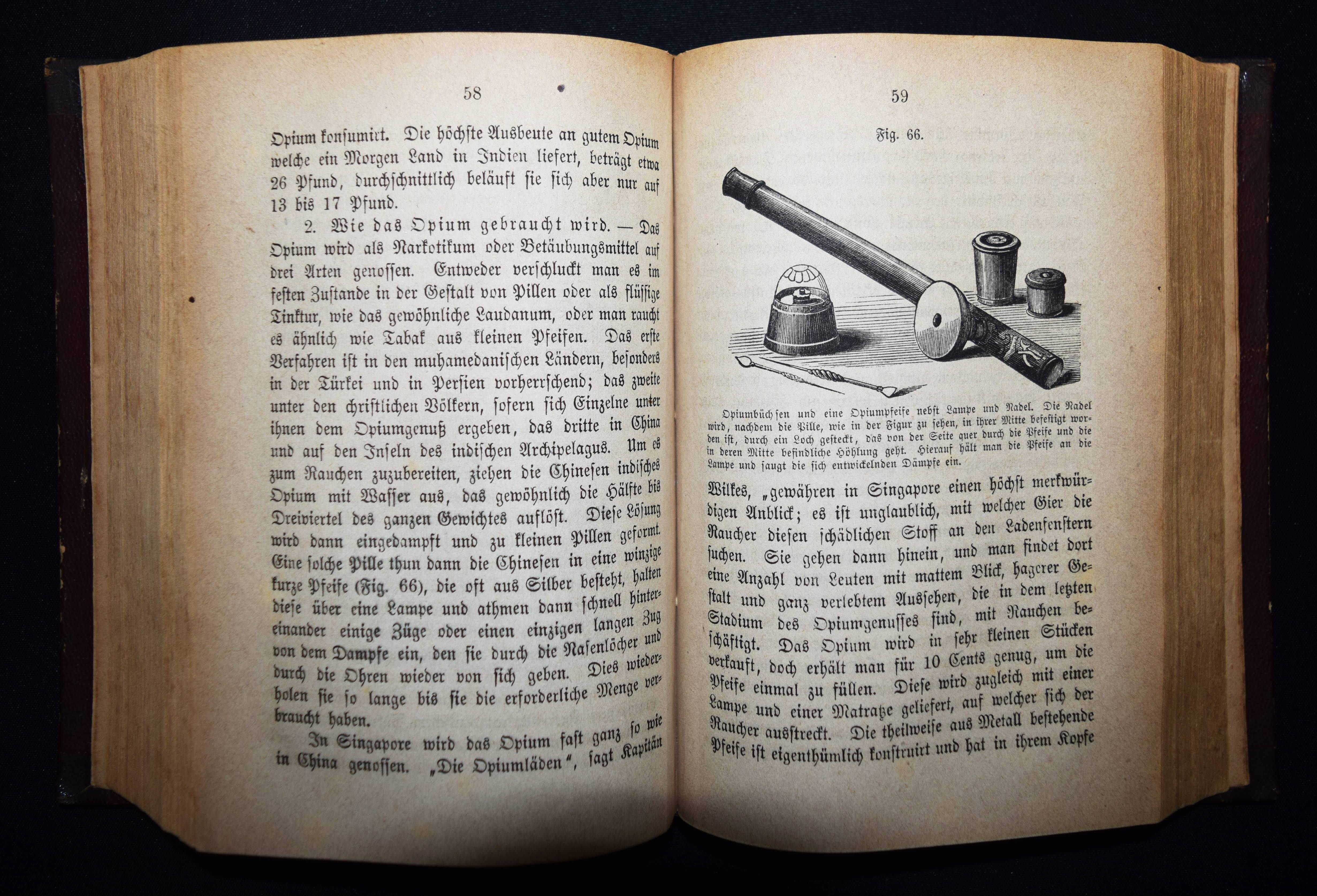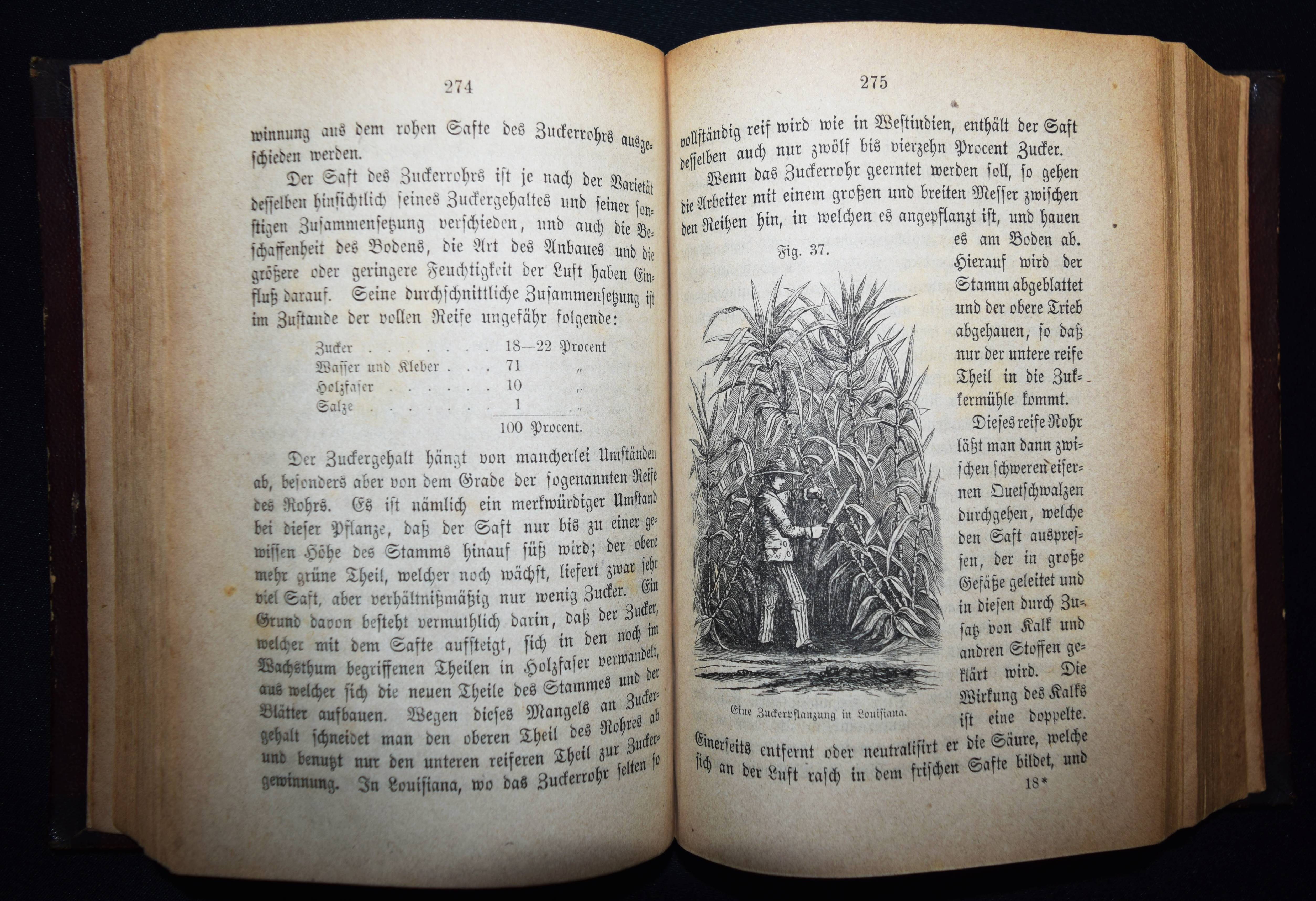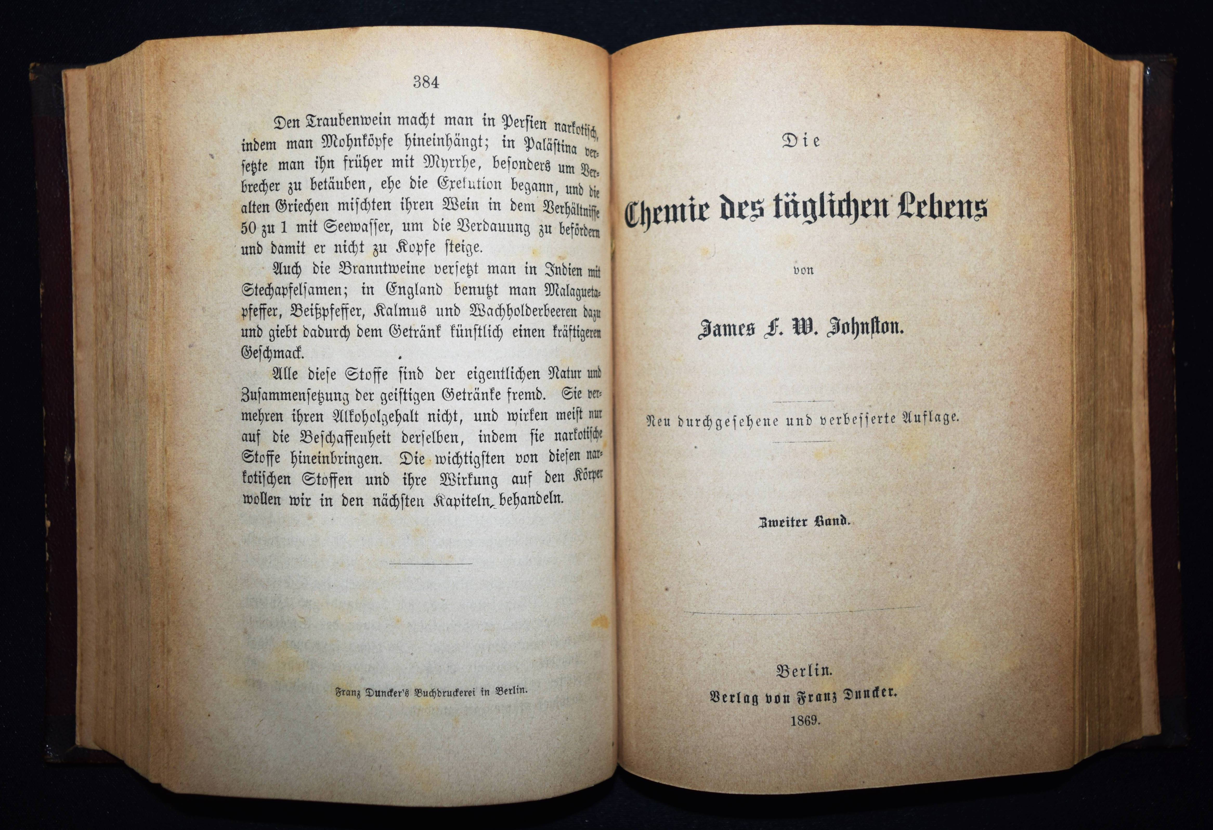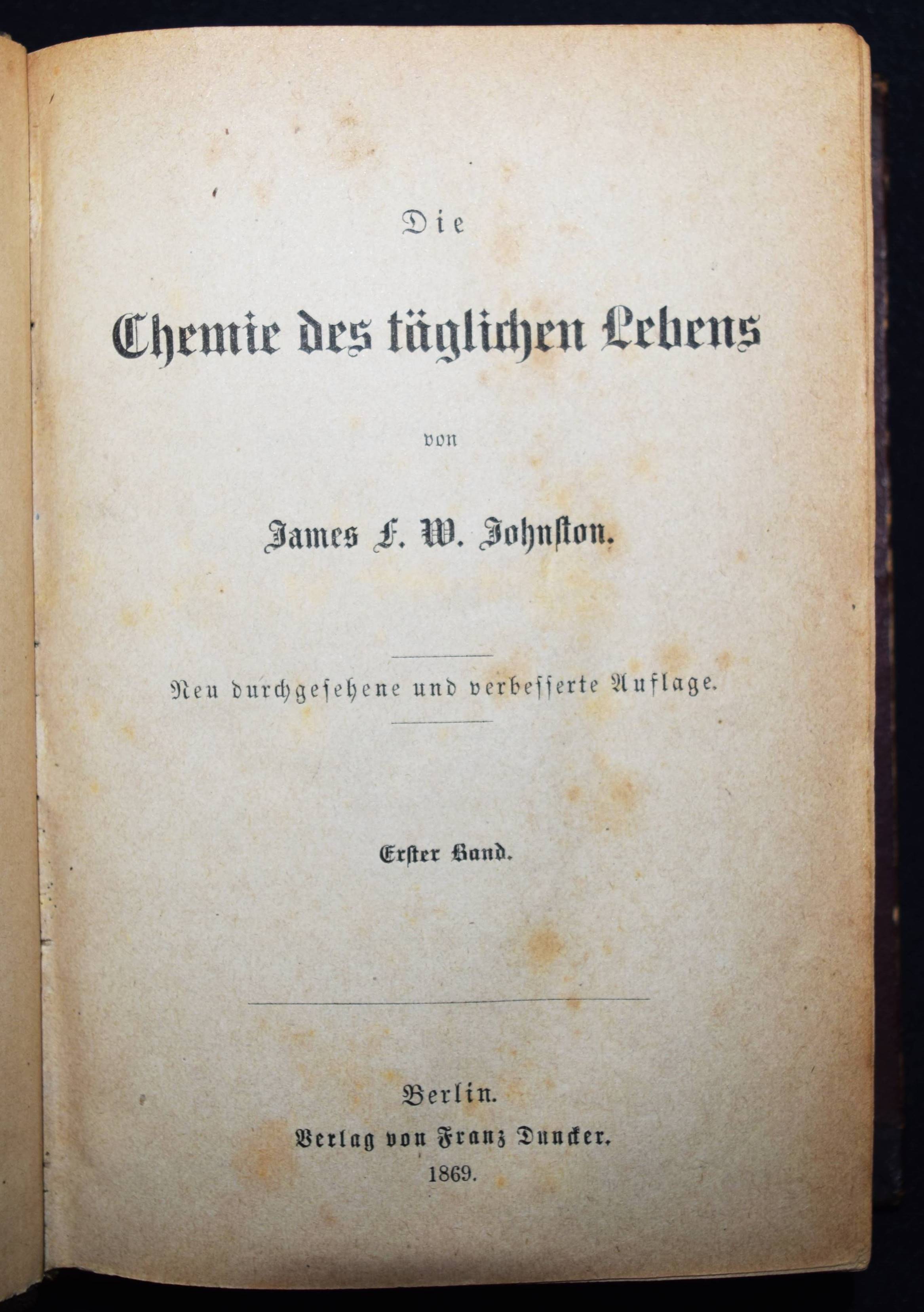 Johnston, James F(inlay) W(eir). Die Chemie des täglichen Lebens. Neu durchgesehene und verbesserte Auflage. 2 Teile in 1 Band. Berlin, Franz Duncker 1869. Kl.-8°. IV, 384 S.; VI, 412 S. mit zahlr. Holzstich-Abb. im Text. Hldr. der Zeit. Weiss 1784. – Zweite deutsche Ausgabe; die engl. Originalausgabe erschien 1854 in London mit dem Titel „Chemistry of common life“. – Behandelt Luft, Wasser, Boden und vor allem die Lebensmittelchemie mit Kapitel über Tee, Kaffee (vgl. Mueller 112 f.), Bier, Weine, Tabak, Rauschmittel wie Opium, Hanf, Betel, Coca u.a. – Deckel etwas berieben, Rückentitel und Linienvergoldung ausgebleicht, papierbedingt durchgehend gebräunt, gutes Exemplar.