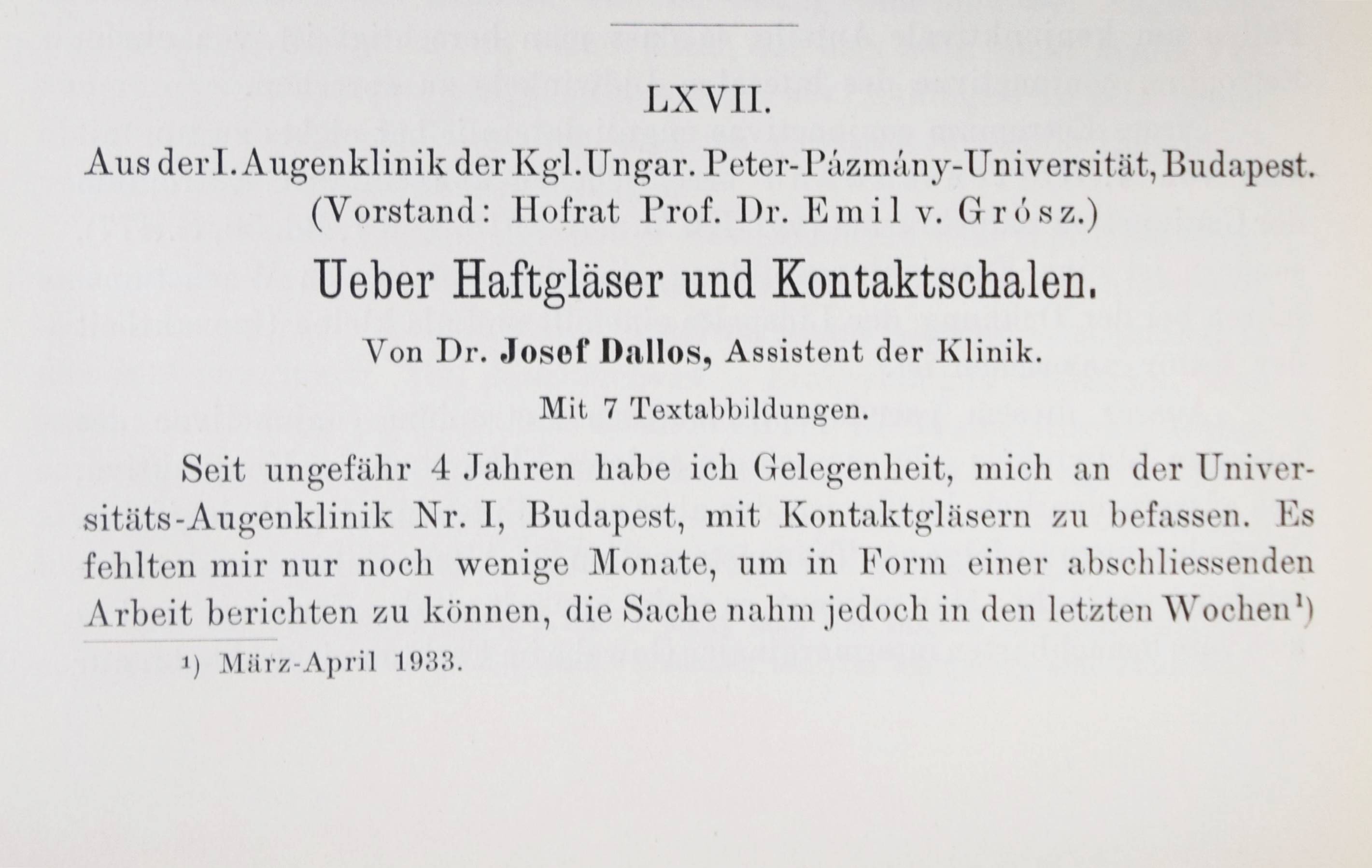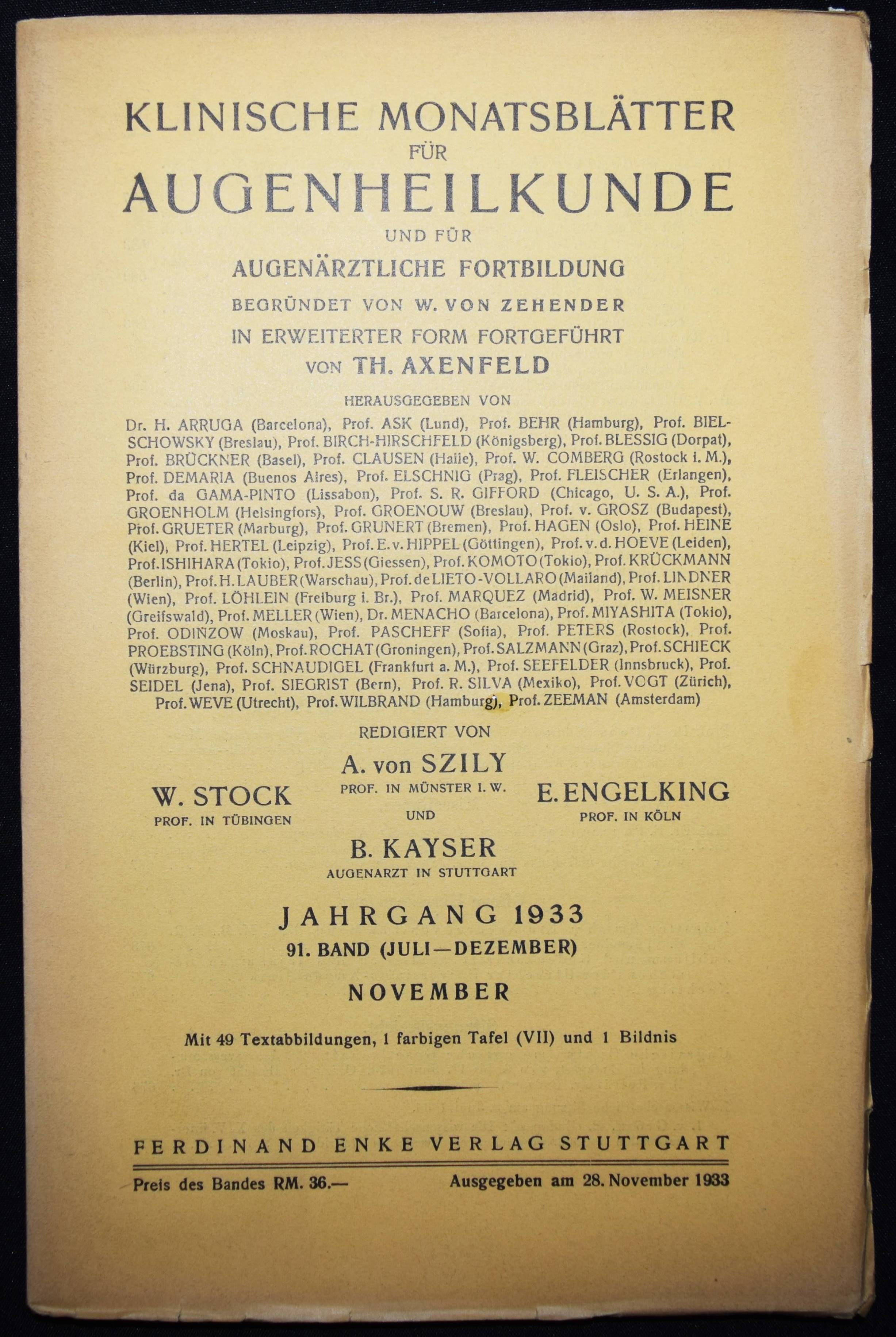 Dallos, Josef. Ueber Haftgläser und Kontaktschalen. In: Klinische Monatsblätter für Augenheilkunde und für augenärztliche Fortbildung. Jahrgang 1933, 91. Band, November, S. 640-659 mit 7 Abb. Stuttgart, Ferdinand Enke 1933. Gr.-8°. S. 577-720, [1] Bl. mit 49 Abb., 1 Portrait und 1 Farbtafel. OBr. Garrison/Morton 5985. – Erste Veröffentlichung der wichtigen Arbeit des britisch-ungarischen Augenarztes J. Dallos (1905-1979) über die Einführung der Kontaktlinsen in der Augenheilkunde. – „Josef Dallos wurde 1905 in Budapest als Sohn eines Lehrers geboren. Bereits im Alter von 25 Jahren qualifizierte er sich 1928 als Arzt und arbeitete dort in der „Universitätsklinik Nr. 1“, was heute die Semmelweis Universität ist für Augenheilkunde. Schon bald begann er mit der Anpassung von Kontaktlinsen, dabei verwendete er Original Zeiss-Kontaktlinsen, die damals einzig erhältlichen. Er schlug mittels einer neuartigen Abformtechnik einige Verbesserungen des Designs vor, die gemeinsam 1934 mit Zeiss patentiert wurden. Seine Experimente zur Abformtechnik waren revolutionär, da er unter Verwendung einer plastisch verformbaren Masse (Negocol) am lebenden Auge Abdrücke abnehmen konnte, die über die tatsächliche Form der Hornhaut und Sklera Auskunft gab. Negocol war ein aus Algen gewonnenes Material, das auf 41° bis 42° C erhitzt und auf das betäubte Auge gespritzt wurde. Es härtete beim Abkühlen aus, und Dallos wandelte die Form mit einem wachsartigen Präparat (Hominite) in einen Positivabguss um. Später verwendete er sogar einen Positivabguss aus Messing, formte darüber eine Glaslinse ab und nahm alle notwendigen Anpassungen durch Schleifen vor. Einige Historiker sind der Meinung, dass dies die ersten modernen Sklerallinsen waren, die individuell für die Augen des Patienten angefertigt wurden. In späteren Jahren wurde das Negocol durch eine Formmasse namens Moldite und die Messingform durch eine Positivgussmasse namens Castone ersetzt. Dies waren die Grundlagen, um passgenaue Kontaktlinsen herzustellen. 1933 veröffentlichte er seinen ersten Artikel über Kontaktlinsen in einer deutschen Fachzeitschrift für Augenheilkunde, „Ueber Haftglaser und Kontaktschalen“. Noch im selben Jahr erhielt er ein ungarisches Patent für die Herstellung von Kontaktlinsen, die unter den Augenlidern stabilisiert werden konnten, ohne die Hornhaut zu berühren, und erlangte die Zulassung als Facharzt für Augenheilkunde. Josef Dallos kam nach Großbritannien, um der Bedrohung durch die Nazis in seinem Heimatland Ungarn zu entgehen. Im Mai 1937 zog er mit seinem Schwager George Nissel nach England. Dallos arbeitete in der Wigmore Street 9, bevor er das erste reine Kontaktlinsenzentrum am Cavendish Square 18 gründete. Zwischen 1938 und 1948 passte er Linsen in Moorfields an und besuchte das St. Mary‘s und das Western Ophthalmic Hospital. Während des Krieges versorgte er Soldaten, damit sie in den aktiven Dienst zurückkehren konnten. Er passte auch bei vielen ehemaligen Soldaten Glassklerallinsen an, die nach dem Ersten Weltkrieg an Senfgas-Keratitis erkrankt waren, arbeitete intensiv an der Sauerstoffversorgung der Hornhaut, entwickelte Abdrücke der Hornhaut zur Herstellung von Hornhautlinsen aus Glas und entwickelte eine Methode zur Desinfektion von weichen Linsen. Er war der Erste, der bei der Anpassung von Kontaktlinsen die Physiologie des Auges berücksichtigte. Kurz gesagt: Er legte den Grundstein für alle Kontaktlinsen, wie wir sie heute kennen“ (Silke Sage, Pioniere der Augenoptik, in Focus, Magazin für Augenoptiker, 02/2024). – Umschlag leicht angestaubt, sehr gutes unbeschnittenes Exemplar.