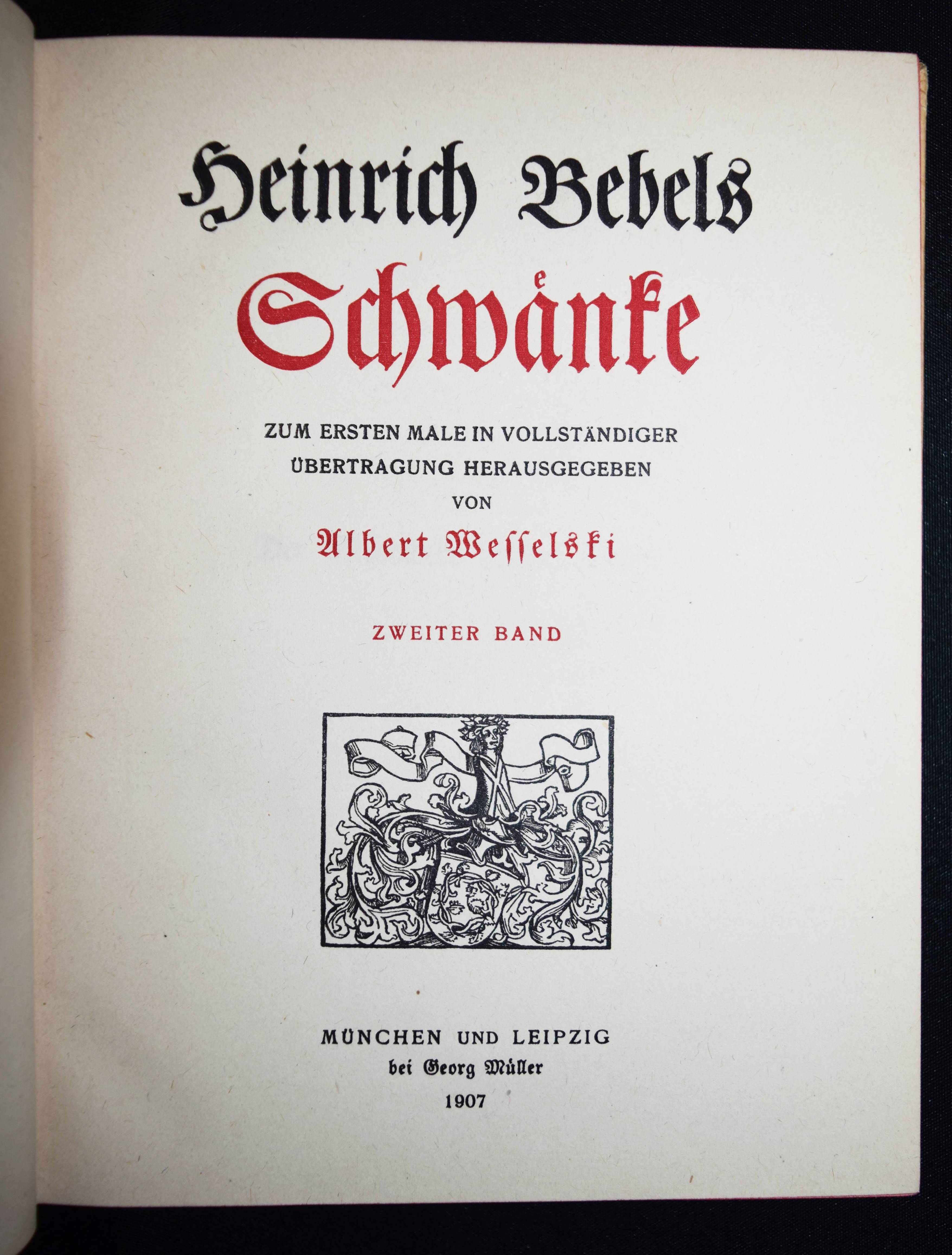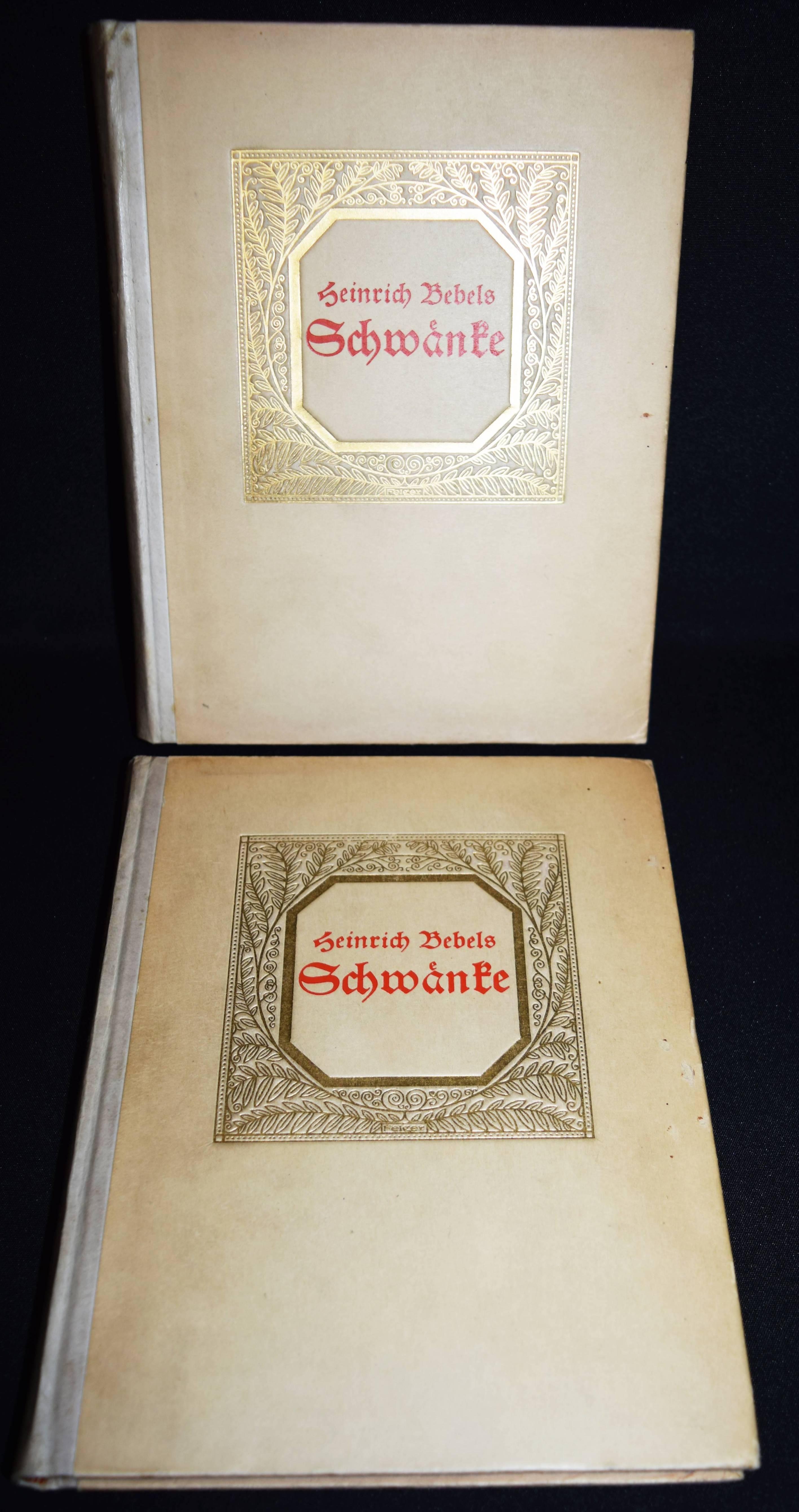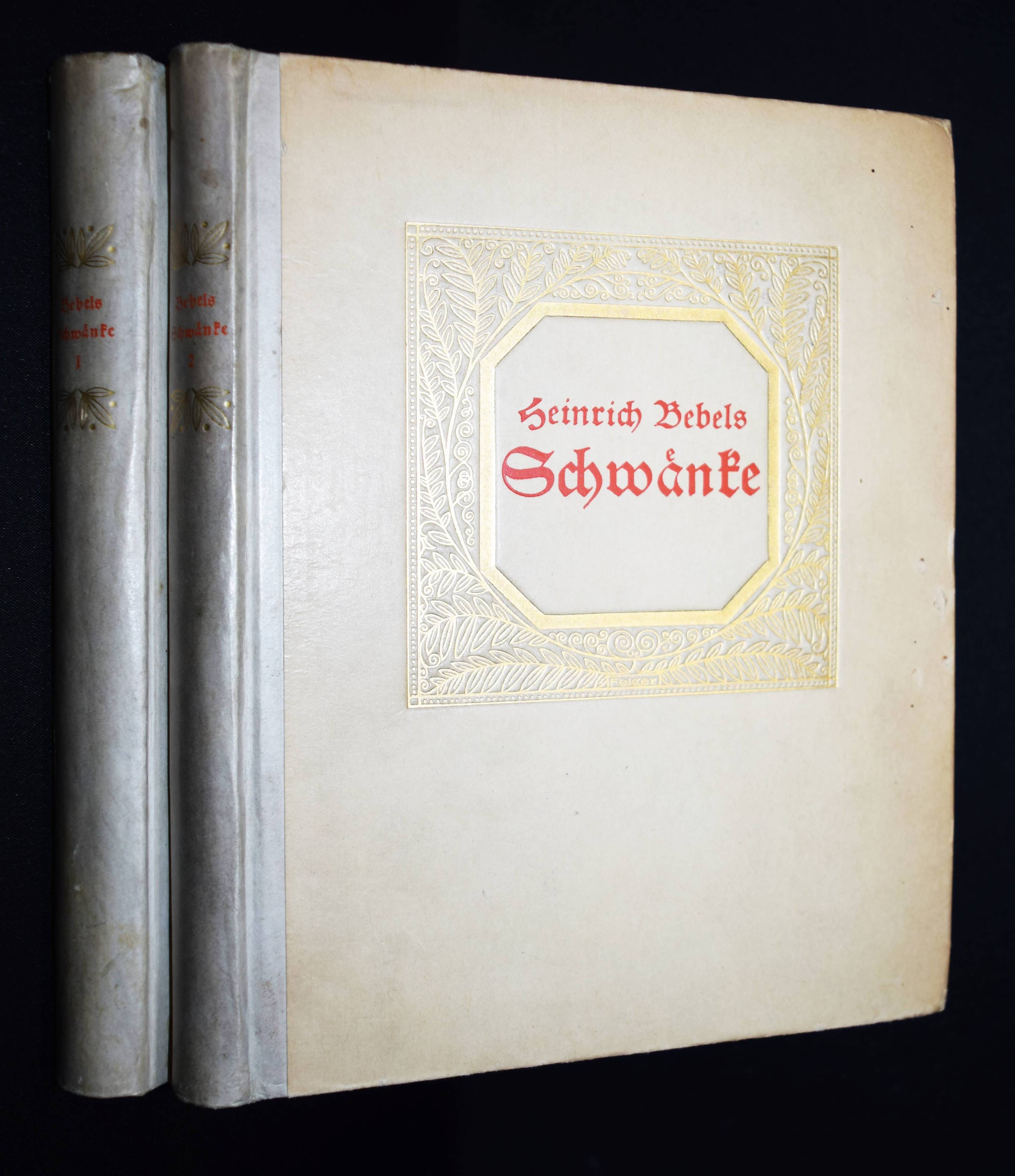 Bebel, Heinrich. Schwänke. Zum ersten Male in vollständiger Übertragung herausgegeben von Albert Wesselski. 2 Bände. München, Leipzig, G. Müller 1907. 8°. XXVII, 241 S.; 212 S. mit Titeln in Schwarz und Rot und Titelvignetten. OHprgt. mit Rücken- und Deckeltitel in Rot sowie Rücken- und Deckelvergoldung. Hayn-Gotendorf I, 195. – Eines von 1000 num. Exemplaren (GA 1035). – „Der Übertragung ist Bebels Ausgabe letzter Hand, die 1514 in Straßburg bei Schürer erschienenen ‚Bebeliana opuscula nova et adolescentiae labores‘, zugrunde gelegt worden, jedoch sind auch die nur in andern Editionen enthaltenen Stücke beigegeben, so daß absolute Vollständigkeit erreicht ist“ (Hayn-Gotendorf). – Schönes Exemplar mit leichten Gebrauchsspuren.