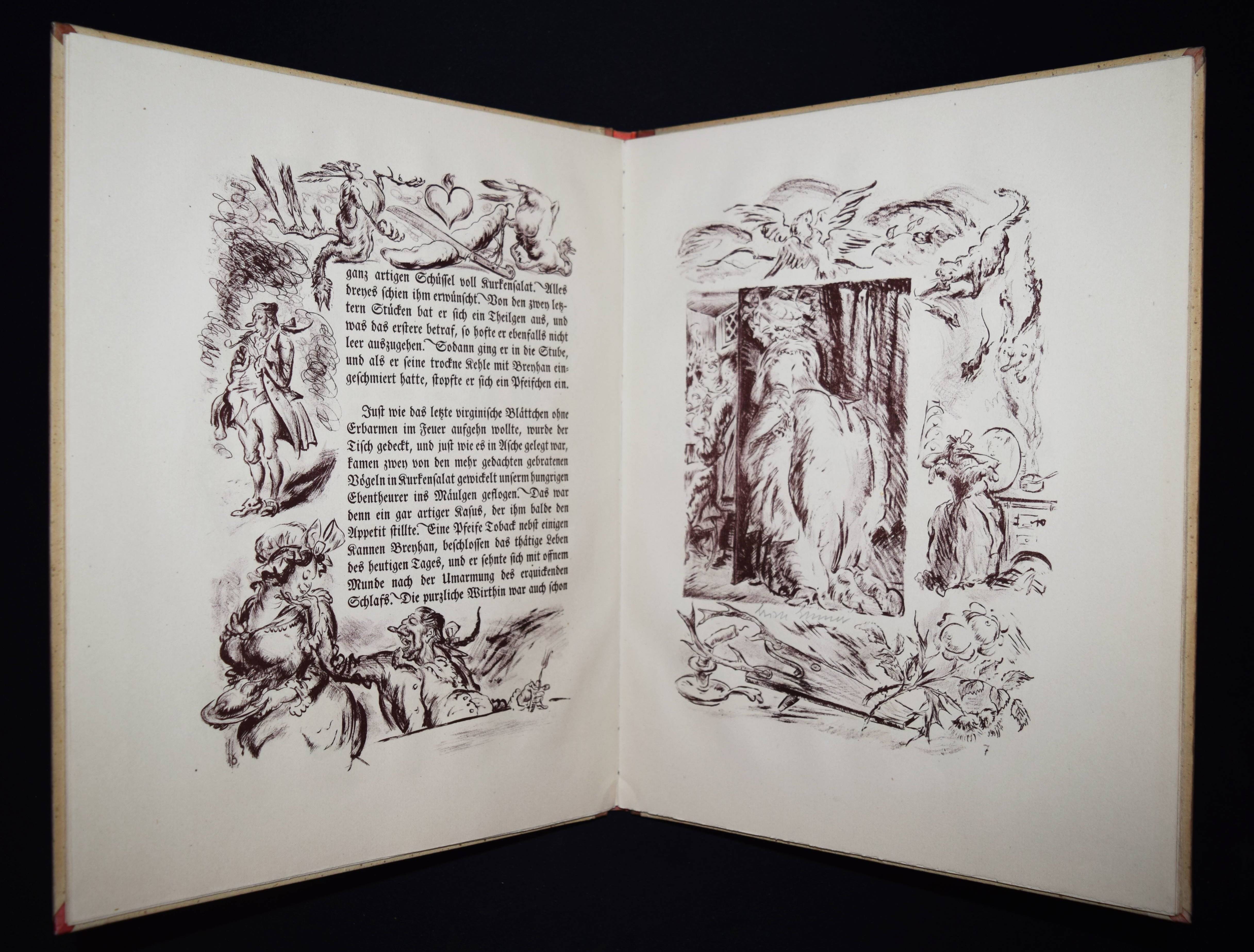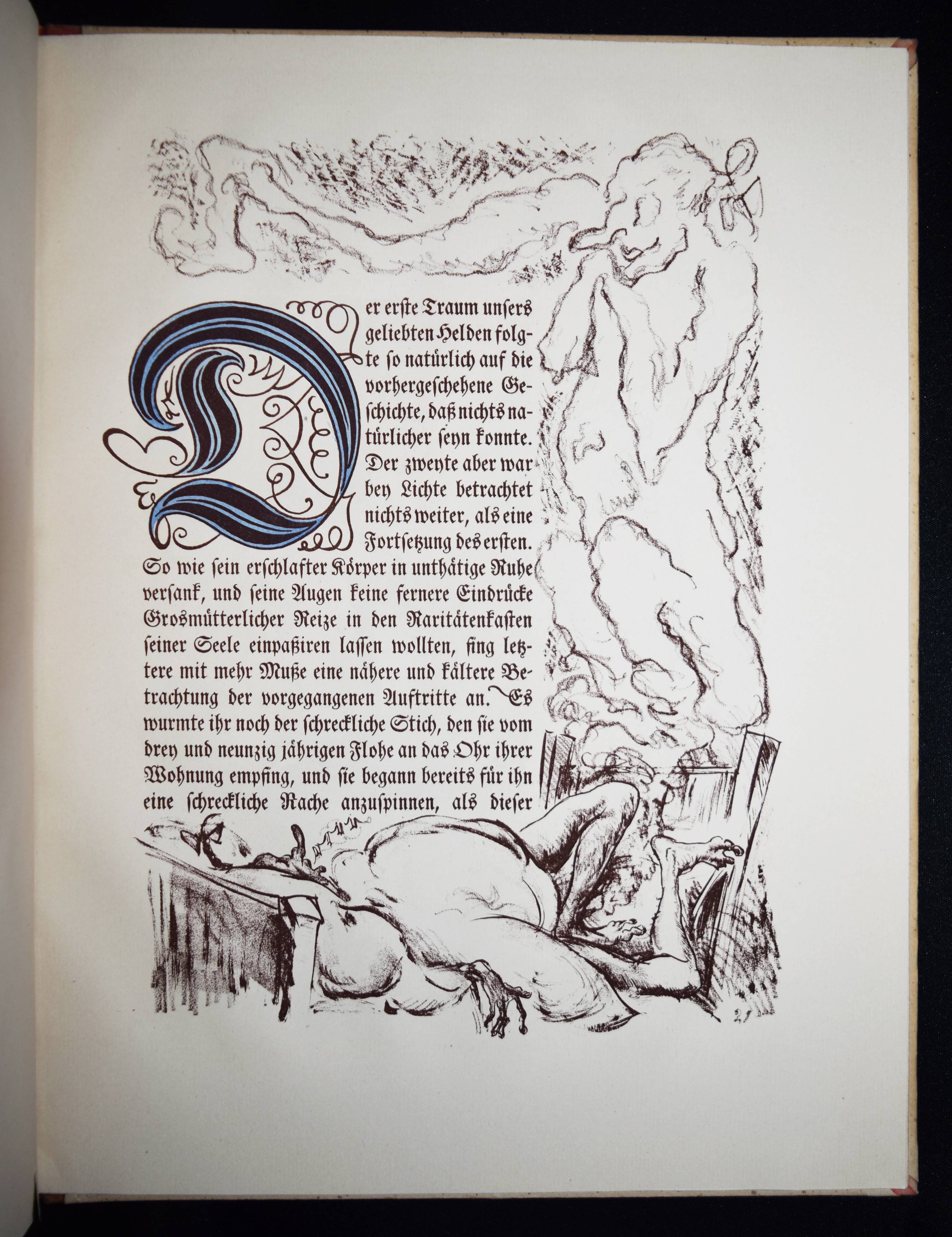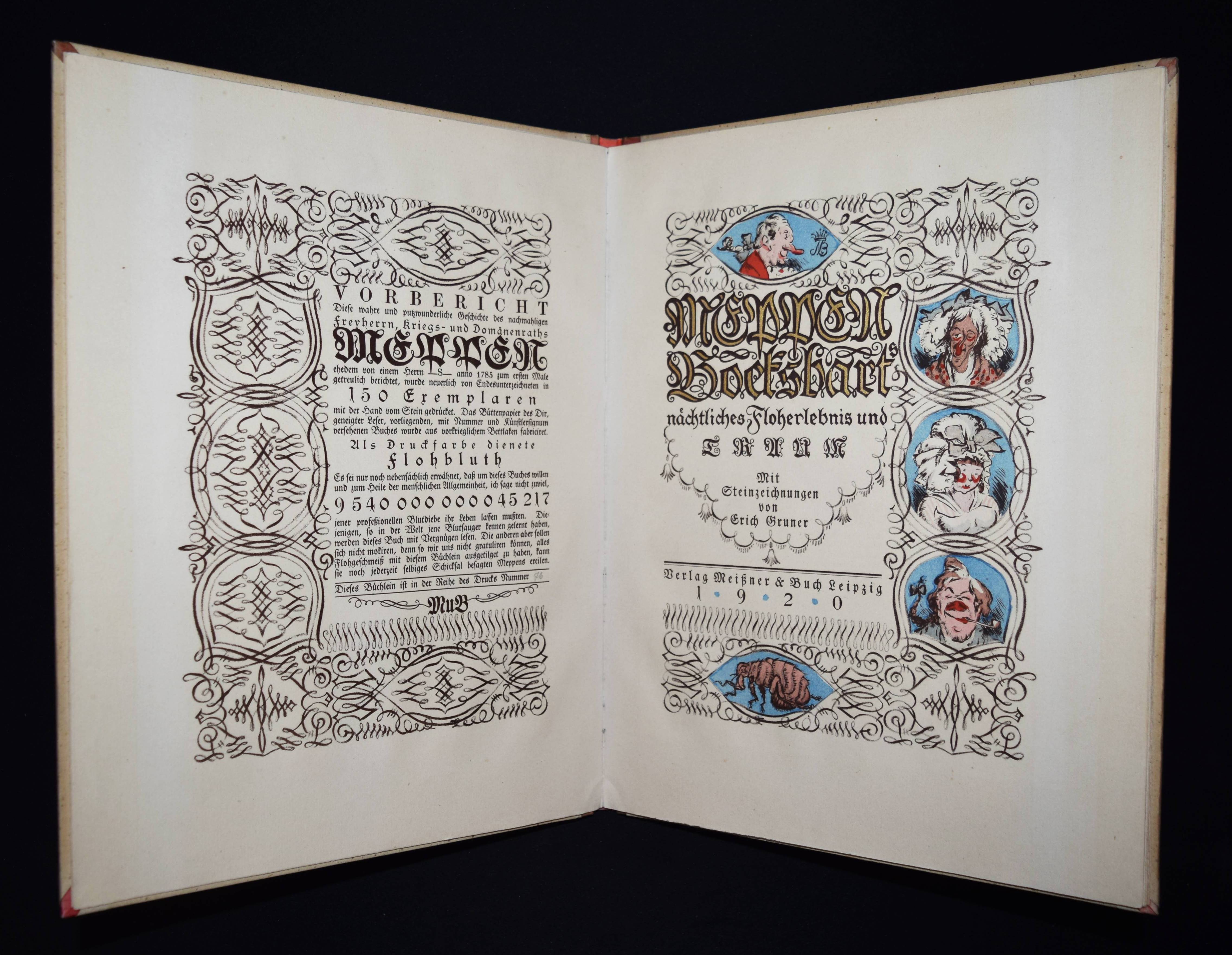 Gruner – (Cramer, Karl Gottlob). Meppen Bocksbart’s nächtliches Floherlebnis und Traum. Mit Steinzeichnungen von Erich Gruner. Leipzig, Meißner & Buch 1920. 4°. 2 Bl., 40 S. mit lithogr. handkol. Titel, 2 handkol. Initialen sowie 34 (10 ganzs.) Lithographien mit eingedr. Text. OPbd. mit Deckelvignette. Nicht bei Sennewald. Vgl. Hayn/Gotendorf I, 403. – Eines von 150 num. Exemplaren. – Im Stil der Malerbücher durchkonzipiertes Buch. Jede Seite ist mit lithographierten Illustrationen umrahmt. – Die beiden Erzählungen erschienen zuerst 1785 in „Meppen Bocksbart oder wundersame Ebentheuer eines peregrinirenden Kandidaten“. – Die Titelbordüre und die beiden Initialen koloriert. – Karl Gottlob Cramer gehörte zu den erfolgreichsten Trivialautoren seiner Zeit. „Allen Romanen Cramers ist eine gehörige Portion bissiger, wenn auch oberflächlicher Zeit- und Sozialkritik beigemischt, seine formale Vielseitigkeit erinnert manchmal an Jean Paul, wie seine geschickten Kolportageeffekte an einen Johannes Mario Simmel. Sein Stil ist in den Ritterromanen ebenso unverkennbar wie in den Satiren, in den Gespenstergeschichten wie in den erotischen Werken“ (R. Wittmann, Zur Trivialliteratur der Goethezeit. Randbemerkungen eines Sammlers. In: Aus dem Antiquariat 1976/Heft V). – Zu dem Leipziger Maler, Buchkünstler und Graphiker Erich Gruner (geb. 1881) vgl. Vollmer II, 325. – Hinterer Deckel mit leichtem Lichtrand, sonst gutes Exemplar.
