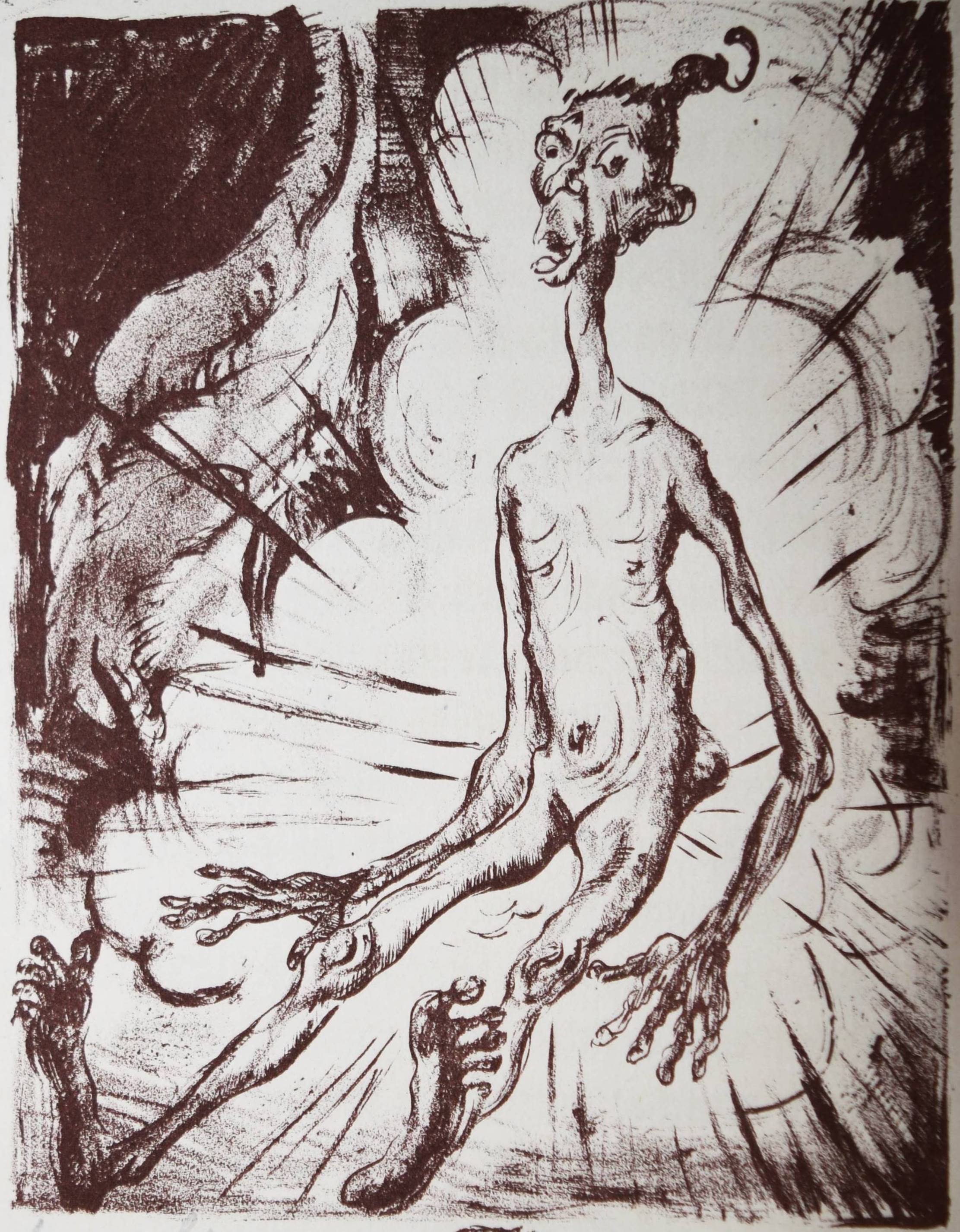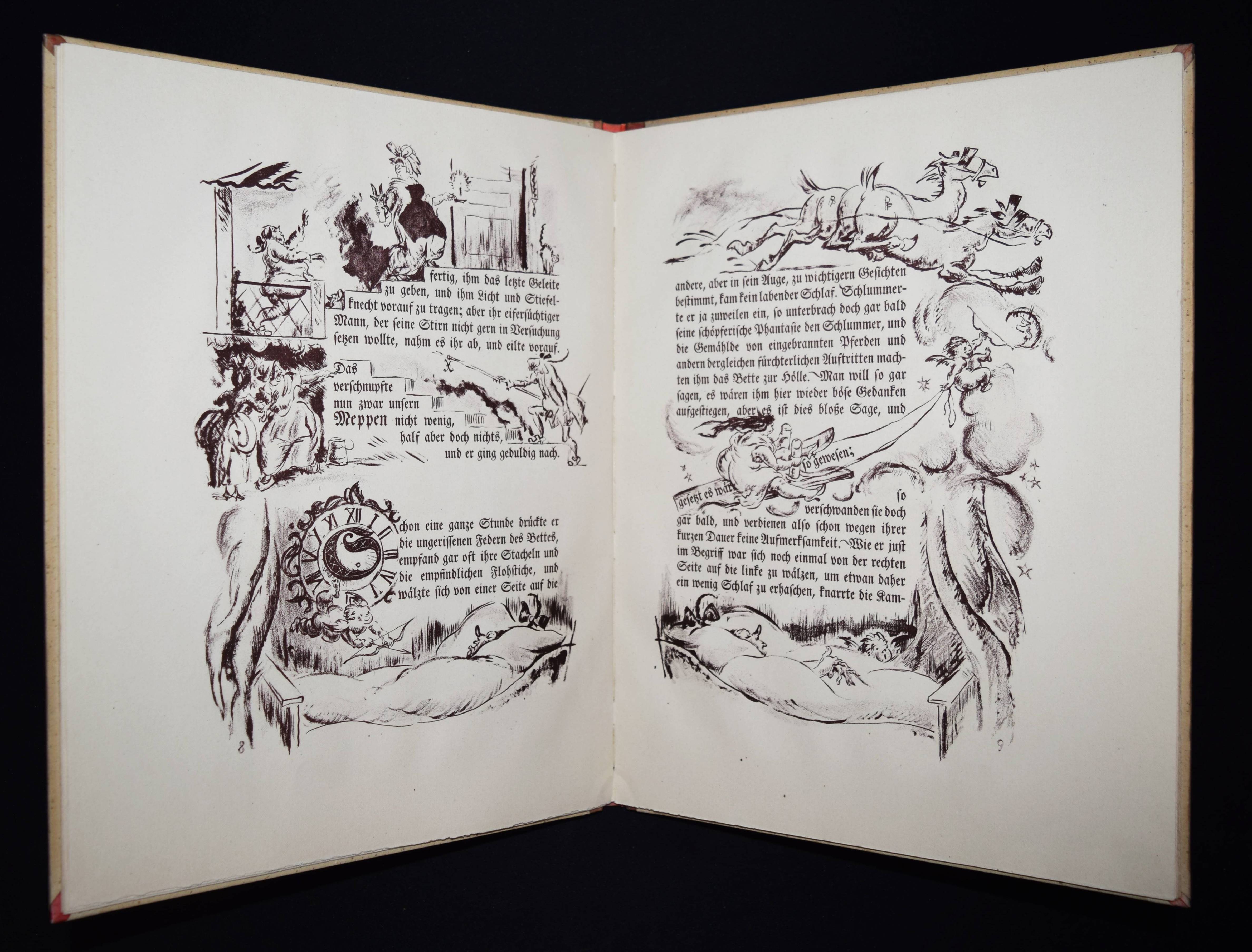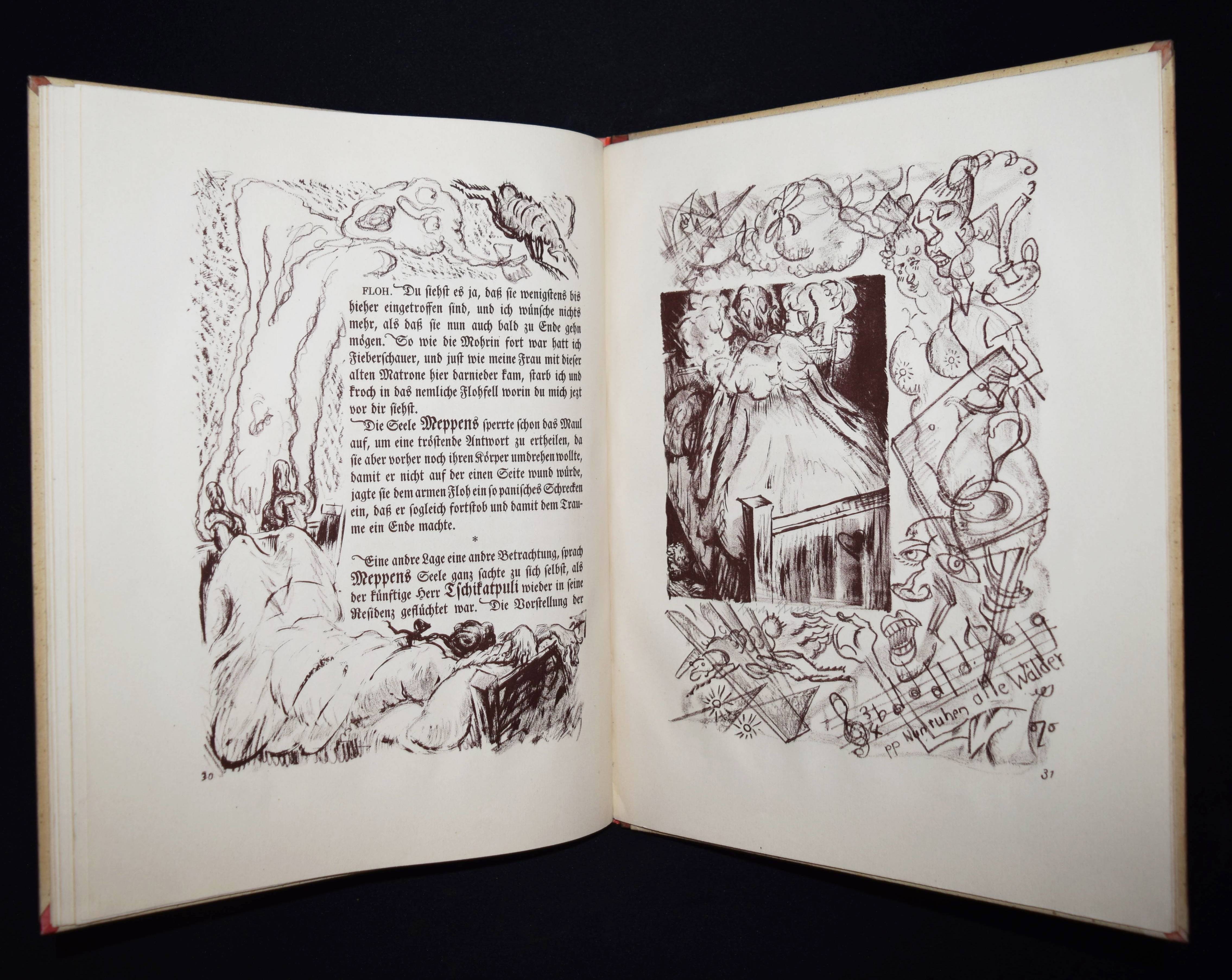 Gruner – (Cramer, Karl Gottlob). Meppen Bocksbart’s nächtliches Floherlebnis und Traum. Mit Steinzeichnungen von Erich Gruner. Leipzig, Meißner & Buch 1920. 4°. 2 Bl., 40 S. mit lithogr. handkol. Titel, 2 handkol. Initialen sowie 34 (10 ganzs.) Lithographien mit eingedr. Text. OPbd. mit Deckelvignette. Nicht bei Sennewald. Vgl. Hayn/Gotendorf I, 403. – Eines von 150 num. Exemplaren. – Im Stil der Malerbücher durchkonzipiertes Buch. Jede Seite ist mit lithographierten Illustrationen umrahmt. – Die beiden Erzählungen erschienen zuerst 1785 in „Meppen Bocksbart oder wundersame Ebentheuer eines peregrinirenden Kandidaten“. – Die Titelbordüre und die beiden Initialen koloriert. – Karl Gottlob Cramer gehörte zu den erfolgreichsten Trivialautoren seiner Zeit. „Allen Romanen Cramers ist eine gehörige Portion bissiger, wenn auch oberflächlicher Zeit- und Sozialkritik beigemischt, seine formale Vielseitigkeit erinnert manchmal an Jean Paul, wie seine geschickten Kolportageeffekte an einen Johannes Mario Simmel. Sein Stil ist in den Ritterromanen ebenso unverkennbar wie in den Satiren, in den Gespenstergeschichten wie in den erotischen Werken“ (R. Wittmann, Zur Trivialliteratur der Goethezeit. Randbemerkungen eines Sammlers. In: Aus dem Antiquariat 1976/Heft V). – Zu dem Leipziger Maler, Buchkünstler und Graphiker Erich Gruner (geb. 1881) vgl. Vollmer II, 325. – Hinterer Deckel mit leichtem Lichtrand, sonst gutes Exemplar.