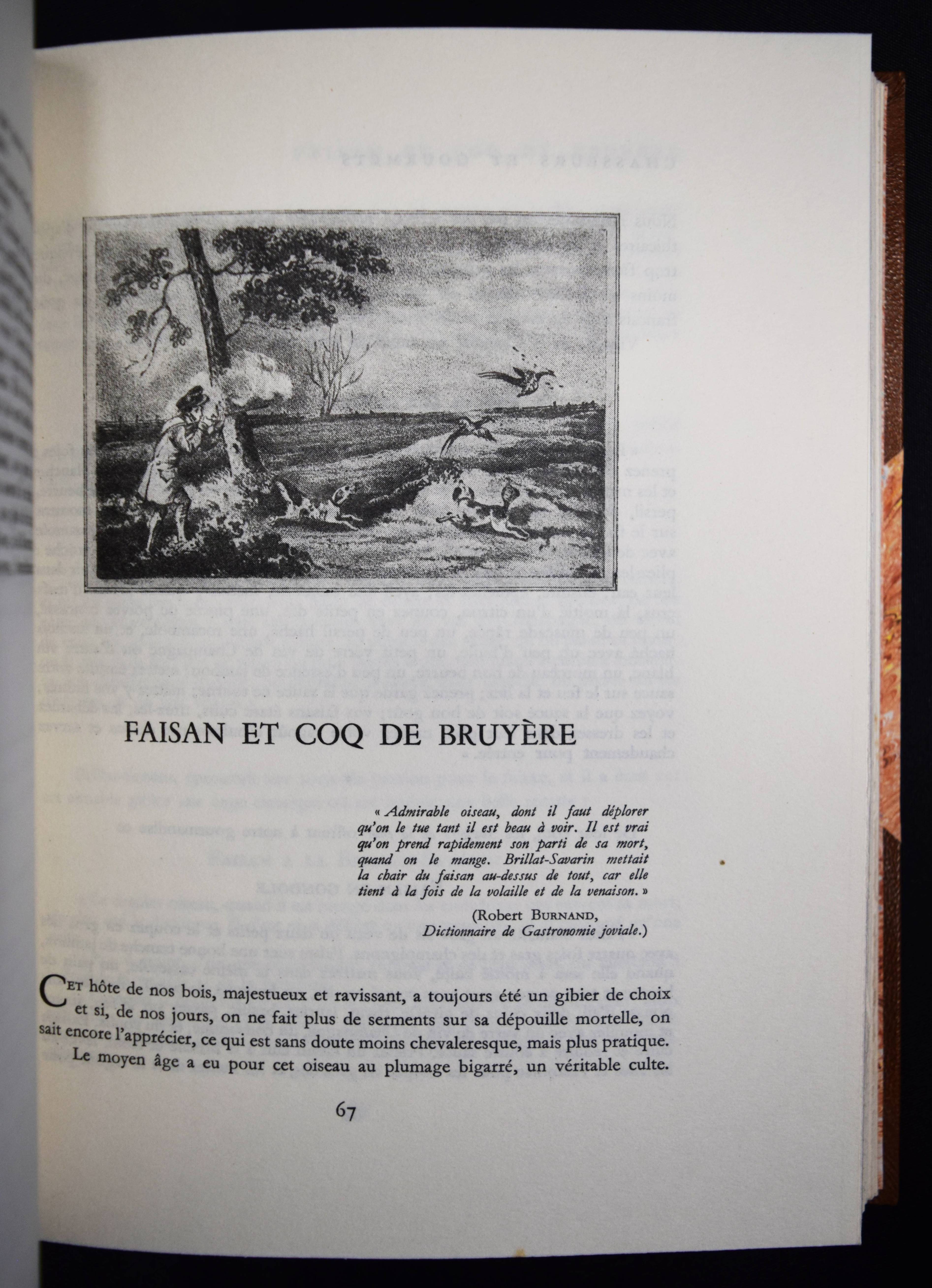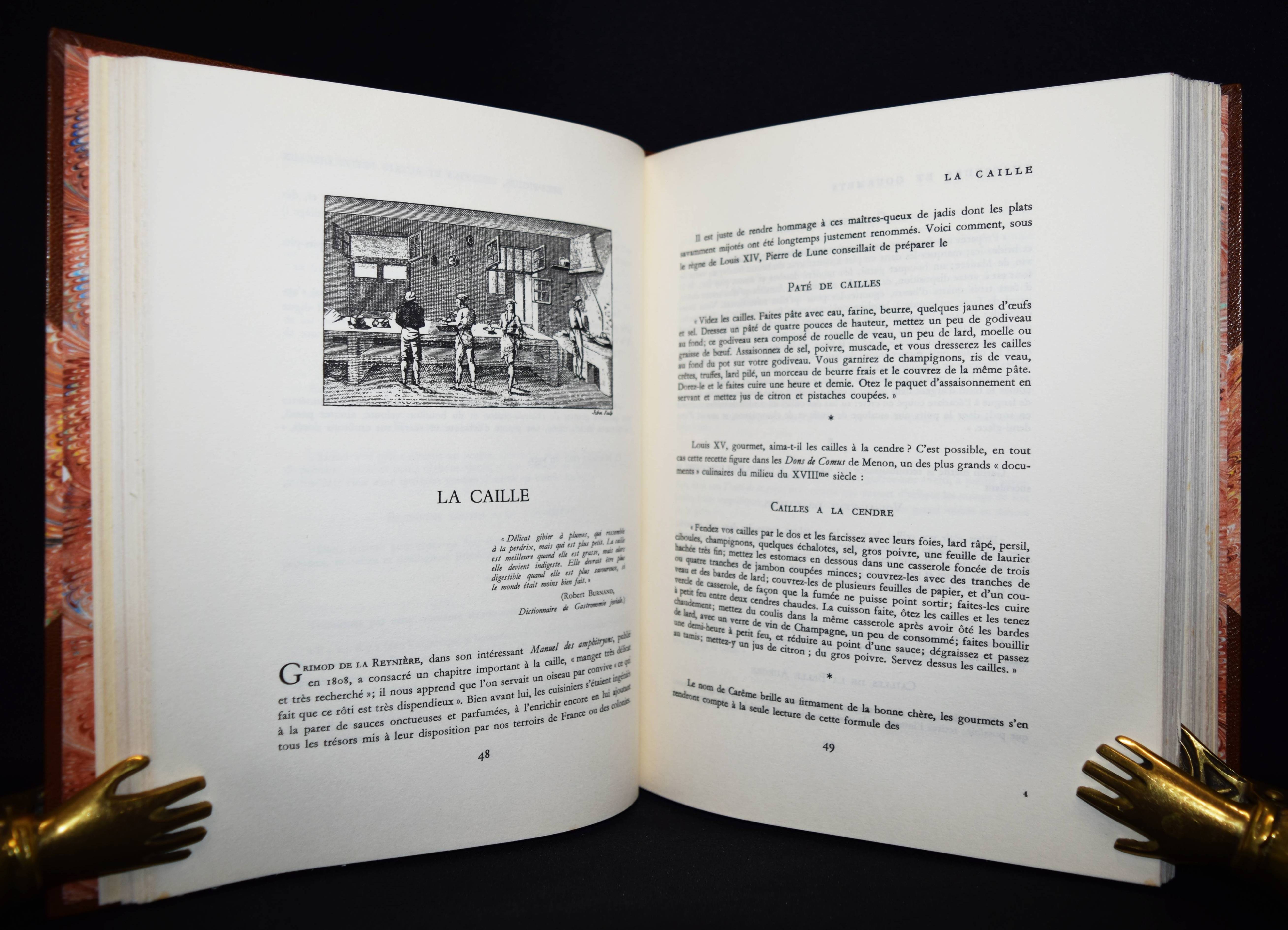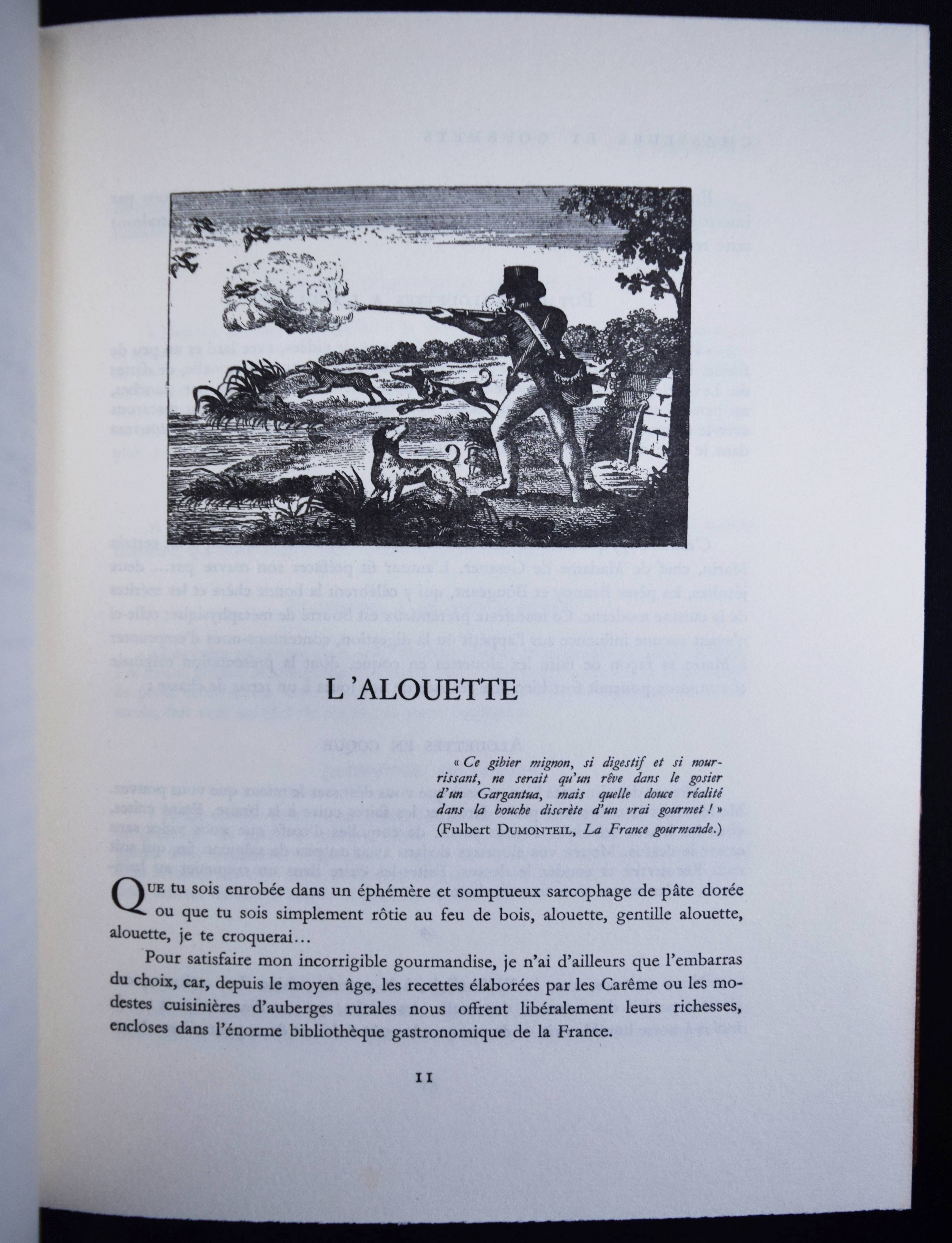 Vaultier, Roger Chasseurs et gourmets ou L’art d’accomoder le gibier. Préface de Curnonsky (d. i. Maurice-Louis Sailland). Paris, Crépin-Leblond et Cie. (1951). Gr.-8°. 256 S., [1] Bl. mit illustr. Titel und zahlr. Abb. Hldr. der Zeit mit goldgepr. Rückentitel und Kopfgoldschnitt (illustr. Orig.-Umschlag beigebunden). Eines von 2490 Exemplaren auf Papier Fleur d’Alfa (GA 2500 Exemplare). – Einzige Ausgabe des schön ausgestatteten Wild-Kochbuchs. – „Tayaut ! Tayaut ! Voici, plumes et poils, un des meilleurs recueils de recettes pour cuisiner le gibier: 32 bêtes à plumes ou parmi les gastronomiquement corrects canards, cailles, bécasses, gélinottes, ortolans et autres sarcelles on peut cependant hésiter devant les corbeaux, vanneaux, geais et pies.– Dans le poil aussi signalons quelques bizarreries: les blaireaux, loirs, loutres, loups (dont on peut dissimuler la chair dans les bouchées à la reine) et autres gibiers d’aventure viennent semer l’effroi parmi les lièvres à la royale, les filets mignons de sanglier à la sauce Robert et garennes à la Marengo.– Suivent des recettes de sauces, fonds et fumets“ (Préface). – R. Vaultier (1908-1960) hat zahlreiche Werke zum Thema Wein und Gastronomie herausgegeben. – Sehr schönes dekorativ gebundenes Exemplar.