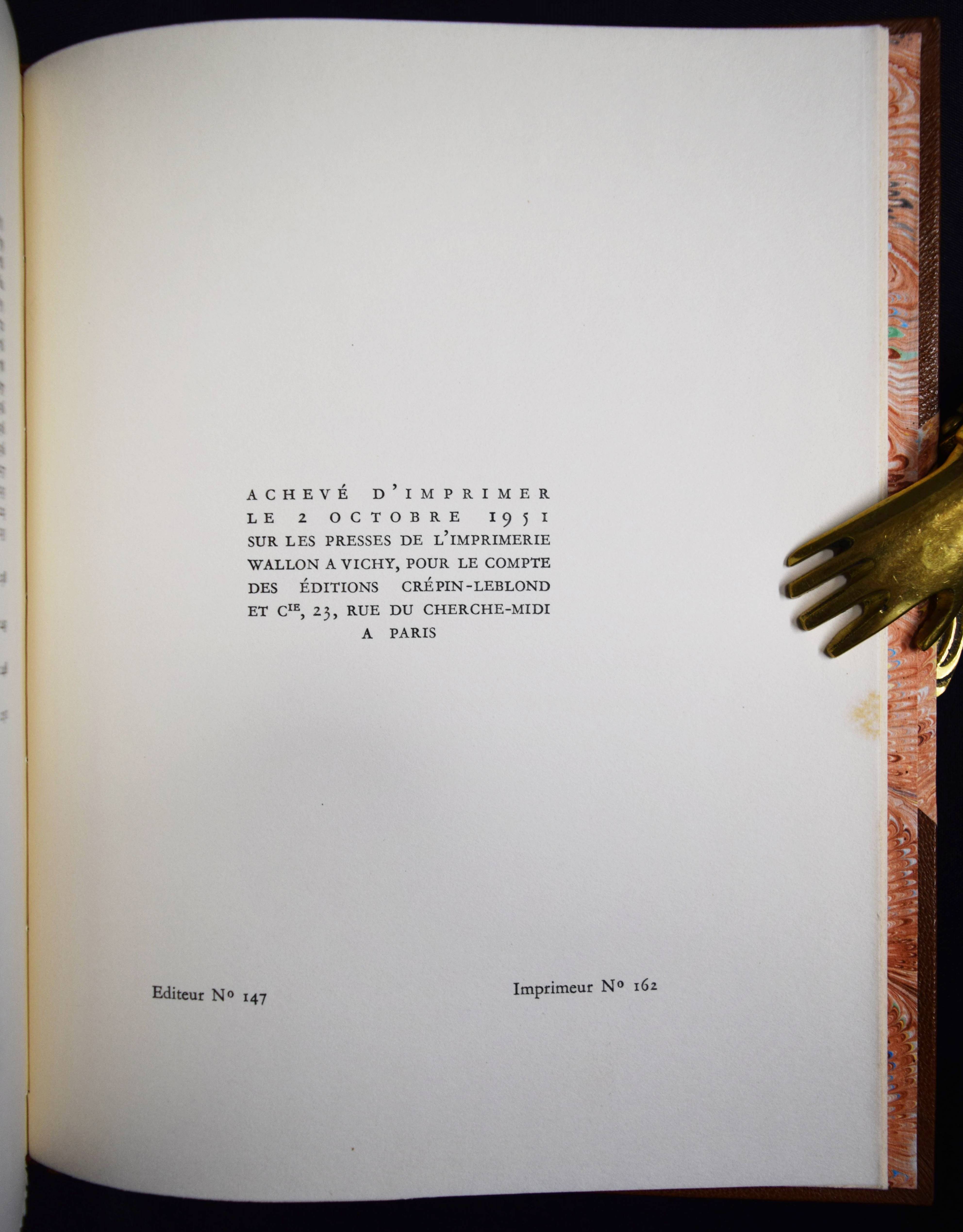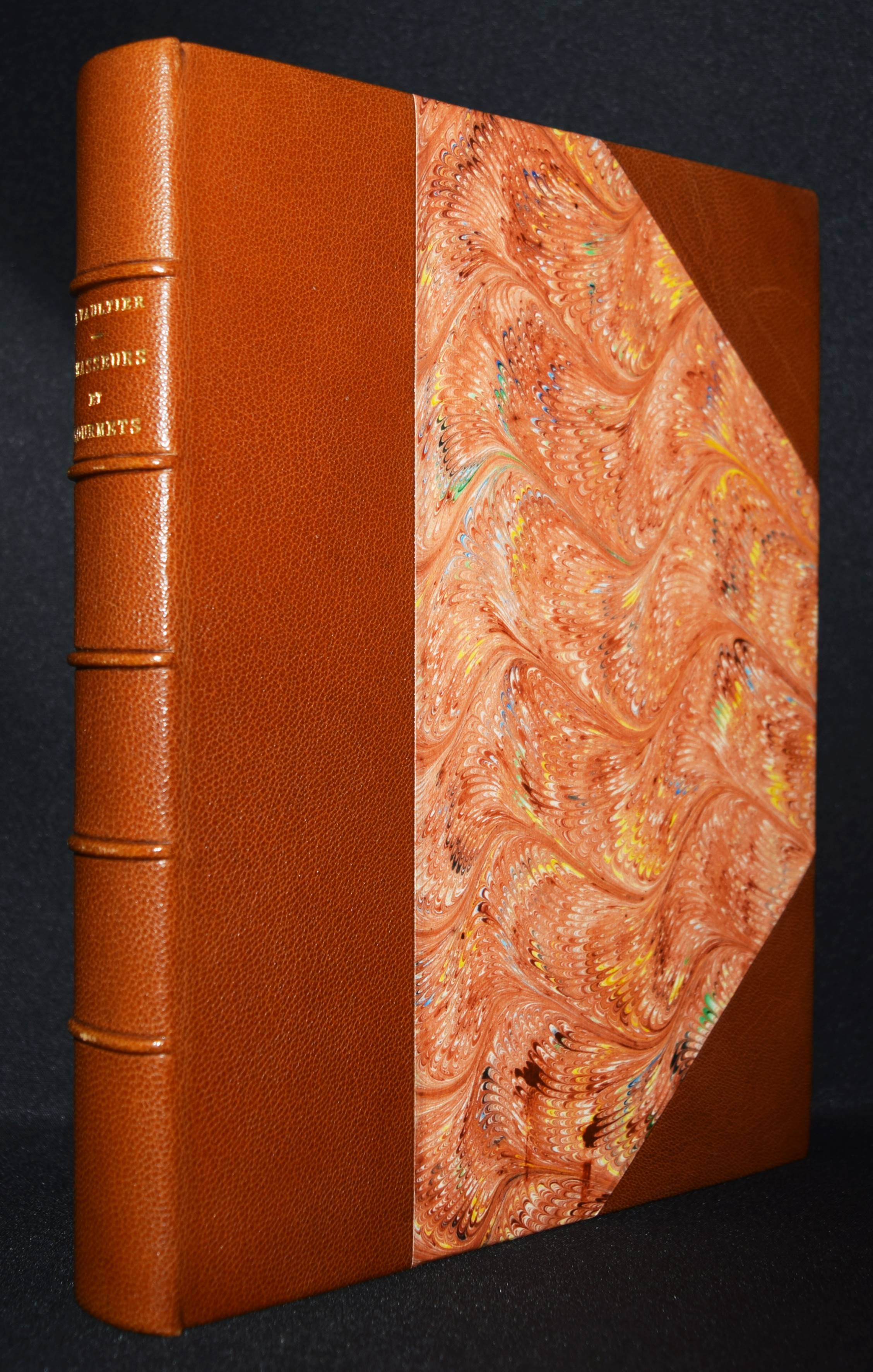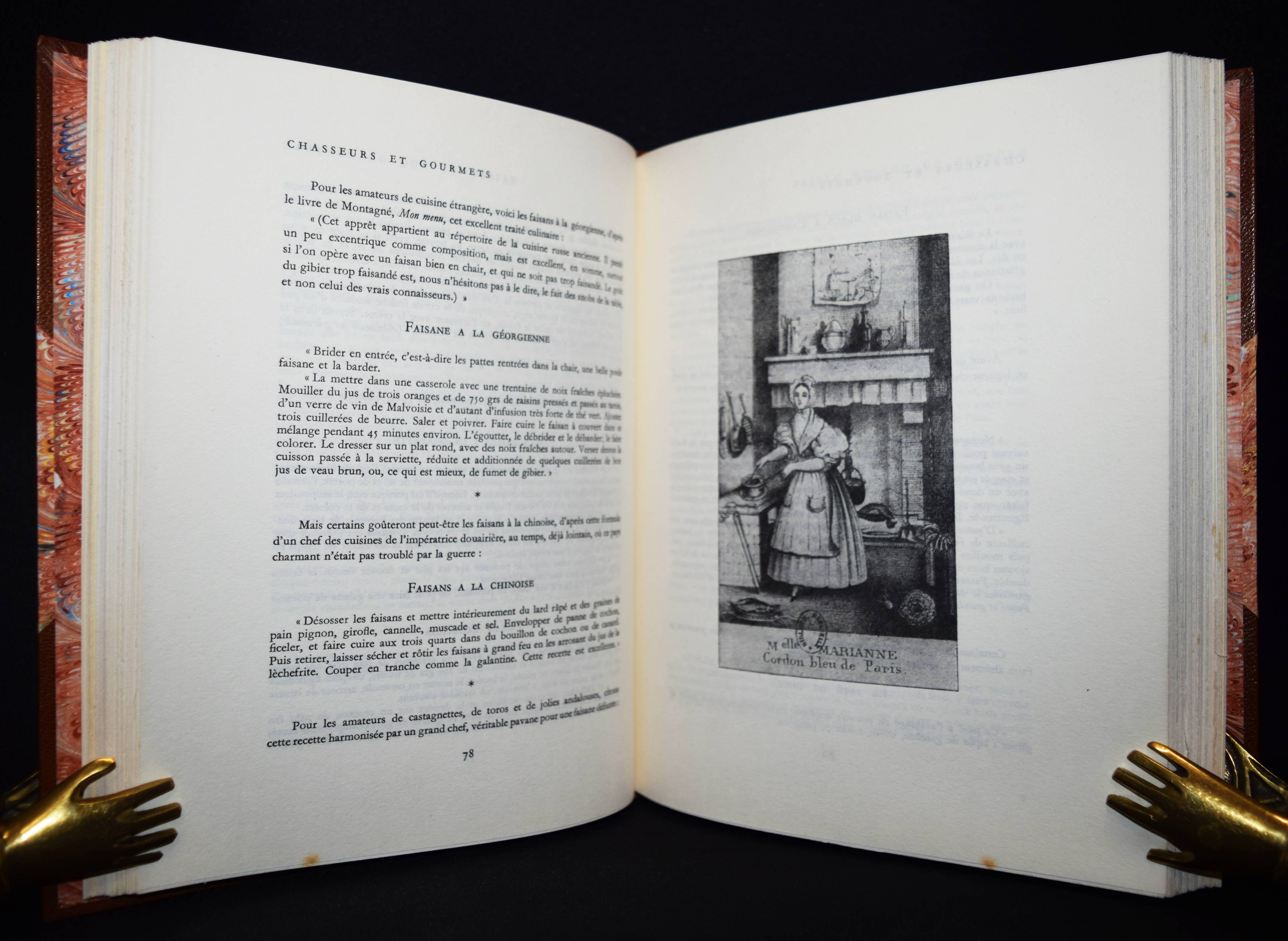 Vaultier, Roger Chasseurs et gourmets ou L’art d’accomoder le gibier. Préface de Curnonsky (d. i. Maurice-Louis Sailland). Paris, Crépin-Leblond et Cie. (1951). Gr.-8°. 256 S., [1] Bl. mit illustr. Titel und zahlr. Abb. Hldr. der Zeit mit goldgepr. Rückentitel und Kopfgoldschnitt (illustr. Orig.-Umschlag beigebunden). Eines von 2490 Exemplaren auf Papier Fleur d’Alfa (GA 2500 Exemplare). – Einzige Ausgabe des schön ausgestatteten Wild-Kochbuchs. – „Tayaut ! Tayaut ! Voici, plumes et poils, un des meilleurs recueils de recettes pour cuisiner le gibier: 32 bêtes à plumes ou parmi les gastronomiquement corrects canards, cailles, bécasses, gélinottes, ortolans et autres sarcelles on peut cependant hésiter devant les corbeaux, vanneaux, geais et pies.– Dans le poil aussi signalons quelques bizarreries: les blaireaux, loirs, loutres, loups (dont on peut dissimuler la chair dans les bouchées à la reine) et autres gibiers d’aventure viennent semer l’effroi parmi les lièvres à la royale, les filets mignons de sanglier à la sauce Robert et garennes à la Marengo.– Suivent des recettes de sauces, fonds et fumets“ (Préface). – R. Vaultier (1908-1960) hat zahlreiche Werke zum Thema Wein und Gastronomie herausgegeben. – Sehr schönes dekorativ gebundenes Exemplar.