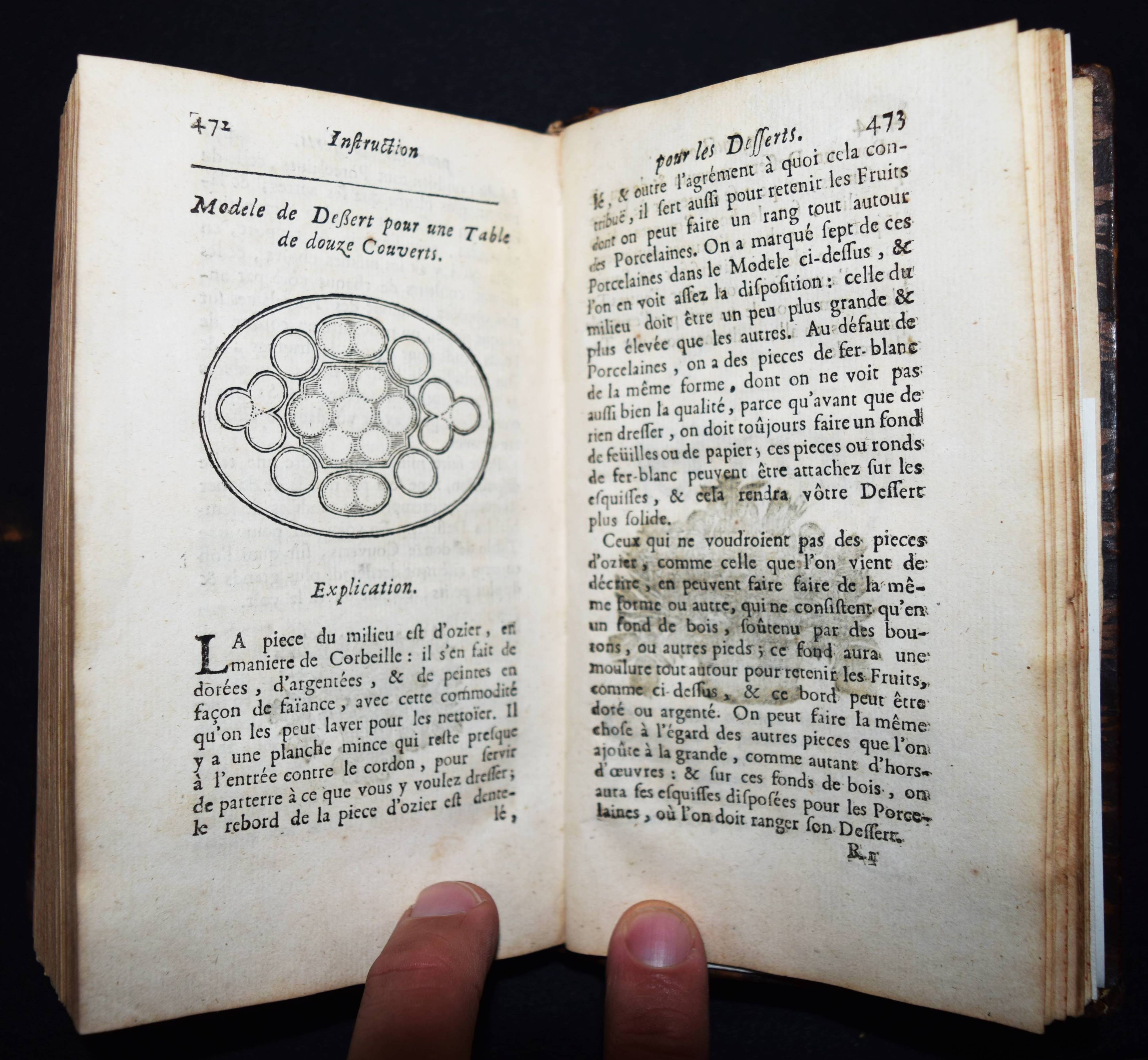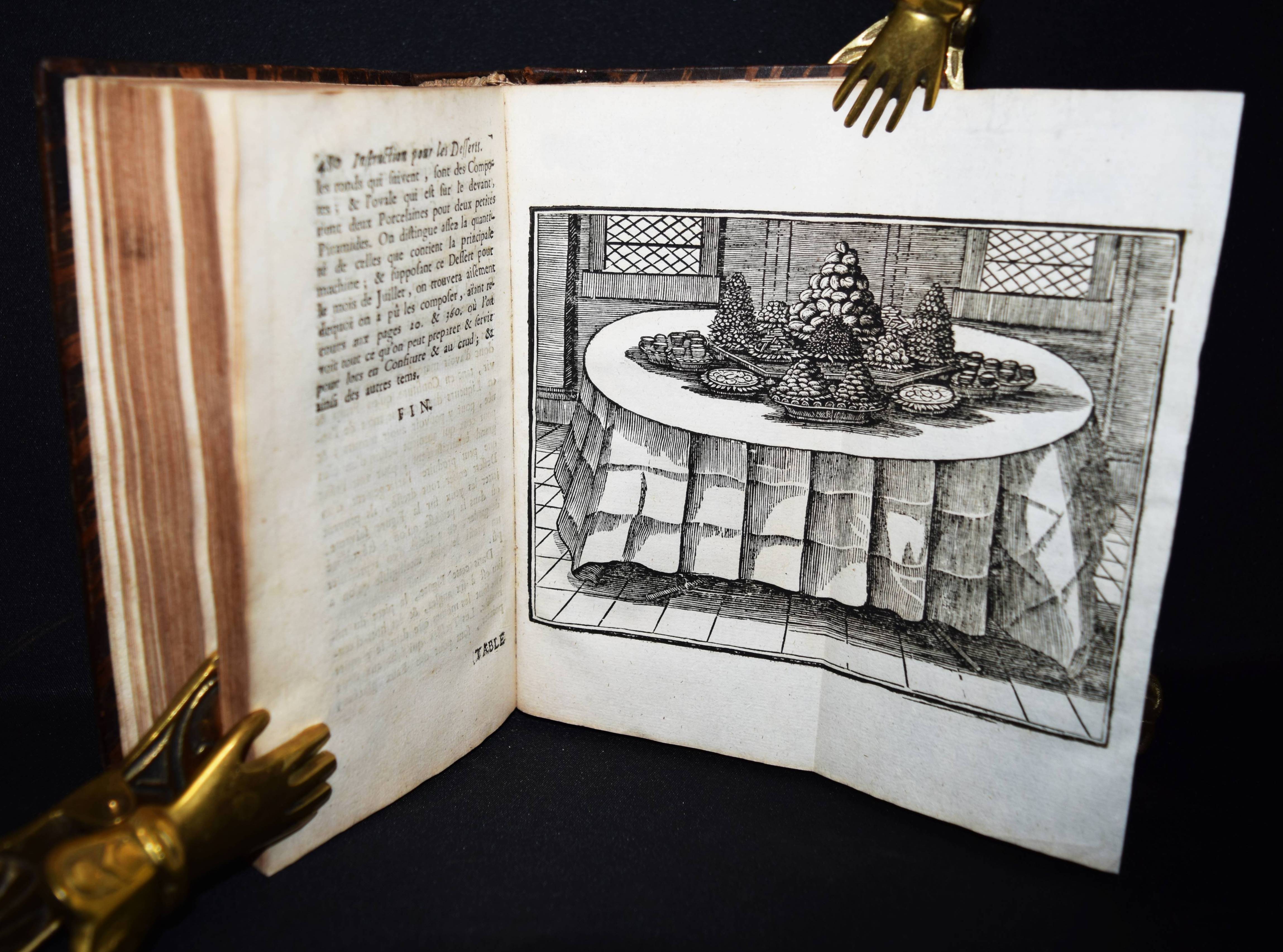 (Massialot, François). Nouvelle isntruction [sic !] pour les confitures, les liqueurs et les fruits. Avec la maniere de bien ordonner un dessert, & tout le reste qui est du devoit des maîtres d’hôtels, sommeliers, confiseurs, & autres officiers de bouche. Suite du cuisinier roial & bourgeois. Egalement utile dans les familles, pour sçavoir ce qu’on sert de plus à la mode dans les repas, & en d’autres accasions. Nouvelle Edition, revué, corrigée, & beaucoup augmentée. Paris, Claude Prudhomme 1704. Kl.-8° (17 x 10 cm.). [12] Bl., 480 S., [11 statt 12] Bl. mit 2 Holzschnitten im Text, 1 gefalt. Holzschnitt-Tafel und einigen Schmuck-Vignetten. Kalbslederband der Zeit mit goldgepr. Rückenschild und reicher floraler Rückenvergoldung. Bitting 584. Horn-Arndt 169 u. 170. Oberlé 78, 94 f. Vicaire 454. – Frühe Ausgabe des zuerst 1692 erschienenen berühmten franz. Dessert- und Konditor-Rezeptbuchs. Spätere Ausgabe erschienen mit dem Titel „Le Confiturier Royal“. Nach „Le cuisinier roïal et bourgeois“ das zweite erfolgreiche Kochbuch des berühmten Küchenchefs. – F. Massialot (1660-1733), seinerzeit der berühmteste Koch Frankreichs, er war Hofkoch zahlreicher bedeutender Persönlichkeiten des Adels, darunter Philippe I., Herzog von Orléans, der Bruder von Ludwig XIV., und dessen Sohn Philippe II., Herzog von Orléans. „Massialot beschreibt sich selbst in seinem Vorwort als „einen Koch, der es wagt, sich als königlich zu bezeichnen, und das nicht ohne Grund, denn die Mahlzeiten, die er beschreibt … wurden alle bei Hofe oder in den Häusern von Fürsten und Leuten ersten Ranges serviert.“ Zu den Orten, an denen Massialot Bankette gab, gehörten das Château de Sceaux, das Château de Meudon und Versailles. Eine Neuerung in Massialots Buch war die alphabetische Anordnung der Rezepte, „ein Schritt in Richtung des ersten kulinarischen Wörterbuchs“, bemerkt Barbara Wheaton. Wheaton hat die Änderungen in den verschiedenen Ausgaben von Massialot verglichen: Ein Glas Weißwein in einer Fischbrühe taucht überraschend spät auf, nämlich im Jahr 1703. Baisers tauchen unter ihrem bekannten Namen erstmals bei Massialot auf, dem auch die Crème Brûlée zugeschrieben wird, bei der die Zuckerglasur geschmolzen und mit einer glühenden Feuerschaufel verbrannt wurde“ (Wikipedia aus dem engl. Übersetzt). – Einband etwas berieben, das letzte Registerblatt (W-Z) und der hintere freie Vorsatz fehlen, gutes dekorativ gebundenes Exemplar.