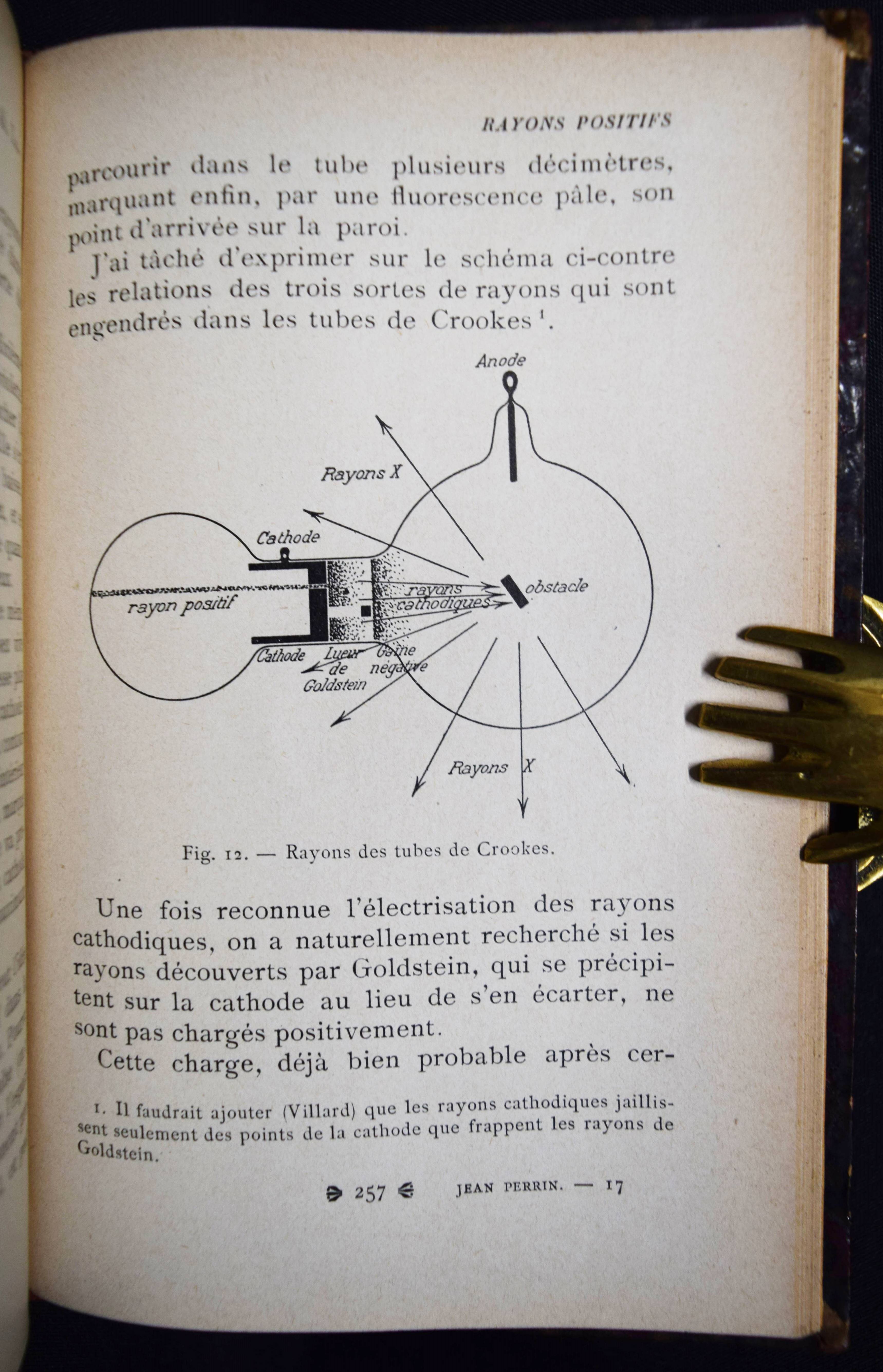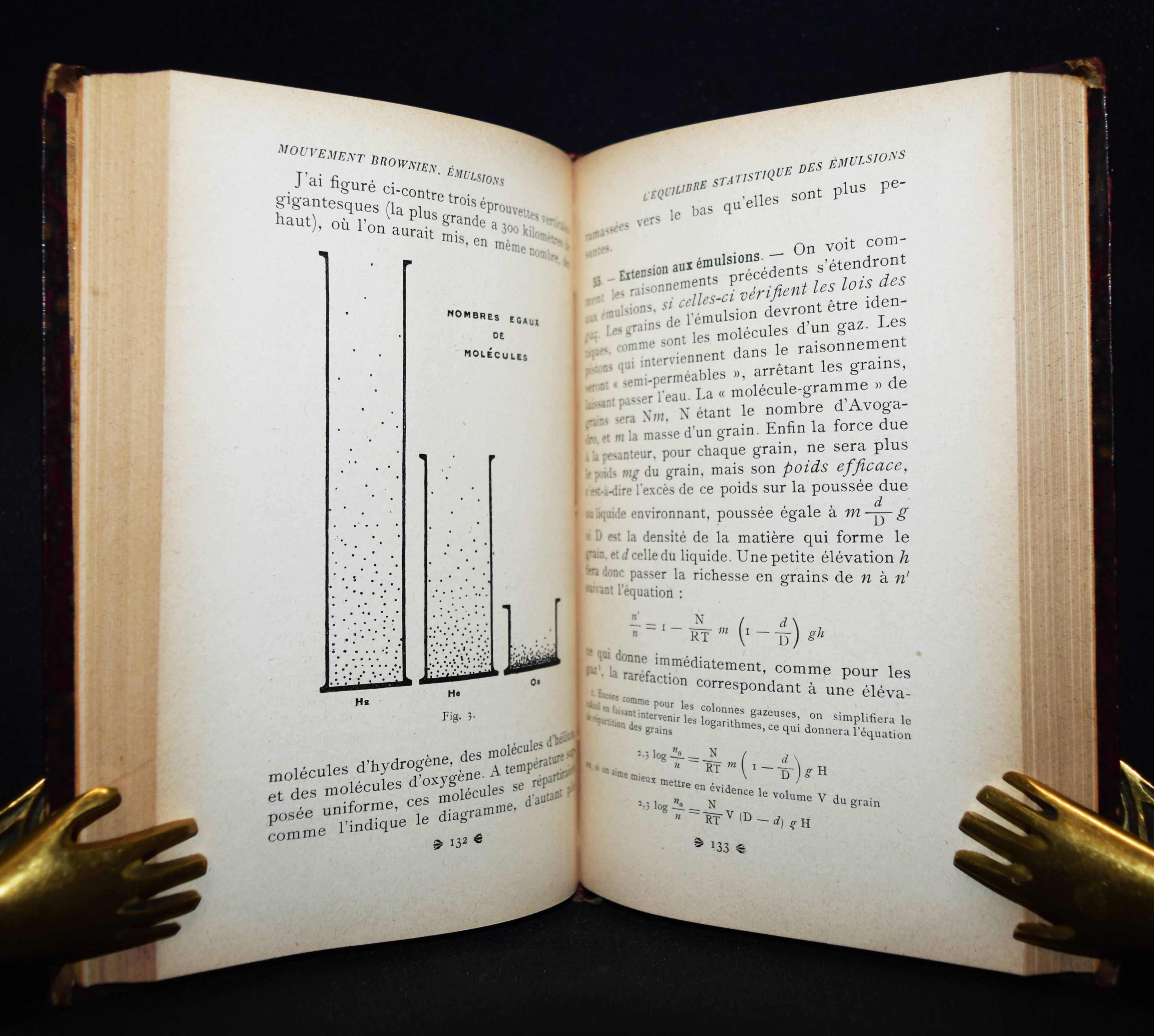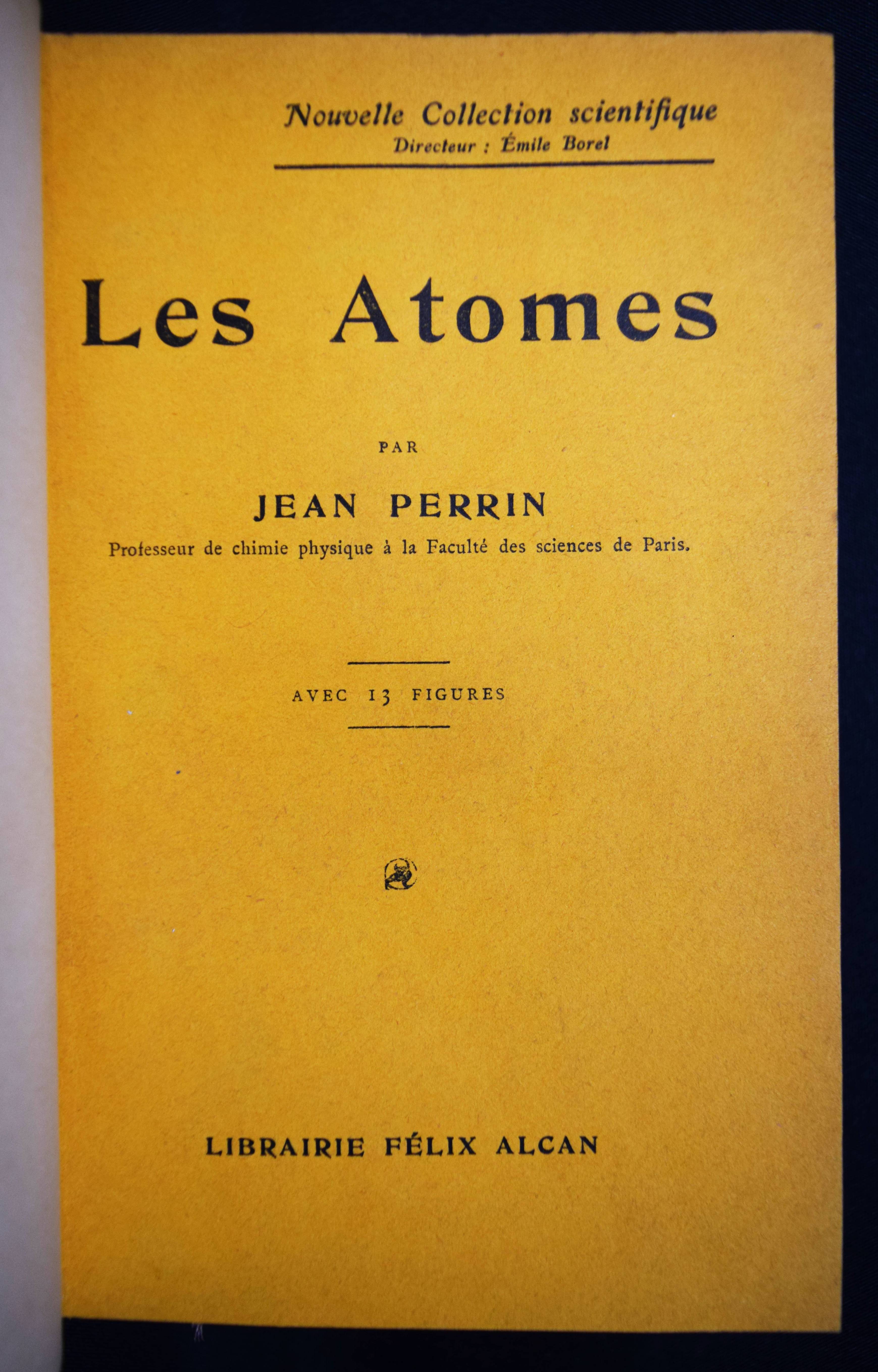 Perrin, Jean (Baptiste). Les atomes. Paris, Félix Alcan 1913. 8°. XVI, 295, (1) S. mit 13 Figuren. Weinroter Hldr. der Zeit mit goldgepr. Rückentitel (typogr. Orig.-Umschlag beigebunden). (Nouvelle Collection Scientifique). DSB X, 525. Nye, Molecular Reality S. 157 ff. – Erste Ausgabe, selten. – „Perrin most fondamental conclusion that he had finally uncovered irrefutable proof for the real existence of atoms – contrary to the assertions and expectations of Ostwald, Mach and others – was soon universally accepted and popularized in his book ‚Les atomes‘ (1913). He received the Nobel Prize in 1926“ (DSB). – „The publication of this book loomed as a MILESTONE in Perrin’s own career, as well as in the history of the physical sciences. It marked the alliance of a plethora of superficially unrelated phenomena, as well as the incorporation of the common denominator among them into the normal working assumptions of physics and chemistry. First published in 1913, the book was in its fourth edition in 1914 already and was translated into English, German, Polish, Russian, Serbian and Japanese. The response to the publication was an almost unanimous crescendo of applause“ (W. Alicke, Catalogue 269, 475). – Sehr gutes dekorativ gebundenes Exemplar.