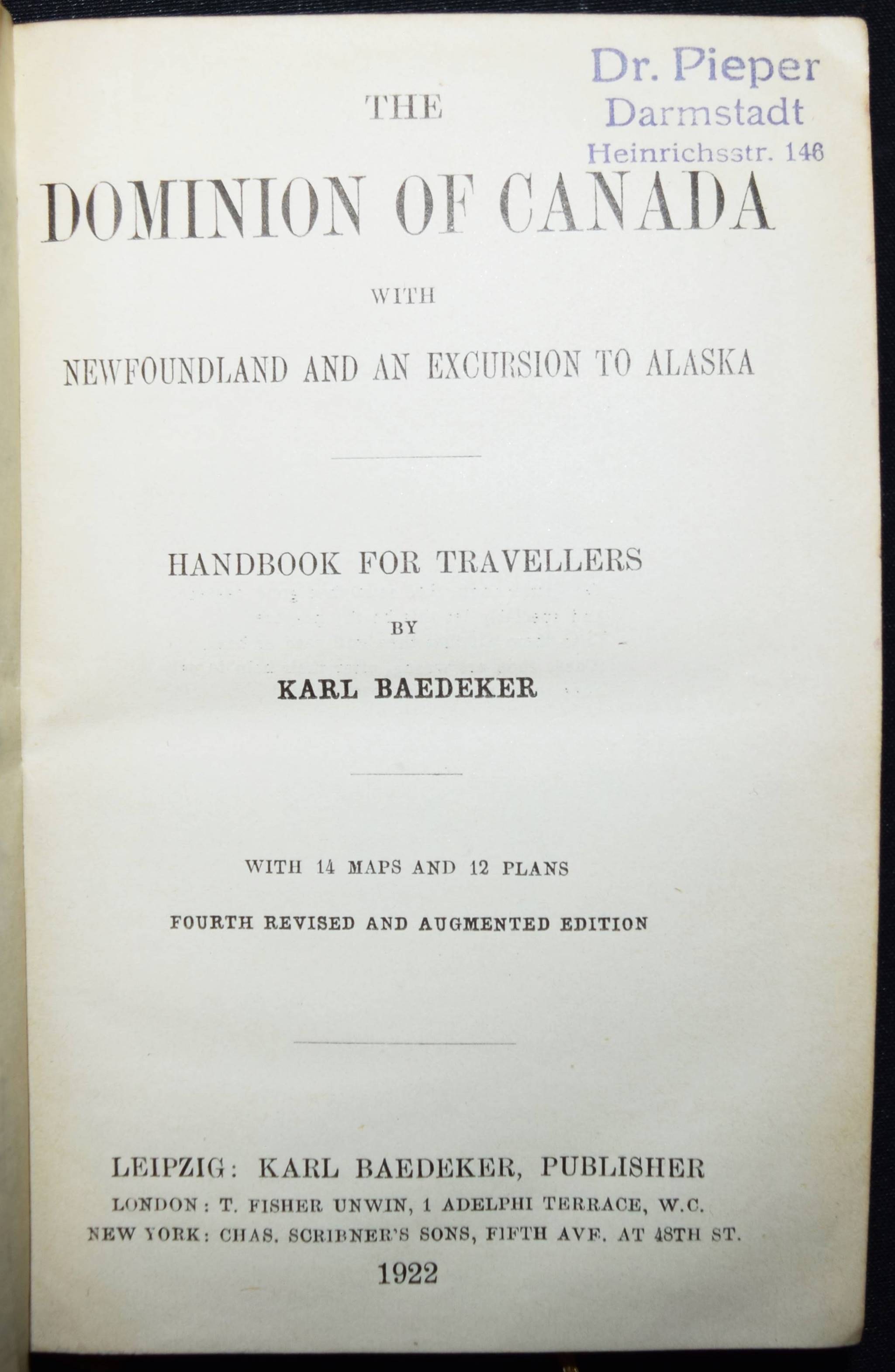 Baedeker, Karl. The dominion of Canada with Newfoundland and an excursion to Alaska. Handbook for travellers. 4th revised and augmented edition. Leipzig, Baedeker 1922. Kl.-8°. LXX, 420 S. with 14 maps and 12 plans. OLn. mit goldgepr. Rücken- und Deckeltitel. Hinrichsen E 265. – St.a.T., sehr gutes Exemplar der besten Ausgabe.