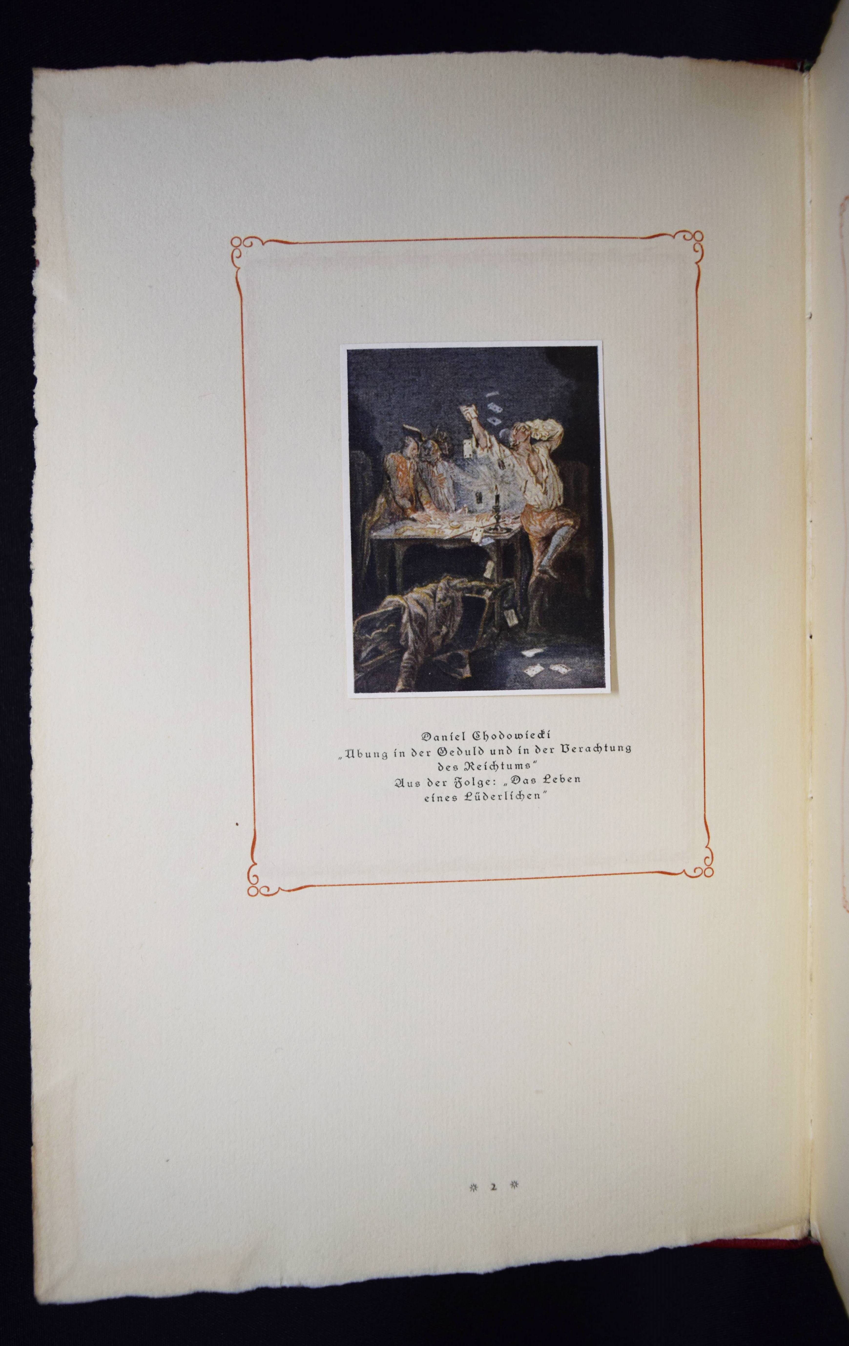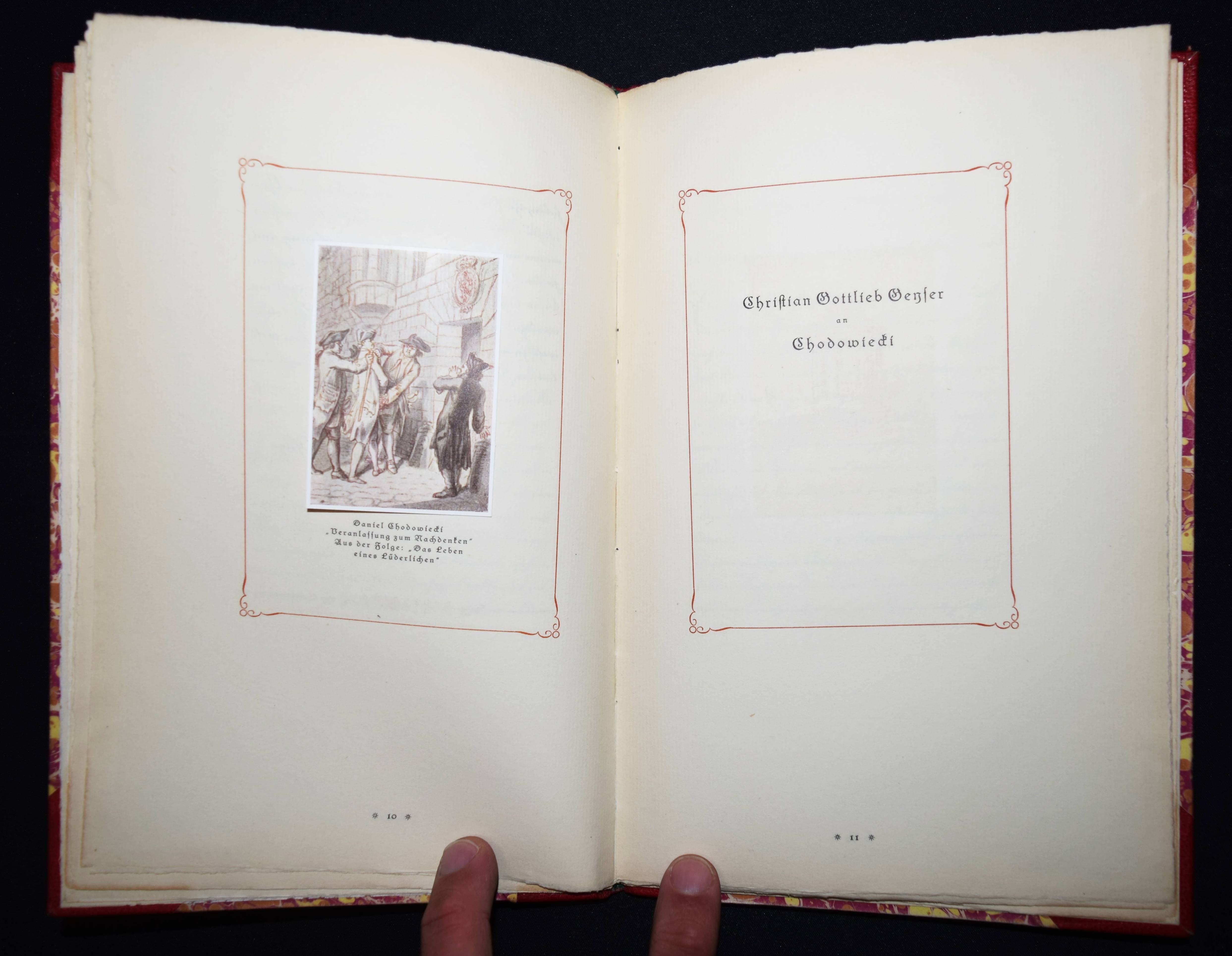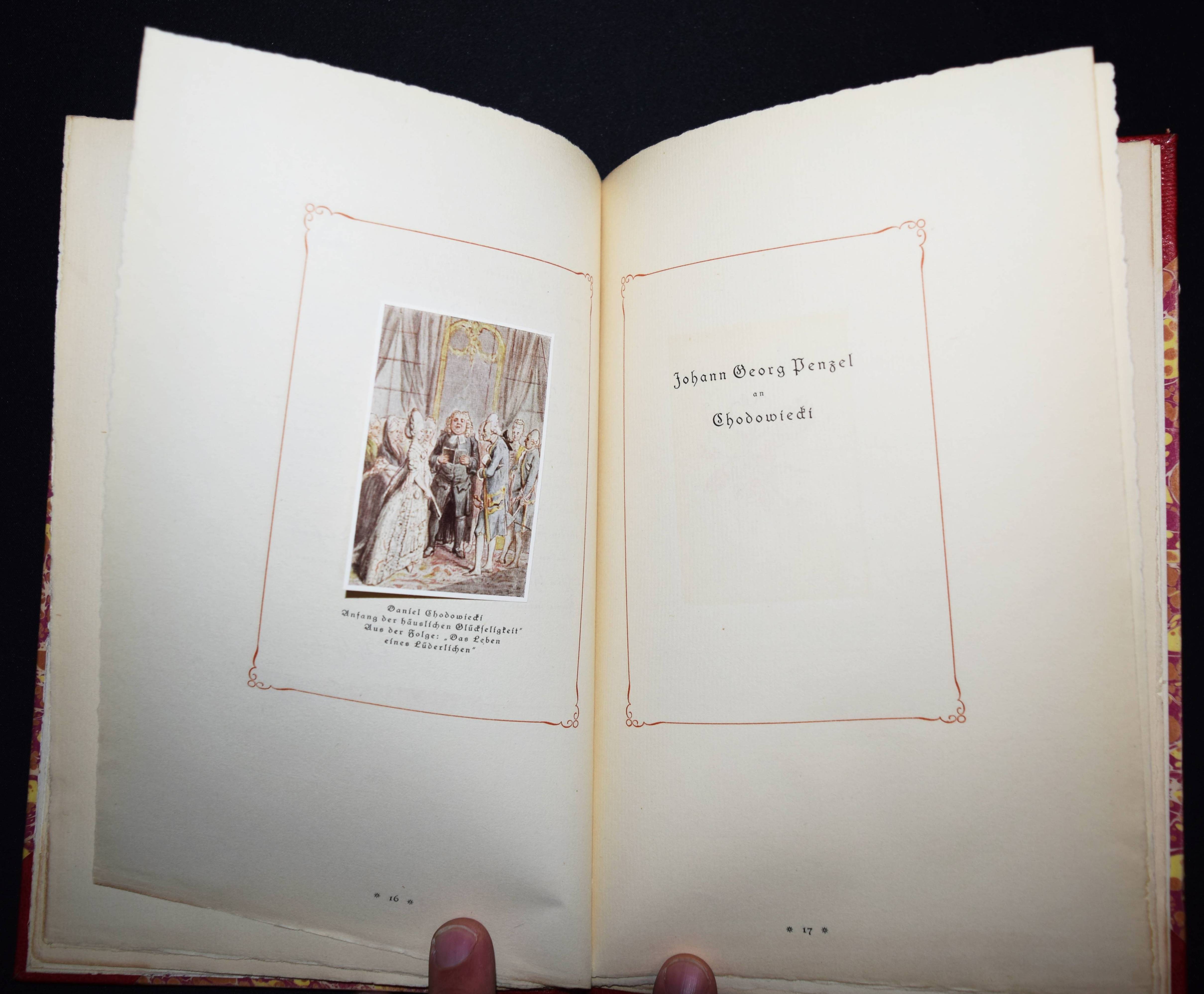 Chodowiecki – Apel, Theodor (Hrsg.). Drei Briefe Leipziger Künstler an Daniel Chodowiecki. Leipzig, Schelter & Giesecke 1923. Gr.-8°. 32 S. mit 3 mont. Farbtafeln. Weinroter OHldr. mit goldgepr. Rückentitel. (Veröffentlichung der Dienstags-Gesellschaft zu Leipzig, Band 1). Rodenberg 286. – Eines von 500 num. Exemplaren. – Mit Briefen von Johann Georg Penzel, Christian Gottlob Geyser und Johann Friedrich Bause. – Sehr schönes sauberes Exemplar.