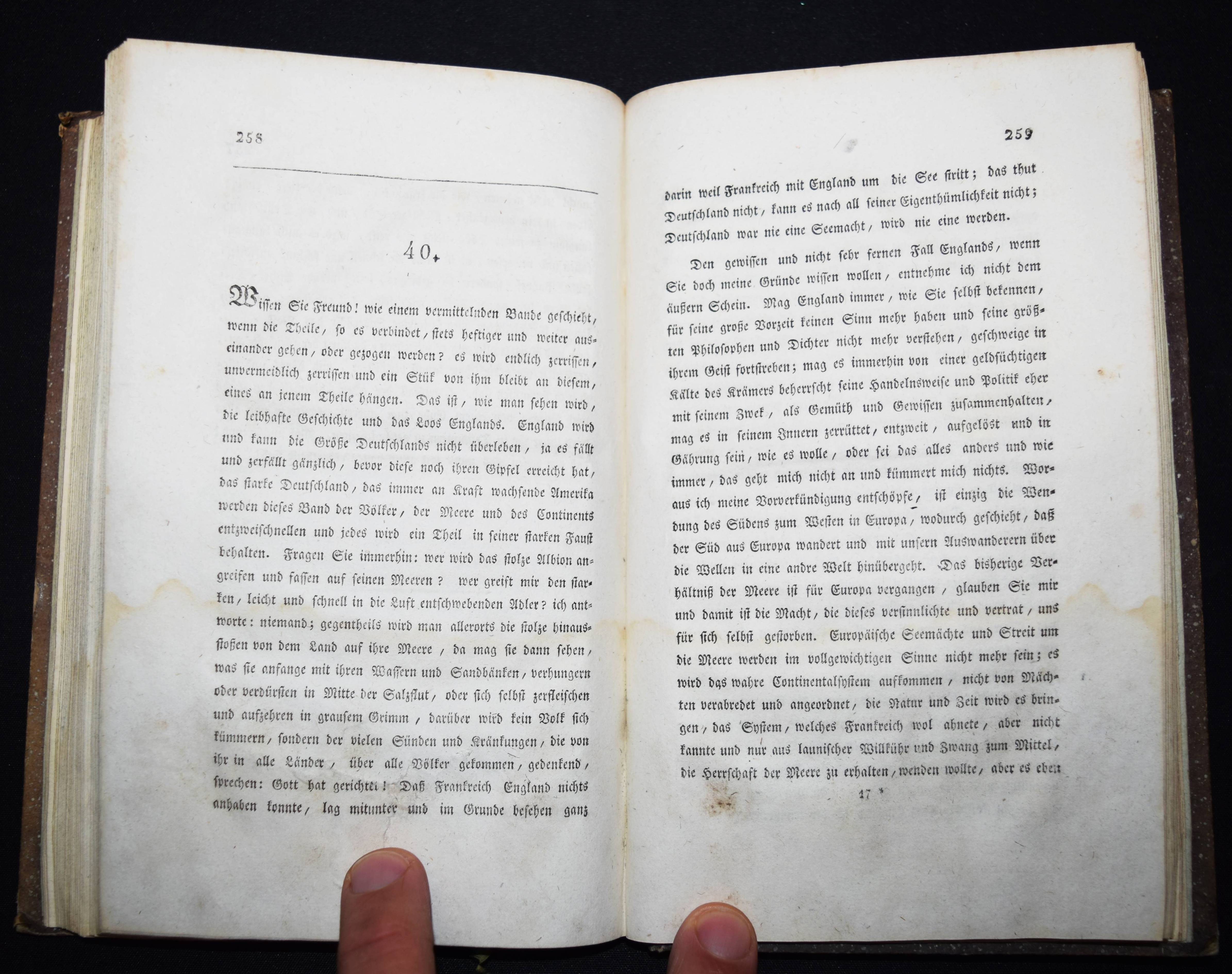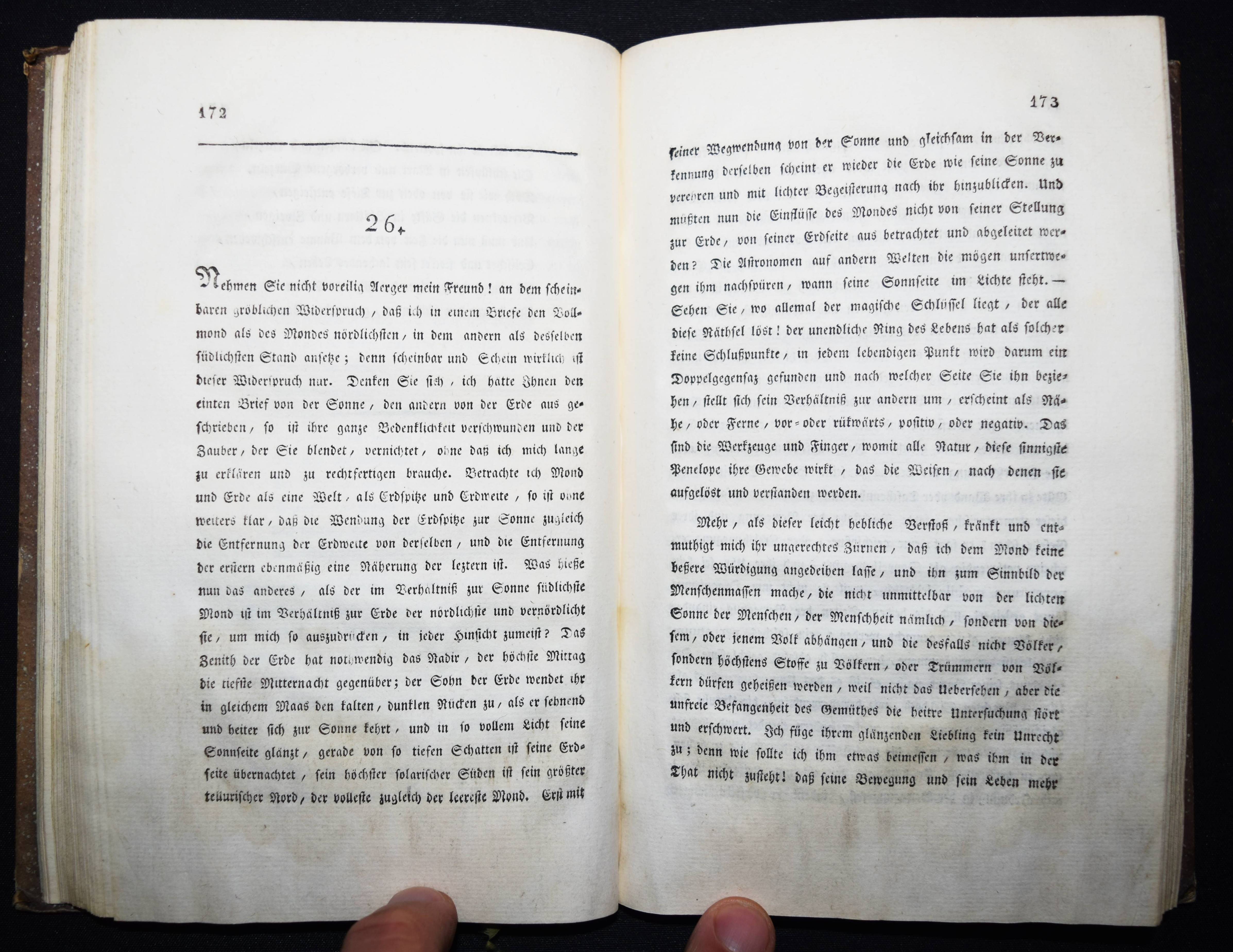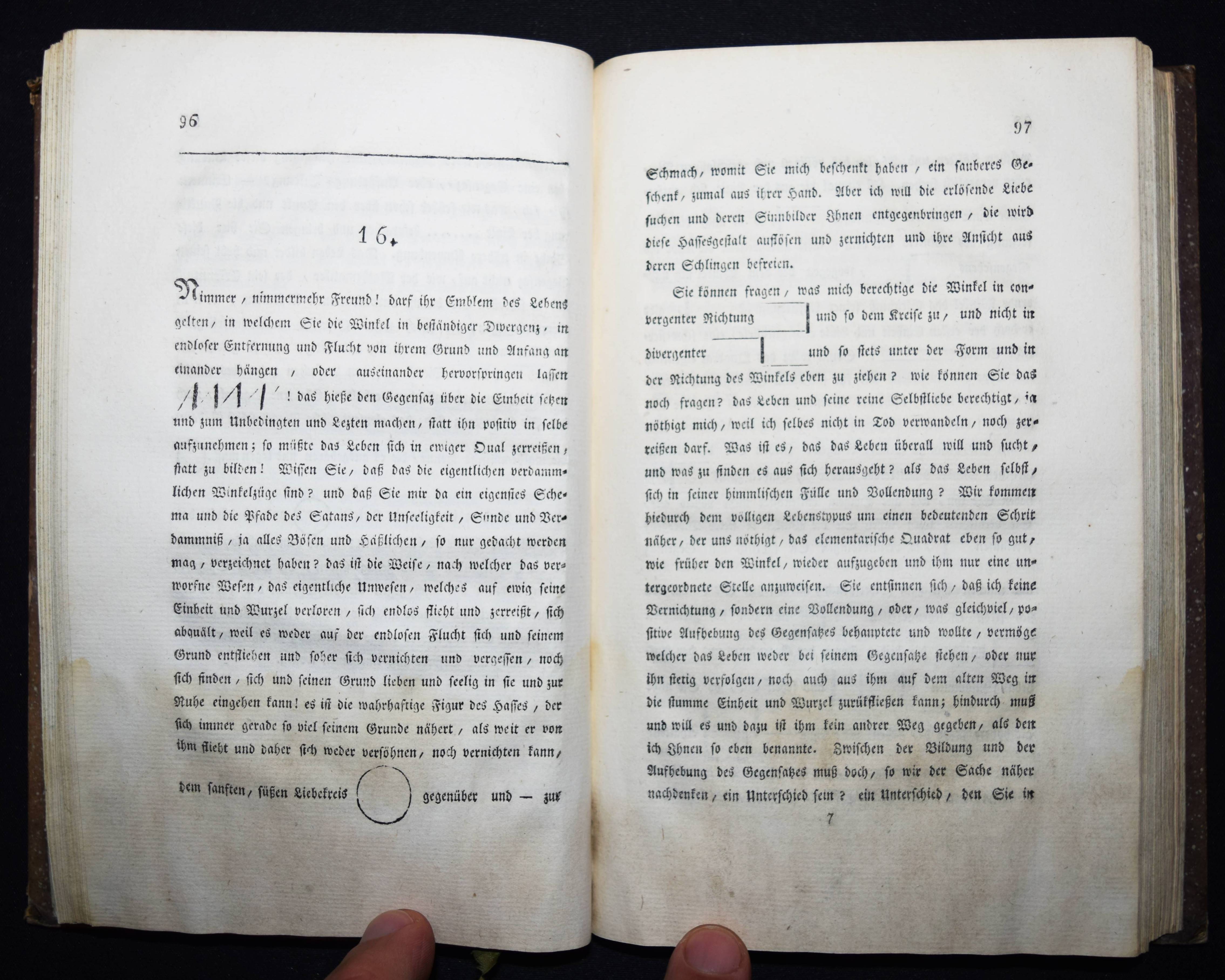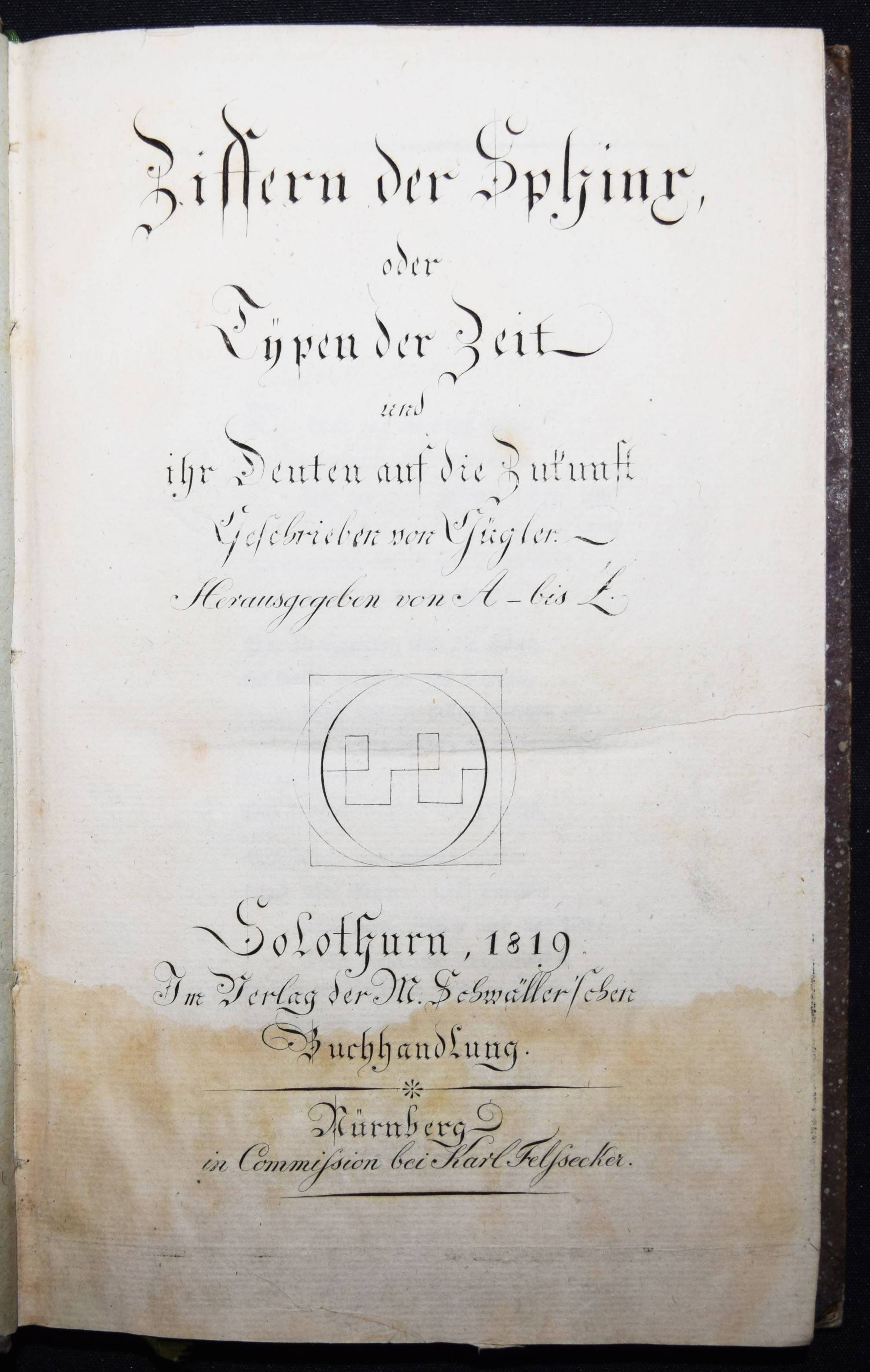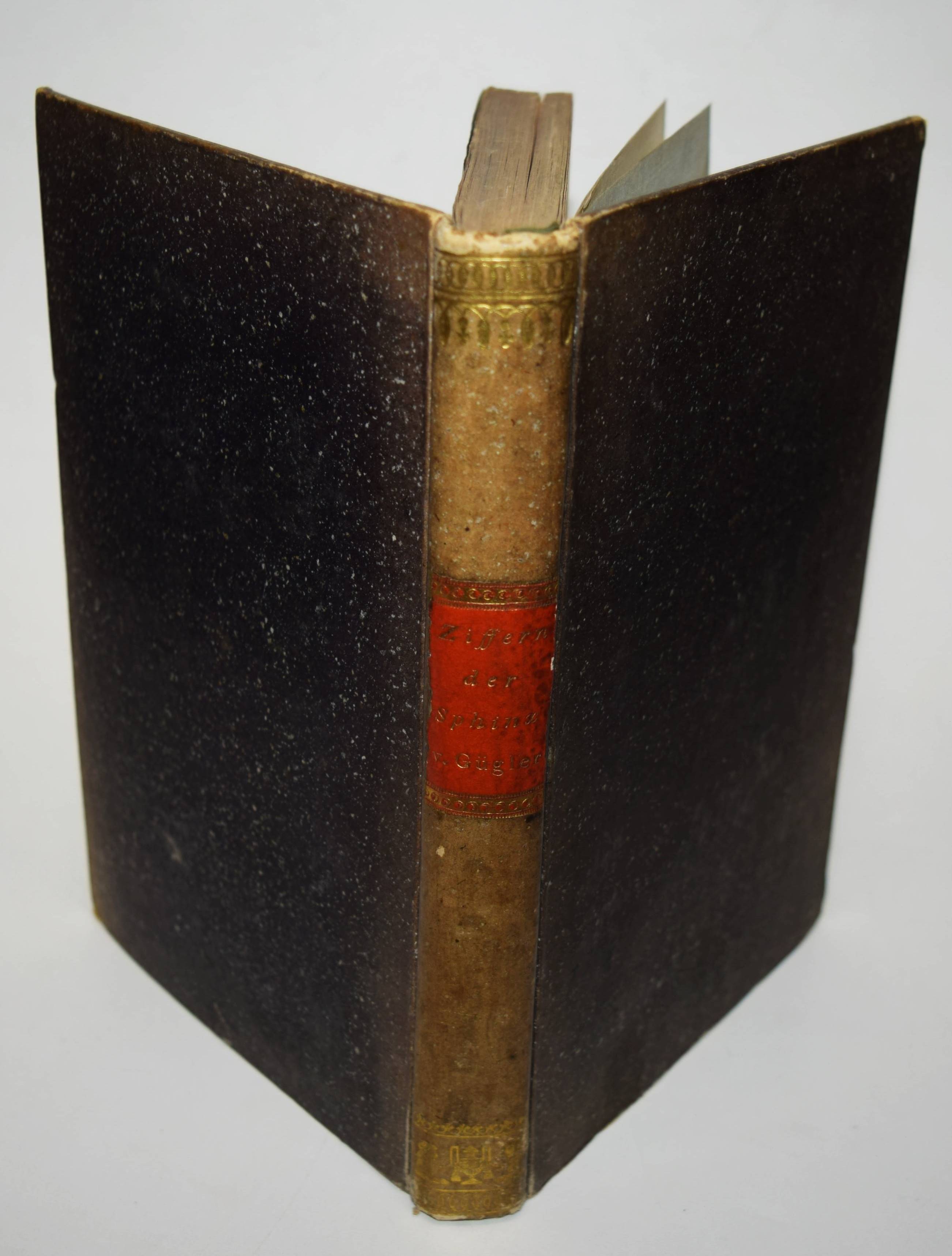 Gügler, (Josef Heinrich) Aloys. Ziffern der Sphinx. Oder Typen der Zeit und ihr Deuten auf die Zukunft. Herausgegeben von A – Z. Solothurn, M. Schwäller und Nürnberg in Commission bei Karl Felsecker 1819. 8°. 321 S. mit gestoch. Titelblatt mit Vignette. Pbd. der Zeit mit goldgepr. Rückenschild und Rückenvergoldung. ADB X, 95 ff. NDB VII, 253 f. – Erste Ausgabe. – Der Schweizer Philosoph und Theologe J. H. A. Gügler (1782-1827), bedeutender Vertreter des wissenschaftl.-spekulativen Katholizismus und Schüler J. M. Sailers an der Universität Landshut, versucht im vorliegenden Werk „die kosmischen Urgesetze und den gottgedachten Rhythmus der weltgeschichtlichen Bewegung bloßzulegen, deren Hauptmomente dem Leser in großen glänzenden Bildern und prophetischen Gesichtern vorgeführt werden. G. erlebte im letzten Jahre seines Lebens noch das Erscheinen des ersten Bandes von Molitor’s Geschichte der Philosophie, der ihm wie aus der Seele geschrieben war und von ihm in der Kerz’schen Litteraturzeitung zur Anzeige gebracht wurde — wol die letzte seiner schriftstellerischen Arbeiten“ (Werner in ADB). – Rücken etwas aufgehellt, durchgehend im unteren Drittel mit Feuchtigkeitsspuren, sonst gut erhalten.