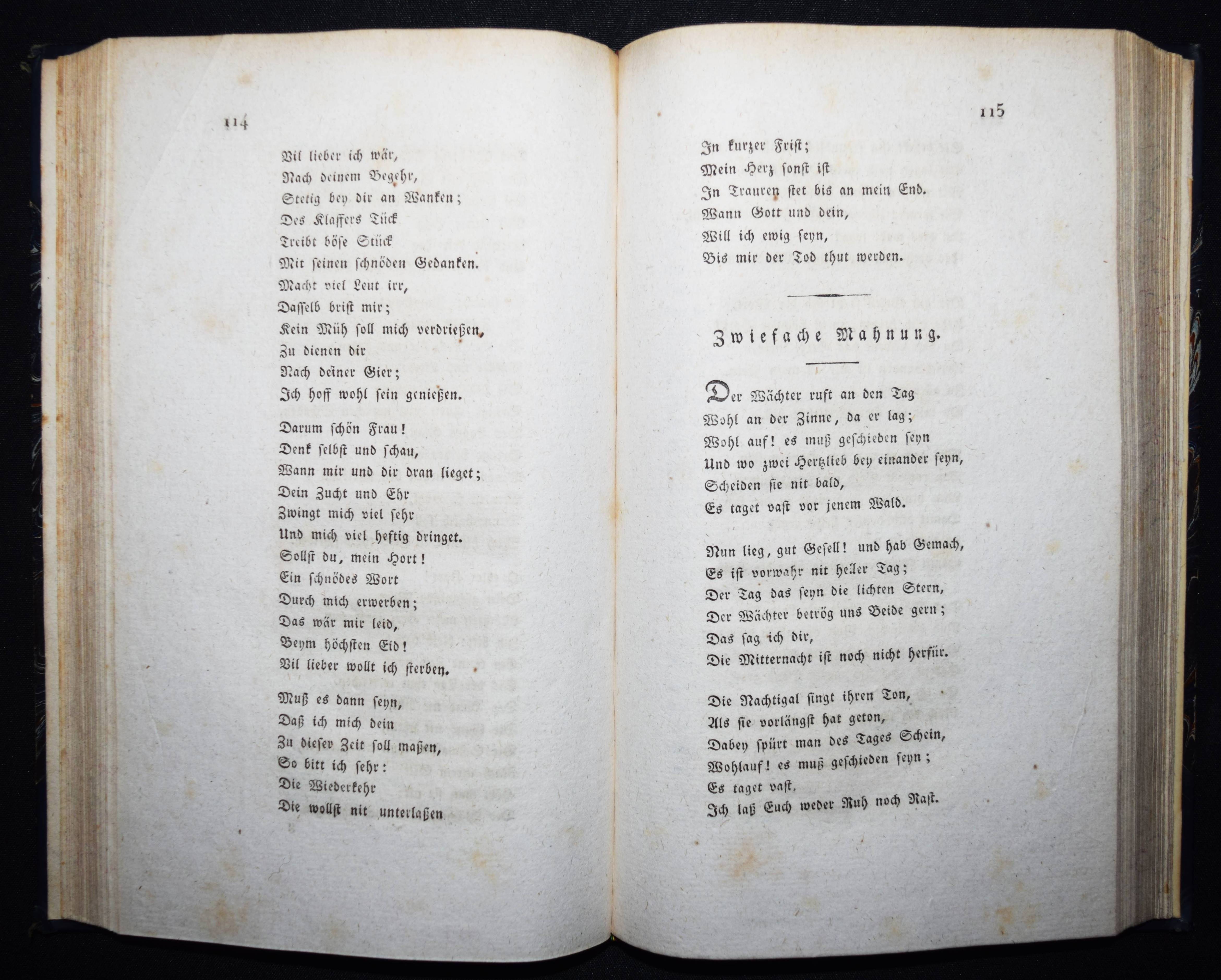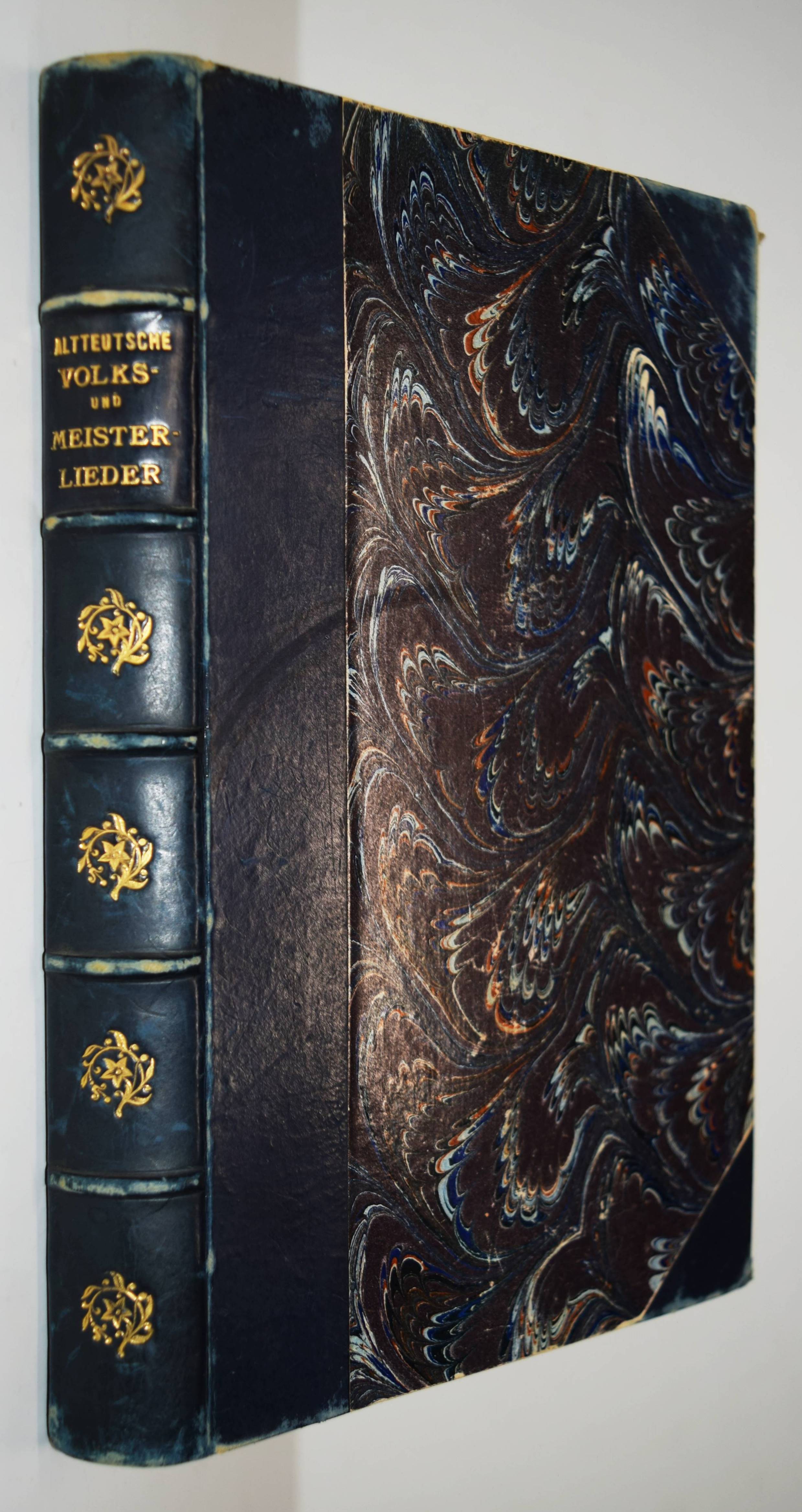 Görres, J(oseph) v. (Hrsg.). Altteutsche Volks- und Meisterlieder. Aus den Handschriften der Heidelberger Bibliothek. Frankfurt a. M., Gebrüder Wilmans 1817. 8°. LXVI, 336 S., [1] Bl. mit gestoch. Frontispiz von F. Geissler nach N(icolaus) Müller. Dunkelblauer Halblederband um 1920 mit goldgepr. Rückentitel und Rückenvergoldung. Slg. Borst 1269. Goed. I, 308 u. VI, 205, 24. – Erste Ausgabe der bedeutenden Sammlung. – „Seinem wackern Freunde dem Major W. v. Scharnhorst zugeeignet“. – Enthält: Liebeslieder; Scherzhafte Lieder und Neidharte; Romanzen und Balladen; Legenden und geistliche Lieder. – Stellenweise braunfleckig, gutes Exemplar.