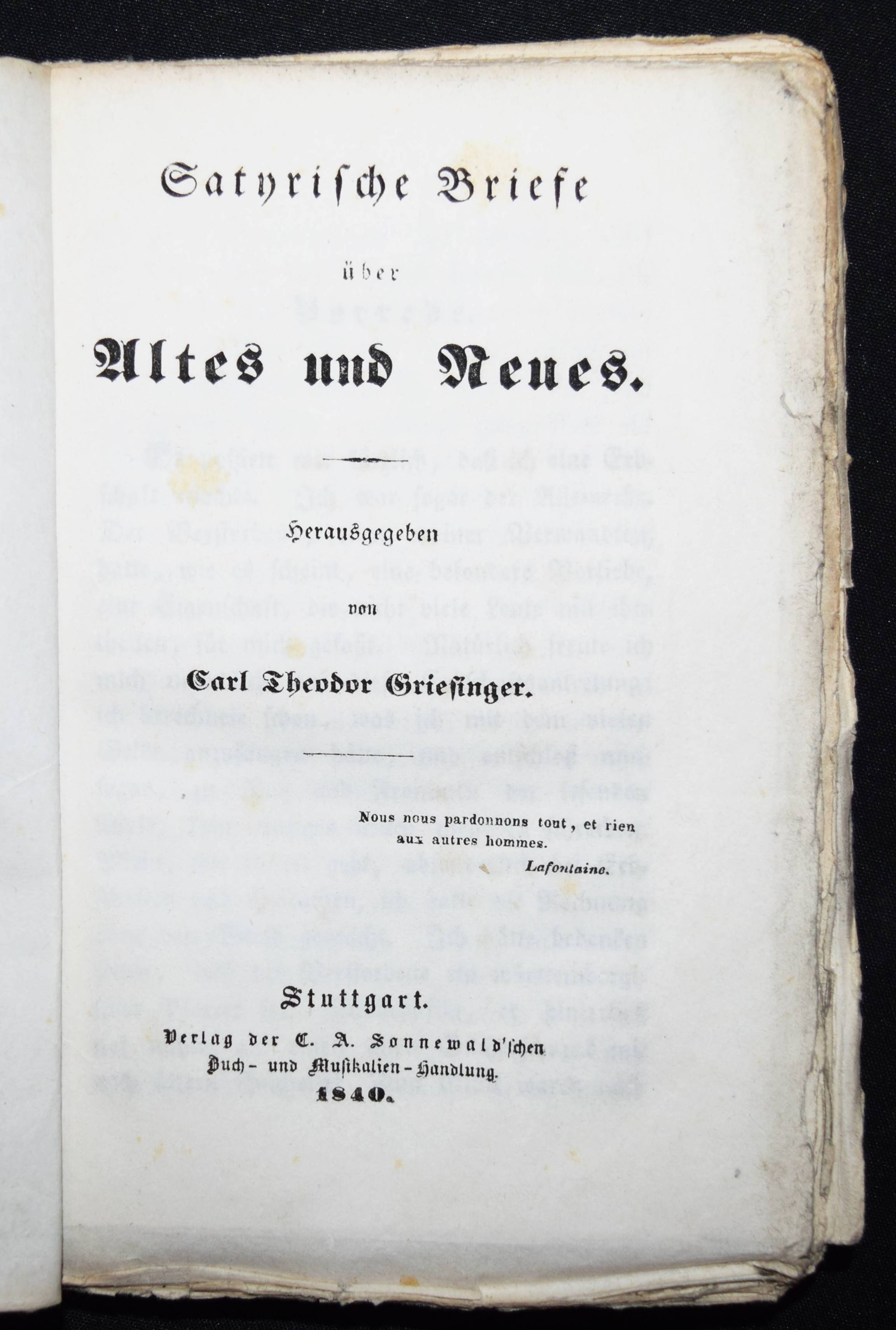 Griesinger, (Karl) Theodor. Satyrische Briefe über Altes und Neues. Stuttgart, C. A. Sonnewald 1840. Kl.-8°. 327 S., [4] Bl. Einfacher Interims-Papierumschlag. ADB XLIX, 546. Kosch, VI, 796. – Erste Ausgabe, selten. – „G. führte sich mit den „Silhouetten aus Schwaben“ (Heilbronn 1838, 4. Aufl. Stuttgart 1868) glücklich in die Litteratur ein: es sind hübsche, von gutem Humor und scharfer Beobachtungsgabe zeugende Skizzen aus dem schwäbischen Stadt- und Landleben. Drei ähnliche Werke reihten sich an: „Humoristische Bilder aus Schwaben“ (Heilbronn 1839), „Satyrische Briefe über Altes und Neues“ (Stuttgart 1840) und „Skizzenbuch“ (im eigenen Verlag 1841)“ (R. Krauß in ADB). – Umschlag etwas angestaubt, gutes unbeschnittenes Exemplar.