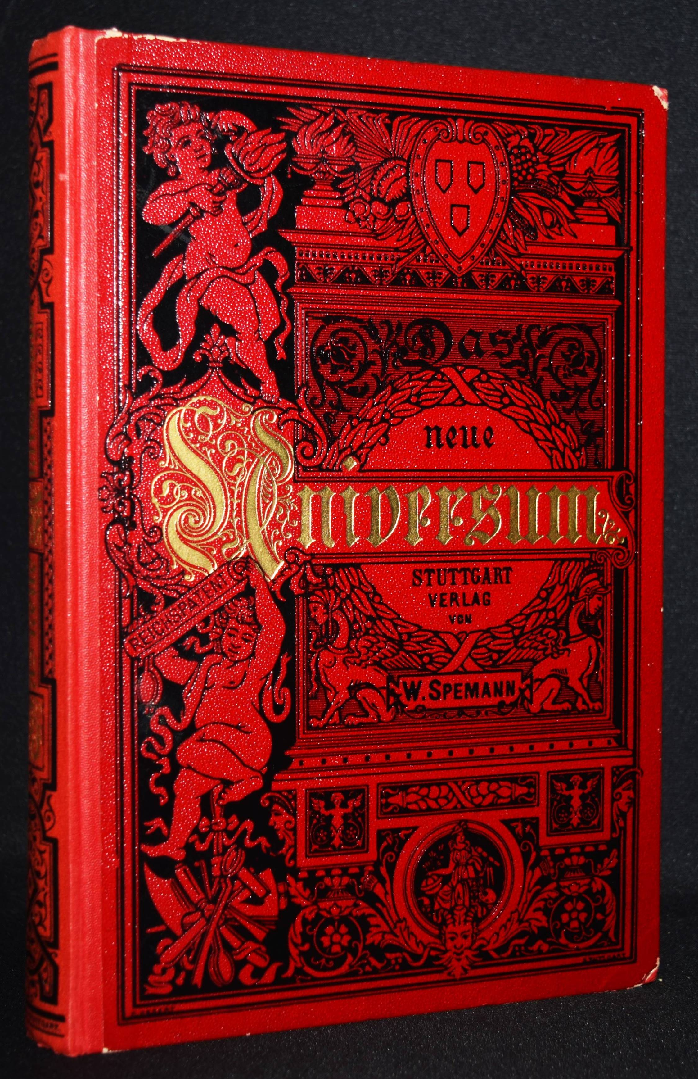 Das Neue Universum. Die interessantesten Erfindungen und Entdeckungen auf allen Gebieten. Ein Jahrbuch für Haus und Familie besonders für die reifere Jugend. (5. Jahrgang). Berlin und Stuttgart, W. Spemann o. J. (1890). Gr.-8°. Titel, 396 S. mit lithogr., gefalt. Frontispiz (″Ausstellungsplatz der Pariser Weltausstellung von 1889“) und zahlr. Illustrationen nach Holzstichen im Text und auf 12 Tafeln. Illustr. schwarzgepr. OHln. mit goldgepr. Rücken- u. Deckeltitel. Seltener zehnter Jahrgang des erfolgreichsten deutschsprachigen Jugend-Jahrbuchs. Mit interessanten Beiträgen zu Themen wie Länder- und Völkerkunde, Verkehrswesen, Militär, Marine, Flugwesen etc. – Das gefalt. Frontispiz im Falz stellenweise mit Japanpapier hinterlegt, papierbedingt etwas gebräunt, sehr gutes sauberes Exemplar.