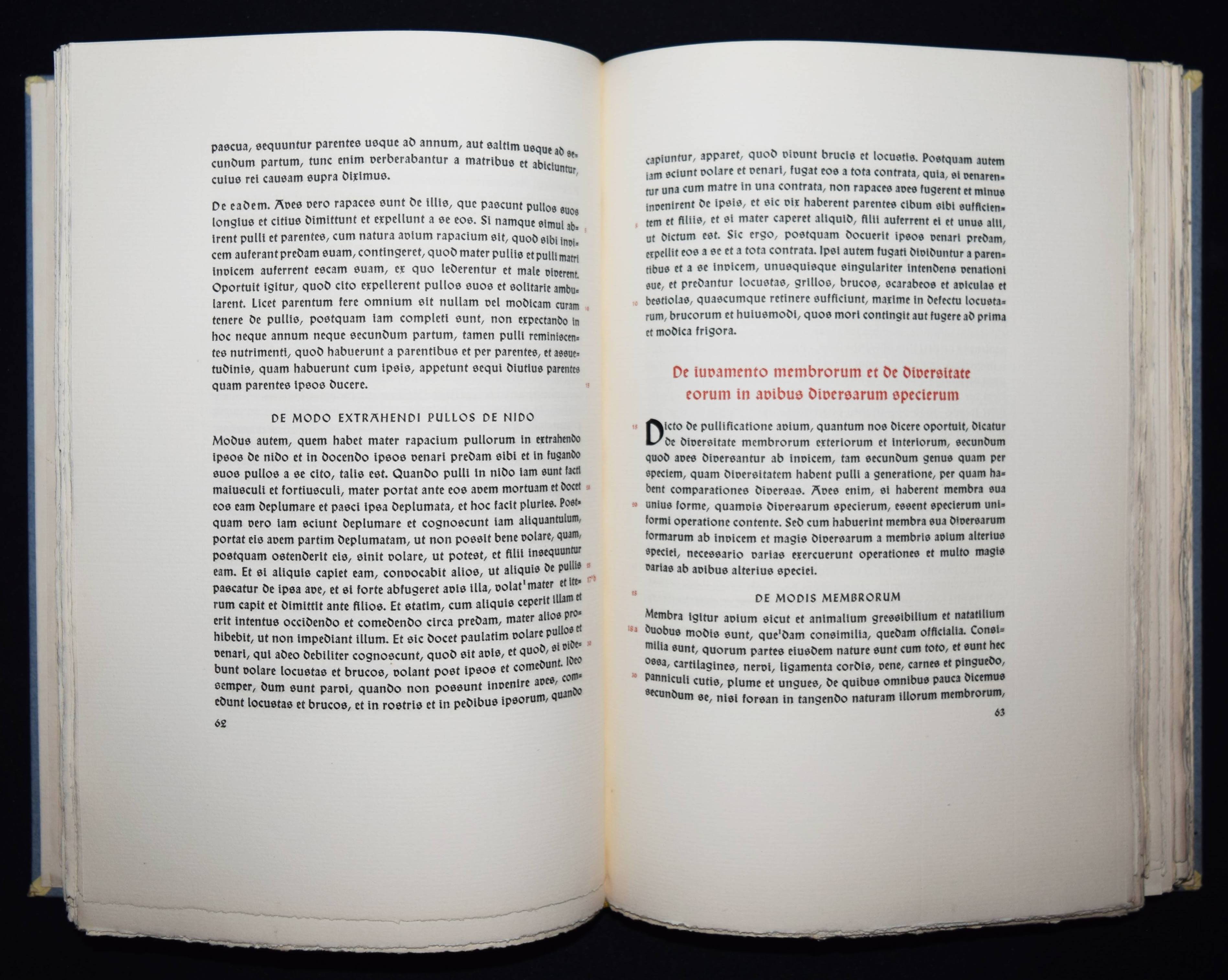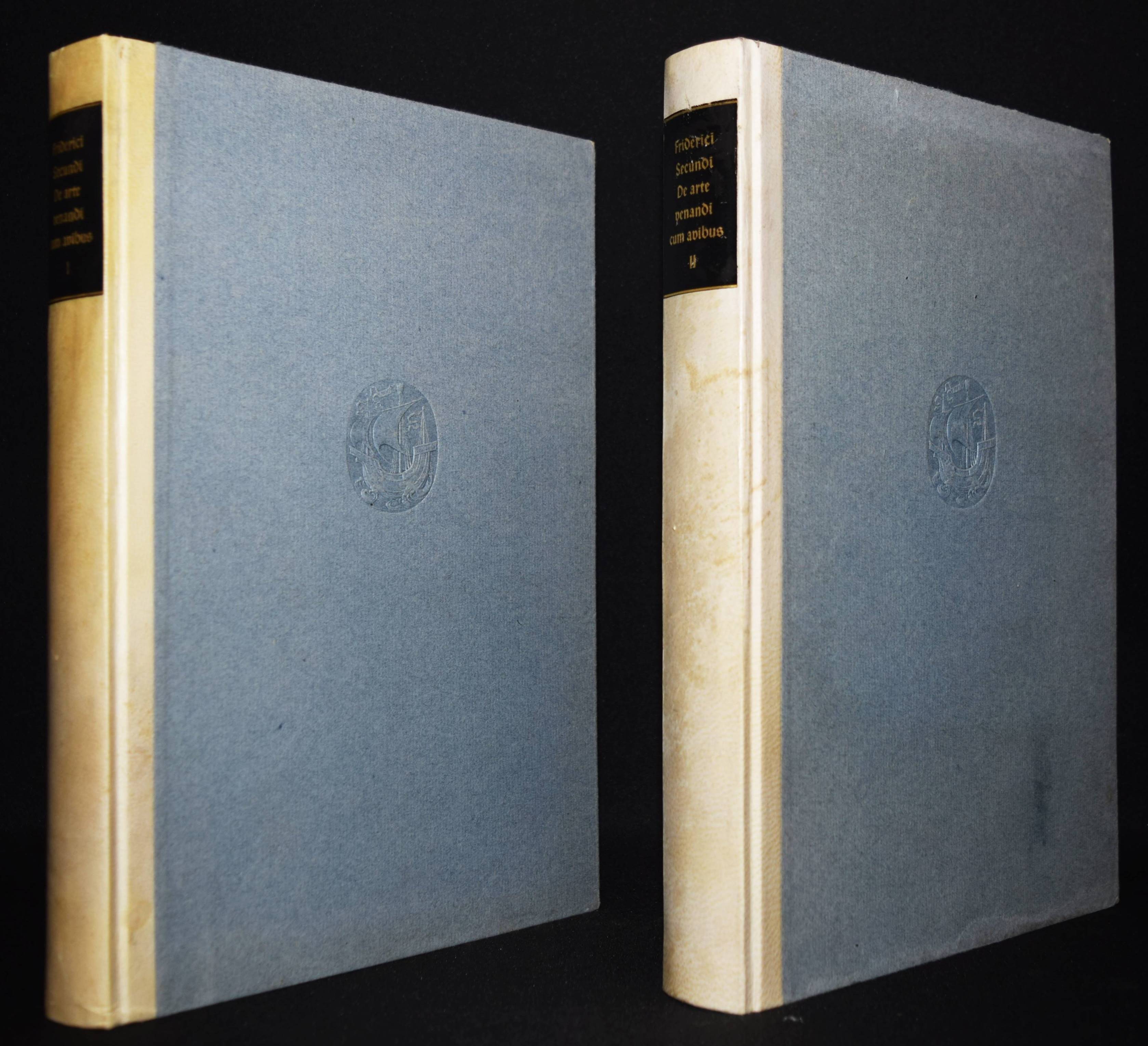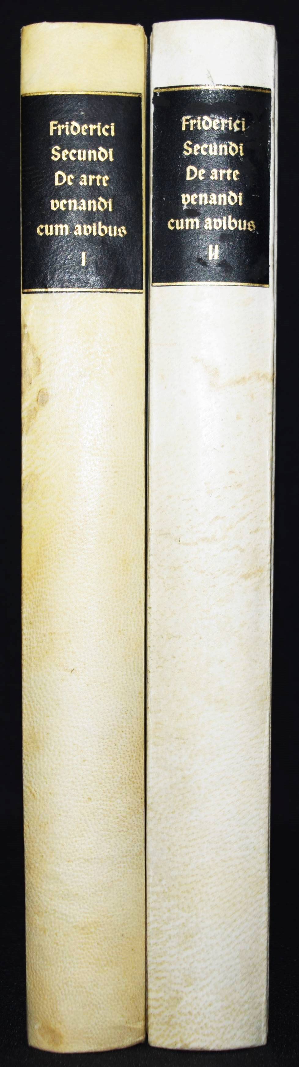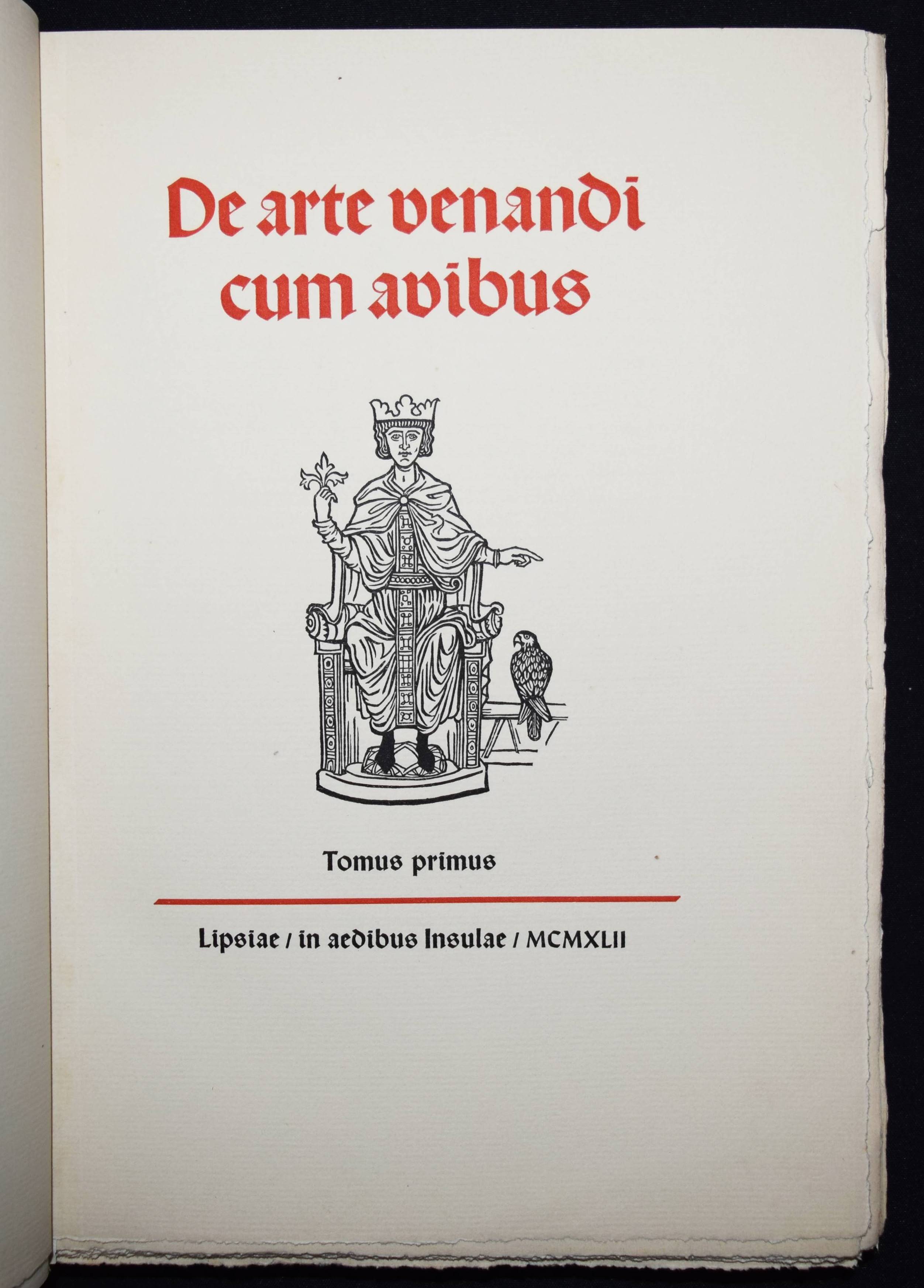Friderici Romanorum Imperatoris (Friedrich II. von Hohenstaufen). Secundi De arte venandi cum avibus. Nunc primum integrum edit C. A. Willemsen. 2 Bände. Lipsiae (Leipzig), In aedibus Insulae (Insel-Verlag) (1942). 4°. 265 S.; 265 S. mit Titelvignetten. OHprgt. mit goldgepr. Rückenschildern und blindgepr. Deckelvignetten. Sarkowski 497. – Eines von 600 num. Exemplaren auf Insel-Bütten. – Druck in Schwarz und Rot in lateinischer Sprache. – „Die älteste Schrift im lateinischen Westen, in der ein Autor bemüht ist, sich bei der Beschreibung des Gegenstandes ausschließlich auf seine persönliche Erfahrung und eigene Experimente zu stützen. Friedrich II. war dabei so erfolgreich, daß seine Studie bis ins 18. Jahrhundert als maßgebliches Handbuch der Falknerei genutzt wurde“ (KNLL). – Gutes sauberes Exemplar.