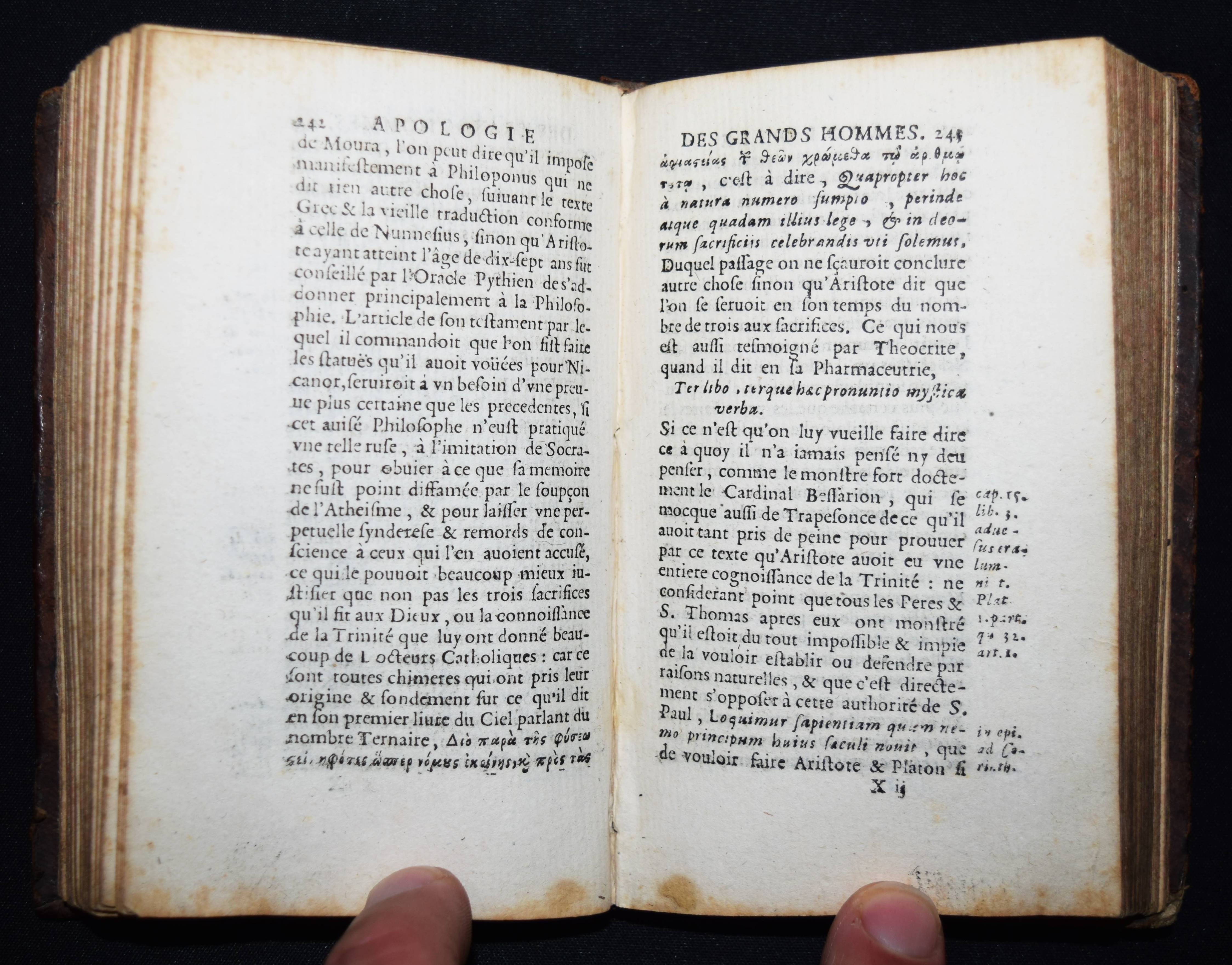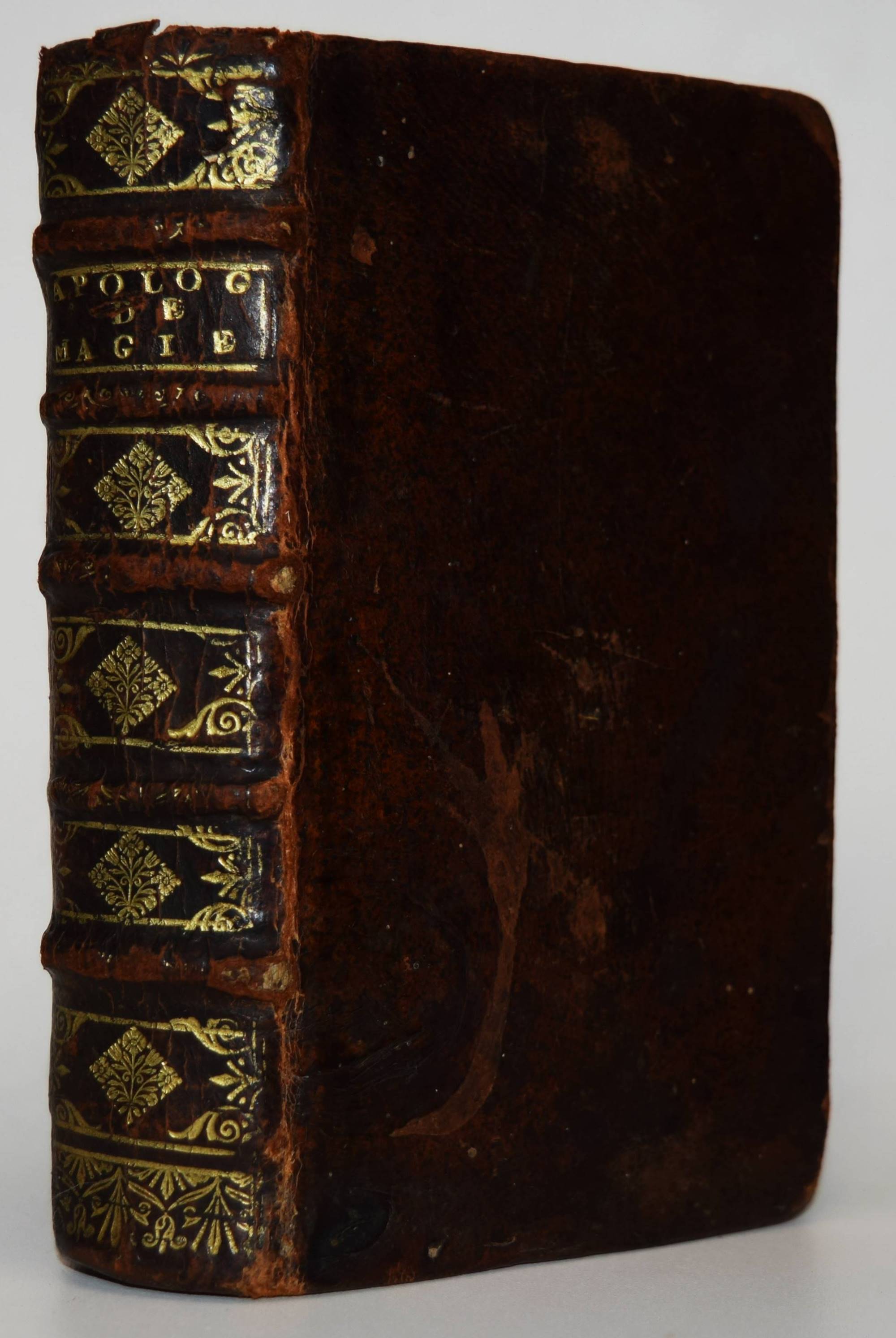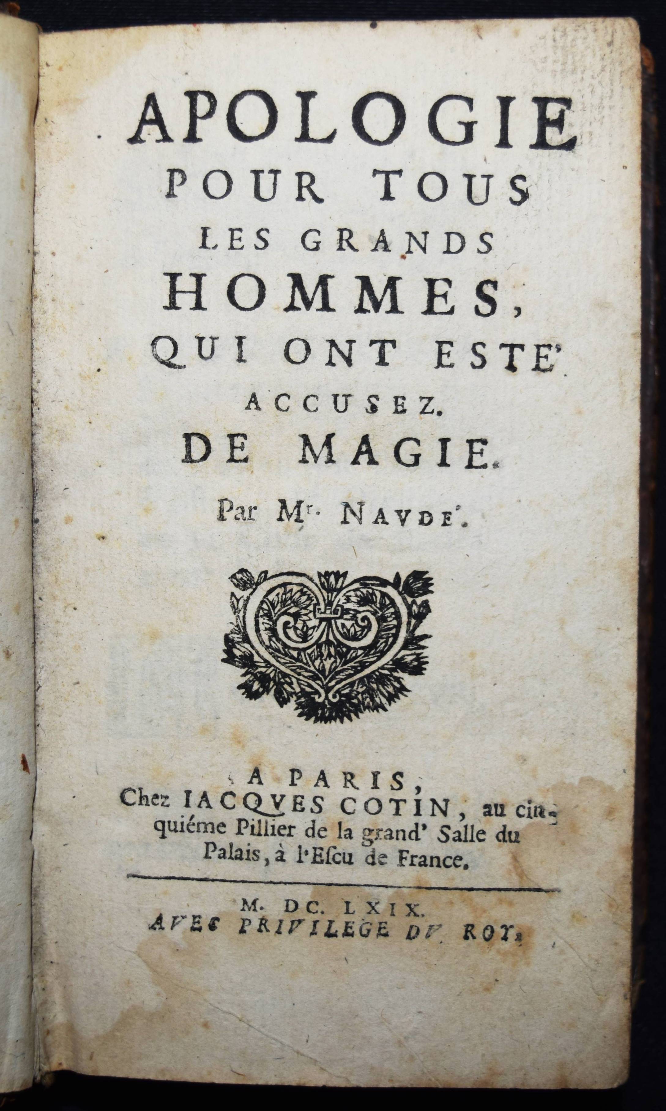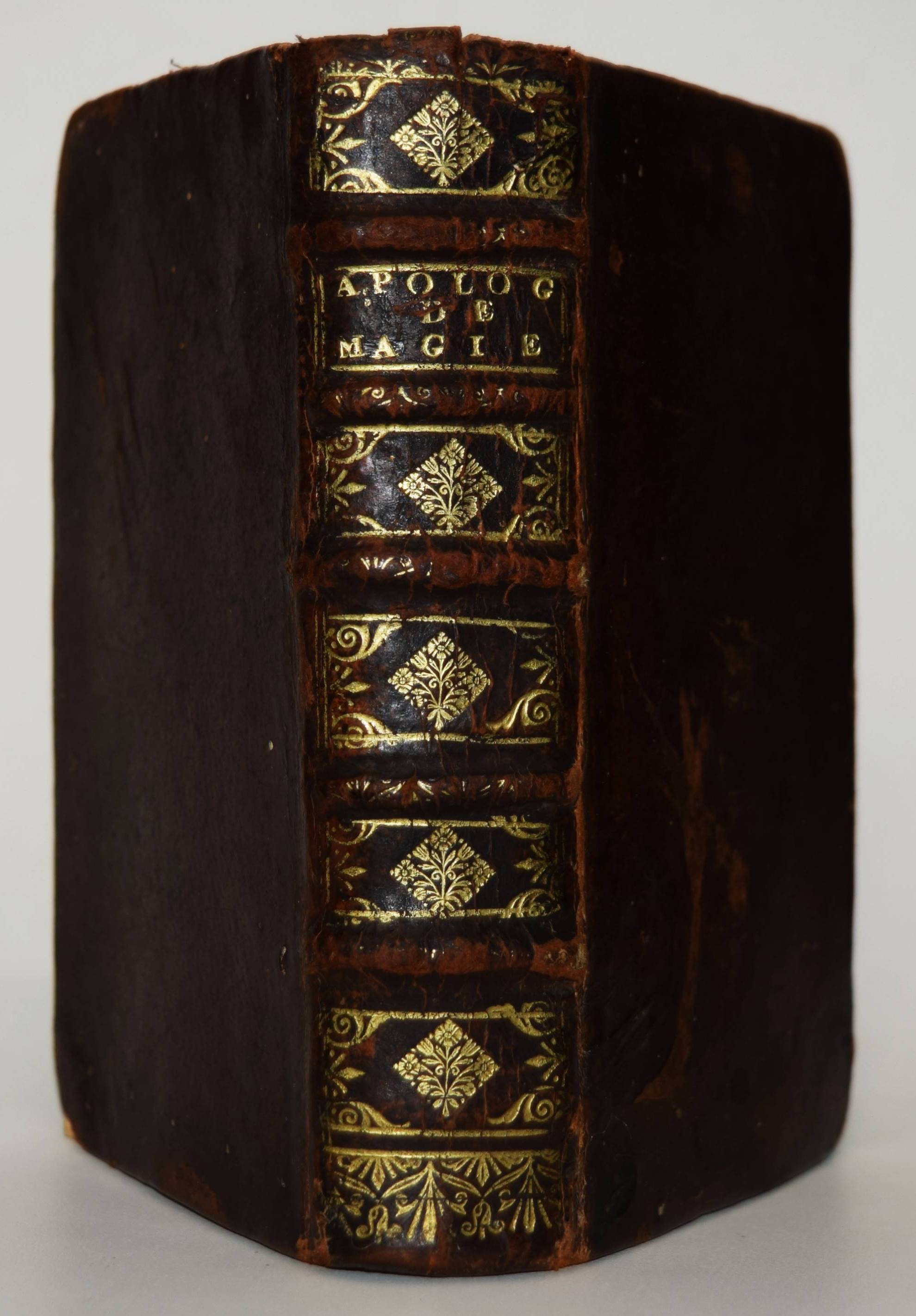 Naudé, Gabriel. Apologie pour tous les grands hommes, qui ont ésté accusez de magie. Paris, Jaques Cotin 1669. 12° (14,8 x 8,5 cm.). [12] Bl., 502 S. Kalbslederband der Zeit über 5 Bünden mit goldgepr. Rückentitel und reicher Rückenvergoldung. Caillet III, 7923. Dorbon 3227. – Zuerst 1625 erschienenes Werk über berühmte Okkultisten des franz. Bibliothekars und Mediziners G. Naude (1600-1653). – „Dans ce très curieux ouvrage, on traite des génies attribués à Socrate, Aristote, Plotin, Paracelse, Agrippa, Savonarole, Nostradamus, Roger Bacon, Albert Le Grand, aux Papes Sylvestre II et Grégoire VII, aux Mages, à Virgile“ (Caillet). – „Il est vraisemblable que l’auteur des remarques est le spirituel libraire hollandais Jean Frédéric Bernard, à qui l’on doit l’Eloge de l’Enfer, et cela d’autant plus que certains exemplaires de cette édition portent sa firme“ (Dorbon). – G. Naudé war „nach dem Studium der Literatur, der Philosophie und der Medizin … vornehmlich als Bibliothekar tätig. In dieser Eigenschaft stand er nacheinander in den Diensten der Kardinäle Giovanni Francesco Bagni (1578–1641) und Francesco Barberini (1597–1679) in Rom, bevor er in zehn Jahren, im Laufe welcher er unermüdlich Europa bereiste, die erste Bibliothek für den Pariser Stadtpalast des Kardinals und Ministers Jules Mazarin (1602–1662) aufbaute. In Mazarins Auftrag erwarb er mehrere tausende kostbare und seltene Bücher und Manuskripte. Der Bibliothekar wurde insbesondere durch seine 1627 verfasste Schrift: Advis pour dresser une bibliothèque („Hinweis zum Aufbau einer Bibliothek“) berühmt, dem ersten französischen Handbuch des Bibliothekswesens. In seinen Werken beschäftigte er sich unter anderem mit Esoterik und der Magie, die er in weiße Magie (heilende, schützende), schwarze Magie (schadende), göttliche Magie und natürliche Magie gliederte, wobei er letzterer die Astronomie, die Chemie und weitere Wissenschaften unterordnete. Ein weiterer Schwerpunkt seiner Forschungen waren die Rosenkreuzer“ (Wikipedia). – Einband etwas berieben, vorderer freier Vorsatz fehlt, stellenweise etwas braun- und fingerfleckig, gutes dekorativ gebundenes Exemplar.