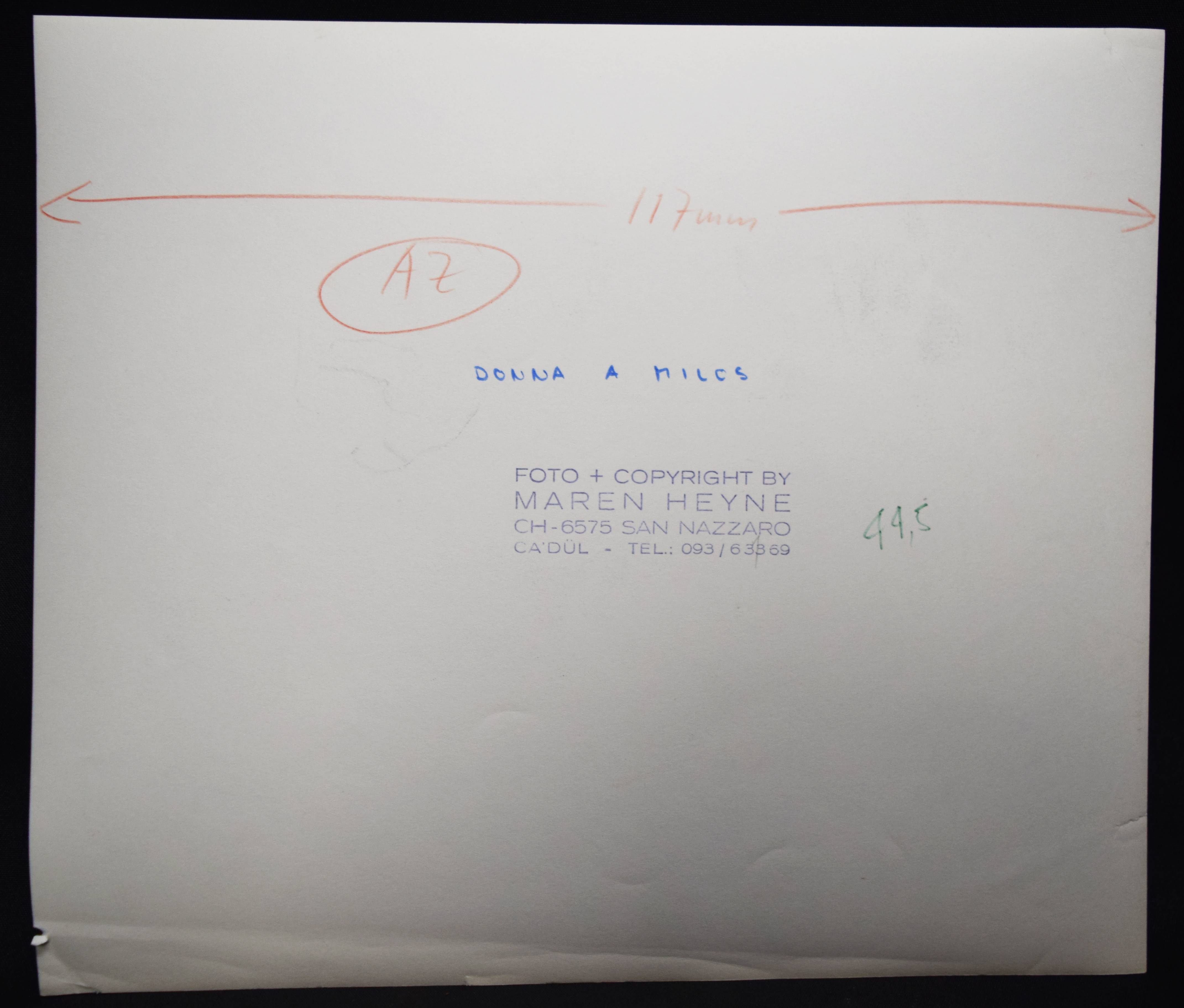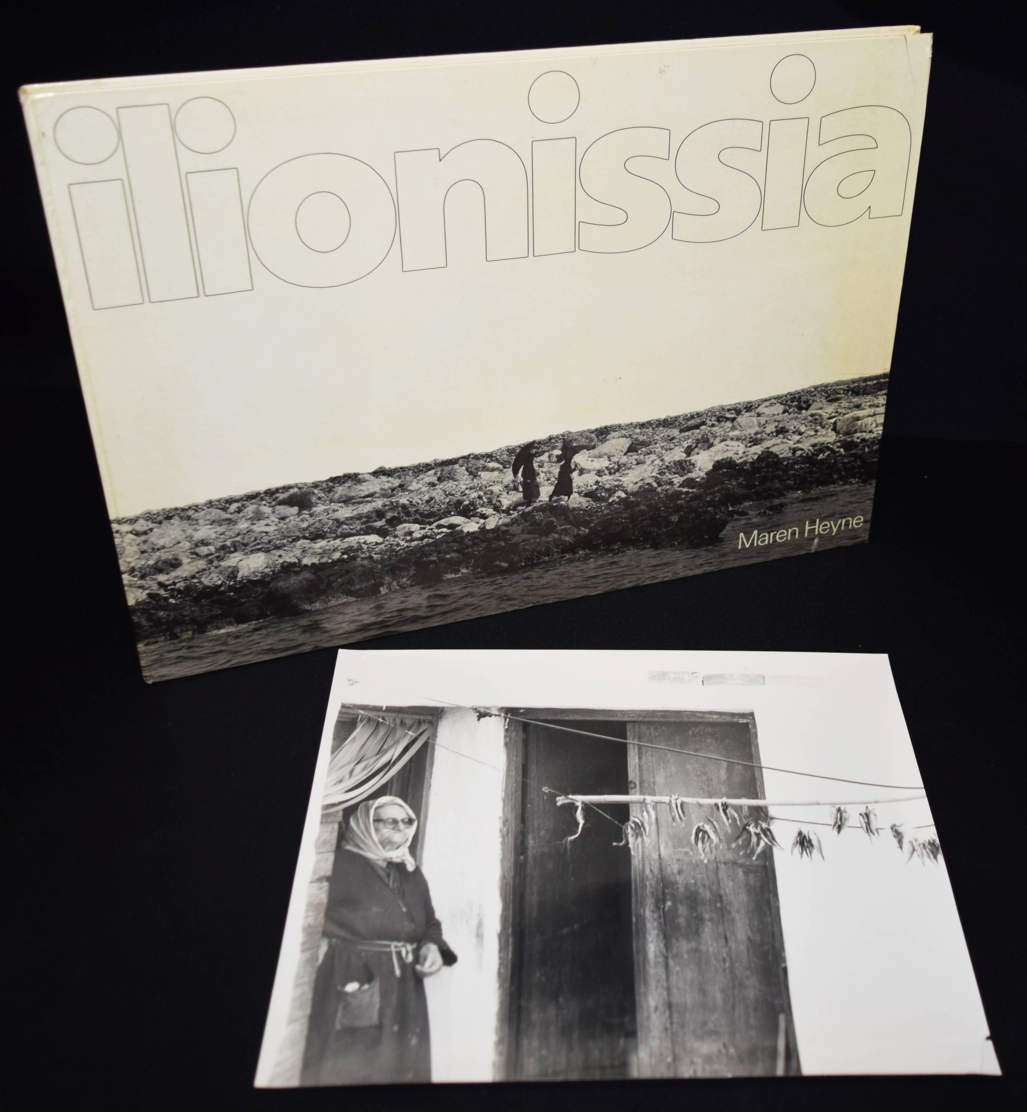 Heyne, Maren. Ilionissia. Isole della luce. – Inseln des Lichts. – Un libro di fotografie. – Ein Fotoband. – Con tredici liriche di – Mit dreizehn Gedichten von Giorgos Seferis, Jannis Ritsos, Nikiforos Vrettakos. – Scelte e tradotte in tedesco da – e voltate in italiano da traduttori varri – in der Auswahl und deutscher Übersetzung von Argyris Sfountouris. Lugano, Edizioni Pantarei (1973). Quer-4° (27,5 x 38,5 cm.). [3] Bl., 64 S., [3] Bl. mit 64 teils doppelblattgr. Duatone-Tafeln und 1 beil. Orig.-Photographie (Silbergelatine, 23 x 26,5 cm.). Illustr. Orig.-Pappband. Nicht bei Heidtmann. – Erste und einzige Ausgabe. – Die beil. Orig.-Photographie, rückseitig bezeichnet „Donna a Milos“ und mit Stempel der Fotografin, zeigt eine alte Frau und Sardinen, die zum Trocknen an einem Holzstab hängen. – Der Bildband mit eindrucksvollen Aufnahmen (entstanden 1966) der 1941 in München geborenen Fotografin wurde 1973 von der Stiftung Buchkunst ausgezeichnet. – „In den 60er und 70er Jahren unternahmen Maren Heyne und (der Bildhauer) Friederich Werthmann mit dem eigenen Segelboot mehrere ausgedehnte Reisen durch die griechische Ägäis zwischen Euböa und Kreta. Maren Heyne zeigt in eindrucksvollen Aufnahmen den Einklang von Mensch, Landschaft und Kultur der griechischen Inselwelt, 1973 z.B. veröffentlicht in dem großformatigen Bildband „Ilionissia – Inseln des Lichts“. Maren Heyne blieb Griechenland verbunden, so war sie 1995 und 1996 Kursleiterin für Fotografie in der „Sommerakademie“ auf der Kykladeninsel Sifnos“ (maren-heyne dot de). – „Maren Heyne studierte zunächst Architektur, entschied sich dann jedoch für Fotografie. Freischaffend sowie in Folge von Aufträgen schuf sie eindrucksvolle Serien im Bereich Landschaft, Architektur und Kunst. Ihre bei Atelierbesuchen entstandenen schwarzweißen Aufnahmen porträtieren die Künstler in ihrem individuellen Lebensumfeld und charakterisieren die besondere Atmosphäre dieser Orte. Von Düsseldorf aus, wo die Fotografin seit 1963 lebt und in der Künstlerszene eng vernetzt ist, reiste sie für Reportagen um die Welt“ (Kurz-Biographie anlässlich der Ausstellung im Museum Kunstpalast in Düsseldorf 2015). – Das Foto im unteren Rand und an einer Ecke mit Knickspuren, das Buch sehr gut erhalten.