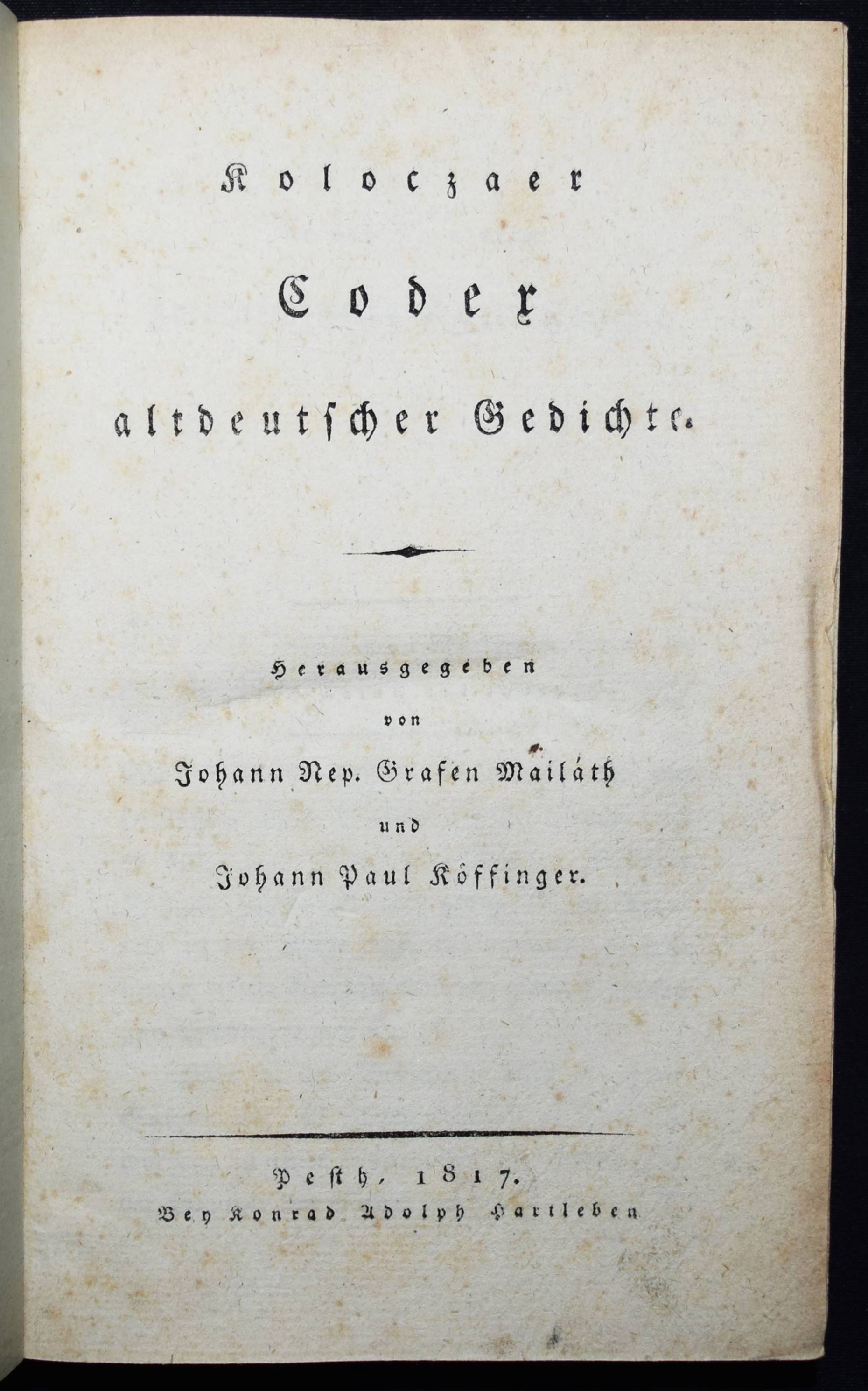 Mailáth (von Székhely), Johann und Johann Paul Köffinger (Hrsg.). Koloczaer Codex altdeutscher Gedichte. Pesth, Konrad Adolf Hartleben 1817. 8°. XX, 464 S. Weinroter Halb-Maroquinlederband mit goldgepr. Rückenschild und dekorativer Rückenvergoldung. Hayn-Gotendorf III, 603. – Erste Ausgabe. – Der bedeutende ungarische Codex aus der Kapitularbibliothek von Kolocza (Kalocsa), ursprünglich wohl „für die Corvinische Bibliothek zusammen geschrieben“, enthält Dichtungen von Konrad v. Würzburg, Rüdiger v. Hunthover, Meister Wunnenhoven, dem Stricker, Heinrich v. Glichsenere, Hartmann von der Aue u. a. Das von Ludwig Bechstein in sein „Deutsches Märchenbuch“ aufgenommene Tiermärchen „Des Hundes Not“ ist durch das hier enthaltene Schwankgedicht „XLII. Diß buchel heiset des hundes not, der nach was von hunger tot“ (S. 115 ff) und durch Grimms „Der Hund und der Sperling“ (KHM 58) inspiriert. – Nur vereinzelt leicht braunfleckig, sehr schönes dekorativ gebundenes Exemplar.