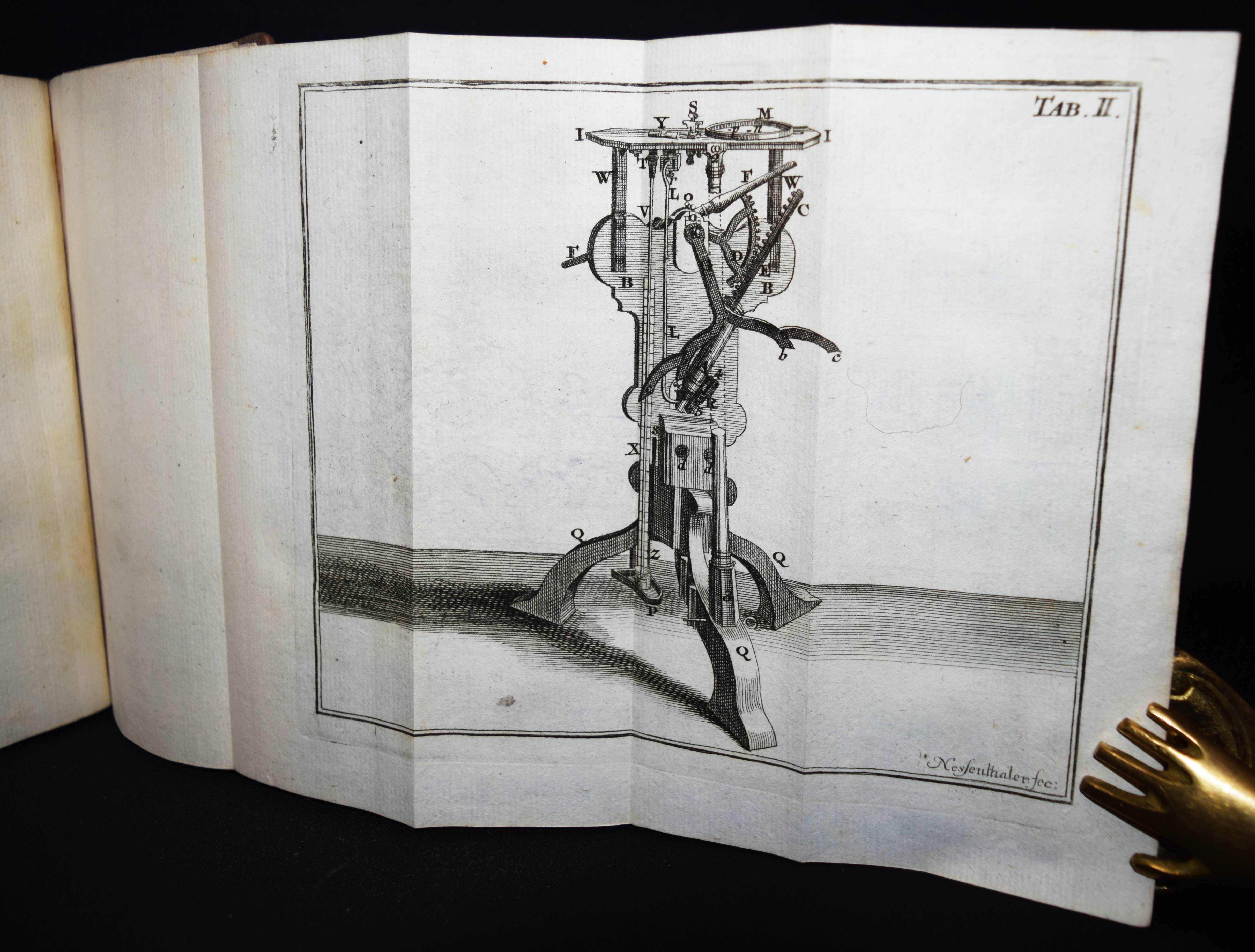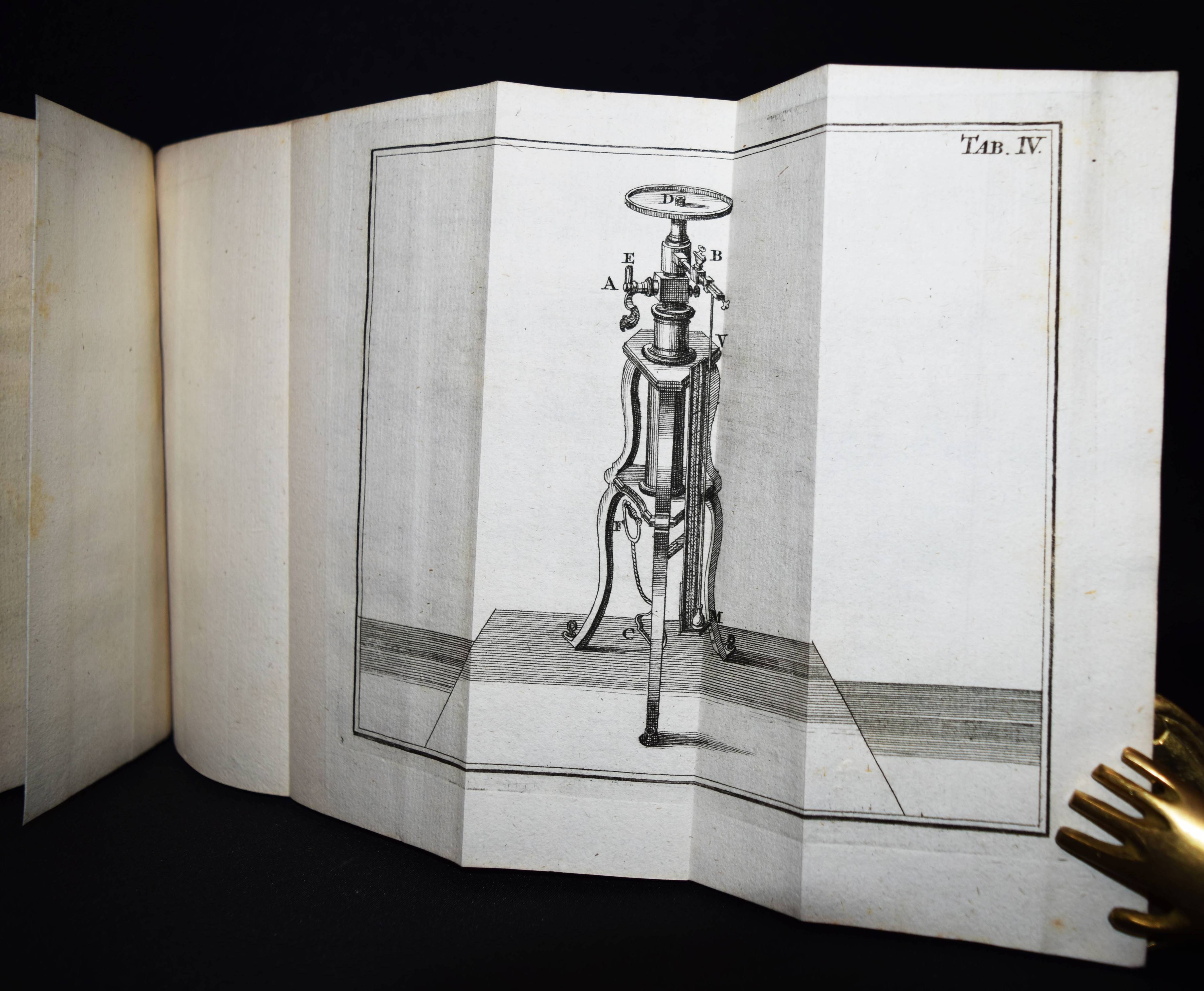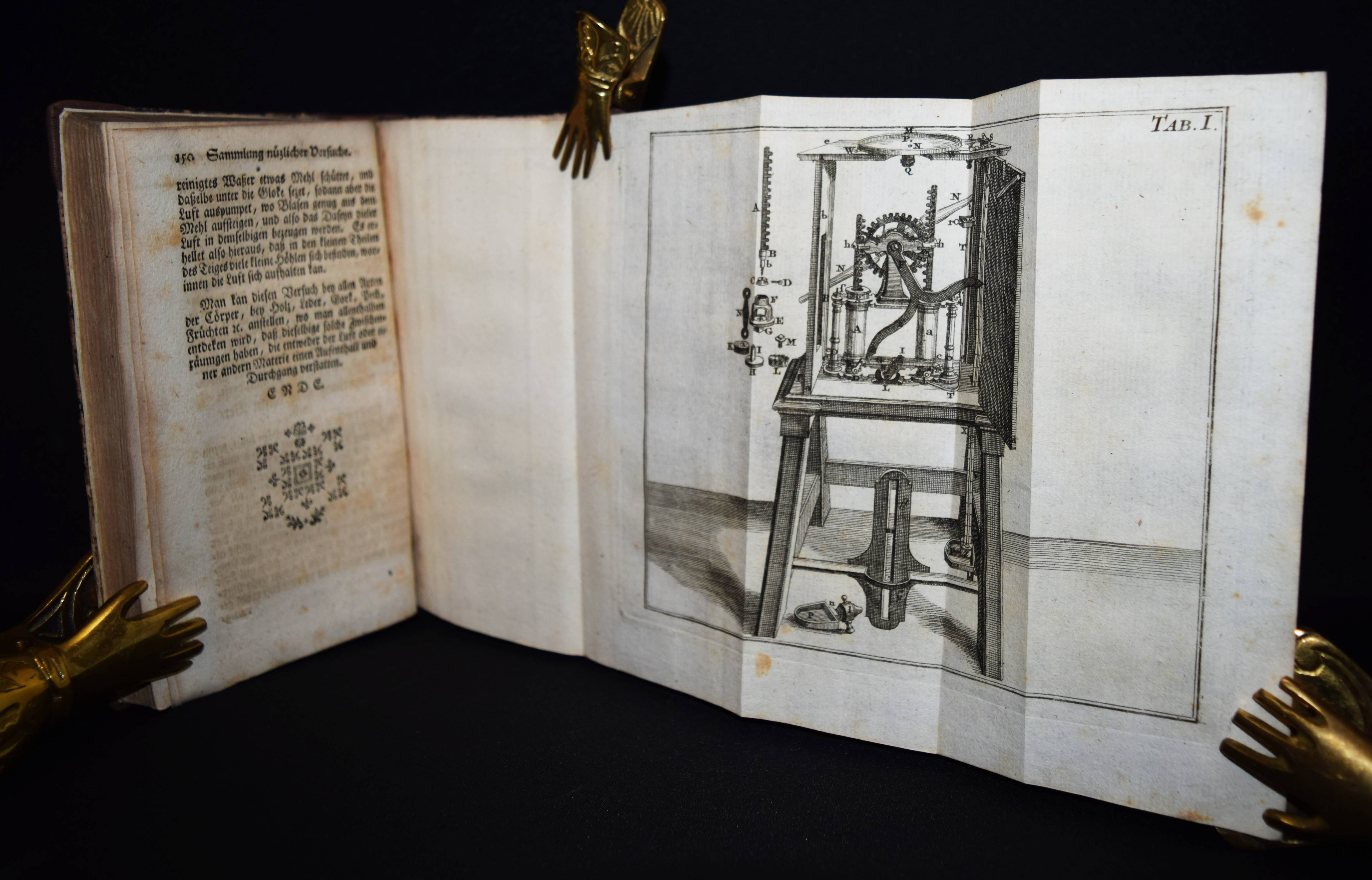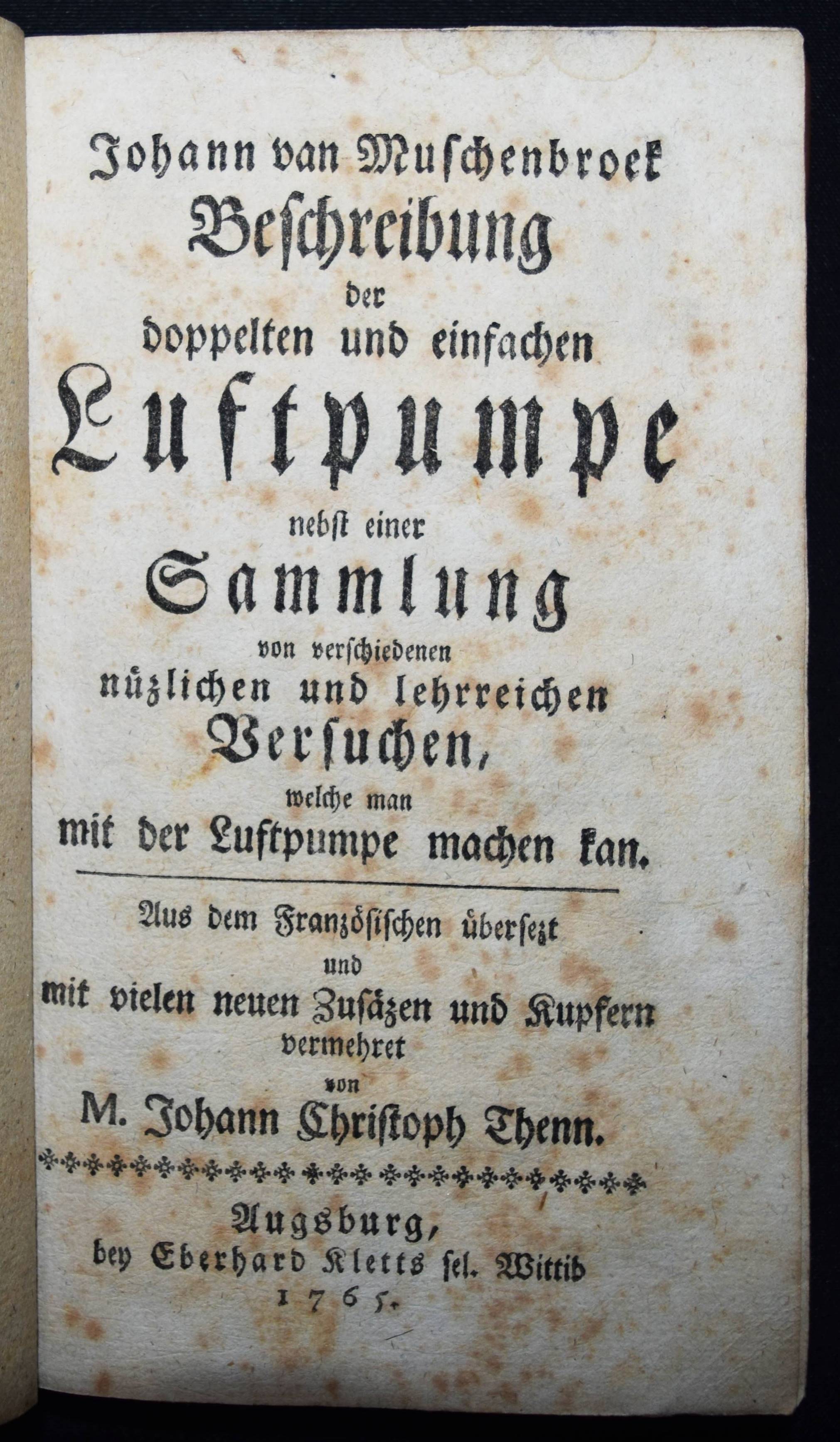 Muschenbroek, Jan van. Beschreibung der doppelten und einfachen Luftpumpe. Nebst einer Sammlung von verschiedenen nüzlichen und lehrreichen Versuchen, welche man mit der Luftpumpe machen kan. Aus dem Französischen übersetzt und mit vielen neuen Zusätzen und Kupfern vermehret von Johann Christoph Thenn. Augsburg, Eberhard Klett, Wittwe 1765. Kl.-8°. [7] Bl., 150 S. und 6 gefalt. Kupfertafeln. Moderner Halblederband mit Deckelschild. Engelmann, Bibl.-Techn. 261. VD18 11077050. – Erste deutsche Ausgabe. – Johann van Musschenbroek (1687–1748) „war Mechanicus in Leiden. Sein Vater Johann Joosten betrieb die erste Werkstätte für physikalische Instrumente auf dem Kontinent, sein Bruder Pieter war maßgeblich an der Rezeption von Newtons Physik und ihrer Fortentwicklung zu einer nicht-mathematischen Experimentalwissenschaft beteiligt. Tab. IV (Kat. Nr. 2, Abb. S. 7) zeigt die Brandersche „verticalstehende Luftpumpe“, Tab. VI einige der in der Schrift beschriebenen Experimente im luftleeren Rezipienten. Die kleine Schrift erschien zuerst auf holländisch im Essay de physique (Leiden 1739) seines Bruders Pieter. Die freie Übersetzung des Augsburger Pfarrers Johann Christoph Thenn (1729–1784) diente zugleich als Werbeschrift für die Werkstatt von Brander, dessen verbesserte Konstruktionen vom Übersetzer gelobt und „zu der Beförderung eines vernünftigen Vergnügens der Liebhaber der Naturlehre“ empfohlen wurden“ (C. Meinel, Die Luftpumpe, das Vakuum und die Anfänge der Physik in Regensburg, Regensburg 2004, S. 9). – Einband fachgerecht erneuert, Text stellenweise etwas braunfleckig, gutes Exemplar.