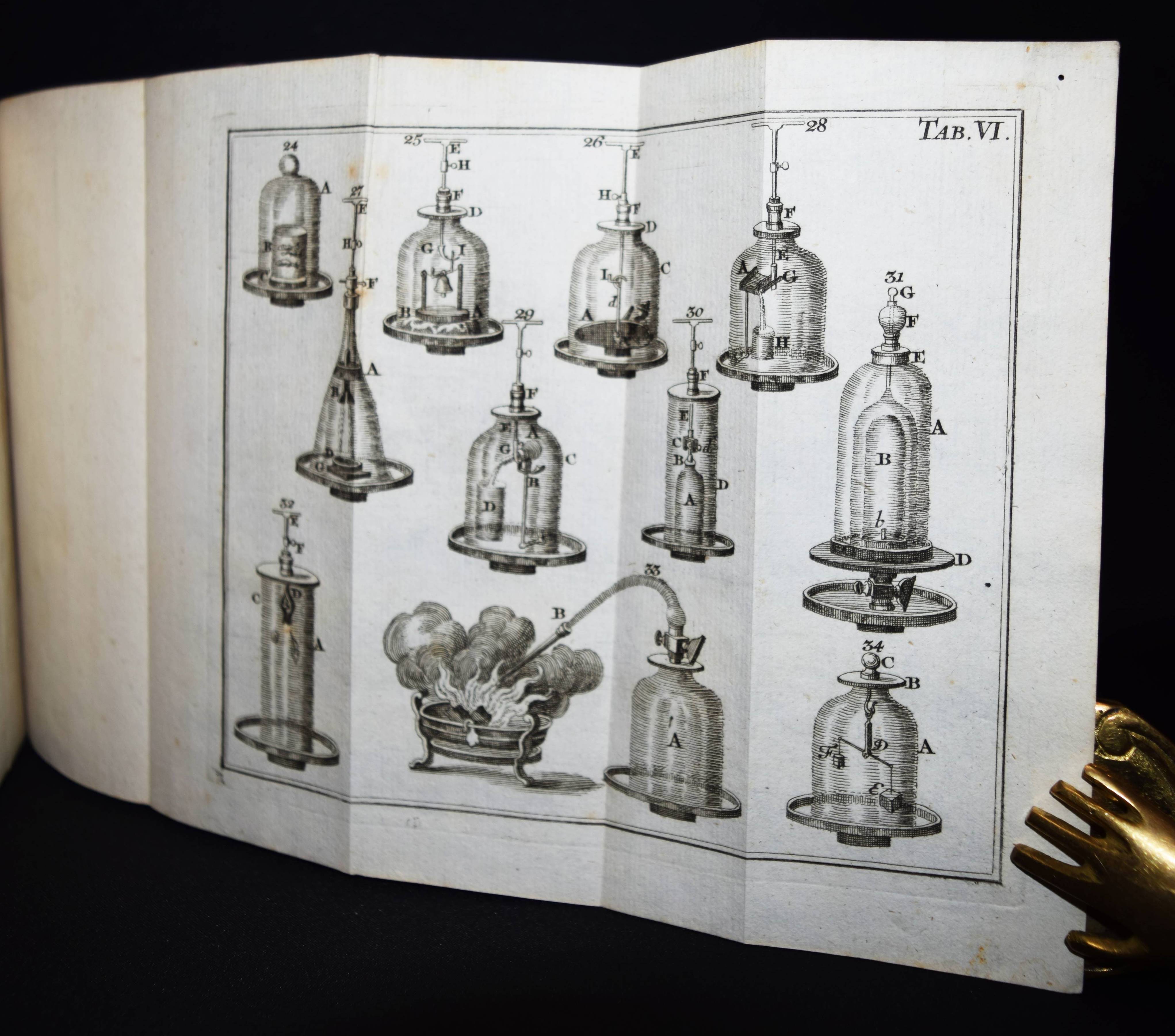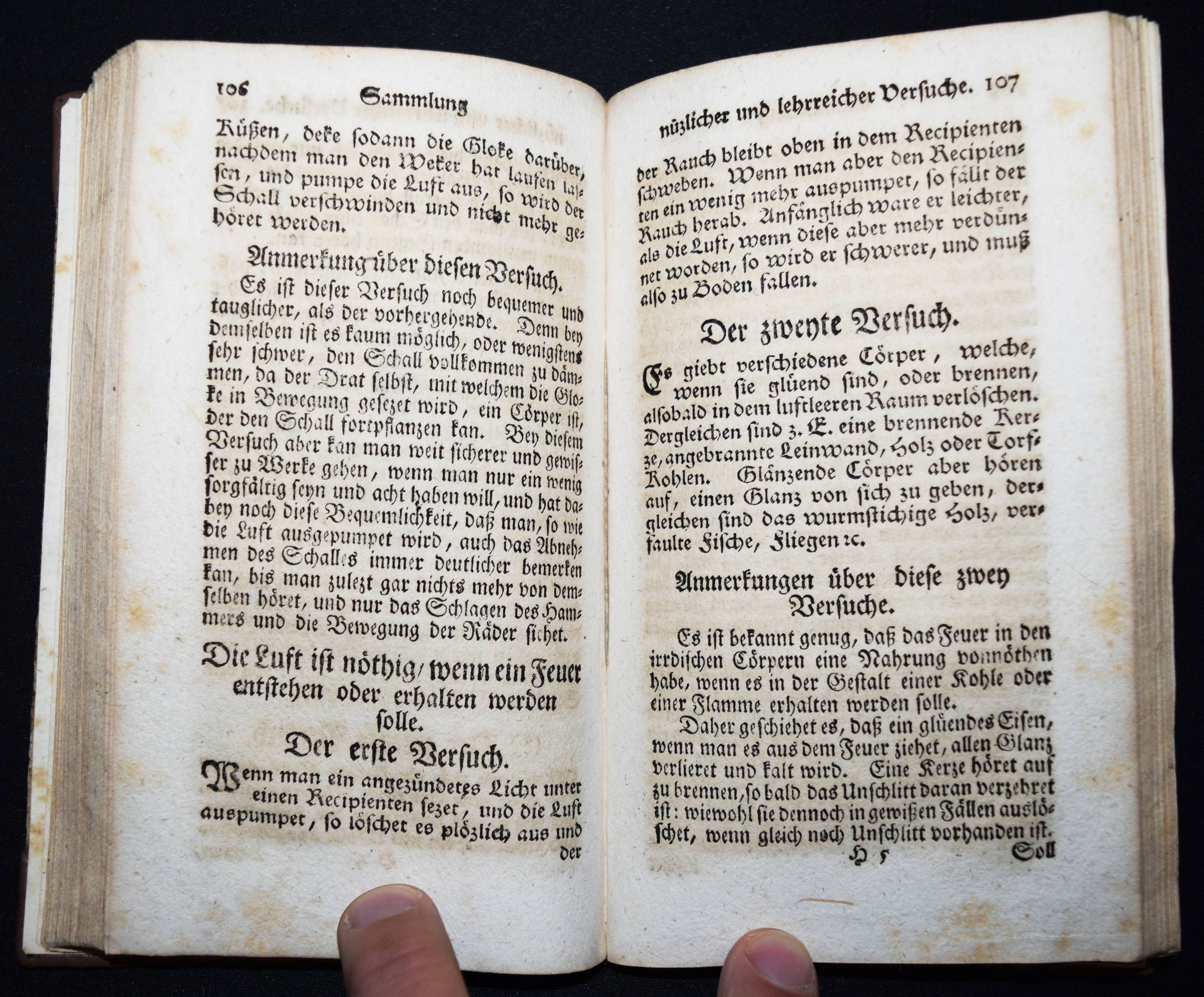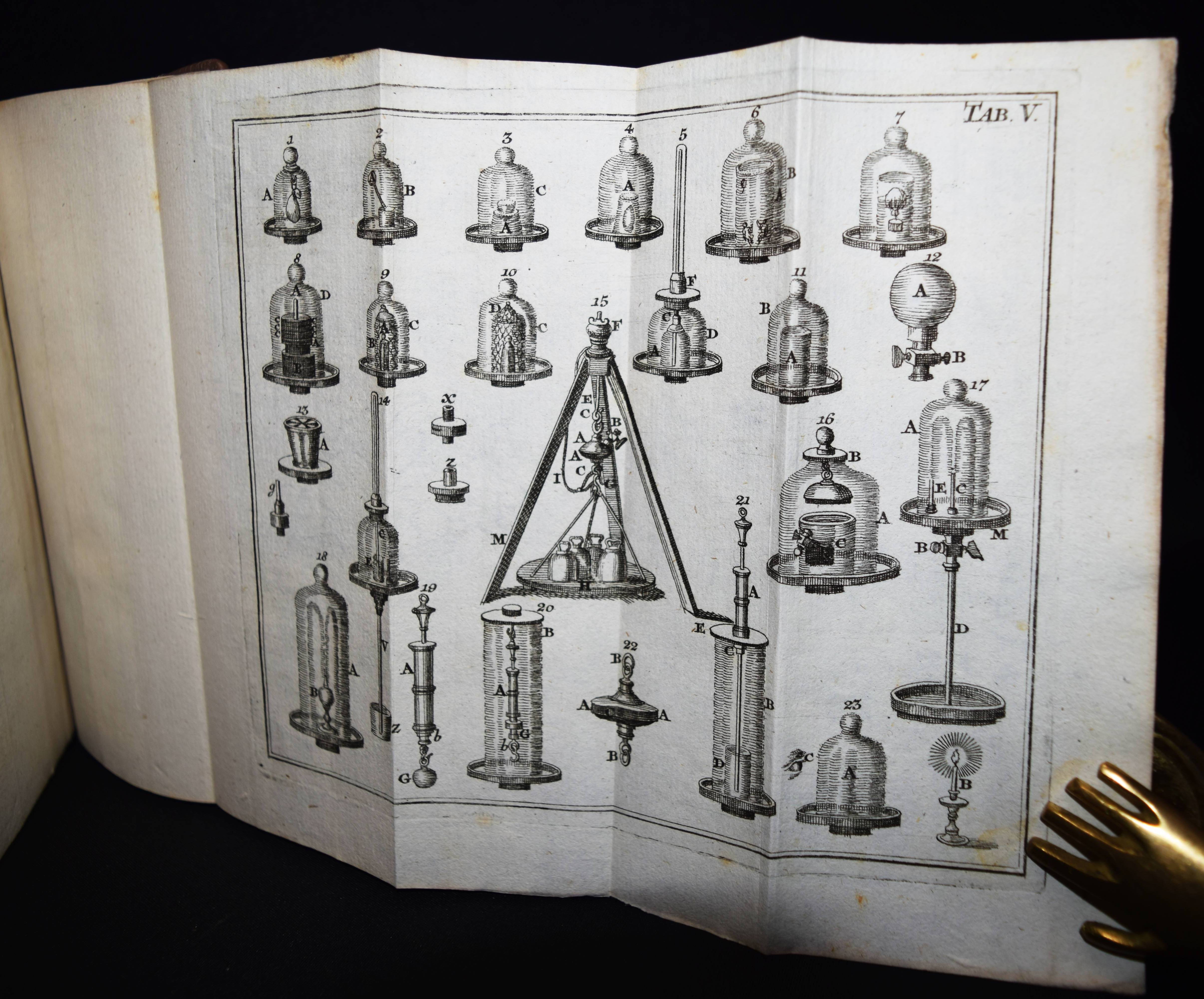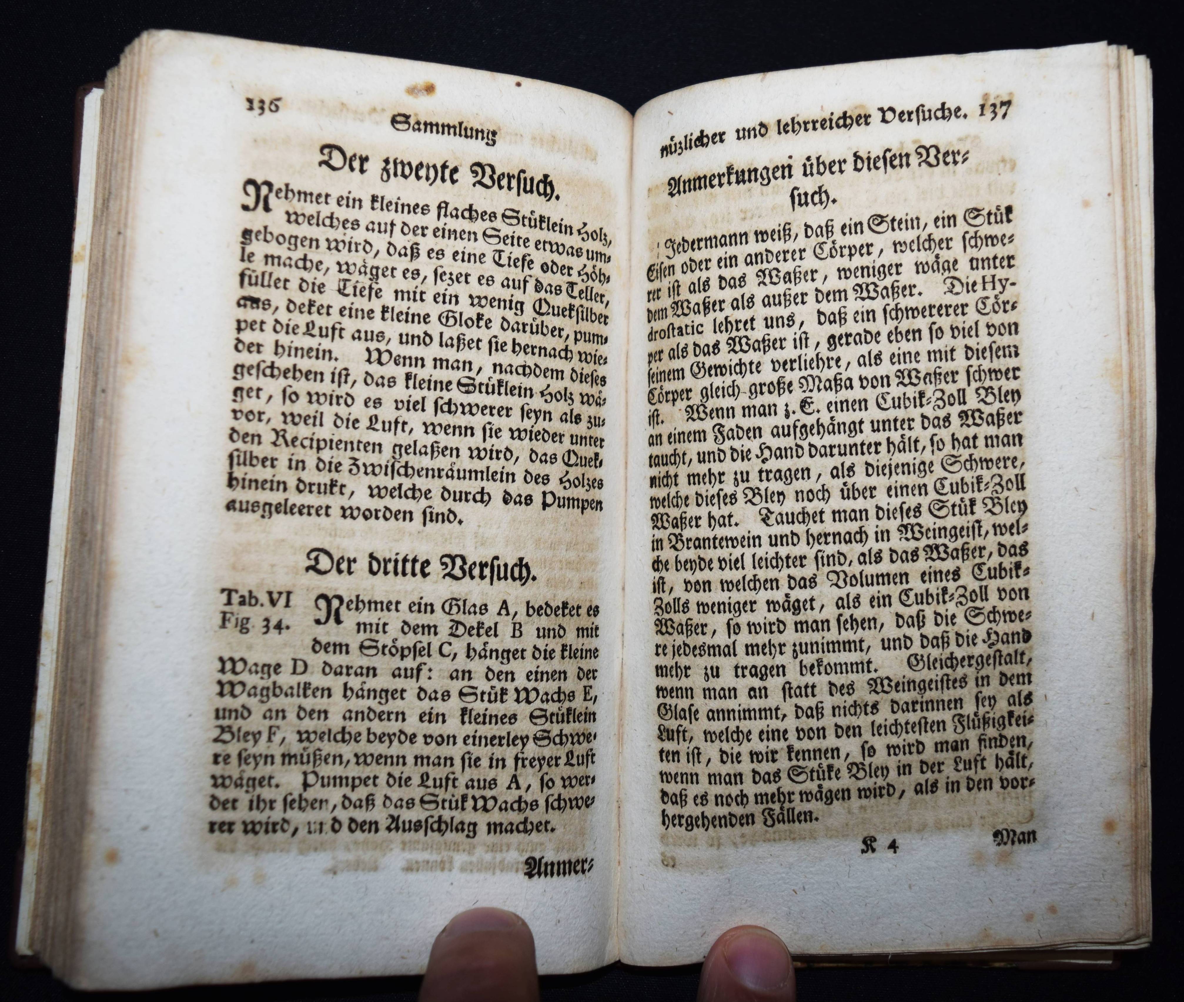 Muschenbroek, Jan van. Beschreibung der doppelten und einfachen Luftpumpe. Nebst einer Sammlung von verschiedenen nüzlichen und lehrreichen Versuchen, welche man mit der Luftpumpe machen kan. Aus dem Französischen übersetzt und mit vielen neuen Zusätzen und Kupfern vermehret von Johann Christoph Thenn. Augsburg, Eberhard Klett, Wittwe 1765. Kl.-8°. [7] Bl., 150 S. und 6 gefalt. Kupfertafeln. Moderner Halblederband mit Deckelschild. Engelmann, Bibl.-Techn. 261. VD18 11077050. – Erste deutsche Ausgabe. – Johann van Musschenbroek (1687–1748) „war Mechanicus in Leiden. Sein Vater Johann Joosten betrieb die erste Werkstätte für physikalische Instrumente auf dem Kontinent, sein Bruder Pieter war maßgeblich an der Rezeption von Newtons Physik und ihrer Fortentwicklung zu einer nicht-mathematischen Experimentalwissenschaft beteiligt. Tab. IV (Kat. Nr. 2, Abb. S. 7) zeigt die Brandersche „verticalstehende Luftpumpe“, Tab. VI einige der in der Schrift beschriebenen Experimente im luftleeren Rezipienten. Die kleine Schrift erschien zuerst auf holländisch im Essay de physique (Leiden 1739) seines Bruders Pieter. Die freie Übersetzung des Augsburger Pfarrers Johann Christoph Thenn (1729–1784) diente zugleich als Werbeschrift für die Werkstatt von Brander, dessen verbesserte Konstruktionen vom Übersetzer gelobt und „zu der Beförderung eines vernünftigen Vergnügens der Liebhaber der Naturlehre“ empfohlen wurden“ (C. Meinel, Die Luftpumpe, das Vakuum und die Anfänge der Physik in Regensburg, Regensburg 2004, S. 9). – Einband fachgerecht erneuert, Text stellenweise etwas braunfleckig, gutes Exemplar.