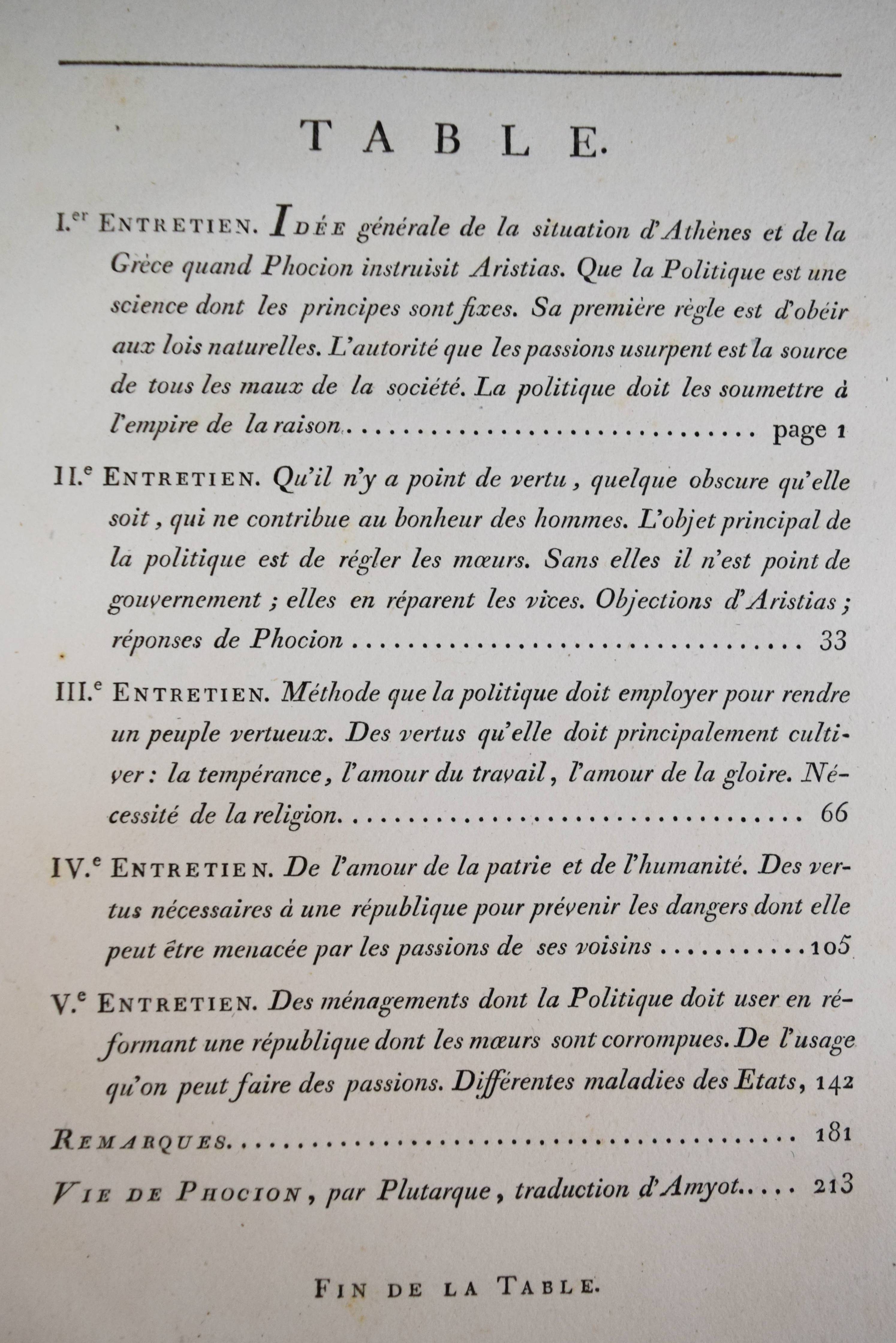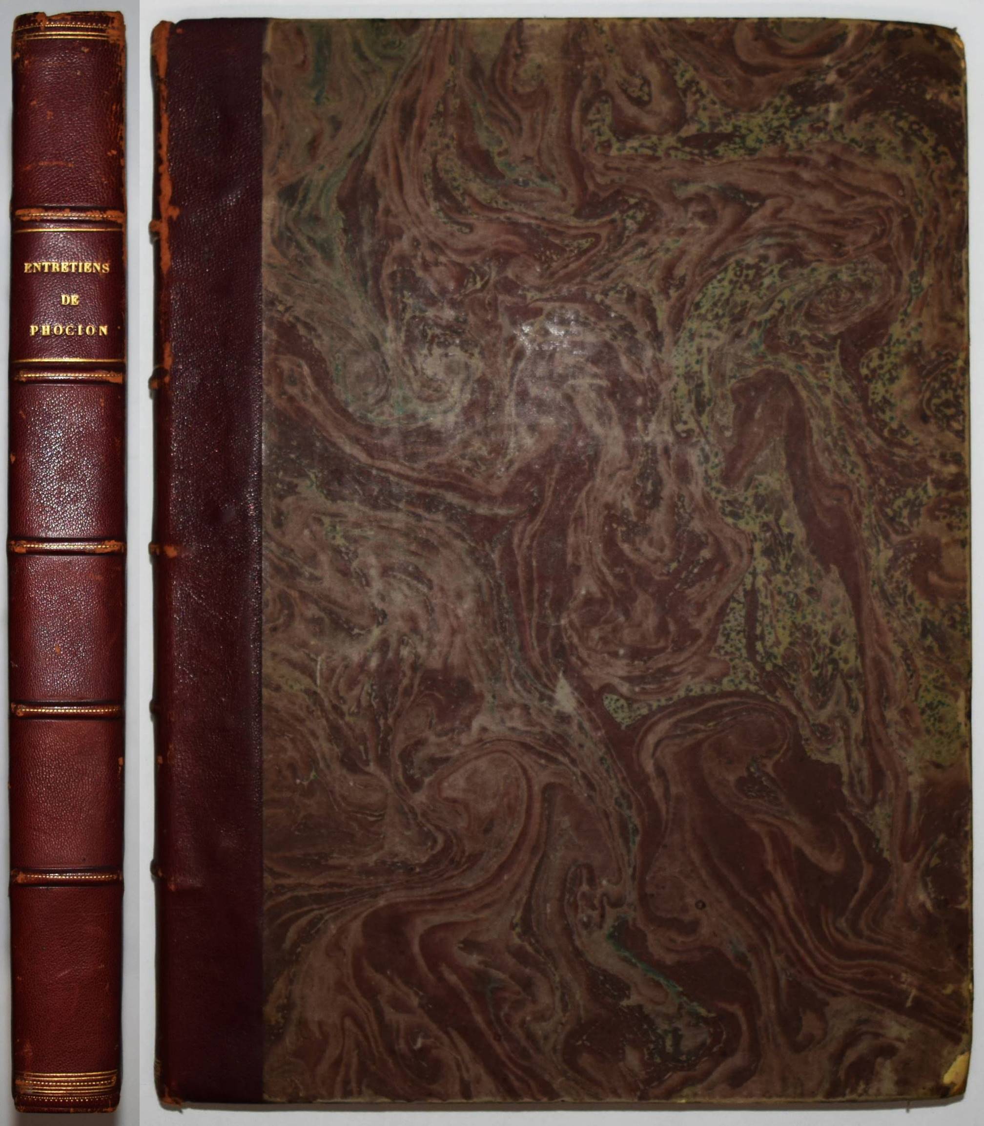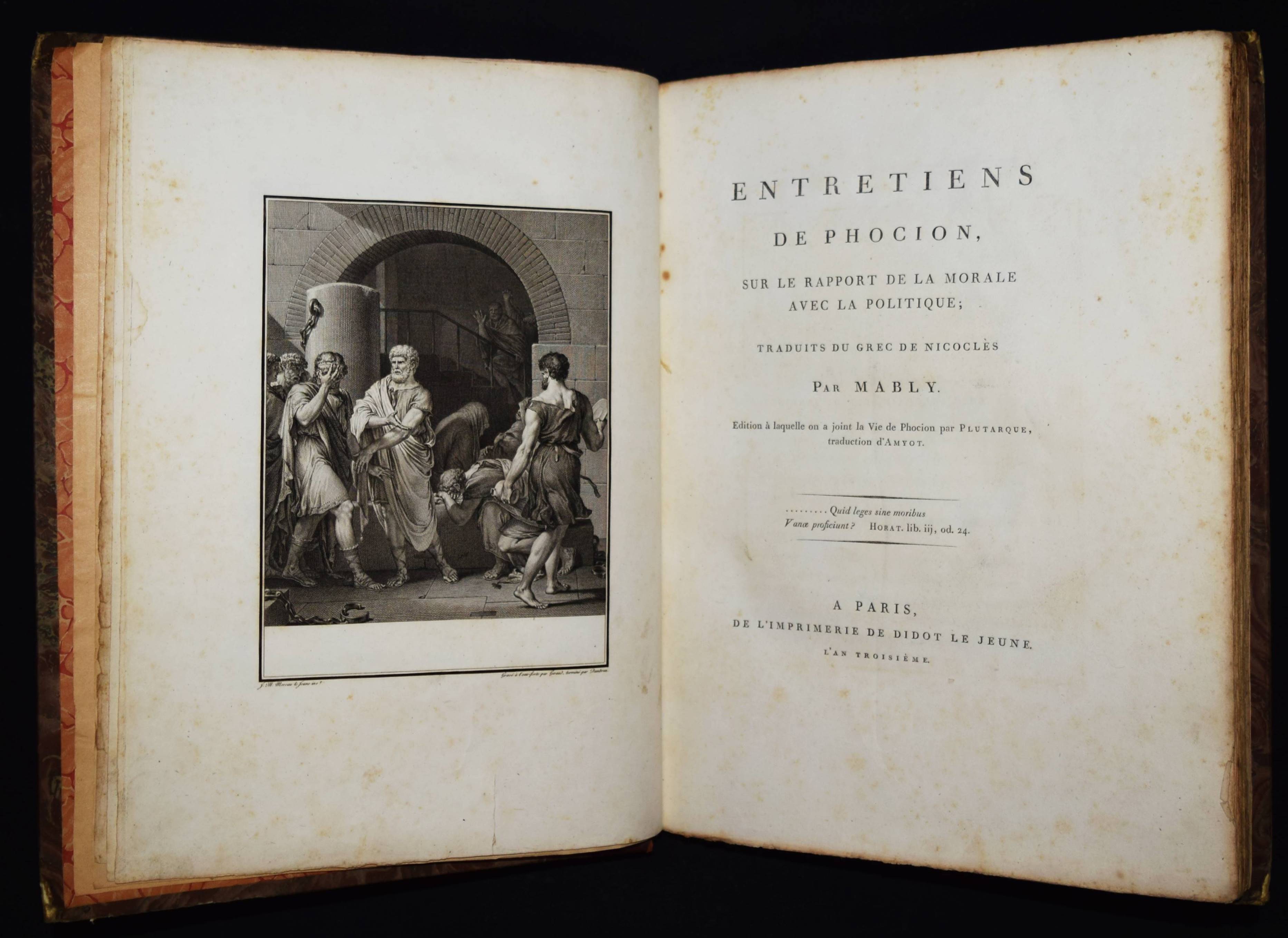 Mably, (Gabriel Bonnot, Abbé de). Entretiens de Phocion, sur le rapport de la morale avec la politique. Traduis du Grec de Nicolès avec des remarques. Edition à laquelle on a joint la vie de Phocion par Plutarque, traduction d’Amyot. Paris, Didot le jeune L’an troisième (1795). Folio (36 x 27 cm.). XXIV, 265 S., [1] Bl. mit 2 Kupfertafeln von Giraud und Dambrun nach (Jean-Michel) Moreau le jeune. Weinroter Halblederband um 1900 mit goldgepr. Rückentitel und Linienvergoldung. Querard V, 405. Rahir 519. Schweiger I, 267. Vgl. Higgs 3082 (Anm.). Palgrave II, 655. – Seltene Prachtausgabe in Folio bei Didot. – Die Angabe „Übersetzung aus dem Griechischen“ ist fingiert. – „In 1763, he published ‚Les entretiens …‘: This travesty, as it may almost be called – the best of his writings in style, and a happy example of rhetorical exaggeration – eulogises the institutions of Lycargus, and marks the author as a member of the school of J. J. Rousseau“ (Palgrave). – „Avec les „Entretiens de Phocion“, qui parurent en 1763, Mably intervint consciemment dans le débat théorétique des Lumières françaises et chercha à donner une base systématique à sa théorie politique à travers le devoir moral de la politique dans le sens de l’Antique“ (Révolution Francaise (dot) net). – G. B. de Mably (1709-1785), einer der Väter der Revolution und des Sozialismus, „trat für eine sozialistische Ordnung der Gesellschaft ein und verlangte Gleichheit und Wohlwollen als ihre Grundlagen“ (W. Ziegenfuss, Philosophen-Lexikon II, 94). – Die beiden Kupfertafeln unten mit Randeinrissen (ca. 4 cm.), stellenweise im weißen Blattrand etwas braunfleckig, gutes breitrandiges Exemplar.