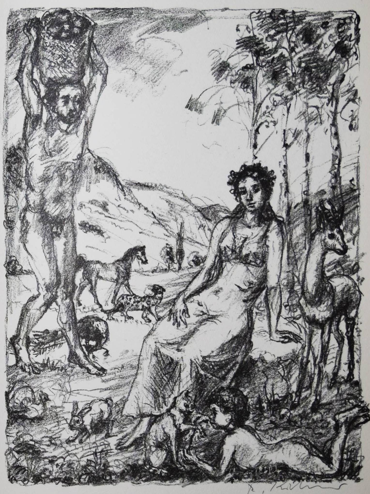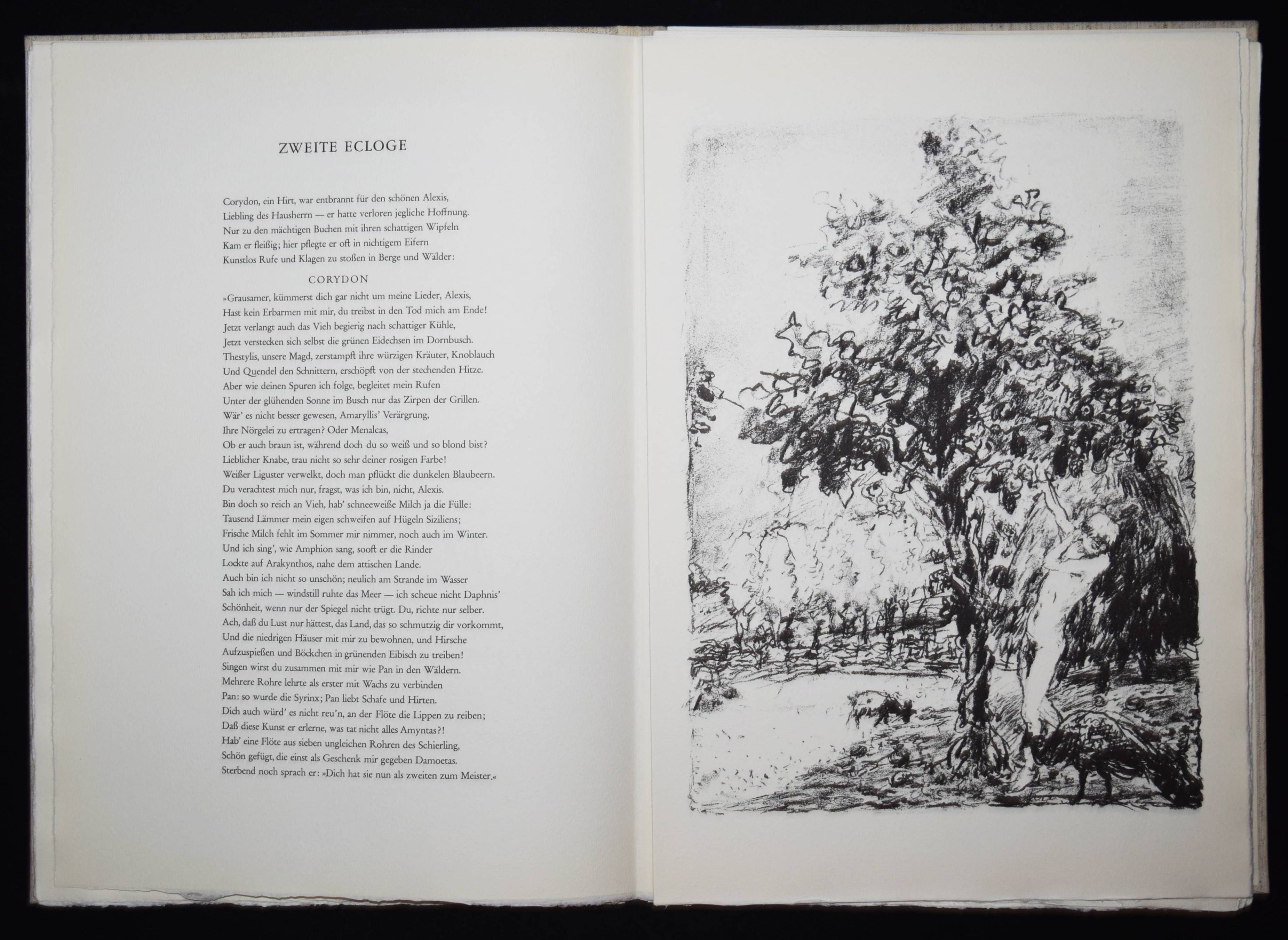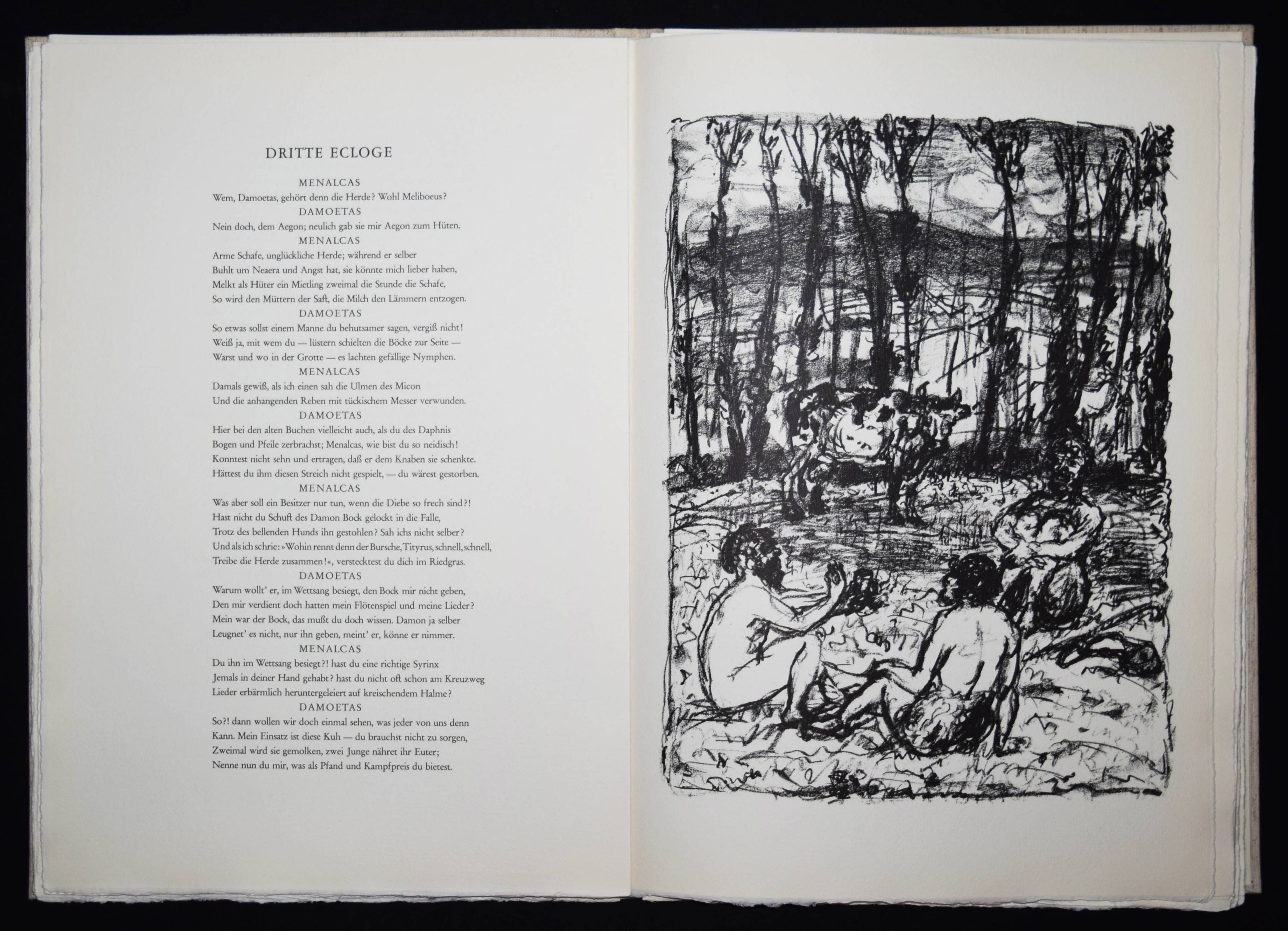 Vergil (Vergilius Maro, Publius). Bucolica in der Übersetzung von Theodor Haecker mit Lithographien von Robert Kirchner. Sonderdruck, (um 2 vom Künstler sign. Original-Lithographien vermehrter Faksimile-Nachdruck). München, Gesellschaft der Bibliophilen 1974. Imperial-Folio (44 x 30,5 cm.). [28] Bl. mit 15 (9 ganzseitigen) Lithographien und 2 blattgroßen signierten Original-Lithographien von Robert Kirchner. Beige Oln-Mappe mit rot gepr. Deckeltitel und Deckelillustration. (Jahresgabe / Gesellschaft der Bibliophilen Band 1974). Sehr gutes Exemplar.