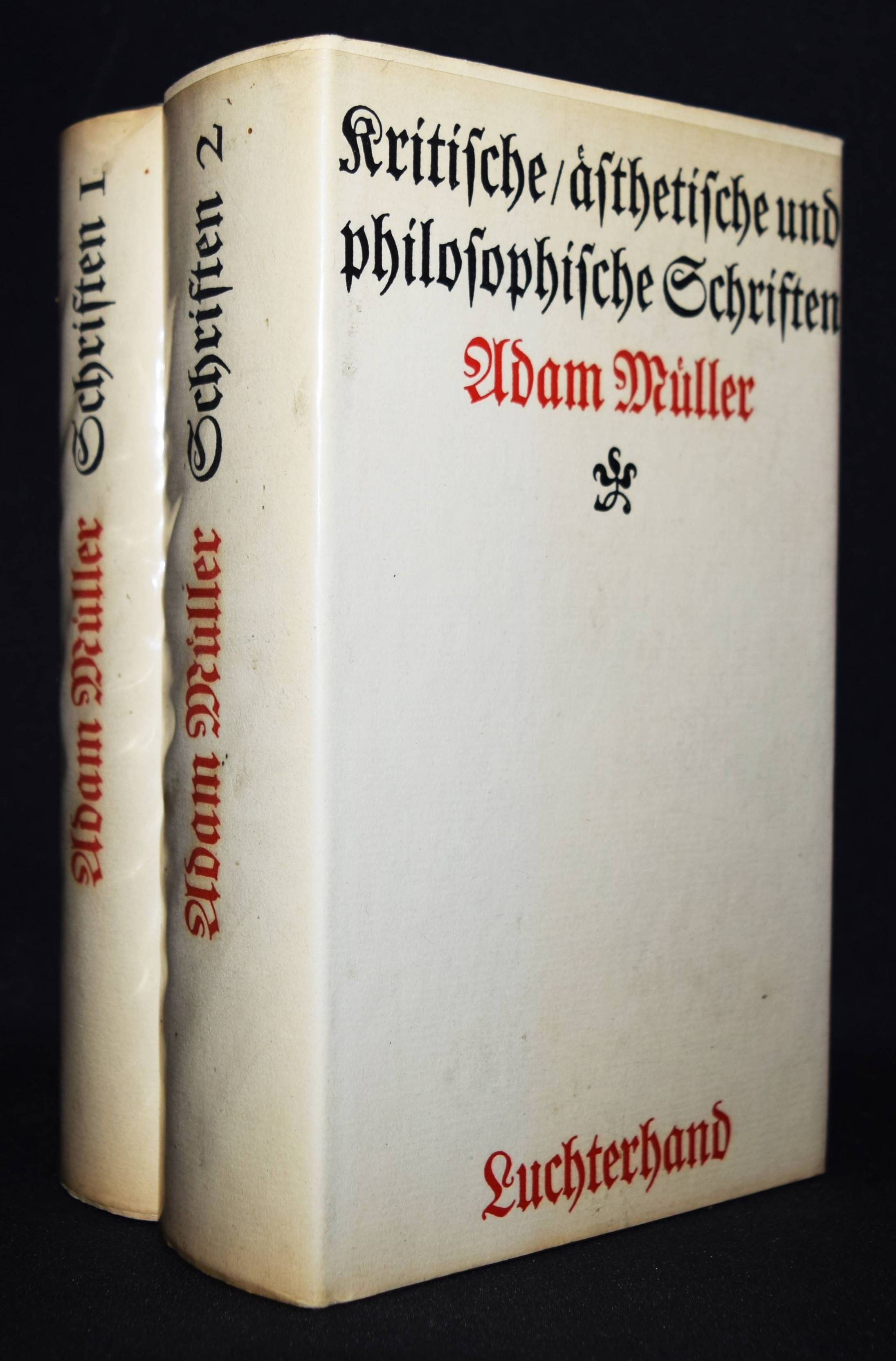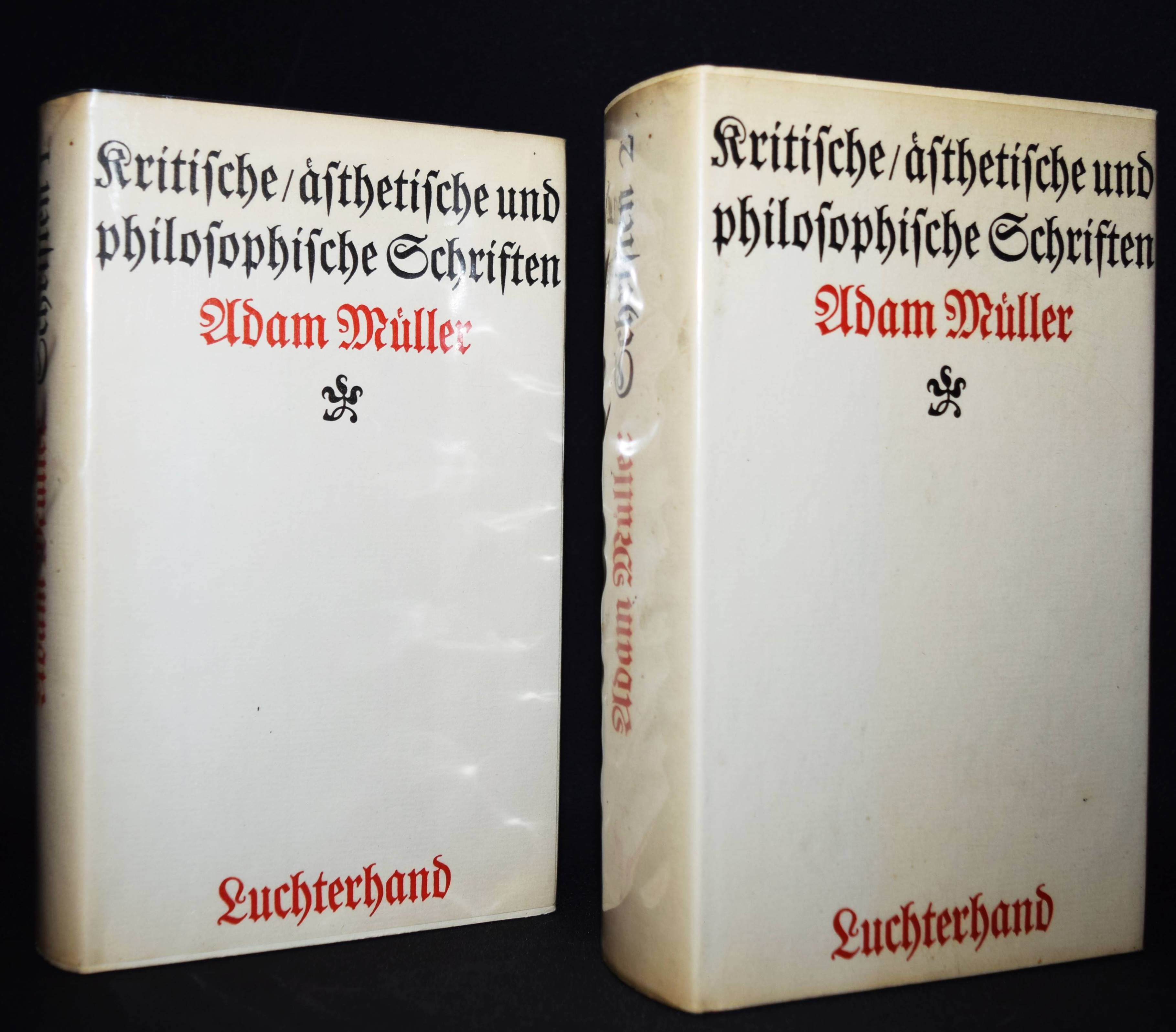 Müller, Adam (Heinrich). Kritische, ästhetische und philosophische Schriften. Kritische Ausgabe. Herausgegeben von Walter Schroeder und Werner Siebert. 2 Bände. Neuwied und Berlin, Luchterhand (1967). 8°. 511, (1) S.; 696 S., [1] Bl. OLn. mit OU. Vgl. Ziegenfuss II, 177. – Der Wiener Philosoph, Diplomat, Ökonom und Staatstheoretiker A. H. Müller von Nitterdorf (1779-1829) war einer der „bedeutendsten Staatsdenker der Romantik. Er verstand Volk und Staat als Organismen mit eigenen Lebensprinzipien und bekämpfte daher, auch in seiner Lehre vom Gelde, das dogmat. Naturrecht und die Freiwirtschaftslehre von A. Smith. Metternich bediente sich M.s als „Feder“ gegen die Zeitmeinungen. Auf seine Zeitgenossen, welche in ihm vor allen einen ideolog. Querkopf sahen, wirkte M. wenig. 100 Jahre nach seinem Tod erfuhren seine Lehren und Schriften durch die Schule von O. Spann eine Renaissance“ (W. Goldinger in ÖBL). – Schutzumschläge etwas gebräunt, zeitgenöss. Widm. auf dem Vorsatz, sehr gutes Exemplar.