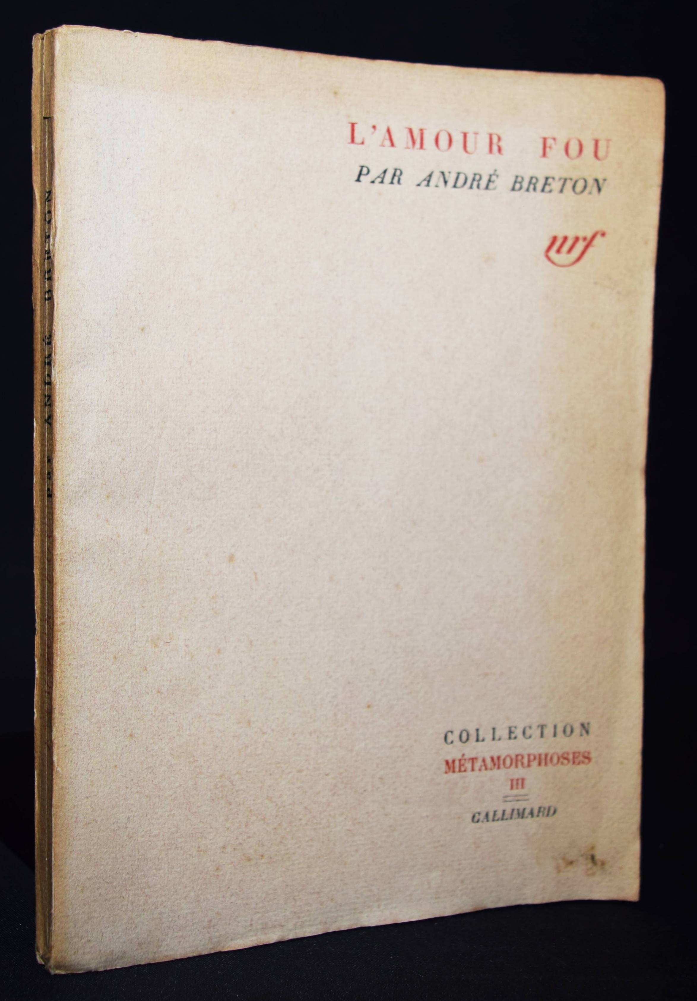 Breton, André. L’ amour fou. Paris, Gallimard (1937). 8°. 176 S., [1] Bl. mit 20 Tafeln. Orig.-Broschurumschlag. (Collection Métaphorses). Bouqueret 197. – Erste Ausgabe, zweiter Druck des Prosawerks mit Photographien von Brassai, Man Ray, Cartier-Bresson, Dora Maar und Rogi-André sowie mit Abbildungen von Kunstwerken (Max Ernst, Alberto Giacometti, Pablo Picasso und Paul Cézanne). – „Après avoir confié en 1924 à son assistant Jacques-André Boiffard le soin d’illustrer Nadja, Man Ray se charge lui-même du choix des images pour L’Amour fou. Certaines, déjà parues dans Le Minotaure en juin 1935 pour illustrer des extraits du texte de Breton, seront de lui, d’autres de Brassaï, de Dora Maar, de Rogi André… „Photographier, c’est rendre lisible le réel écrit auquel des accords secrets nous lient, c’est rendre visible ce lien, écrit Breton dans le prologue. La photographie ne représente pas, elle présente, non pas le réel mais la réalité de notre rapport au réel tel que nous le lisons: cette „forêt d’indices“, lieu de la „beauté convulsive“.“ (C. Bouqueret). – Papierbedingt etwas gebräunt, gutes Exemplar.