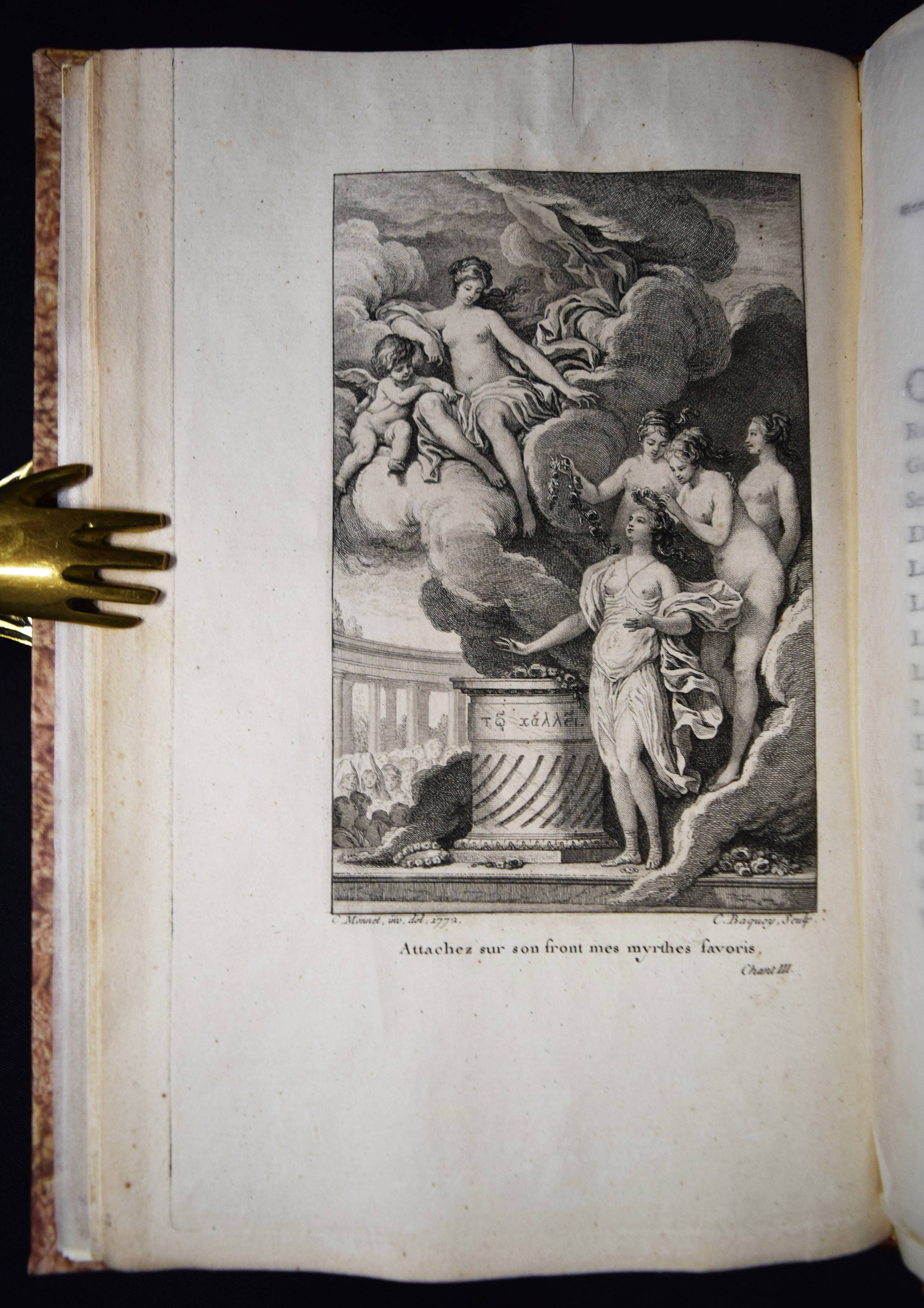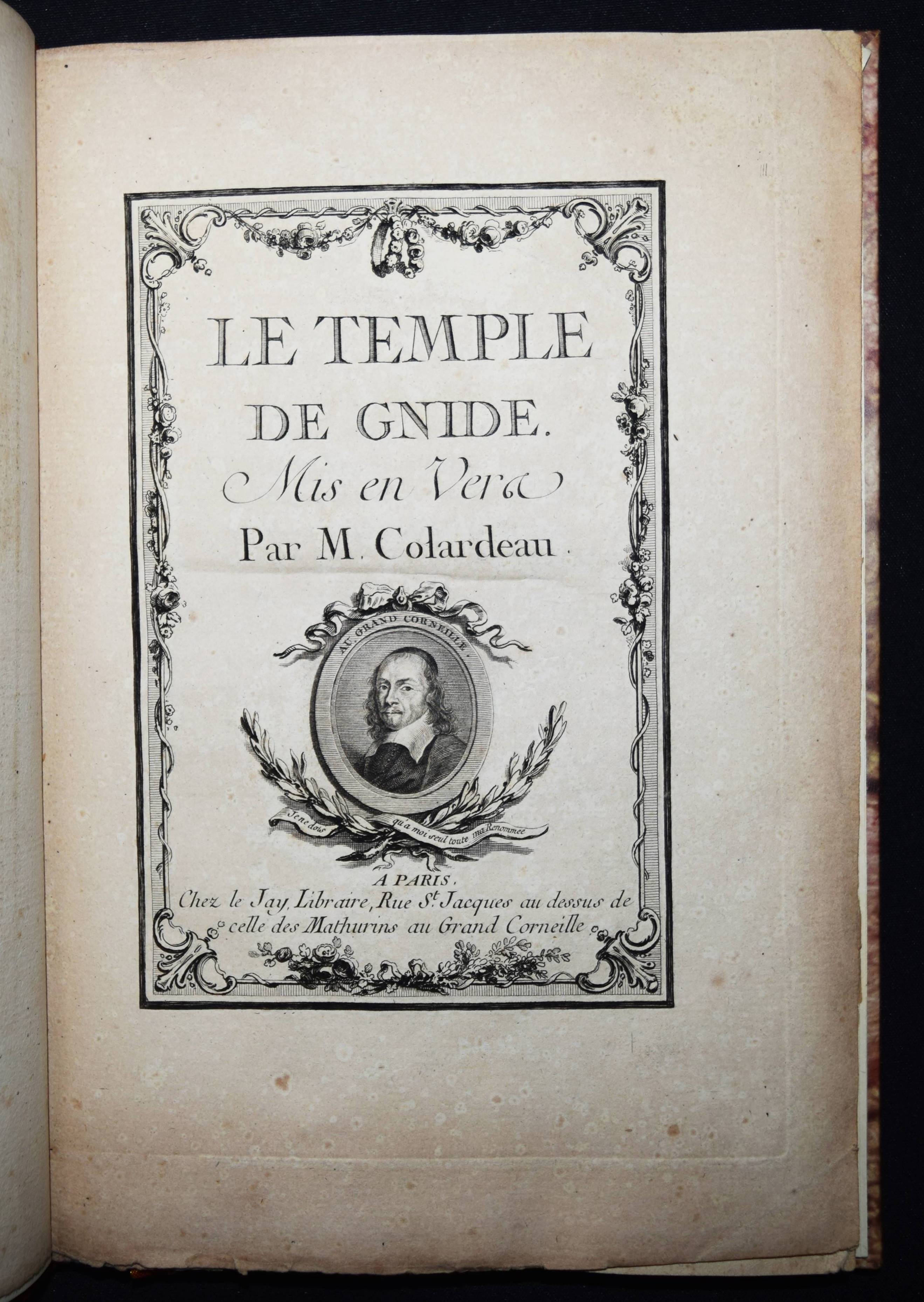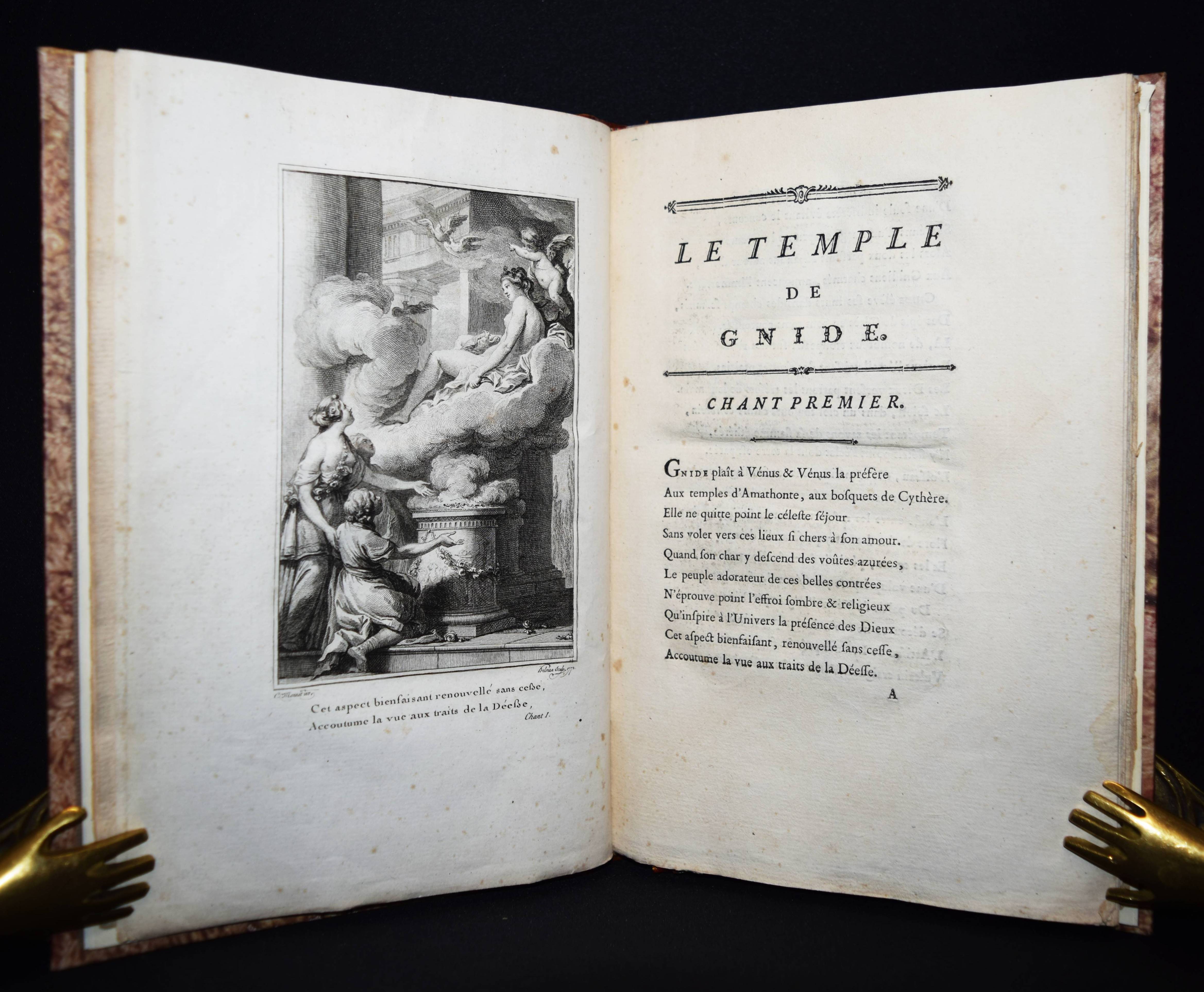 (Montesquieu, Charles de Secondat). Le temple de Gnide. Mis en vers par M. (Charles Phillip) Colardeau. Paris, Le Jay o. J. (1773). 8°. XVI, 88 S. mit gestoch. Titel mit Porträt-Medaillon und 7 Kupfertafeln von Baquoy, Delaunay, Helman, Masquelier, Née und Ponce. Moderner Halblederband mit goldgepr. Rückenvergoldung und 5 unechten Bünden. Cohen/Ricci Sp. 245. Fürstenberg 99. Sander 372. – Versfassung des Werkes von Montesquieu. Eines der seltenen Exemplare ohne Datum, bei denen die Kupfer gegen eine „″reconnaissance““ bezogen werden konnten (vgl. Cohen/R.). – Stellenweise braunfleckig und etwas gebräunt, gutes breitrandiges, seitlich und unten unbeschnittenes Exemplar.