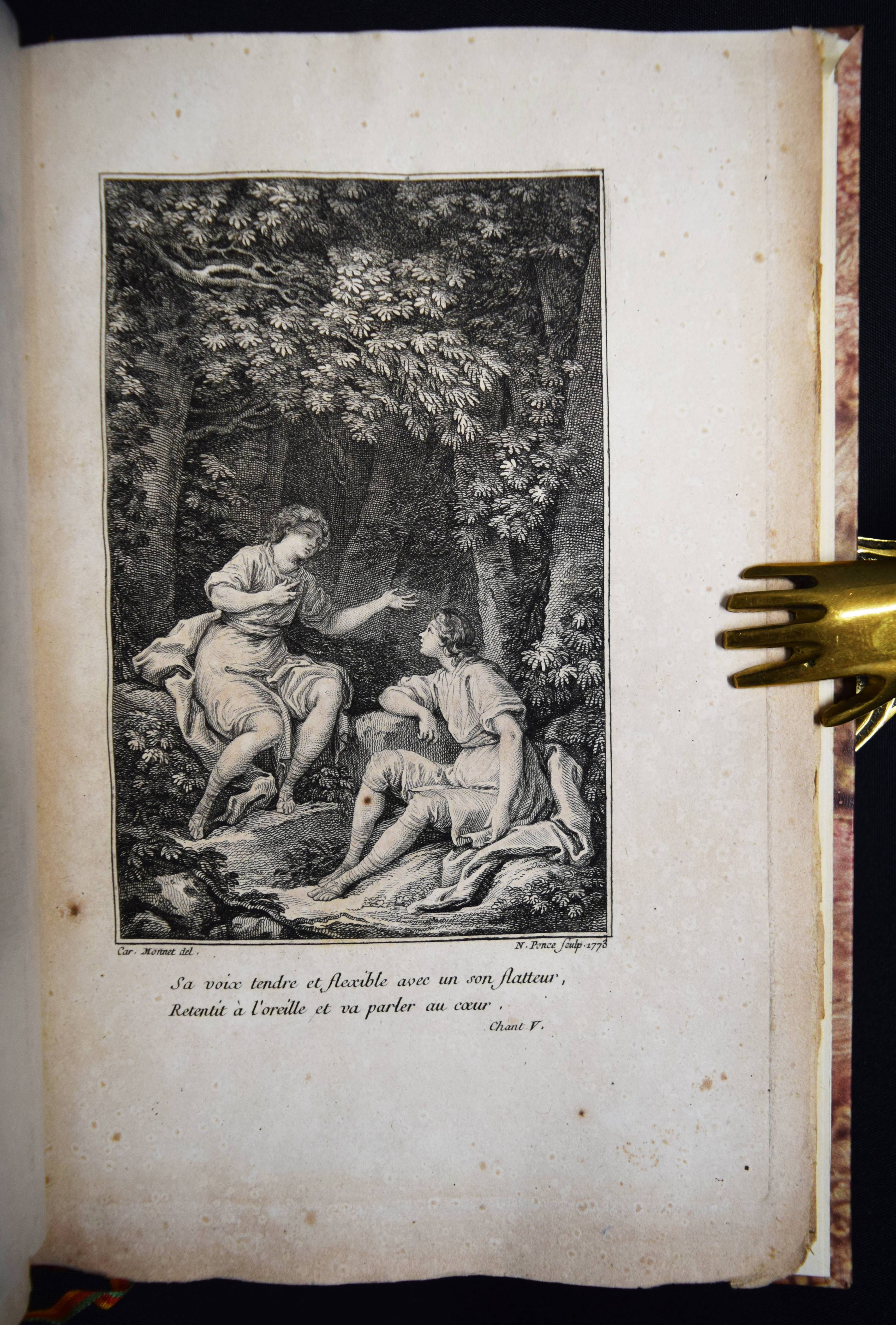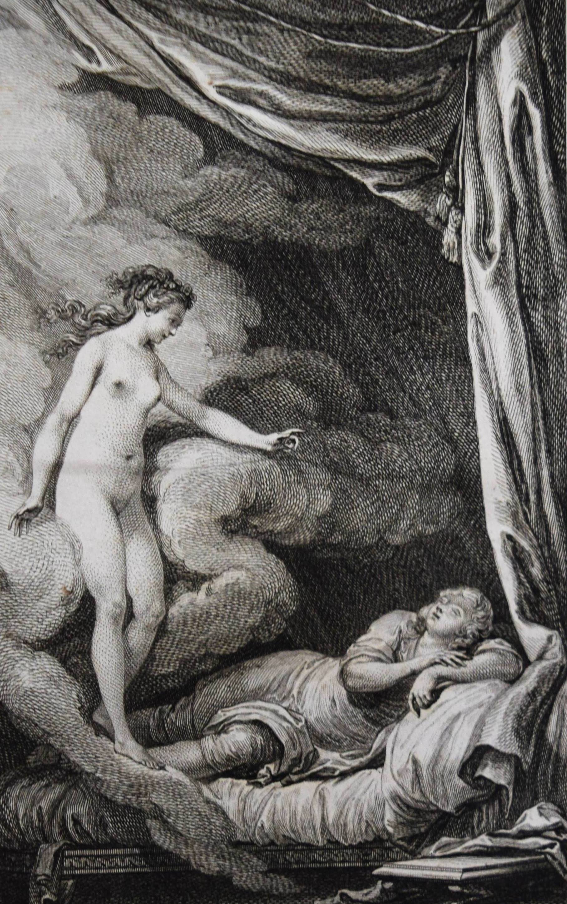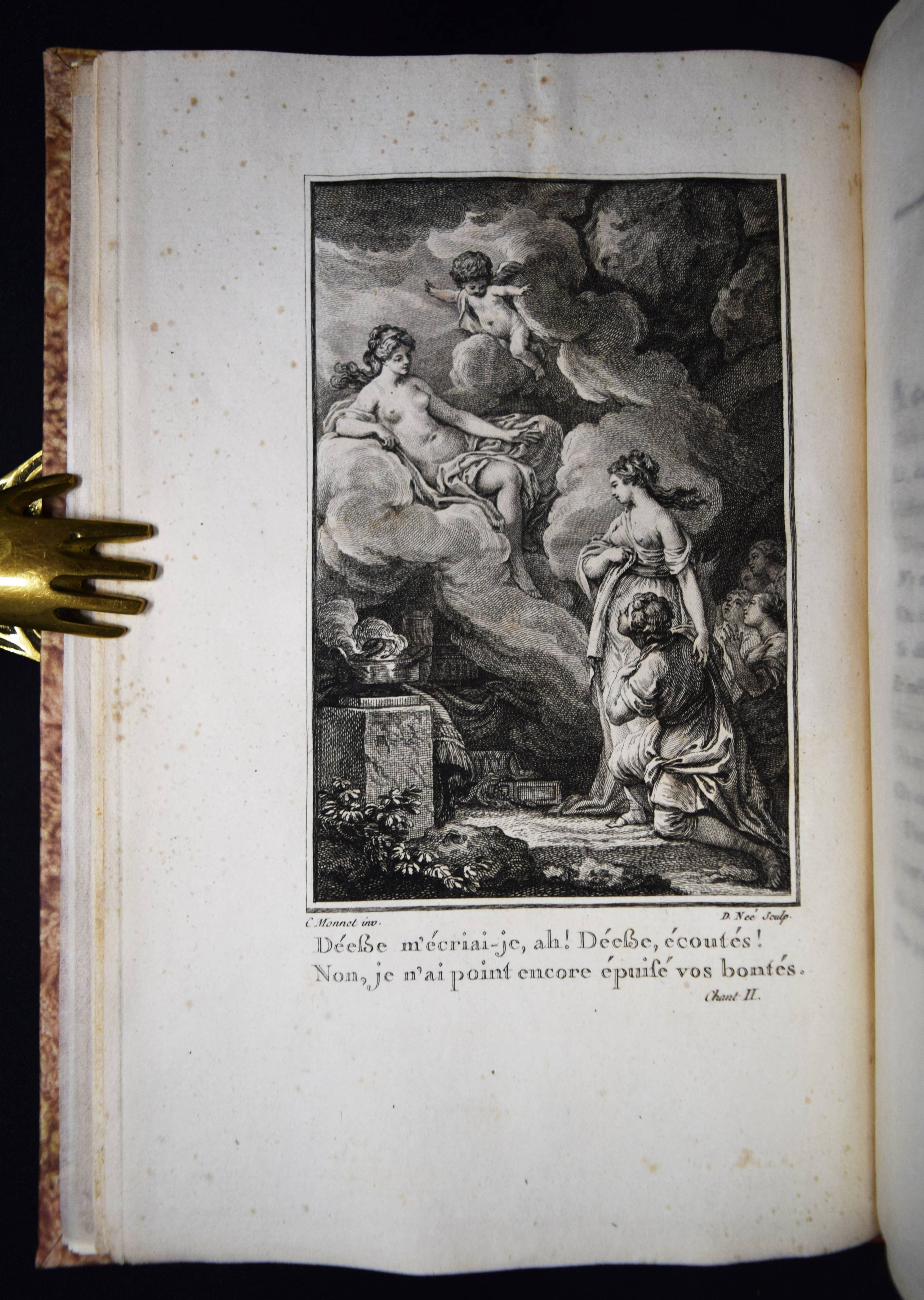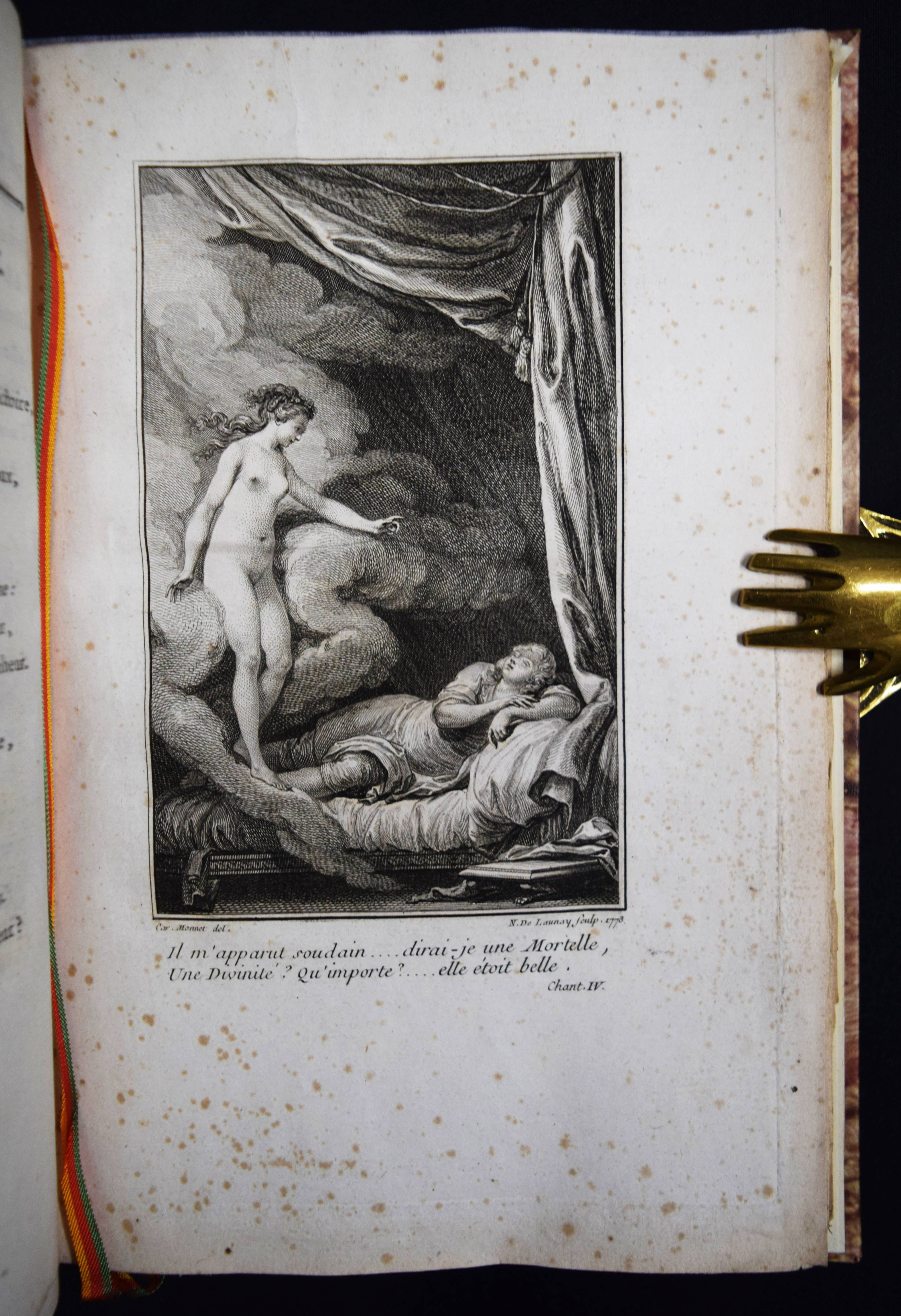 (Montesquieu, Charles de Secondat). Le temple de Gnide. Mis en vers par M. (Charles Phillip) Colardeau. Paris, Le Jay o. J. (1773). 8°. XVI, 88 S. mit gestoch. Titel mit Porträt-Medaillon und 7 Kupfertafeln von Baquoy, Delaunay, Helman, Masquelier, Née und Ponce. Moderner Halblederband mit goldgepr. Rückenvergoldung und 5 unechten Bünden. Cohen/Ricci Sp. 245. Fürstenberg 99. Sander 372. – Versfassung des Werkes von Montesquieu. Eines der seltenen Exemplare ohne Datum, bei denen die Kupfer gegen eine „″reconnaissance““ bezogen werden konnten (vgl. Cohen/R.). – Stellenweise braunfleckig und etwas gebräunt, gutes breitrandiges, seitlich und unten unbeschnittenes Exemplar.