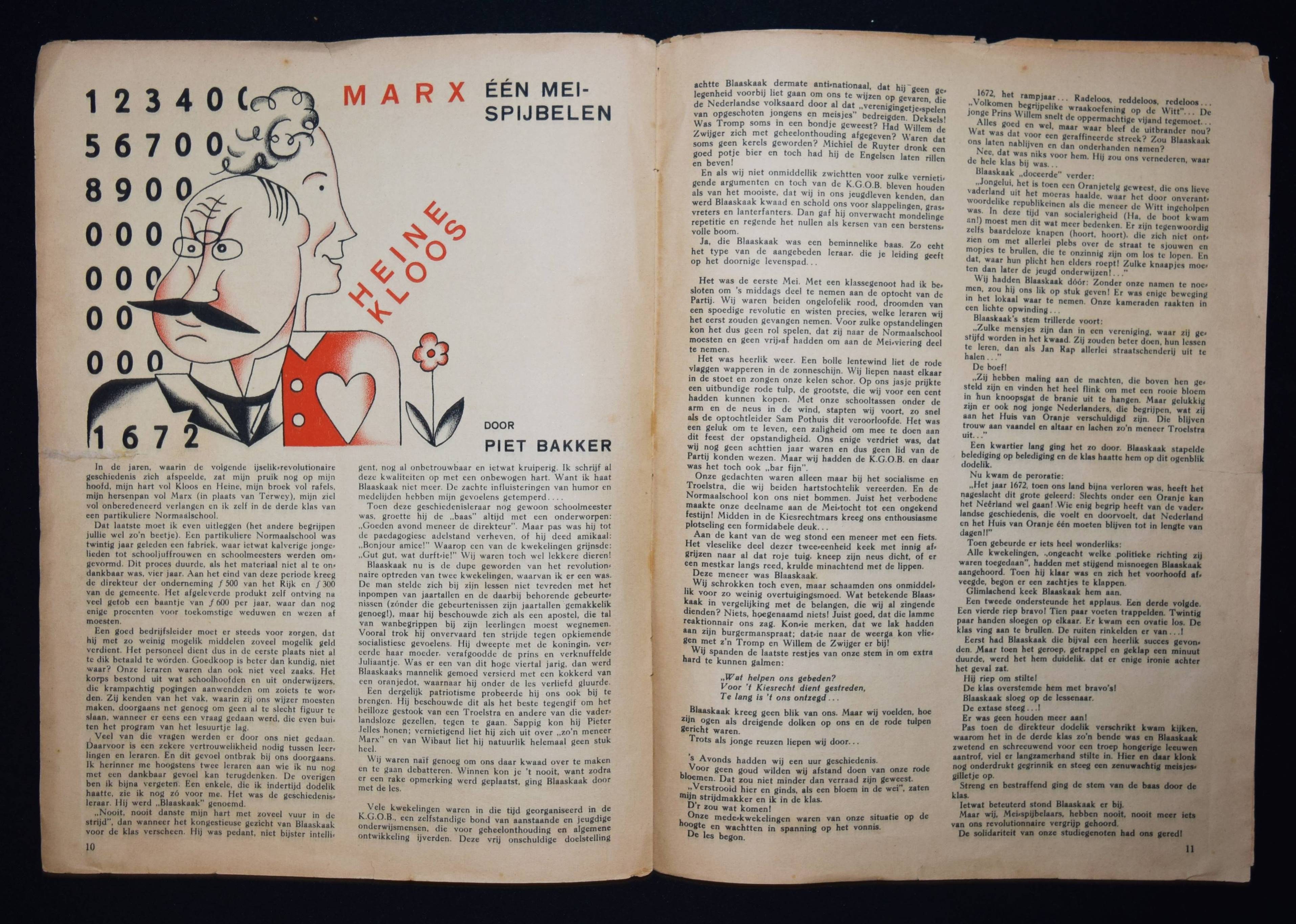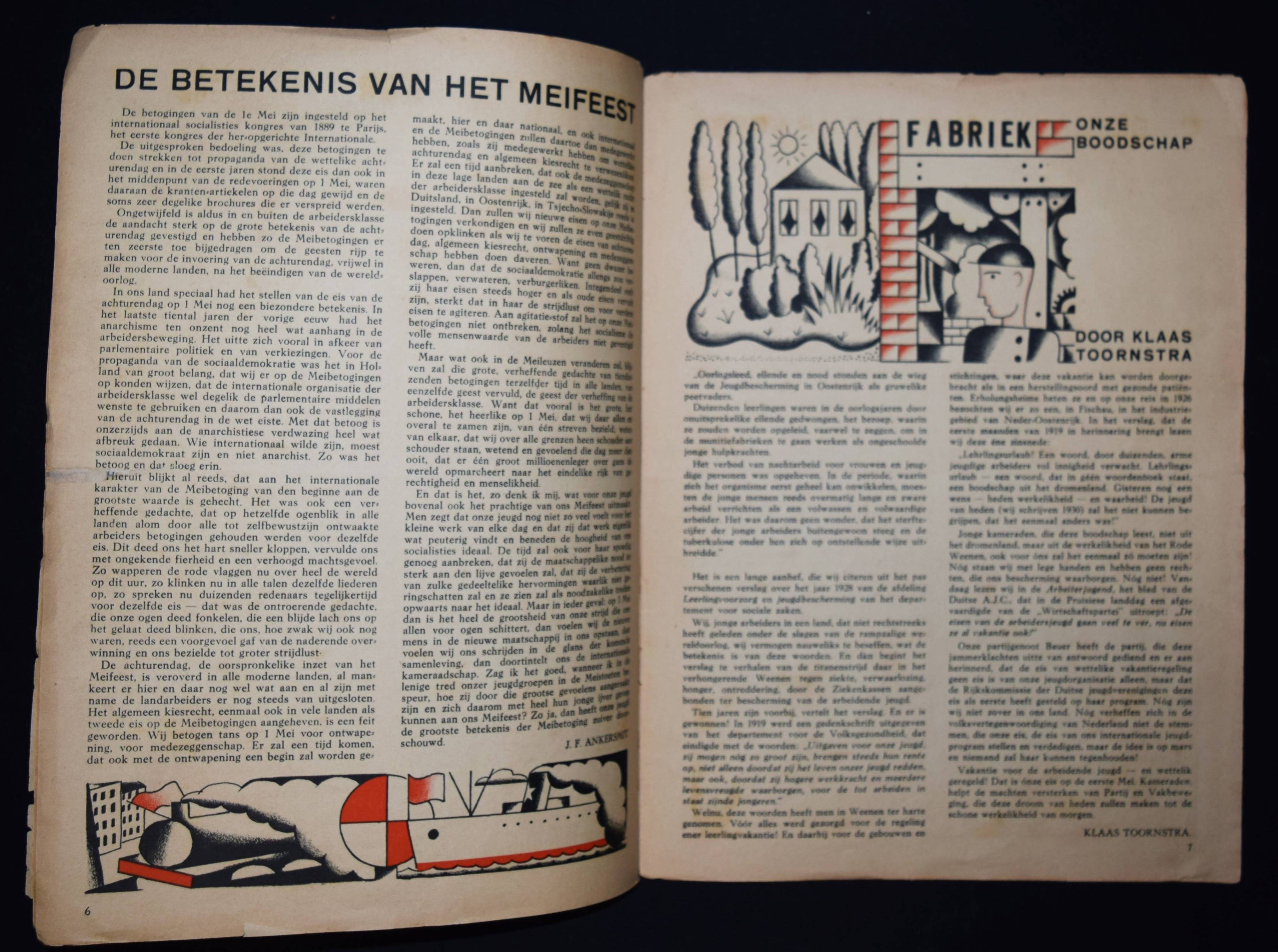 Vorrink, (Jacobus Jan) Koos (Hrsg.). De Meiroep. Uitgave van de Arbeiders Jeugd Centrale (AJC). Amsterdam, Afdeling Handelsdrukkerijen o. J. (um 1930). Gr.-4° (32,3 x 24,5 cm.). 15, (1) S. (inkl. Umschlag) mit 10 Illustrationen in Rot und Schwarz von Raoul Hynckes und 1 doppelblattgr. Fotomontage. Illustr. OBr. Sehr seltene niederländische sozialistische Jugendzeitschrift. Mit Beiträgen von J. J. K. Vorrink, Hans Wispel, Theo Thijssen, J. F. Ankersmit, Klaas Toornstra, Piet Bakker, Henk van Dijk, Herman Molendijk und Henk van Laar. – „Die Arbeiders Jeugd Centrale (AJC) war zwischen 1918 und 1959 eine sozialistische Jugendbewegung, die von der Sozialdemokratischen Arbeiterpartei (SDAP) und dem niederländischen Gewerkschaftsverband (NVV) gegründet wurde. Ziel des AJC war es, die Jugend der Arbeiterklasse auszubilden und zu fördern. Das sozialistische Kulturideal wurde mit traditionellen Sitten, ohne Alkohol und Tabak sowie mit körperlicher Bewegung, Volkstanz, Musik und Laienspielen verwirklicht. … Koos Vorrink (1891–1955) war ein inspirierender Anführer des AJC. Von 1927 bis 1934 war er Bundesvorsitzender. Er bat den ehemaligen Lehrer und Musiker Piet Tiggers (1891-1968), die Musikarbeit im AJC aufzubauen; Seine Frau Line Hoven sorgte für den Volkstanz bei den Führungskursen“ (Wikipedia). – Mit hervorragenden Illustrationen des belgisch-niederl. Künstlers R. Hynckes (1893-1973), einer der wichtigsten Vertreter des magischen Realismus. – Umschlag mit Randläsuren, größerer Randeinriss bei allen Blättern geschlossen (geringf. Textverlust auf letzten Seite), papierbedingt etwas gebräunt, sonst gut erhalten.